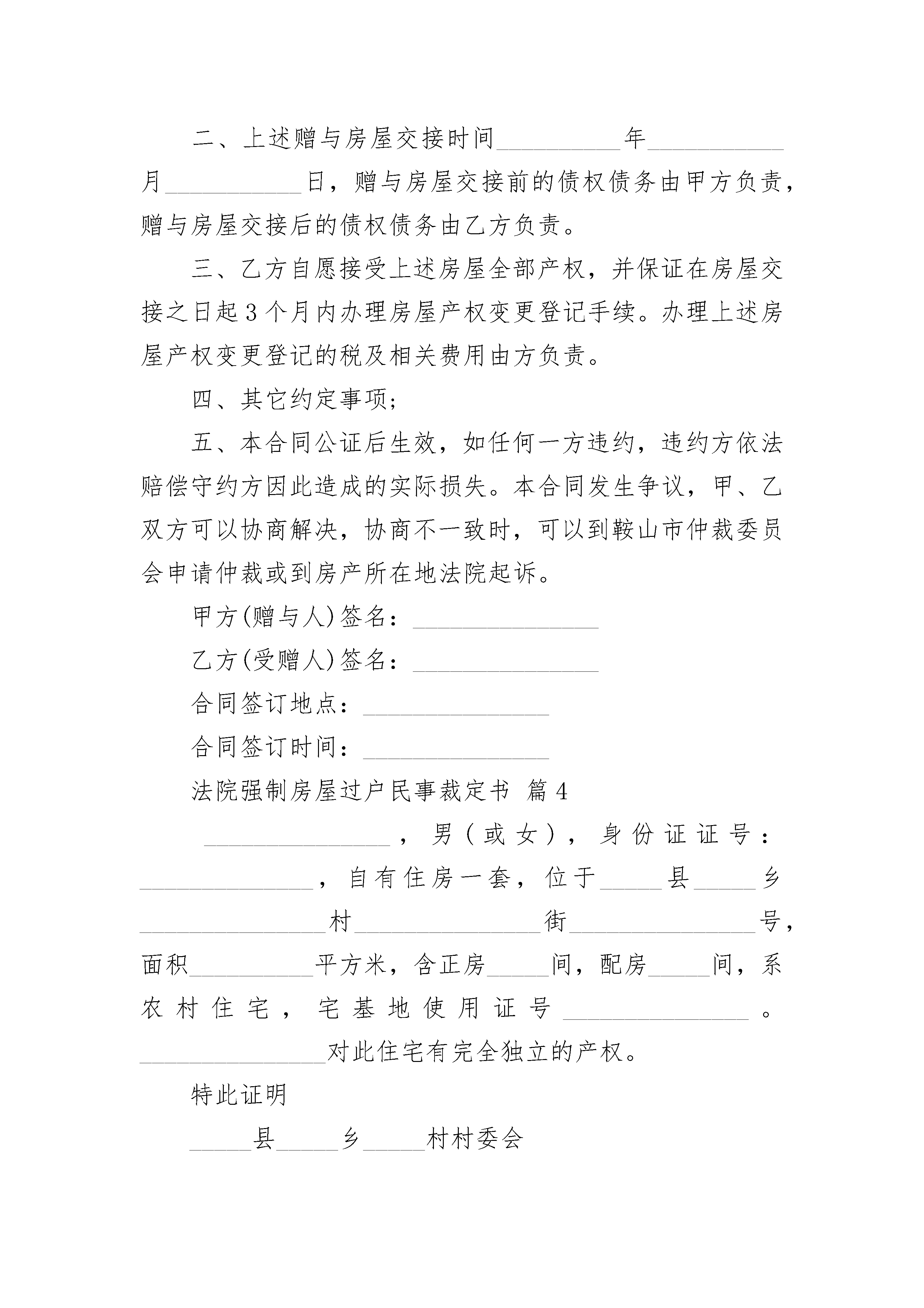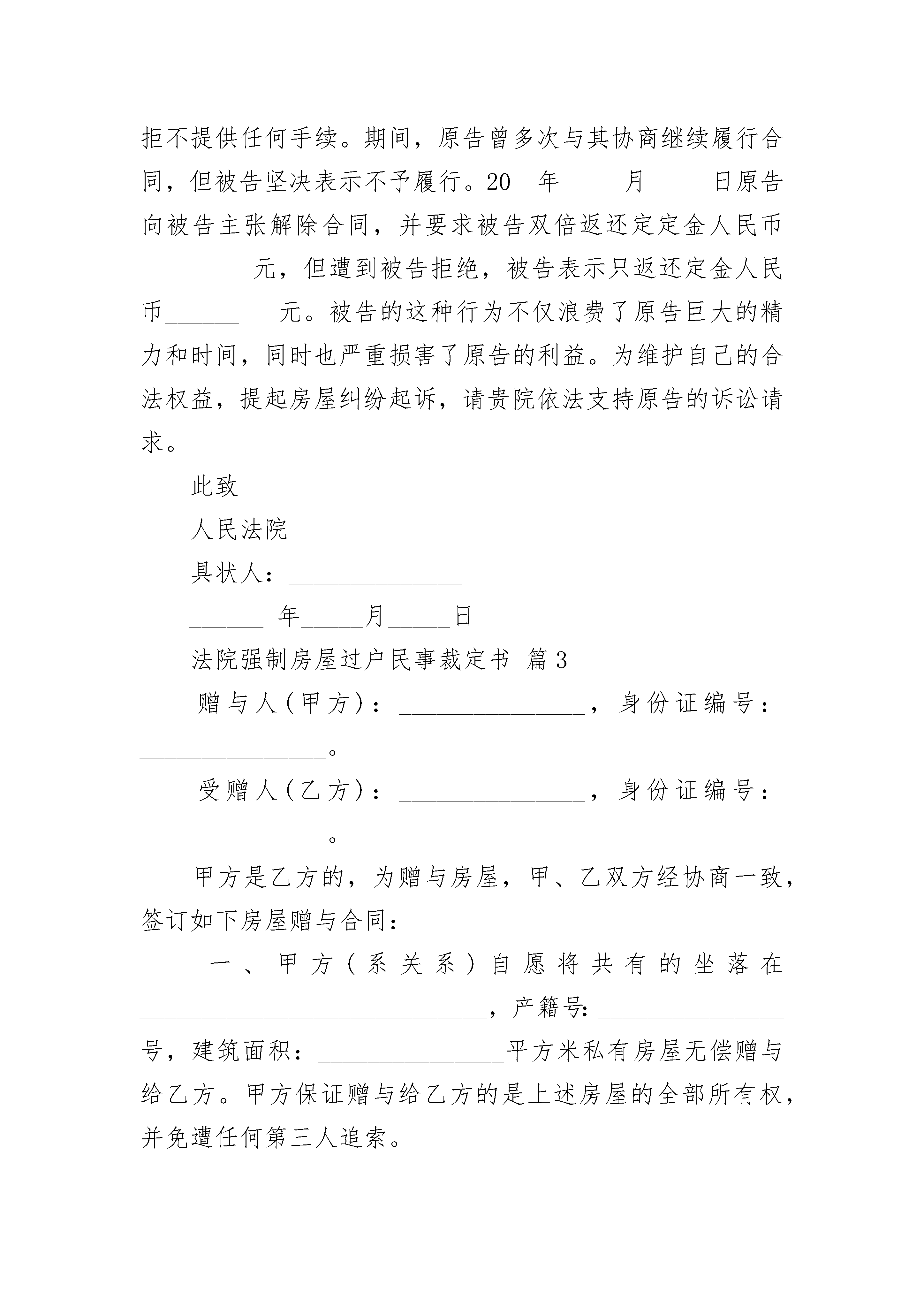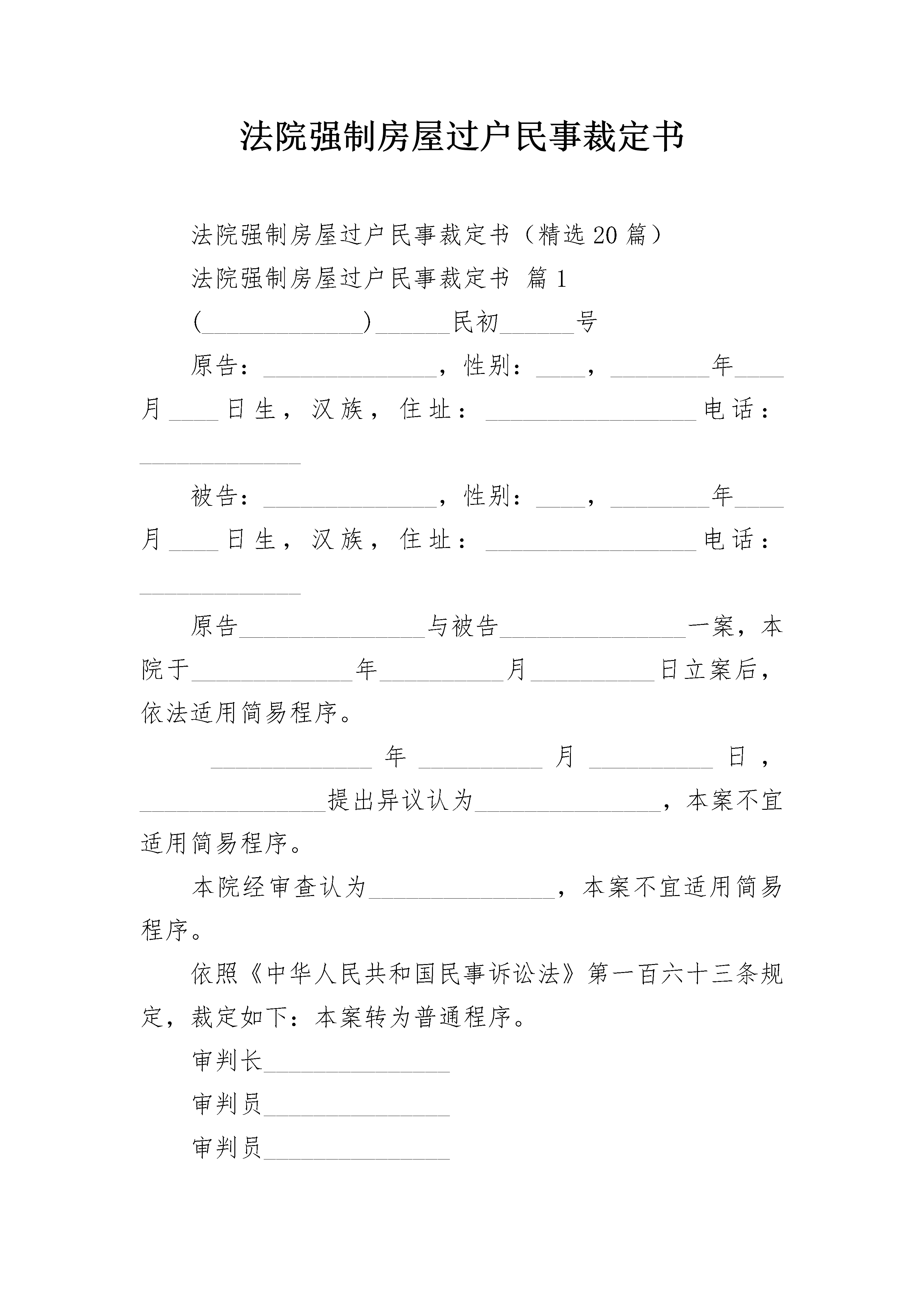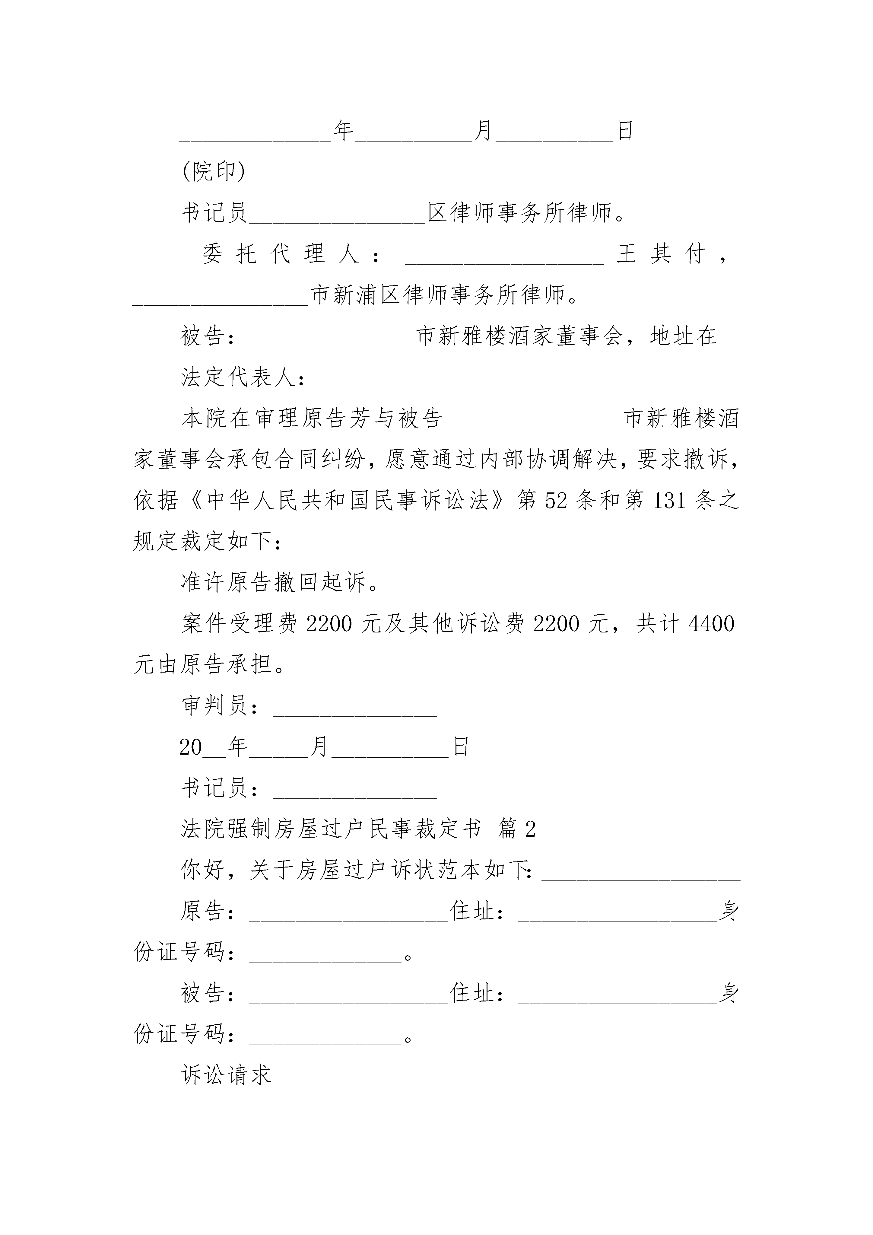 法院强制房屋过户民事裁定书法院强制房屋过户民事裁定书(精选20篇)法院强制房屋过户民事裁定书篇1(_____________)______民初______号原告:______________,性别:____,________年____月____日生,汉族,住址:_________________电话:_____________被告:______________,性别:____,________年____月____日生,汉族,住址:_________________电话:_____________原告_______________与被告_______________一案,本院于_____________年__________月__________日立案后,依法适用简易程序。_____________年__________月__________日,_______________提出异议认为_______________,本案不宜适用简易程序。本院经审查认为_______________,本案不宜适用简易程序。依照《中华人民共和国民事诉讼法》第一百六十三条规定,裁定如下:本案转为普通程序。审判长_______________审判员_______________审判员____________________________年__________月__________日(院印)书记员_______________区律师事务所律师。委托代理人:_________________王其付,_______________市新浦区律师事务所律师。被告:______________市新雅楼酒家董事会,地址在法定代表人:_________________本院在审理原告芳与被告_______________市新雅楼酒家董事会承包合同纠纷,愿意通过内部协调解决,要求撤诉,依据《中华人民共和国民事诉讼法》第52条和第131条之规定裁定如下:_________________准许原告撤回起诉。案件受理费2200元及其他诉讼费2200元,共计4400元由原告承担。审判员:______________20__年_____月__________日书记员:______________法院强制房屋过户民事裁定书篇2你好,关于房屋过户诉状范本如下:_________________原告:_________________住址:_________________身份证号码:_____________。被告:_________________住址:_________________身份证号码:_____________。诉讼请求1、判令被告承担违约责任,向原告双倍返还定金人民币______元,并承担卖方未履行合同产生的全部费用;2、由被告承担本案的诉讼费用。事实和理由20__年_____月_____日原被告在__________房产代理有限公司__________分公司的居间斡旋下签订了《房地产买卖三方合同》。该合同约定:_________________原告购买被告位于__________市__________小区个人住房,建筑面积为109.64平方米。产权转移手续由经纪方负责办理,买卖双方应积极协助和配合经纪方办理相关手续,并在签署本合同之日起5个工作日内分别提供办理产权转移所需的手续应由买卖双方各自提供的全部资料给经纪方。如卖方未能履行合同约定的义务,买方给予卖方1个工作日宽限期履行义务,从宽限期届满之日起如卖方仍未履行合同义务的,每逾期一日,应按合同总价款的万分之五,向买方支付违约金,逾期满10日仍未履行合同义务,买方有权单方接触合同,卖方应双倍返还定金予买方,并承担卖方未履行合同产生的全部费用,已收取买方的房款应当日退回给买方,买方不可再进一步要求卖方做任何赔偿或迫使卖方履行本合同。合同签订后,原告如约向被告支付了购房定金人民币______元。依据合同的约定,被告应当积极协助和配合经纪方办理所购房屋提供办理房屋所有权证书更名等的所有凭证和手续。但被告于20__年_____月_____日在毫无理由的情况下,明确表示拒绝履行合同,直至现在,被告仍无理拒不提供任何手续。期间,原告曾多次与其协商继续履行合同,但被告坚决表示不予履行。20__年_____月_____日原告向被告主张解除合同,并要求被告双倍返还定定金人民币______元,但遭到被告拒绝,被告表示只返还定金人民币______元。被告的这种行为不仅浪费了原告巨大的精力和时间,同时也严重损害了原告的利益。为维护自己的合法权益,提起房屋纠纷起诉,请贵院依法支持原告的诉讼请求。此致人民法院具状人:____________________年_____月_____日法院强制房屋过户民事裁定书篇3赠与人(甲方):_