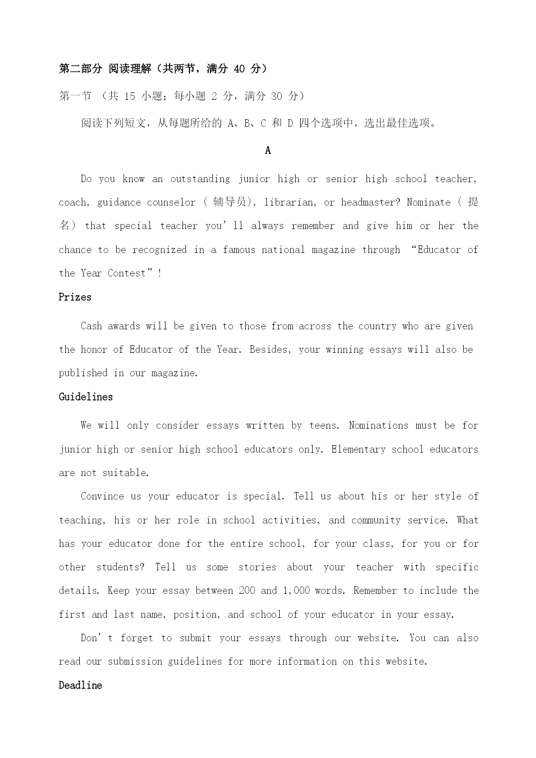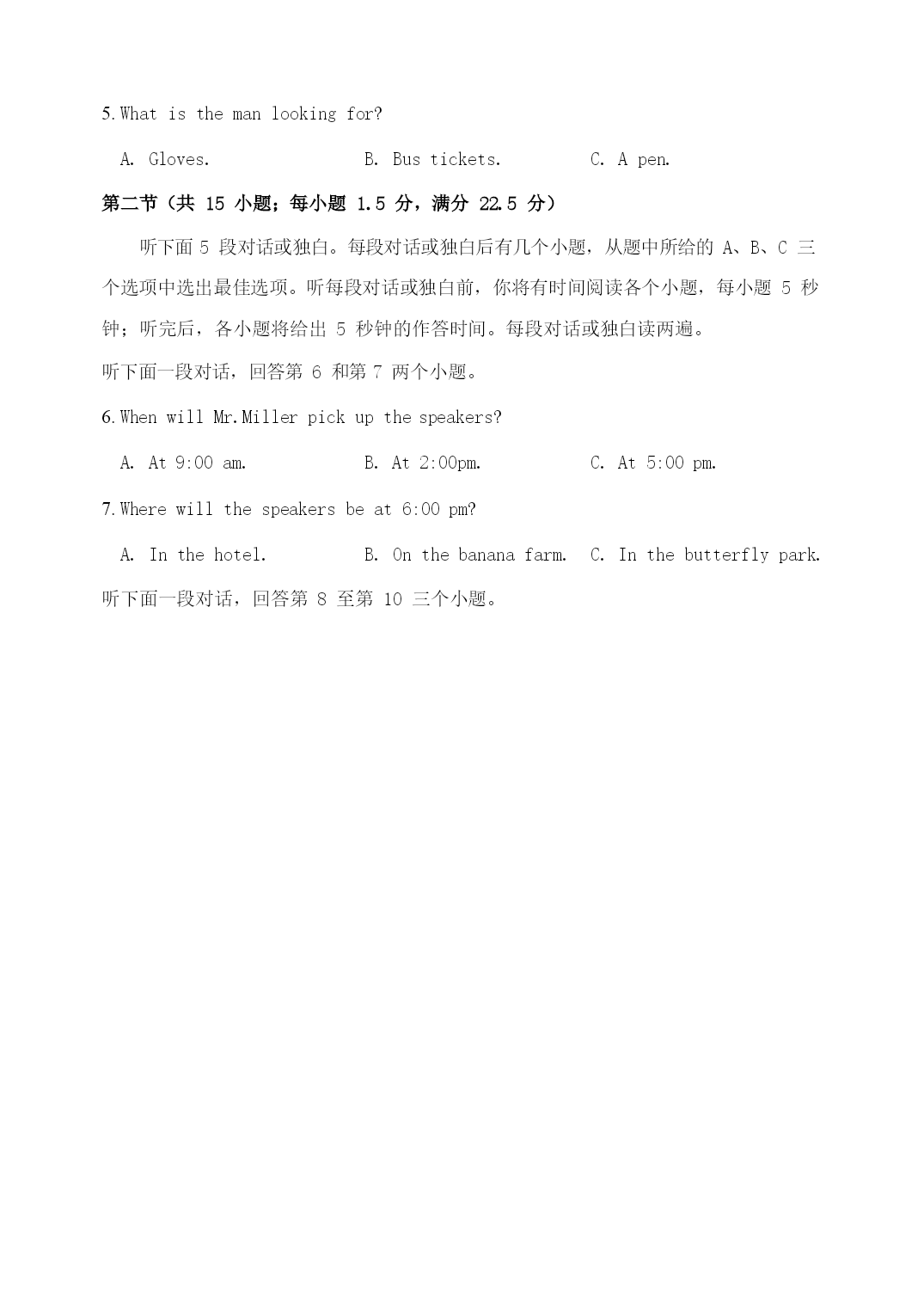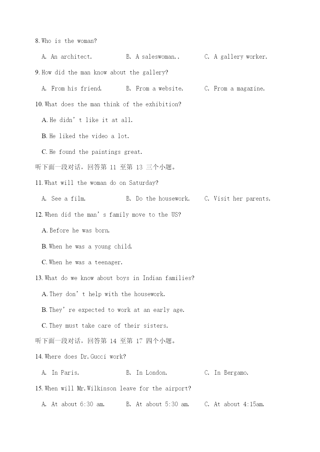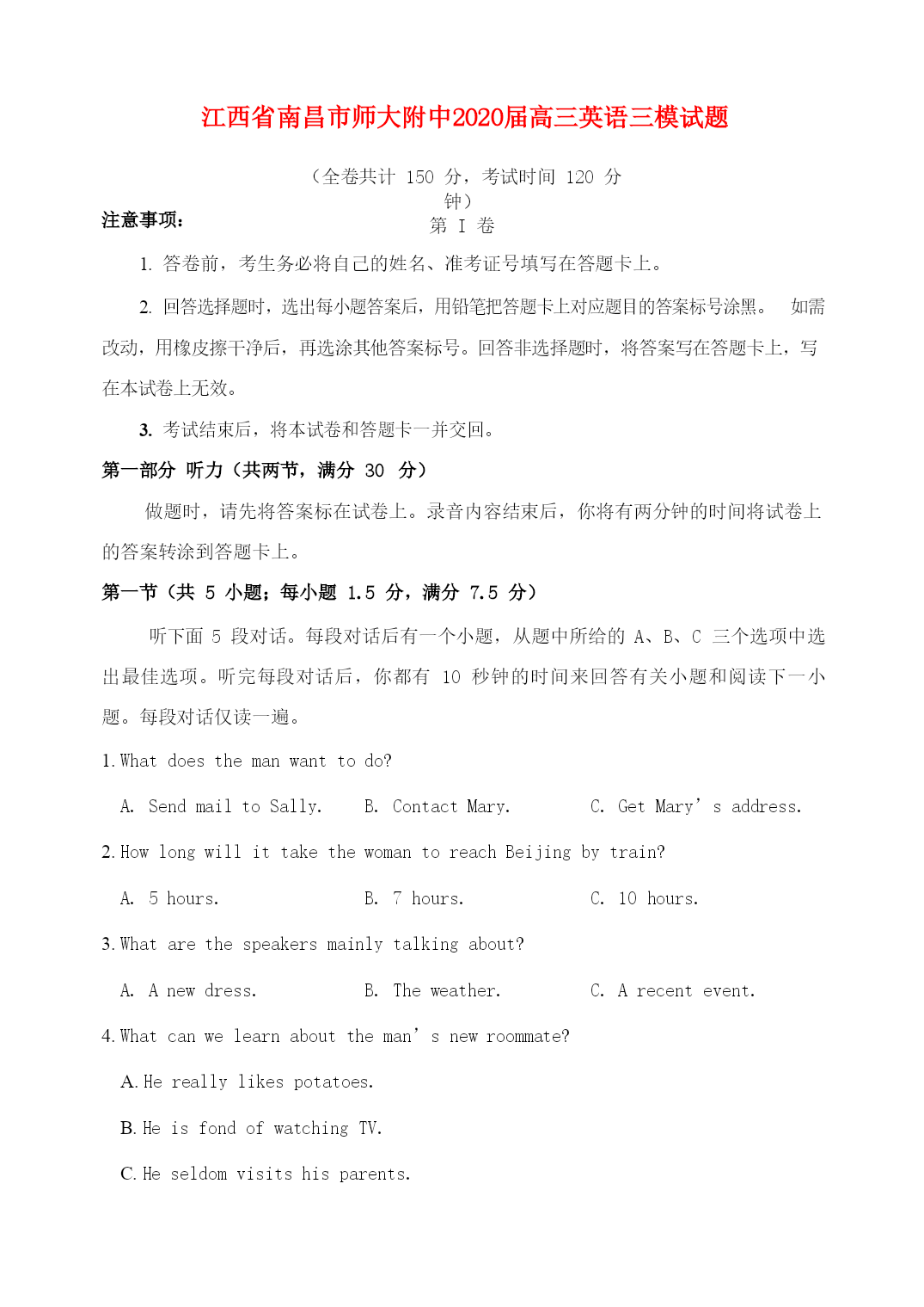 江西省南昌市师大附中2020届高三英语三模试题 注意事项: (全卷共计150分,考试时间120分钟) 第I卷 答卷前,考生务必将自己的姓名、准考证号填写在答题卡上。 回答选择题时,选出每小题答案后,用铅笔把答题卡上对应题目的答案标号涂黑。如需改动,用橡皮擦干净后,再选涂其他答案标号。回答非选择题时,将答案写在答题卡上,写在本试卷上无效。 考试结束后,将本试卷和答题卡一并交回。第一部分听力(共两节,满分30分) 做题时,请先将答案标在试卷上。录音内容结束后,你将有两分钟的时间将试卷上的答案转涂到答题卡上。 第一节(共5小题;每小题1.5分,满分7.5分) 听下面5段对话。每段对话后有一个小题,从题中所给的A、B、C三个选项中选出最佳选项。听完每段对话后,你都有10秒钟的时间来回答有关小题和阅读下一小题。每段对话仅读一遍。 Whatdoesthemanwanttodo? A.SendmailtoSally. B.ContactMary. C.GetMary’saddress. HowlongwillittakethewomantoreachBeijingbytrain? A.5hours. B.7hours. C.10hours. Whatarethespeakersmainlytalkingabout? A.Anewdress. B.Theweather. C.Arecentevent. Whatcanwelearnabouttheman’snewroommate? Hereallylikespotatoes. HeisfondofwatchingTV. Heseldomvisitshisparents. Whatisthemanlookingfor? A.Gloves. B.Bustickets. C.Apen. 第二节(共15小题;每小题1.5分,满分22.5分) 听下面5段对话或独白。每段对话或独白后有几个小题,从题中所给的A、B、C三个选项中选出最佳选项。听每段对话或独白前,你将有时间阅读各个小题,每小题5秒 钟;听完后,各小题将给出5秒钟的作答时间。每段对话或独白读两遍。 听下面一段对话,回答第6和第7两个小题。 WhenwillMr.Millerpickupthespeakers? A.At9:00am. B.At2:00pm. C.At5:00pm. Wherewillthespeakersbeat6:00pm? A.Inthehotel. B.Onthebananafarm. C.Inthebutterflypark. 听下面一段对话,回答第8至第10三个小题。 Whoisthewoman? A.Anarchitect. B.Asaleswoman.. C.Agalleryworker. Howdidthemanknowaboutthegallery? A.Fromhisfriend. B.Fromawebsite. C.Fromamagazine. Whatdoesthemanthinkoftheexhibition? Hedidn’tlikeitatall. Helikedthevideoalot. Hefoundthepaintingsgreat. 听下面一段对话,回答第11至第13三个小题。 WhatwillthewomandoonSaturday? A.Seeafilm. B.Dothehousework. C.Visitherparents. Whendidtheman’sfamilymovetotheUS? Beforehewasborn. Whenhewasayoungchild. Whenhewasateenager. WhatdoweknowaboutboysinIndianfamilies? Theydon’thelpwiththehousework. They’reexpectedtoworkatanearlyage. Theymusttakecareoftheirsisters. 听下面一段对话,回答第14至第17四个小题。 WheredoesDr.Gucciwork? A.InParis. B.InLondon. C.InBergamo. WhenwillMr.Wilkinsonleavefortheairport? A.Atabout6:30am. B.Atabout5:30am. C.Atabout4:15am. WithwhomwillMr.WilkinsonhavelunchonMonday? A.Gavin. B.GianniRiva. C.Mr.Brown. WhatisLindamostprobably? A.Asecretary. B.Atourguide. C