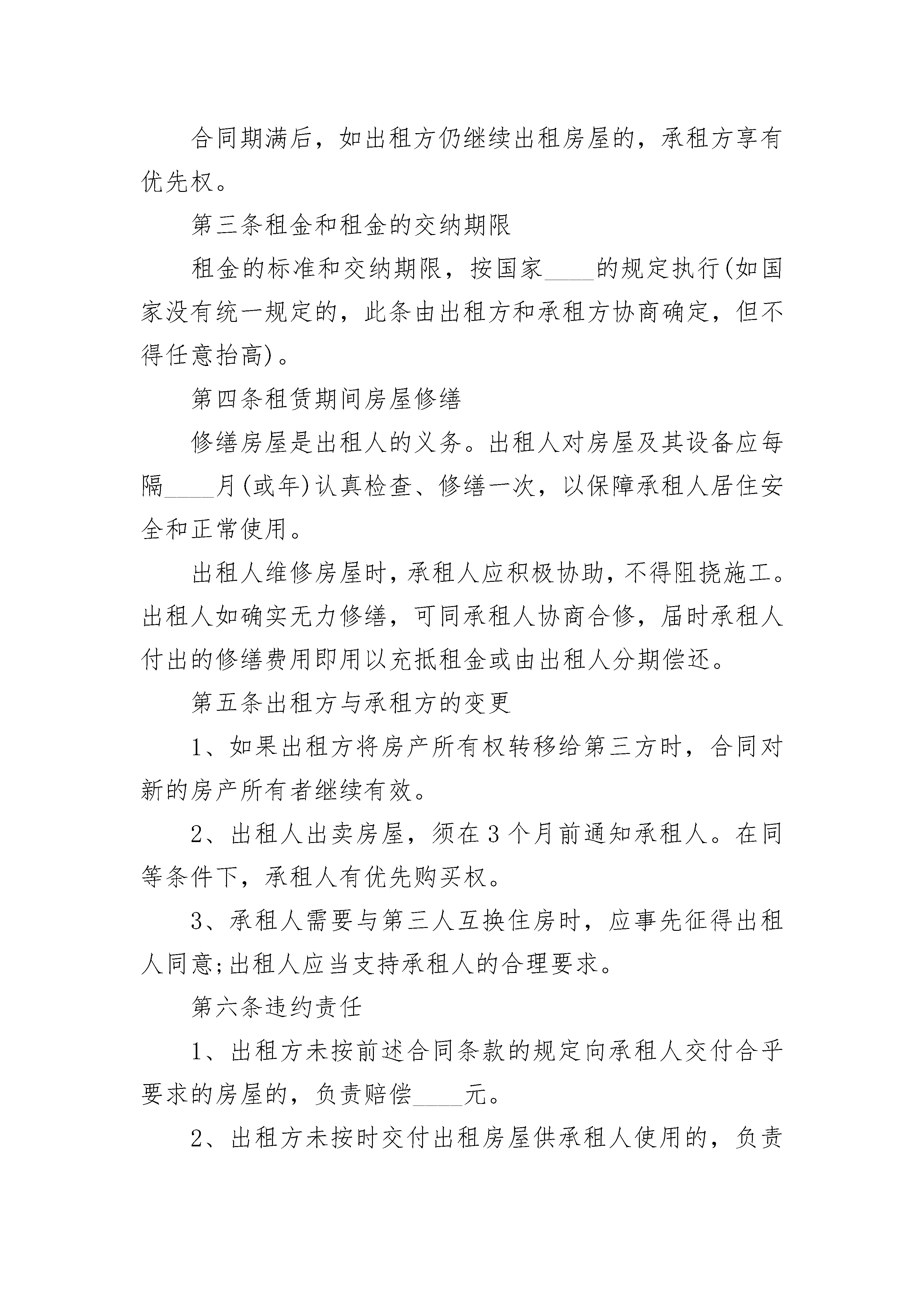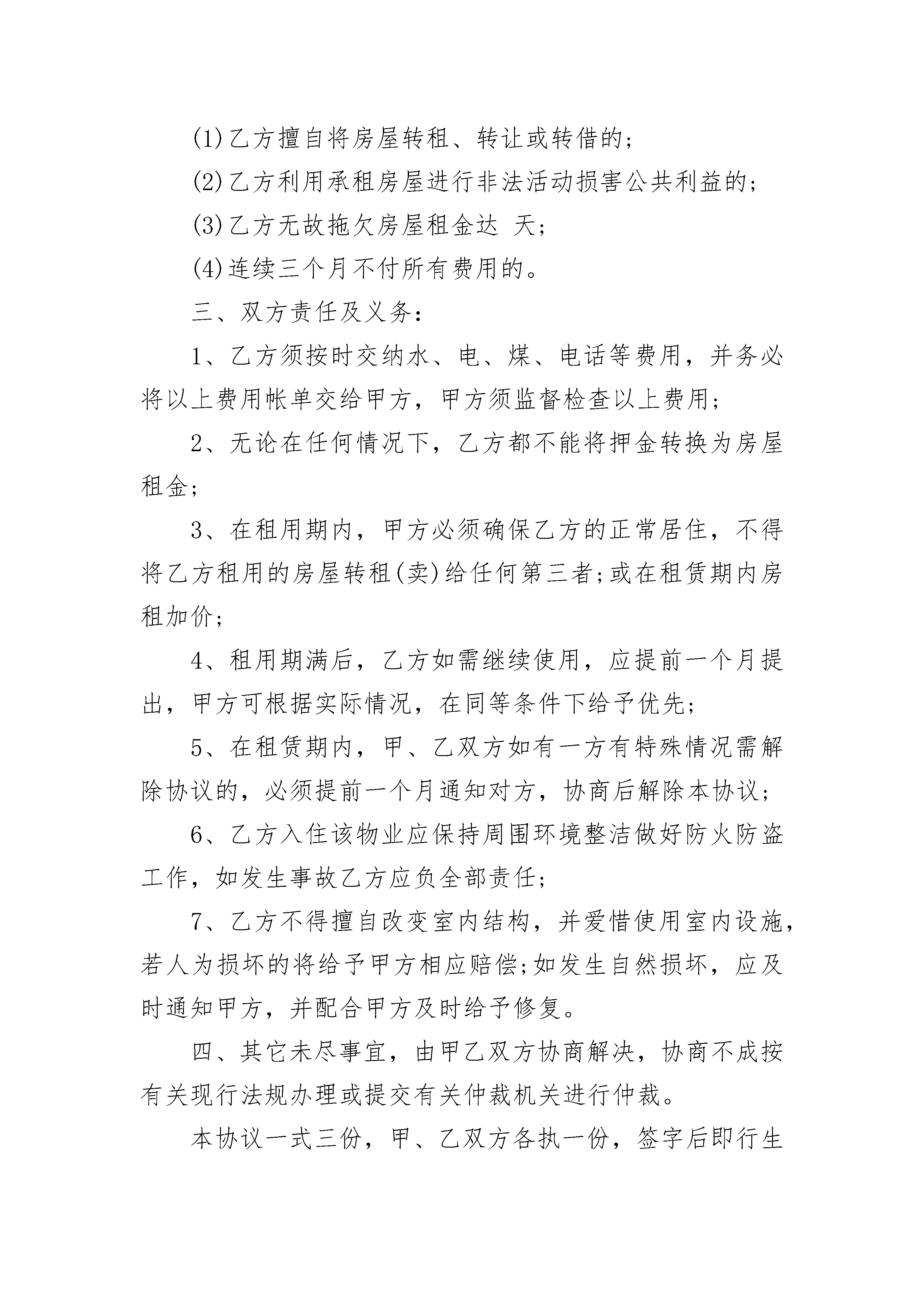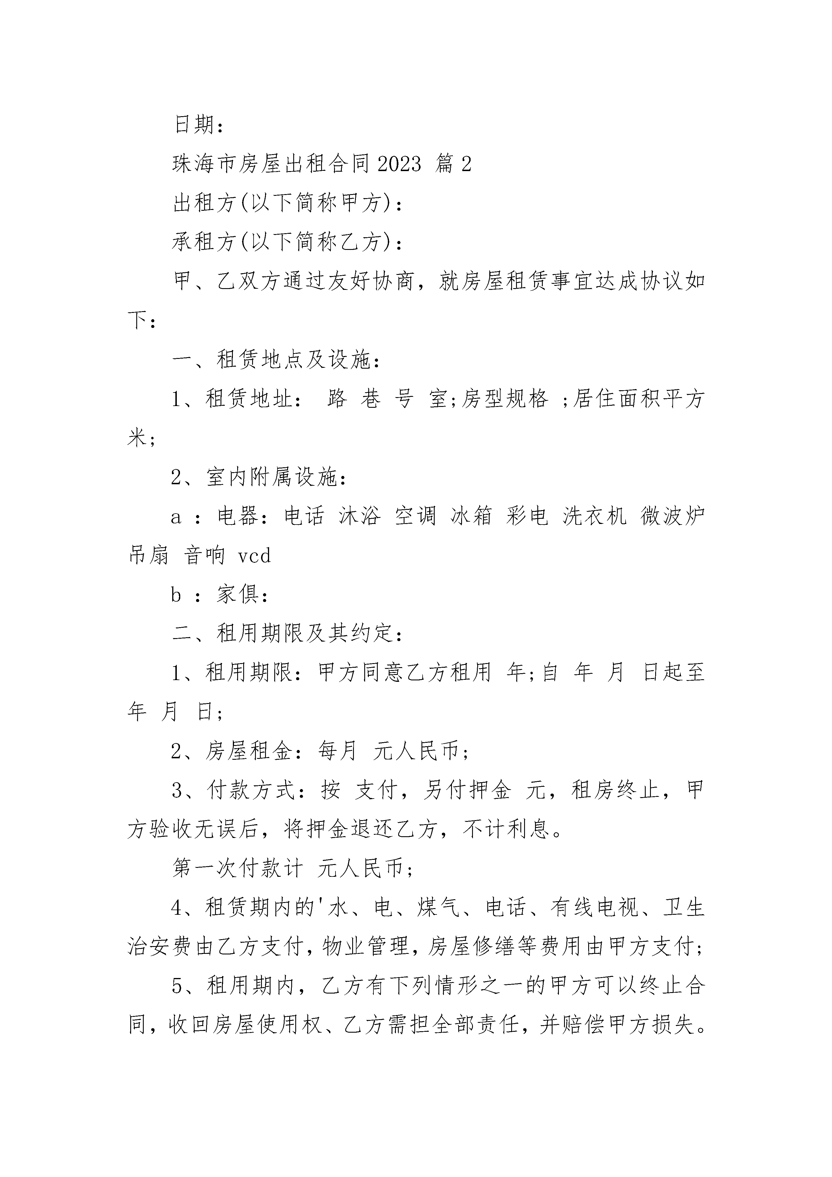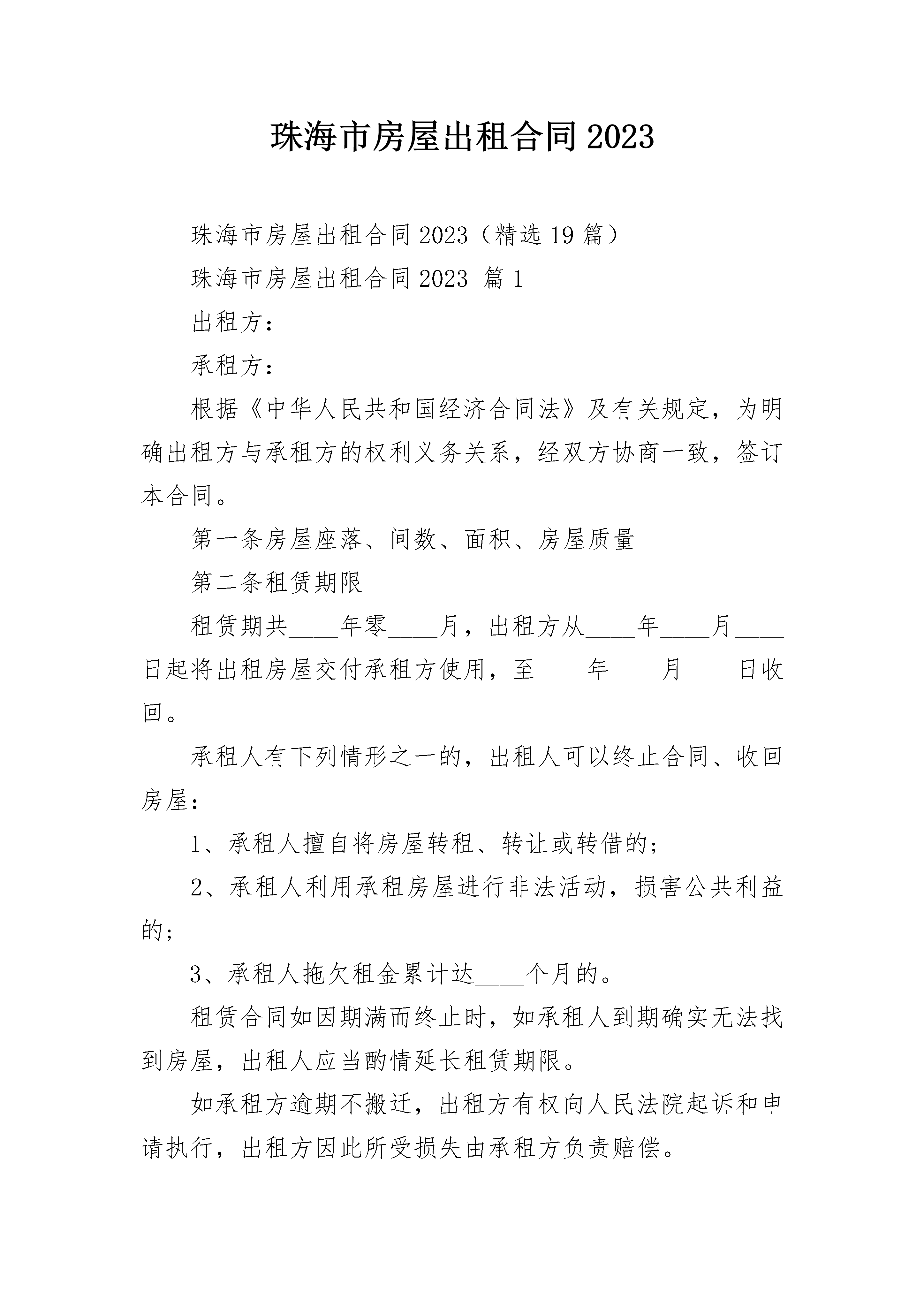 珠海市房屋出租合同2023珠海市房屋出租合同2023(精选19篇)珠海市房屋出租合同2023篇1出租方:承租方:根据《中华人民共和国经济合同法》及有关规定,为明确出租方与承租方的权利义务关系,经双方协商一致,签订本合同。第一条房屋座落、间数、面积、房屋质量第二条租赁期限租赁期共____年零____月,出租方从____年____月____日起将出租房屋交付承租方使用,至____年____月____日收回。承租人有下列情形之一的,出租人可以终止合同、收回房屋:1、承租人擅自将房屋转租、转让或转借的;2、承租人利用承租房屋进行非法活动,损害公共利益的;3、承租人拖欠租金累计达____个月的。租赁合同如因期满而终止时,如承租人到期确实无法找到房屋,出租人应当酌情延长租赁期限。如承租方逾期不搬迁,出租方有权向人民法院起诉和申请执行,出租方因此所受损失由承租方负责赔偿。合同期满后,如出租方仍继续出租房屋的,承租方享有优先权。第三条租金和租金的交纳期限租金的标准和交纳期限,按国家____的规定执行(如国家没有统一规定的,此条由出租方和承租方协商确定,但不得任意抬高)。第四条租赁期间房屋修缮修缮房屋是出租人的义务。出租人对房屋及其设备应每隔____月(或年)认真检查、修缮一次,以保障承租人居住安全和正常使用。出租人维修房屋时,承租人应积极协助,不得阻挠施工。出租人如确实无力修缮,可同承租人协商合修,届时承租人付出的修缮费用即用以充抵租金或由出租人分期偿还。第五条出租方与承租方的变更1、如果出租方将房产所有权转移给第三方时,合同对新的房产所有者继续有效。2、出租人出卖房屋,须在3个月前通知承租人。在同等条件下,承租人有优先购买权。3、承租人需要与第三人互换住房时,应事先征得出租人同意;出租人应当支持承租人的合理要求。第六条违约责任1、出租方未按前述合同条款的规定向承租人交付合乎要求的房屋的,负责赔偿____元。2、出租方未按时交付出租房屋供承租人使用的,负责偿付违约金____元。3、出租方未按时(或未按要求)修缮出租房屋的,负责偿付违约金____元;如因此造成承租方人员人身受到伤害或财物受毁的,负责赔偿损失。4、承租方逾期交付租金的,除仍应及时如数补交外,应支付违约金____元。5、承租方违反合同,擅自将承租房屋转给他人使用的,应支付违约金____元;如因此造成承租房屋毁坏的,还应负责赔偿。第七条免责条件房屋如因不可抗力的原因导致毁损和造成承租方损失的,双方互不承担责任。第八条争议的解决方式本合同在履行中如发生争议,双方应协商解决;协商不成时,任何一方均可向工商局经济合同仲裁委员会申请调解或仲裁,也可以向人民法院起诉。第九条其他约定事项第十条本合同未尽事宜,一律按《中华人民共和国经济合同法》的有关规定,经合同双方共同协商,作出补充规定,补充规定与本合同具有同等效力。本合同正本一式2份,出租方、承租方各执1份;合同副本____份,送____单位备案。出租方(盖章)承租方(盖章)日期:珠海市房屋出租合同2023篇2出租方(以下简称甲方):承租方(以下简称乙方):甲、乙双方通过友好协商,就房屋租赁事宜达成协议如下:一、租赁地点及设施:1、租赁地址:路巷号室;房型规格;居住面积平方米;2、室内附属设施:a:电器:电话沐浴空调冰箱彩电洗衣机微波炉吊扇音响vcdb:家俱:二、租用期限及其约定:1、租用期限:甲方同意乙方租用年;自年月日起至年月日;2、房屋租金:每月元人民币;3、付款方式:按支付,另付押金元,租房终止,甲方验收无误后,将押金退还乙方,不计利息。第一次付款计元人民币;4、租赁期内的'水、电、煤气、电话、有线电视、卫生治安费由乙方支付,物业管理,房屋修缮等费用由甲方支付;5、租用期内,乙方有下列情形之一的甲方可以终止合同,收回房屋使用权、乙方需担全部责任,并赔偿甲方损失。(1)乙方擅自将房屋转租、转让或转借的;(2)乙方利用承租房屋进行非法活动损害公共利益的;(3)乙方无故拖欠房屋租金达天;(4)连续三个月不付所有费用的。三、双方责任及义务:1、乙方须按时交纳水、电、煤、电话等费用,并务必将以上费用帐单交给甲方,甲方须监督检查以上费用;2、无论在任何情况下,乙方都不能将押金转换为房屋租金;3、在租用期内,甲方必须确保乙方的正常居住,不得将乙方租用的房屋转租(卖)给任何第三者;或在租赁期内房租加价;4、租用期满后,乙方如需继续使用,应提前一个月提出,甲方可根据实际情况,在同等条件下给予优先;5、在租赁期内,甲、乙双方如有一方有特殊情况需解除协议的,必须提前一个月通知对方,协商后解除本协议;6、乙方入住该物业应保持周围环境整洁做好防火防盗工作,如发生事故乙方应负全部责任;7、乙方不得擅自改变室内结构,并爱惜使用室内设施,若人为损坏的将给予甲方相应