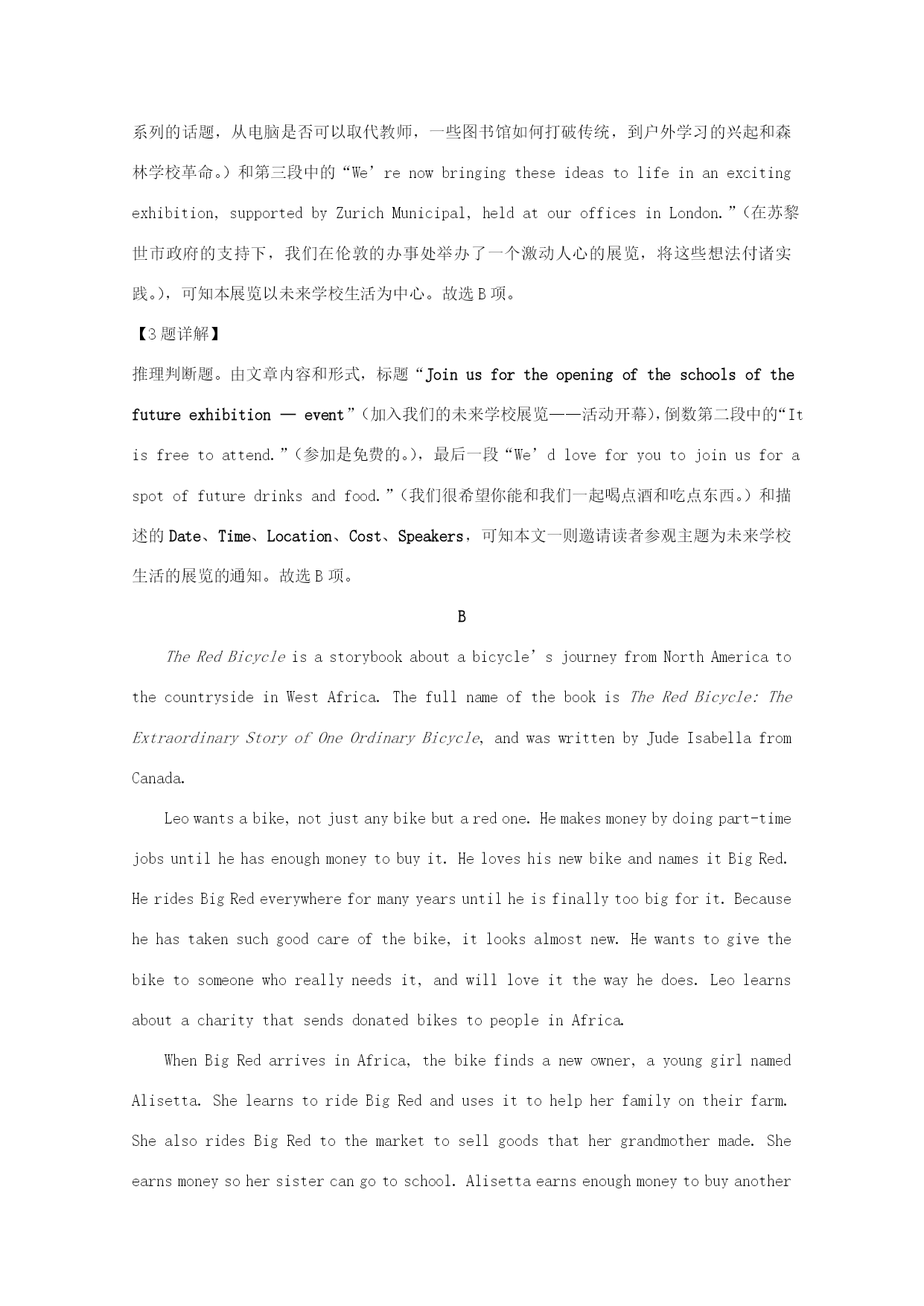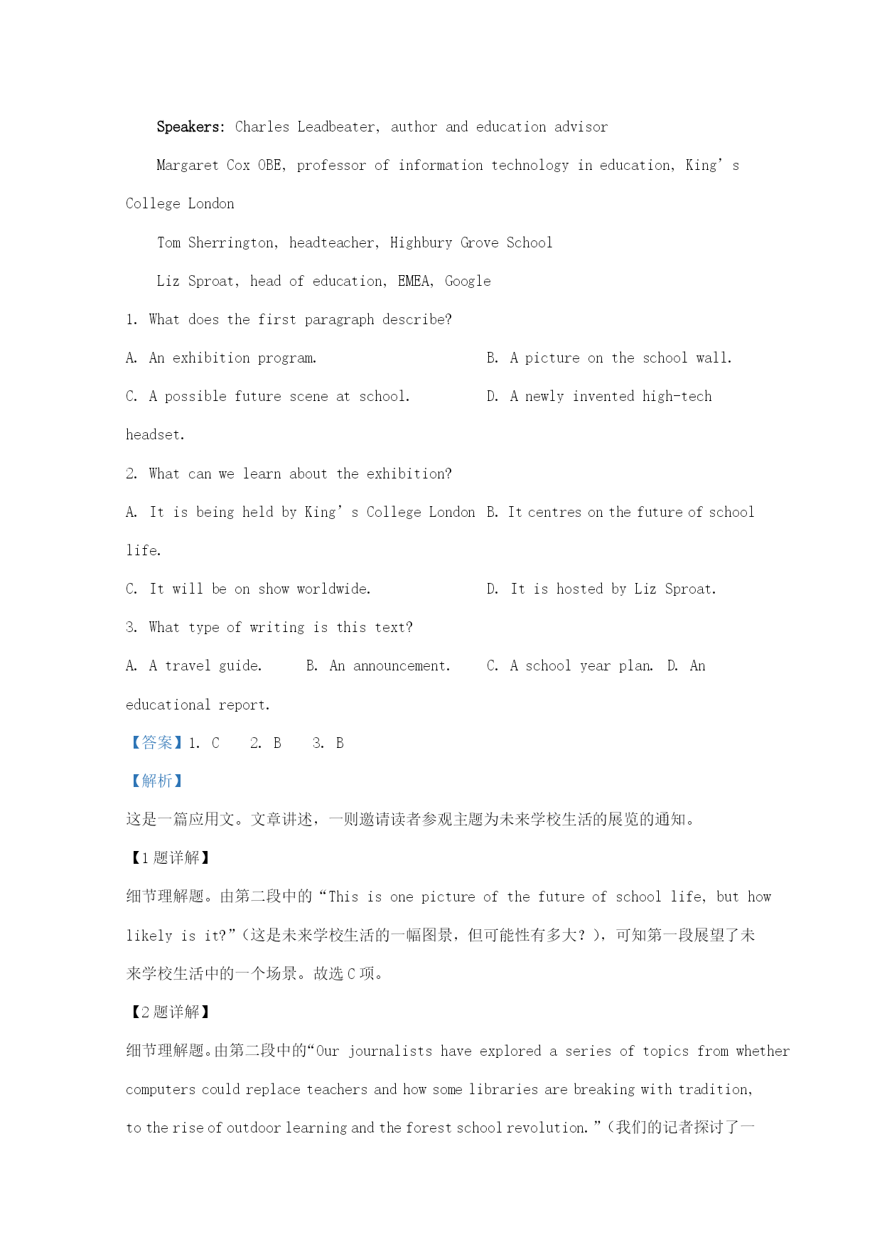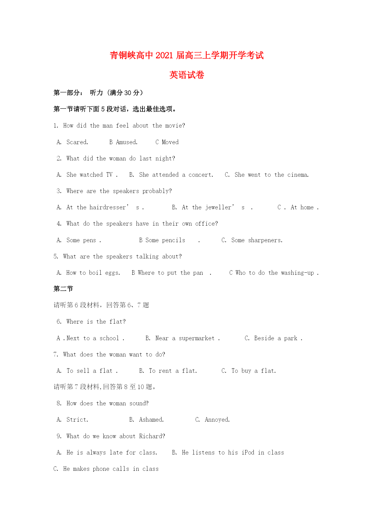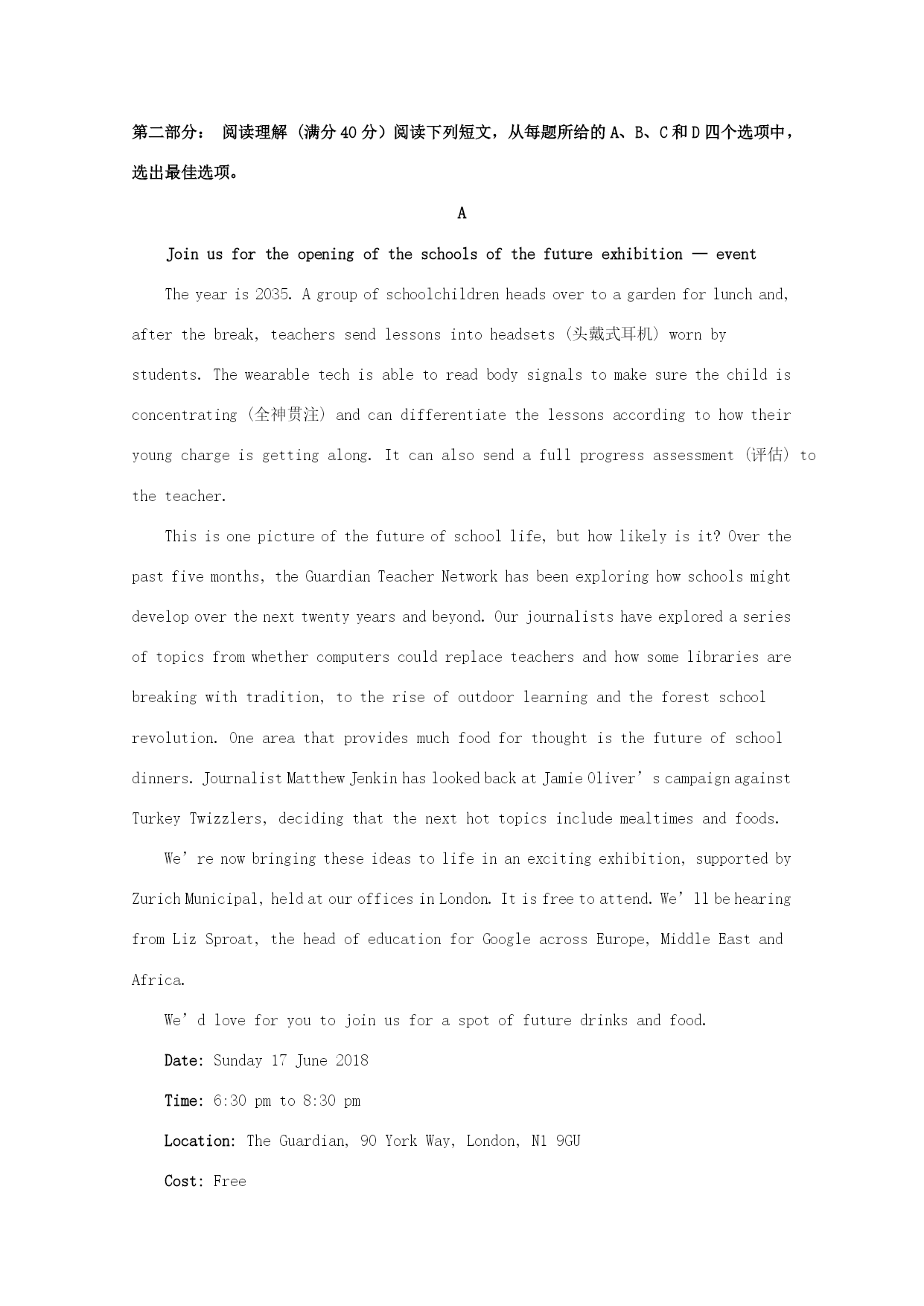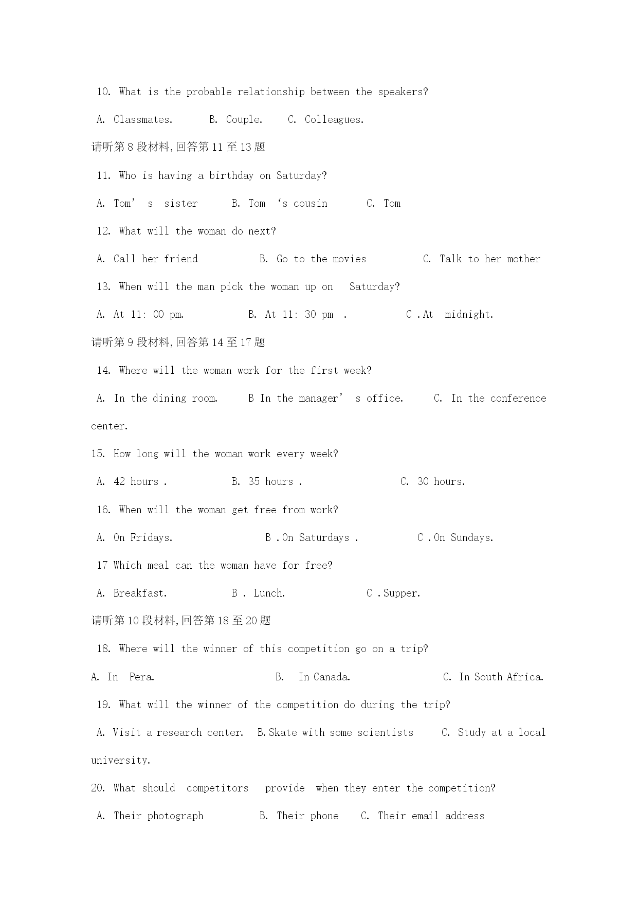 青铜峡高中2021届高三上学期开学考试 英语试卷 第一部分:听力(满分30分) 第一节请听下面5段对话,选出最佳选项。 1.Howdidthemanfeelaboutthemovie? A.Scared.BAmused.CMoved 2.Whatdidthewomandolastnight? A.ShewatchedTV.B.Sheattendedaconcert.C.Shewenttothecinema. 3.Wherearethespeakersprobably? A.Atthehairdresser’s.B.Atthejeweller’s.C.Athome. 4.Whatdothespeakershaveintheirownoffice? A.Somepens.BSomepencils.C.Somesharpeners. 5.Whatarethespeakerstalkingabout? A.Howtoboileggs.BWheretoputthepan.CWhotodothewashing-up. 第二节 请听第6段材料,回答第6、7题 6.Whereistheflat? A.Nexttoaschool.B.Nearasupermarket.C.Besideapark. 7.Whatdoesthewomanwanttodo? A.Tosellaflat.B.Torentaflat.C.Tobuyaflat. 请听第7段材料,回答第8至10题。 8.Howdoesthewomansound? A.Strict.B.Ashamed.C.Annoyed. 9.WhatdoweknowaboutRichard? A.Heisalwayslateforclass.B.HelistenstohisiPodinclass C.Hemakesphonecallsinclass 10.Whatistheprobablerelationshipbetweenthespeakers? A.Classmates.B.Couple.C.Colleagues. 请听第8段材料,回答第11至13题 11.WhoishavingabirthdayonSaturday? A.Tom’ssisterB.Tom‘scousinC.Tom 12.Whatwillthewomandonext? A.CallherfriendB.GotothemoviesC.Talktohermother 13.WhenwillthemanpickthewomanuponSaturday? A.At11:00pm.B.At11:30pm.C.Atmidnight. 请听第9段材料,回答第14至17题 14.Wherewillthewomanworkforthefirstweek? A.Inthediningroom.BInthemanager’soffice.C.Intheconferencecenter. 15.Howlongwillthewomanworkeveryweek? A.42hours.B.35hours.C.30hours. 16.Whenwillthewomangetfreefromwork? A.OnFridays.B.OnSaturdays.C.OnSundays. 17Whichmealcanthewomanhaveforfree? A.Breakfast.B.Lunch.C.Supper. 请听第10段材料,回答第18至20题 18.Wherewillthewinnerofthiscompetitiongoonatrip? A.InPera.B.InCanada.C.InSouthAfrica. 19.Whatwillthewinnerofthecompetitiondoduringthetrip? A.Visitaresearchcenter.B.SkatewithsomescientistsC.Studyatalocaluniversity. 20.Whatshouldcompetitorsprovidewhentheyenterthecompetition? A.TheirphotographB.TheirphoneC.Theiremailaddress 第二部分:阅读理解(满分40分)阅读下列短文,从每题所给的A、B、C和D四个选项中,选出最佳选项。 A Joinusfortheopeningoftheschoolsofthefutureexhibition—event Theyearis2035.Agroupofschoolchildrenheadsovertoagardenforlunchand,afterthebreak,teachers