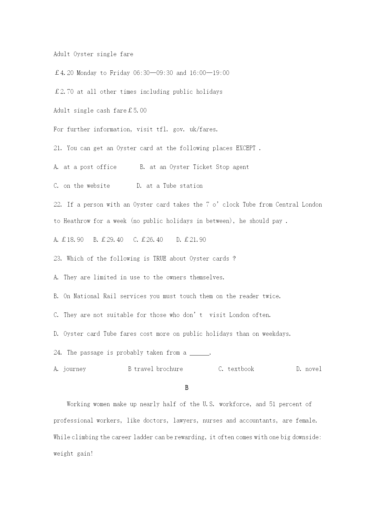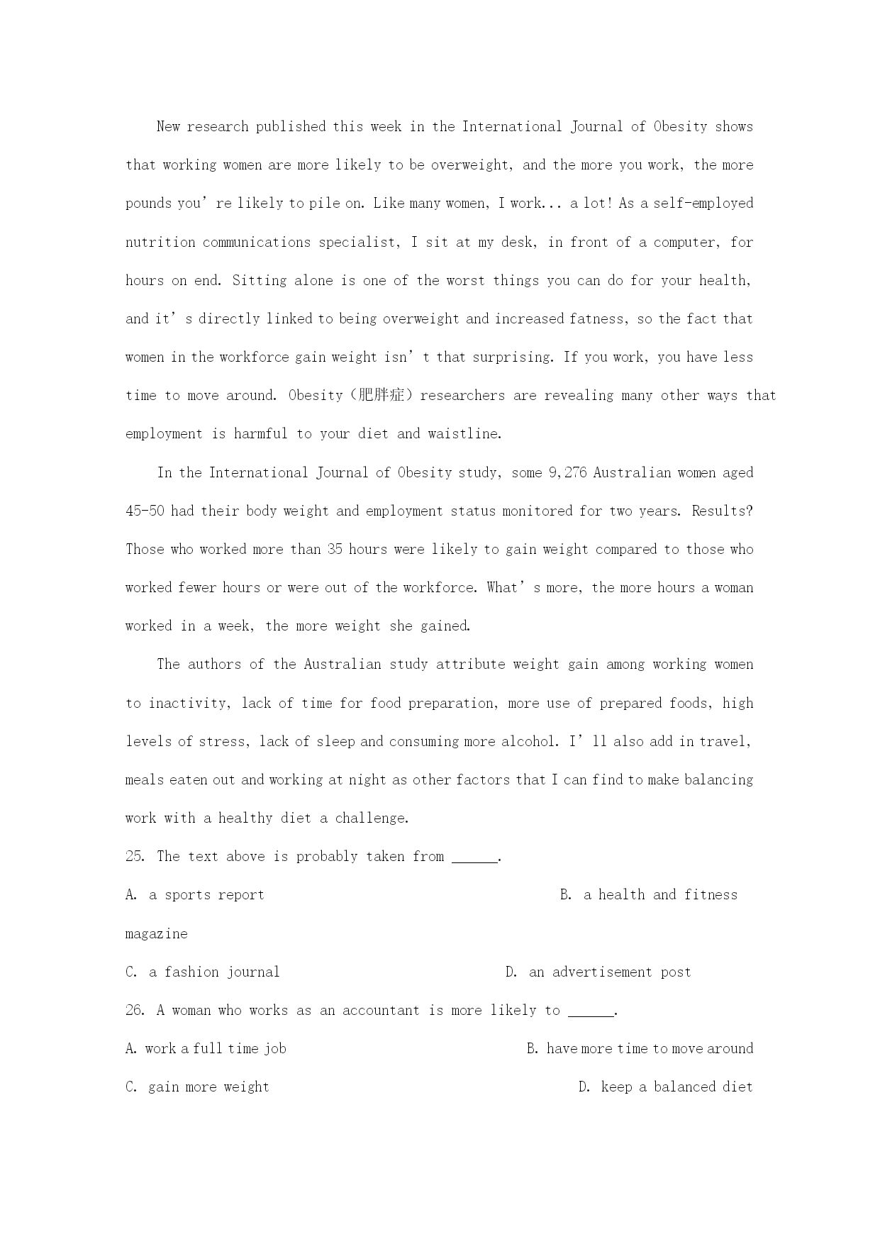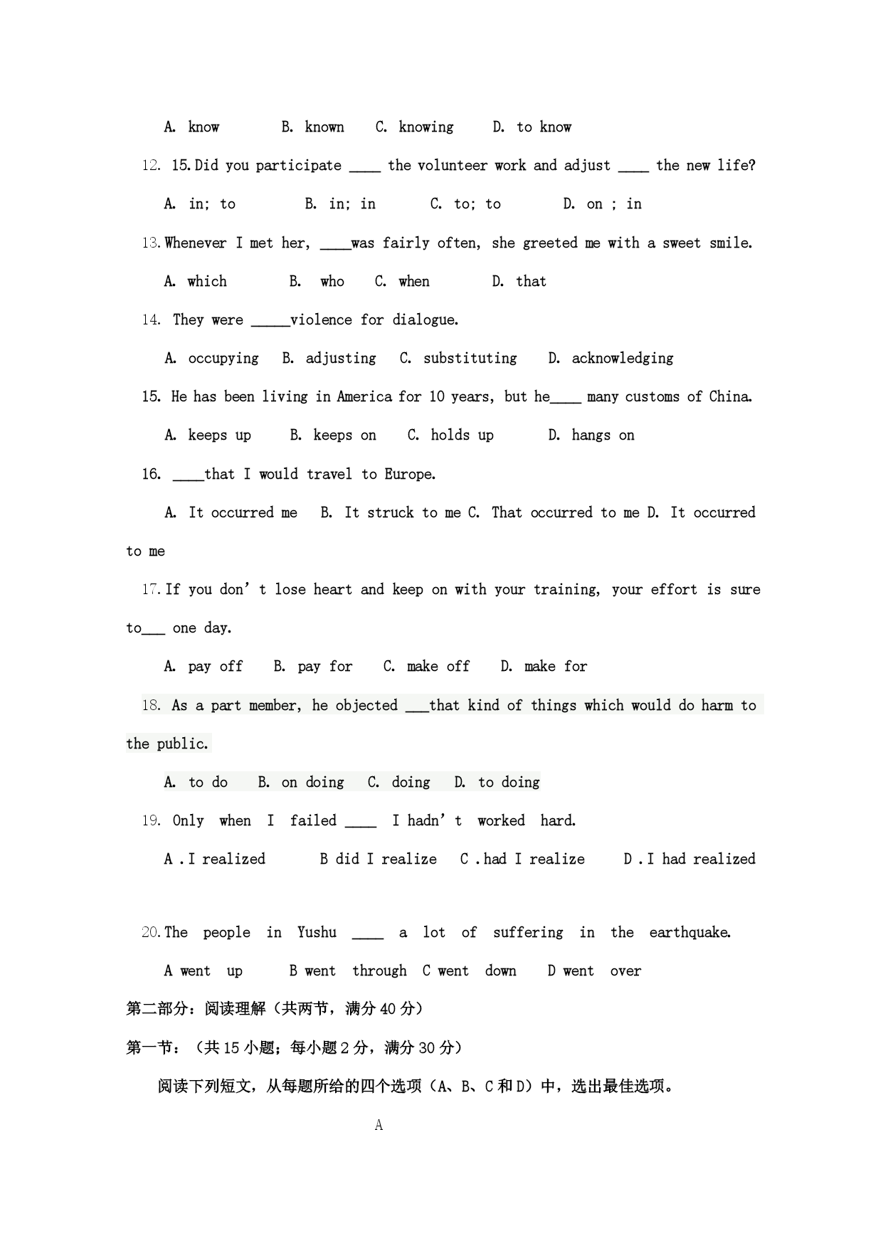 辽宁省辽河油田第二高级中学2017-2018学年高二英语下学期期中试题 第一部分:单选题(每小题1.5分,共30分) 1.Mymotherisalwaysbusywithherworkandshehasnotimeto_______. A.turnaroundB.stayupC.situpD.sitaround 2.Thejourneywaspleasant;themealwasdelicious.______,it’sasuccessfultrip. A.InallB.AllinallC.AfterallD.Atall 3.Thefailureinthedrivingtestmademe______. A.annoyingB.annoyedC.outgoingD.delighted 4.I_____mydeskmatetothedoctor’s. A.accompaniedB.mentionedC.stuckD.scanned 5.Ifhissparetimewas___asideforrelaxation,theoldmanwas___tohaveahealthylife. A.tobeset,boundsB.toset,boundC.set,boundD.setting,bounded 6.“_____whateverhappens”,declaredJohn,annoyedandupset,afterhefailedintheexam. A.TakeiteasyB.LeavemealoneC.MakeupmymindD.Cometolife 7.ThelostcarofLeeswasfound______inthewoodsoffthehighway. A.vanishedB.abandonedC.scatteredD.rejected 8.Hewasabouttotellmethesecret______someonepattedhimontheshoulder. A.asB.untilC.whileD.when 9.Hebecame______oftheimportanceoflearningEnglish. A.fondB.interestedC.famousD.aware 10.I’mhappyto_____you,InyourletterIcanknowaboutyourthings. A.hearofB.sufferfromC.hearfromD.recoverfrom 11.Iamdying____theresultoftheexam. A.knowB.knownC.knowingD.toknow 12.15.Didyouparticipate____thevolunteerworkandadjust____thenewlife? A.in;toB.in;inC.to;toD.on;in 13.WheneverImether,____wasfairlyoften,shegreetedmewithasweetsmile. A.whichB.whoC.whenD.that 14.Theywere_____violencefordialogue. A.occupyingB.adjustingC.substitutingD.acknowledging 15.HehasbeenlivinginAmericafor10years,buthe____manycustomsofChina. A.keepsupB.keepsonC.holdsupD.hangson 16.____thatIwouldtraveltoEurope. A.ItoccurredmeB.ItstrucktomeC.ThatoccurredtomeD.Itoccurredtome 17.Ifyoudon’tloseheartandkeeponwithyourtraining,youreffortissureto___oneday. A.payoffB.payforC.makeoffD.makefor 18.Asapartmember,heobjected___thatkindofthingswhichwoulddoharmtothepublic. A.todoB.ondoingC.doingD.todoing 19.OnlywhenIfailed____Ihadn’tworkedhard. A.IrealizedBdidIrealizeC.hadIrealizeD.Ihadrealized 20.ThepeopleinYushu____alotofsufferingintheearthquake. AwentupBwentthroughCwentd
