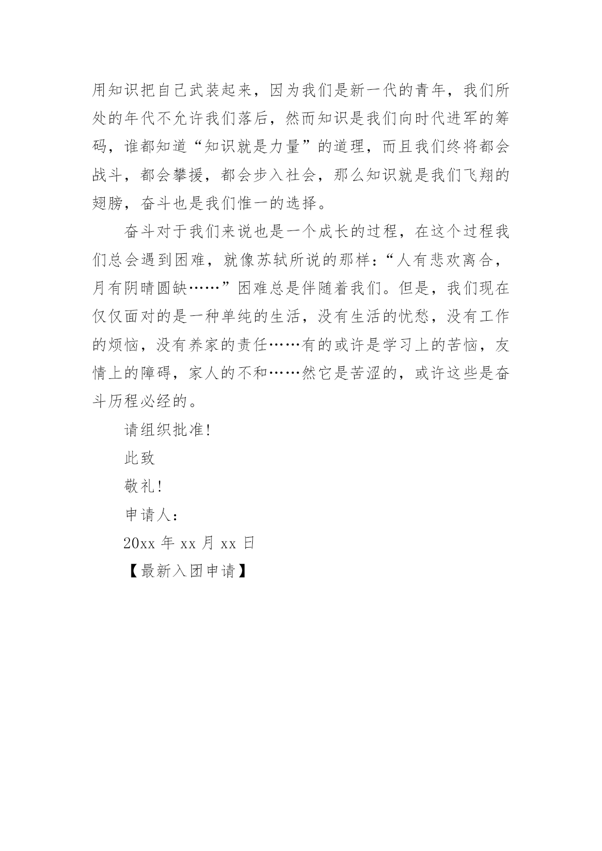 最新入团申请 最新入团申请模板团支部:您好,我今年已经初三了,马上就要面临考高中了,我想在毕业之前加入光荣的共青团!中国共产主义青年团加强思想政治工作,坚持对青年的教育和引导,组织青年学习马克思主义的基本原理,学习建设有中国特色社会主义的理论,广泛开展党的基本路线教育,爱国主义,集体主义和社会主义思想教育,近代史,现代史教育和国情教育,民主和法制教育,增强青年的民族自尊,自信和自强精神,树立正确的理想,信念和价值观。对团员还进行共产主义远大理想的教育。努力帮助青年学习现代科学文化知识,吸收和借鉴人类社会创造的一切文明成果,抵御资本主义和封建主义腐朽思想的侵蚀,不断提高青年的思想道德素质和科学文化素质。正是因此,我要求入团的愿望便更加迫切了。我认为立志报效祖国、希望有所作为的青年一代,惟有激扬敢为天下先的勇气,惟有长存永不言败、永不言退的锐气,惟有永葆积极进取、乐观向上的朝气,惟有凭借坚定的.理想信念、顽强的意志毅力和持之以恒的艰苦奋斗,才能真正孚得起人民信任,担负起历史使命,让五四精神绽放新的时代光芒。我们应该觉醒,应该用什么来追求自己的未来呢?应该用知识把自己武装起来,因为我们是新一代的青年,我们所处的年代不允许我们落后,然而知识是我们向时代进军的筹码,谁都知道“知识就是力量”的道理,而且我们终将都会战斗,都会攀援,都会步入社会,那么知识就是我们飞翔的翅膀,奋斗也是我们惟一的选择。奋斗对于我们来说也是一个成长的过程,在这个过程我们总会遇到困难,就像苏轼所说的那样:“人有悲欢离合,月有阴晴圆缺……”困难总是伴随着我们。但是,我们现在仅仅面对的是一种单纯的生活,没有生活的忧愁,没有工作的烦恼,没有养家的责任……有的或许是学习上的苦恼,友情上的障碍,家人的不和……然它是苦涩的,或许这些是奋斗历程必经的。请组织批准!此致敬礼!申请人:20xx年xx月xx日【最新入团申请】