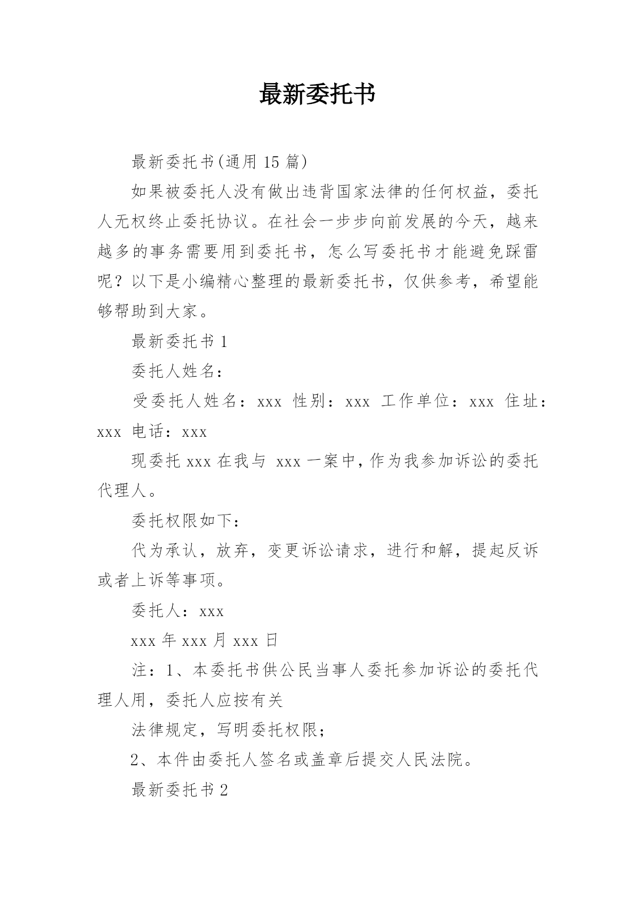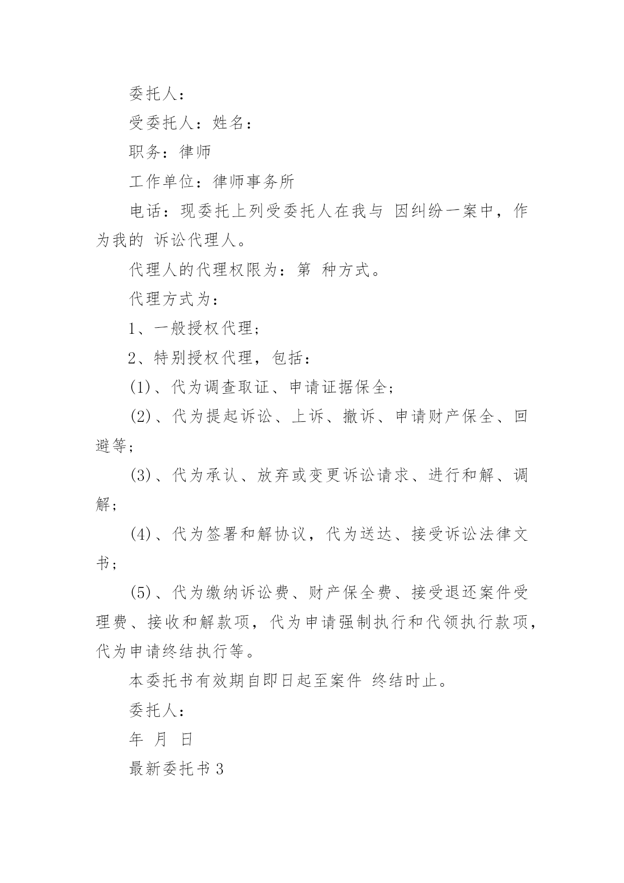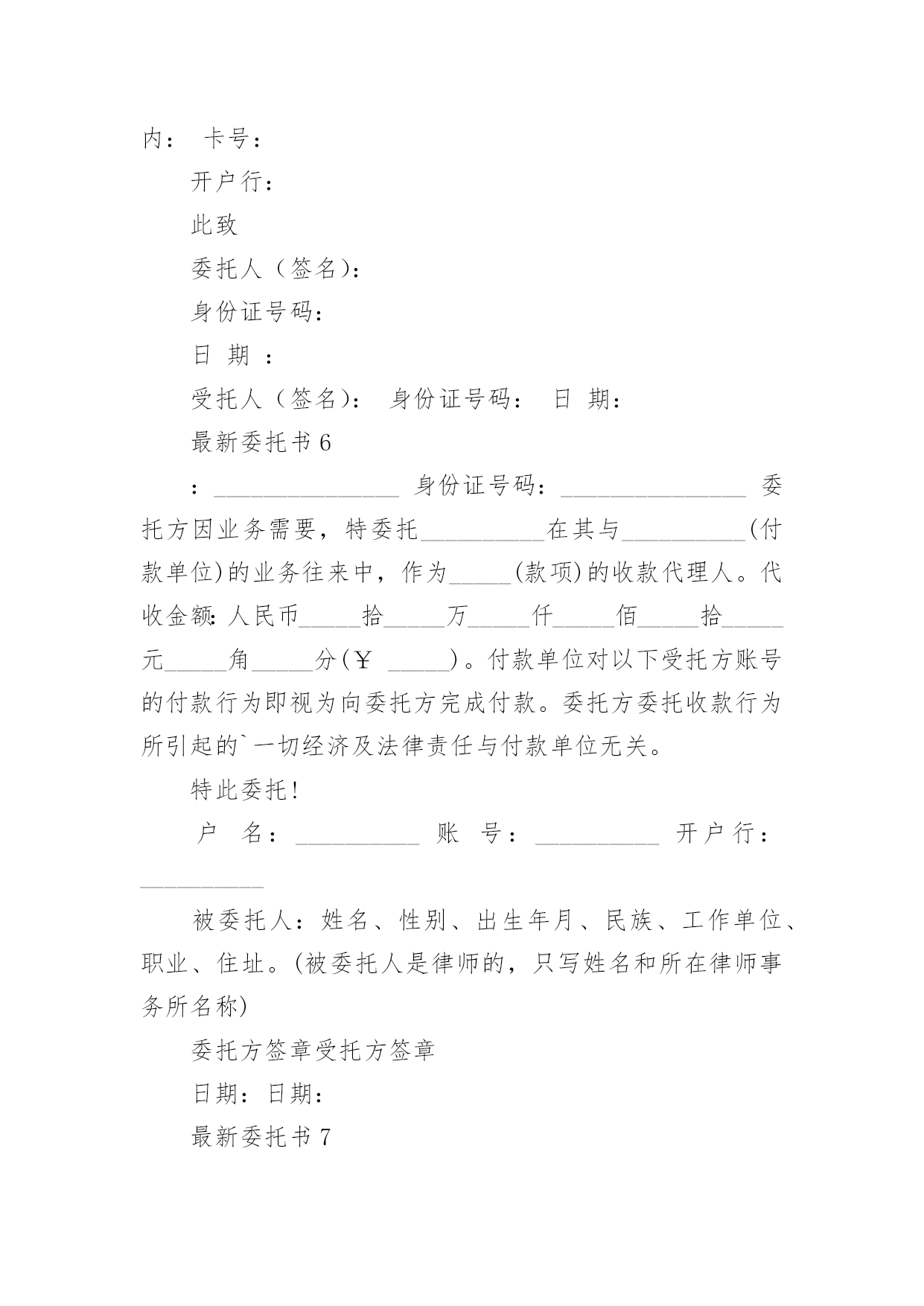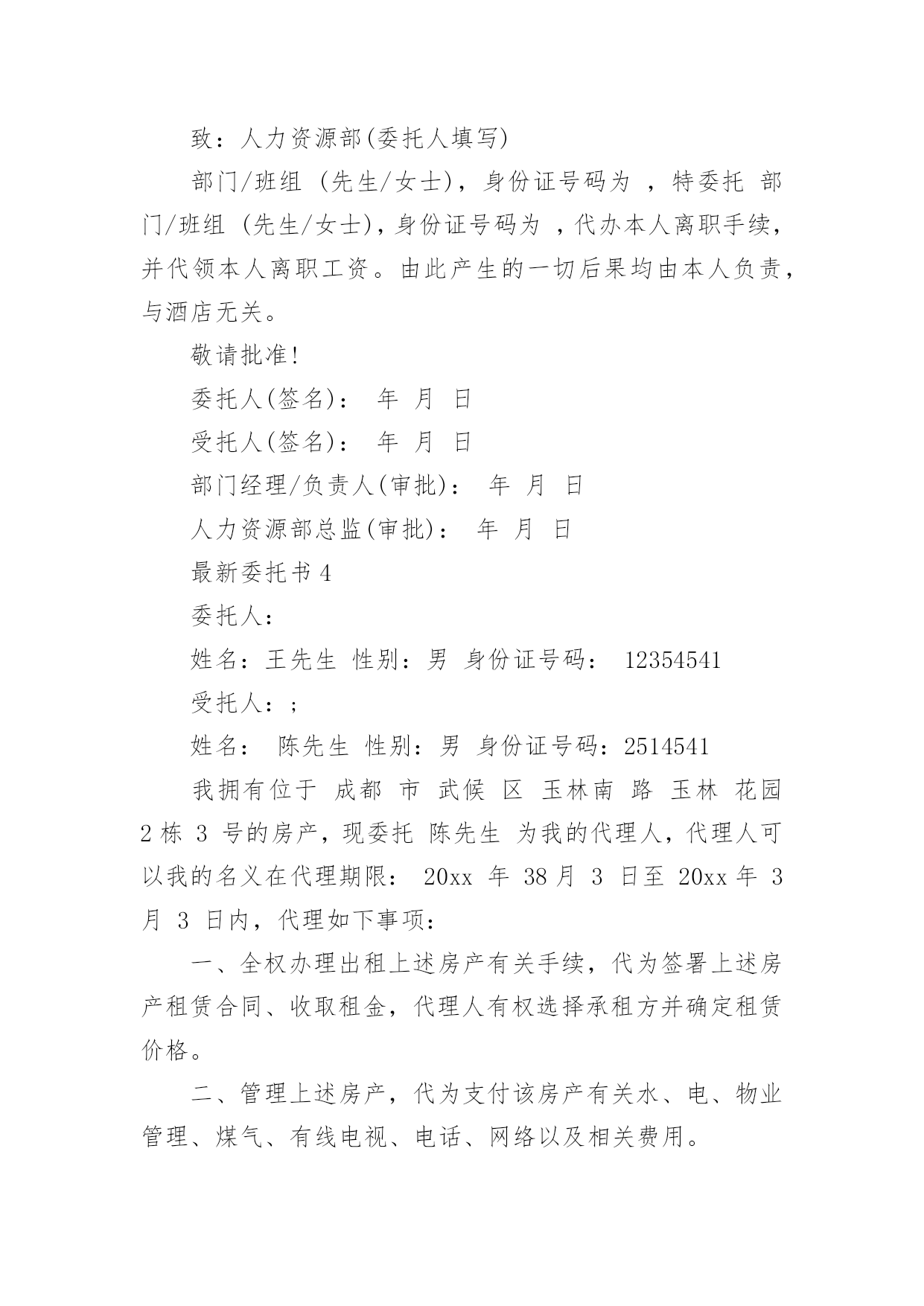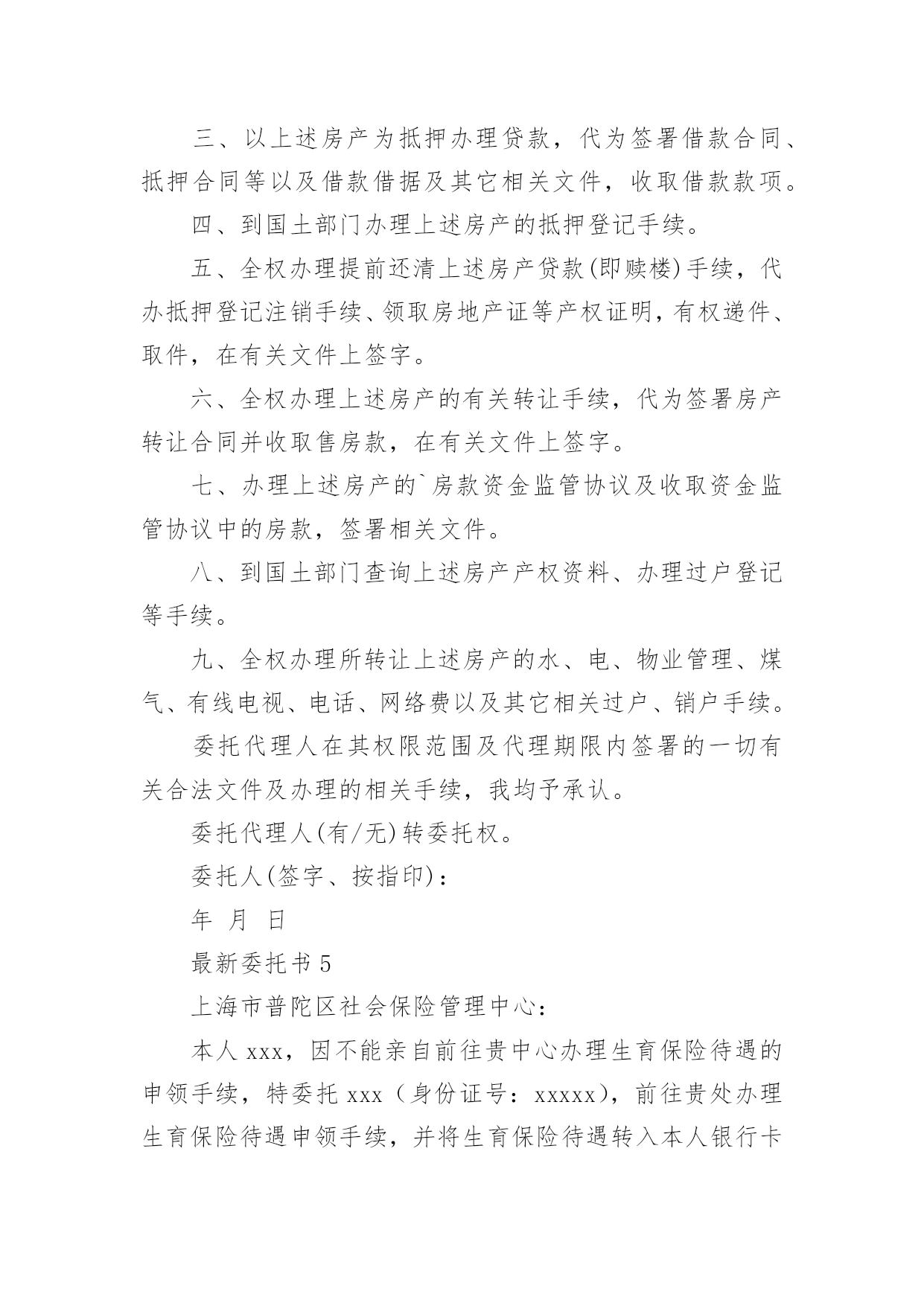最新委托书 最新委托书(通用15篇)如果被委托人没有做出违背国家法律的任何权益,委托人无权终止委托协议。在社会一步步向前发展的今天,越来越多的事务需要用到委托书,怎么写委托书才能避免踩雷呢?以下是小编精心整理的最新委托书,仅供参考,希望能够帮助到大家。最新委托书1委托人姓名:受委托人姓名:xxx性别:xxx工作单位:xxx住址:xxx电话:xxx现委托xxx在我与xxx一案中,作为我参加诉讼的委托代理人。委托权限如下:代为承认,放弃,变更诉讼请求,进行和解,提起反诉或者上诉等事项。委托人:xxxxxx年xxx月xxx日注:1、本委托书供公民当事人委托参加诉讼的委托代理人用,委托人应按有关法律规定,写明委托权限;2、本件由委托人签名或盖章后提交人民法院。最新委托书2委托人:受委托人:姓名:职务:律师工作单位:律师事务所电话:现委托上列受委托人在我与因纠纷一案中,作为我的诉讼代理人。代理人的代理权限为:第种方式。代理方式为:1、一般授权代理;2、特别授权代理,包括:(1)、代为调查取证、申请证据保全;(2)、代为提起诉讼、上诉、撤诉、申请财产保全、回避等;(3)、代为承认、放弃或变更诉讼请求、进行和解、调解;(4)、代为签署和解协议,代为送达、接受诉讼法律文书;(5)、代为缴纳诉讼费、财产保全费、接受退还案件受理费、接收和解款项,代为申请强制执行和代领执行款项,代为申请终结执行等。本委托书有效期自即日起至案件终结时止。委托人:年月日最新委托书3致:人力资源部(委托人填写)部门/班组(先生/女士),身份证号码为,特委托部门/班组(先生/女士),身份证号码为,代办本人离职手续,并代领本人离职工资。由此产生的一切后果均由本人负责,与酒店无关。敬请批准!委托人(签名):年月日受托人(签名):年月日部门经理/负责人(审批):年月日人力资源部总监(审批):年月日最新委托书4委托人:姓名:王先生性别:男身份证号码:12354541受托人:;姓名:陈先生性别:男身份证号码:2514541我拥有位于成都市武候区玉林南路玉林花园2栋3号的房产,现委托陈先生为我的代理人,代理人可以我的名义在代理期限:20xx年38月3日至20xx年3月3日内,代理如下事项:一、全权办理出租上述房产有关手续,代为签署上述房产租赁合同、收取租金,代理人有权选择承租方并确定租赁价格。二、管理上述房产,代为支付该房产有关水、电、物业管理、煤气、有线电视、电话、网络以及相关费用。三、以上述房产为抵押办理贷款,代为签署借款合同、抵押合同等以及借款借据及其它相关文件,收取借款款项。四、到国土部门办理上述房产的抵押登记手续。五、全权办理提前还清上述房产贷款(即赎楼)手续,代办抵押登记注销手续、领取房地产证等产权证明,有权递件、取件,在有关文件上签字。六、全权办理上述房产的有关转让手续,代为签署房产转让合同并收取售房款,在有关文件上签字。七、办理上述房产的`房款资金监管协议及收取资金监管协议中的房款,签署相关文件。八、到国土部门查询上述房产产权资料、办理过户登记等手续。九、全权办理所转让上述房产的水、电、物业管理、煤气、有线电视、电话、网络费以及其它相关过户、销户手续。委托代理人在其权限范围及代理期限内签署的一切有关合法文件及办理的相关手续,我均予承认。委托代理人(有/无)转委托权。委托人(签字、按指印):年月日最新委托书5上海市普陀区社会保险管理中心:本人xxx,因不能亲自前往贵中心办理生育保险待遇的申领手续,特委托xxx(身份证号:xxxxx),前往贵处办理生育保险待遇申领手续,并将生育保险待遇转入本人银行卡内:卡号:开户行:此致委托人(签名):身份证号码:日期:受托人(签名):身份证号码:日期:最新委托书6:_______________身份证号码:_______________委托方因业务需要,特委托__________在其与__________(付款单位)的业务往来中,作为_____(款项)的收款代理人。代收金额:人民币_____拾_____万_____仟_____佰_____拾_____元_____角_____分(¥_____)。付款单位对以下受托方账号的付款行为即视为向委托方完成付款。委托方委托收款行为所引起的`一切经济及法律责任与付款单位无关。特此委托!户名:__________账号:__________开户行:__________被委托人:姓名、性别、出生年月、民族、工作单位、职业、住址。(被委托人是律师的,只写姓名和所在律师事务所名称)委托方签章受托方签章日期:日期:最新委托书7委托人:李某某性别:女出生日期:19__年_月_日汉族国籍:中国身份证号码;_________________、住址:____________________受托人:张某某性别:男出生日期