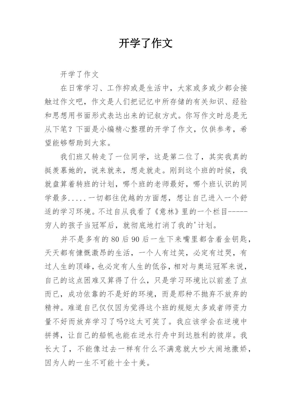 开学了作文 开学了作文在日常学习、工作抑或是生活中,大家或多或少都会接触过作文吧,作文是人们把记忆中所存储的有关知识、经验和思想用书面形式表达出来的记叙方式。你写作文时总是无从下笔?下面是小编精心整理的开学了作文,仅供参考,希望能够帮助到大家。我们班又转走了一位同学,这是第二位了,其实我真的挺羡慕她的,说来就来,想走就走。刚到这个班的时候,我就盘算着转班的计划,哪个班的老师最好,哪个班认识的同学最多.....一切都往优越的方面想,想让自己进入一个舒适的学习环境。不过自从我看了《意林》里的一个栏目-----穷人的孩子当冠军后,就彻底地打消了我的'计划。并不是多有的80后90后一生下来嘴里都含着金钥匙,天天都有慷慨激昂的生活,一个人有过笑,必定有过哭,有过人生的顶峰,也必定有人生的低谷,相对与奥运冠军来说,自己的这点困难又算得了什么,只是学习环境比以前差了点而已,成功依靠的不是好的环境,而是那种不抛弃不放弃的精神。难道自己仅仅因为觉得这个班的规矩太多或者师资力量不好而放弃学习了吗?这太可笑了。我应该学会在逆境中拼搏,让自己的船帆也能在逆水行舟中到达胜利的彼岸。我长大了,不能像过去一样有什么不满意就大吵大闹地撒娇,因为人的一生不可能十全十美。天将降大任于斯人也,必先苦其心志,劳其筋骨。只有耐得住清苦生活,挡得住万千诱惑,而让自己长期沉潜进取,厚积薄发的人才才是真正的大智者以及命运的必胜者。【开学了作文】