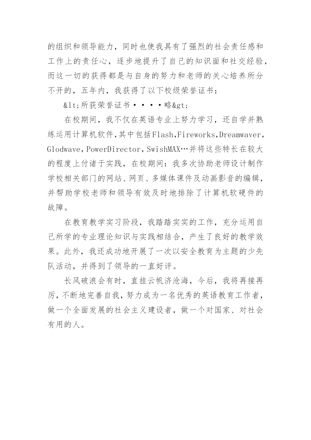 英语专业的自我鉴定 英语专业的自我鉴定光阴似箭,一晃五年已悄然而过,在xxxx五年的学习和生活中,我一直坚持明礼诚信、爱国守法、坚持实事求是的思想和作风,勇于追求真理,具有强烈的爱国主义情感和高度的社会责任感。在日常的生活和学习中,我能够做到团结同学、乐于助人,可以说:过去的五年,是我逐渐开始从稚嫩走向成熟的五年,五年里,使我经历了各种甘甜和酸楚、欢笑和泪水,在一次又一次的经历中,我慢慢地成长着……寒窗数载,在xxxx崇文崇雅校风的指导下,在那独特的人文气息的熏陶中,我刻苦努力、自强不息,一直保持着强烈的求知欲和学习意识,一方面加强专业知识的系统学习,以提高自己的专业技能,另一方面我也注重个人多方面的能力培养、丰富阅历、开阔视野、锻炼自我,为适应当今纷繁多变、充满挑战与机遇的社会做好充分的.准备。在过去的五年,我通过自己的努力,获得了以下的专业证书:<所获专业证书····略>在学校,我努力学习各种知识技能,并积极参加并组织班级学校的各学生团体、及课外活动,以此来锻炼自己、拓宽了视野、陶冶了情操,以下是我五年在学校里担任的职务:<所任职务····略>以上所有的工作和学习经历在很大的程度上培养了我的组织和领导能力,同时也使我具有了强烈的社会责任感和工作上的责任心,逐步地提升了自己的知识面和社交经验,而这一切的获得都是与自身的努力和老师的关心培养所分不开的,五年内,我获得了以下校级荣誉证书:<所获荣誉证书····略>在校期间,我不仅在英语专业上努力学习,还自学并熟练运用计算机软件,其中包括Flash,Fireworks,Dreamwaver,Glodwave,PowerDirector,SwishMAX…并将这些特长在较大的程度上付诸于实践,在校期间:我多次协助老师设计制作学校相关部门的网站、网页、多媒体课件及动画影音的编辑,并帮助学校老师和领导有效及时地排除了计算机软硬件的故障。在教育教学实习阶段,我踏踏实实的工作,充分运用自己所学的专业理论知识与实践相结合,产生了良好的教学效果。此外,我还成功地开展了一次以安全教育为主题的少先队活动,并得到了领导的一直好评。长风破浪会有时,直挂云帆济沧海,今后,我将再接再厉,不断地完善自我,努力成为一名优秀的英语教育工作者,做一个全面发展的社会主义建设者,做一个对国家、对社会有用的人。