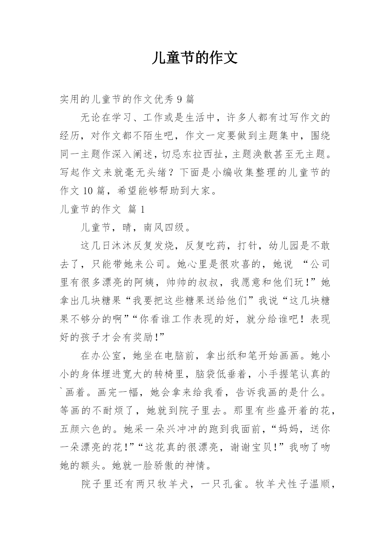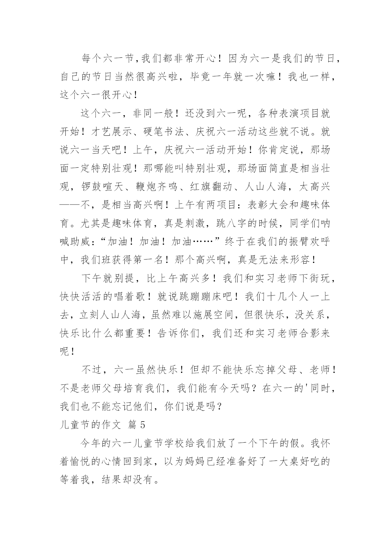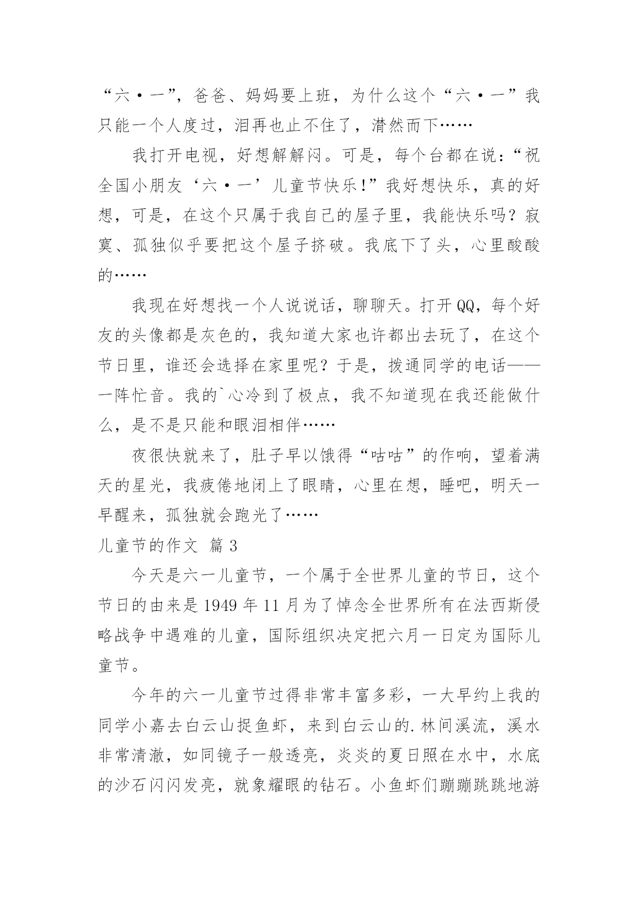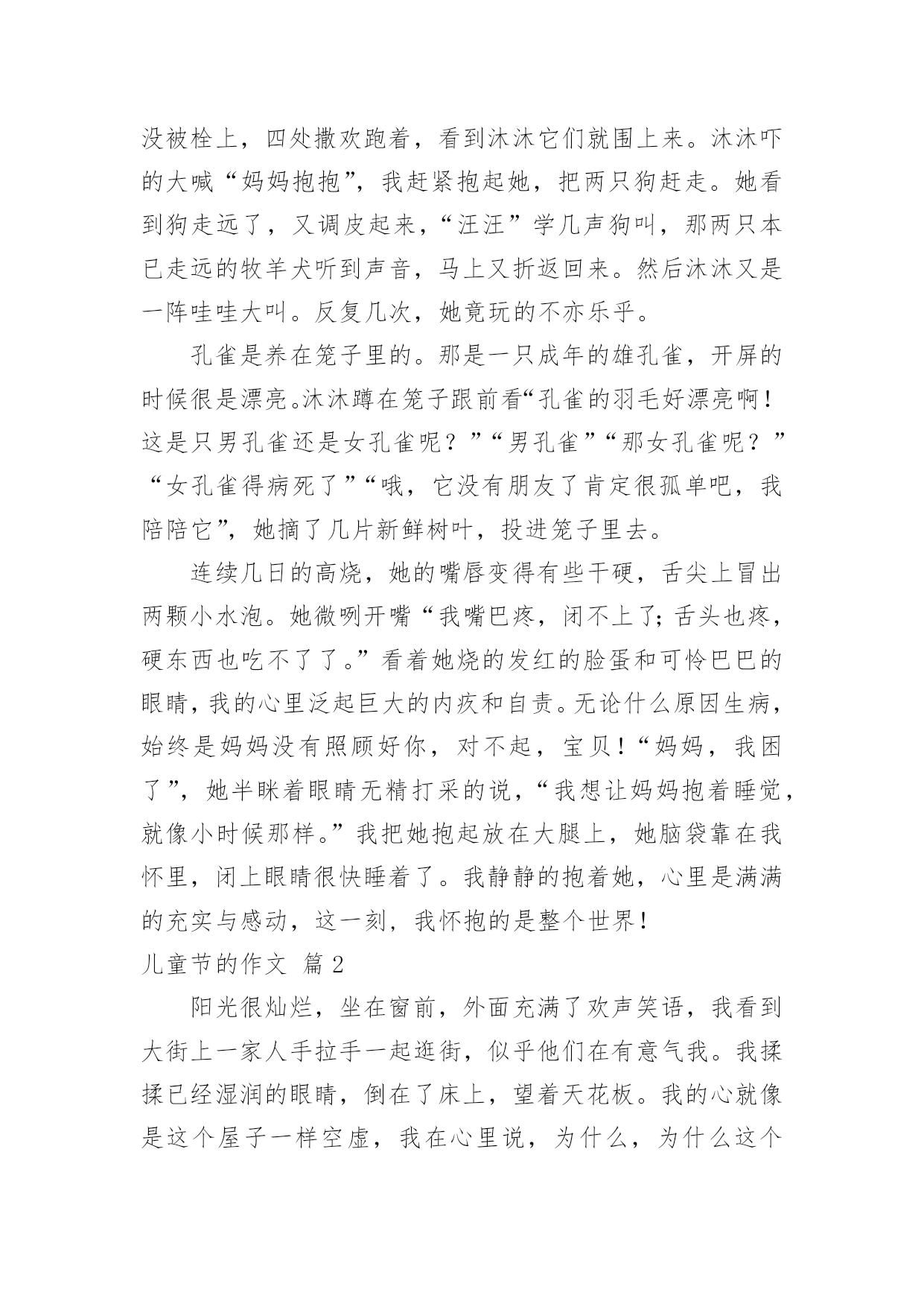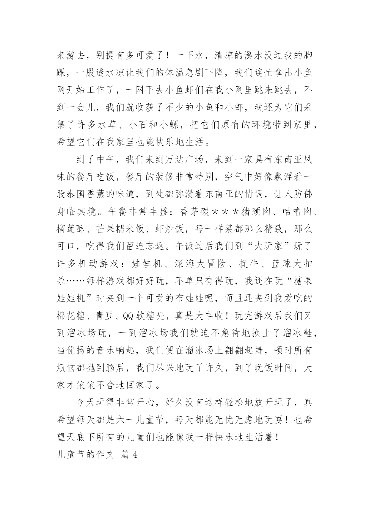 儿童节的作文 实用的儿童节的作文优秀9篇无论在学习、工作或是生活中,许多人都有过写作文的经历,对作文都不陌生吧,作文一定要做到主题集中,围绕同一主题作深入阐述,切忌东拉西扯,主题涣散甚至无主题。写起作文来就毫无头绪?下面是小编收集整理的儿童节的作文10篇,希望能够帮助到大家。儿童节的作文篇1儿童节,晴,南风四级。这几日沐沐反复发烧,反复吃药,打针,幼儿园是不敢去了,只能带她来公司。她心里是很欢喜的,她说“公司里有很多漂亮的阿姨,帅帅的叔叔,我愿意和他们玩!”她拿出几块糖果“我要把这些糖果送给他们”我说“这几块糖果不够分的啊”“你看谁工作表现的好,就分给谁吧!表现好的孩子才会有奖励!”在办公室,她坐在电脑前,拿出纸和笔开始画画。她小小的身体埋进宽大的转椅里,脑袋低垂着,小手握笔认真的`画着。画完一幅,她会拿来给我看,告诉我画的是什么。等画的不耐烦了,她就到院子里去。那里有些盛开着的花,五颜六色的。她采一朵兴冲冲的跑到我面前,“妈妈,送你一朵漂亮的花!”“这花真的很漂亮,谢谢宝贝!”我吻了吻她的额头。她就一脸骄傲的神情。院子里还有两只牧羊犬,一只孔雀。牧羊犬性子温顺,没被栓上,四处撒欢跑着,看到沐沐它们就围上来。沐沐吓的大喊“妈妈抱抱”,我赶紧抱起她,把两只狗赶走。她看到狗走远了,又调皮起来,“汪汪”学几声狗叫,那两只本已走远的牧羊犬听到声音,马上又折返回来。然后沐沐又是一阵哇哇大叫。反复几次,她竟玩的不亦乐乎。孔雀是养在笼子里的。那是一只成年的雄孔雀,开屏的时候很是漂亮。沐沐蹲在笼子跟前看“孔雀的羽毛好漂亮啊!这是只男孔雀还是女孔雀呢?”“男孔雀”“那女孔雀呢?”“女孔雀得病死了”“哦,它没有朋友了肯定很孤单吧,我陪陪它”,她摘了几片新鲜树叶,投进笼子里去。连续几日的高烧,她的嘴唇变得有些干硬,舌尖上冒出两颗小水泡。她微咧开嘴“我嘴巴疼,闭不上了;舌头也疼,硬东西也吃不了了。”看着她烧的发红的脸蛋和可怜巴巴的眼睛,我的心里泛起巨大的内疚和自责。无论什么原因生病,始终是妈妈没有照顾好你,对不起,宝贝!“妈妈,我困了”,她半眯着眼睛无精打采的说,“我想让妈妈抱着睡觉,就像小时候那样。”我把她抱起放在大腿上,她脑袋靠在我怀里,闭上眼睛很快睡着了。我静静的抱着她,心里是满满的充实与感动,这一刻,我怀抱的是整个世界!儿童节的作文篇2阳光很灿烂,坐在窗前,外面充满了欢声笑语,我看到大街上一家人手拉手一起逛街,似乎他们在有意气我。我揉揉已经湿润的眼睛,倒在了床上,望着天花板。我的心就像是这个屋子一样空虚,我在心里说,为什么,为什么这个“六·一”,爸爸、妈妈要上班,为什么这个“六·一”我只能一个人度过,泪再也止不住了,潸然而下……我打开电视,好想解解闷。可是,每个台都在说:“祝全国小朋友‘六·一’儿童节快乐!”我好想快乐,真的好想,可是,在这个只属于我自己的屋子里,我能快乐吗?寂寞、孤独似乎要把这个屋子挤破。我底下了头,心里酸酸的……我现在好想找一个人说说话,聊聊天。打开QQ,每个好友的头像都是灰色的,我知道大家也许都出去玩了,在这个节日里,谁还会选择在家里呢?于是,拨通同学的电话——一阵忙音。我的`心冷到了极点,我不知道现在我还能做什么,是不是只能和眼泪相伴……夜很快就来了,肚子早以饿得“咕咕”的作响,望着满天的星光,我疲倦地闭上了眼睛,心里在想,睡吧,明天一早醒来,孤独就会跑光了……儿童节的作文篇3今天是六一儿童节,一个属于全世界儿童的节日,这个节日的由来是1949年11月为了悼念全世界所有在法西斯侵略战争中遇难的儿童,国际组织决定把六月一日定为国际儿童节。今年的六一儿童节过得非常丰富多彩,一大早约上我的同学小嘉去白云山捉鱼虾,来到白云山的.林间溪流,溪水非常清澈,如同镜子一般透亮,炎炎的夏日照在水中,水底的沙石闪闪发亮,就象耀眼的钻石。小鱼虾们蹦蹦跳跳地游来游去,别提有多可爱了!一下水,清凉的溪水没过我的脚踝,一股透水凉让我们的体温急剧下降,我们连忙拿出小鱼网开始工作了,一网下去小鱼虾们在我小网里跳来跳去,不到一会儿,我们就收获了不少的小鱼和小虾,我还为它们采集了许多水草、小石和小螺,把它们原有的环境带到家里,希望它们在我家里也能快乐地生活。到了中午,我们来到万达广场,来到一家具有东南亚风味的餐厅吃饭,餐厅的装修非常特别,空气中好像飘浮着一股泰国香薰的味道,到处都弥漫着东南亚的情调,让人防佛身临其境。午餐非常丰盛:香茅碳***猪颈肉、咕噜肉、榴莲酥、芒果糯米饭、虾炒饭,每一样菜都那么精致,那么可口,吃得我们留连忘返。午饭过后我们到“大玩家”玩了许多机动游戏:娃娃机、深海大冒险、捉牛、篮球大扣杀……每样游戏都好好玩,不单只有得玩,我还在玩“糖果娃娃机”时夹到一个可爱的布娃娃呢,而且还夹到我爱吃的棉花糖、青豆、QQ软糖呢,真是大丰收!玩完游