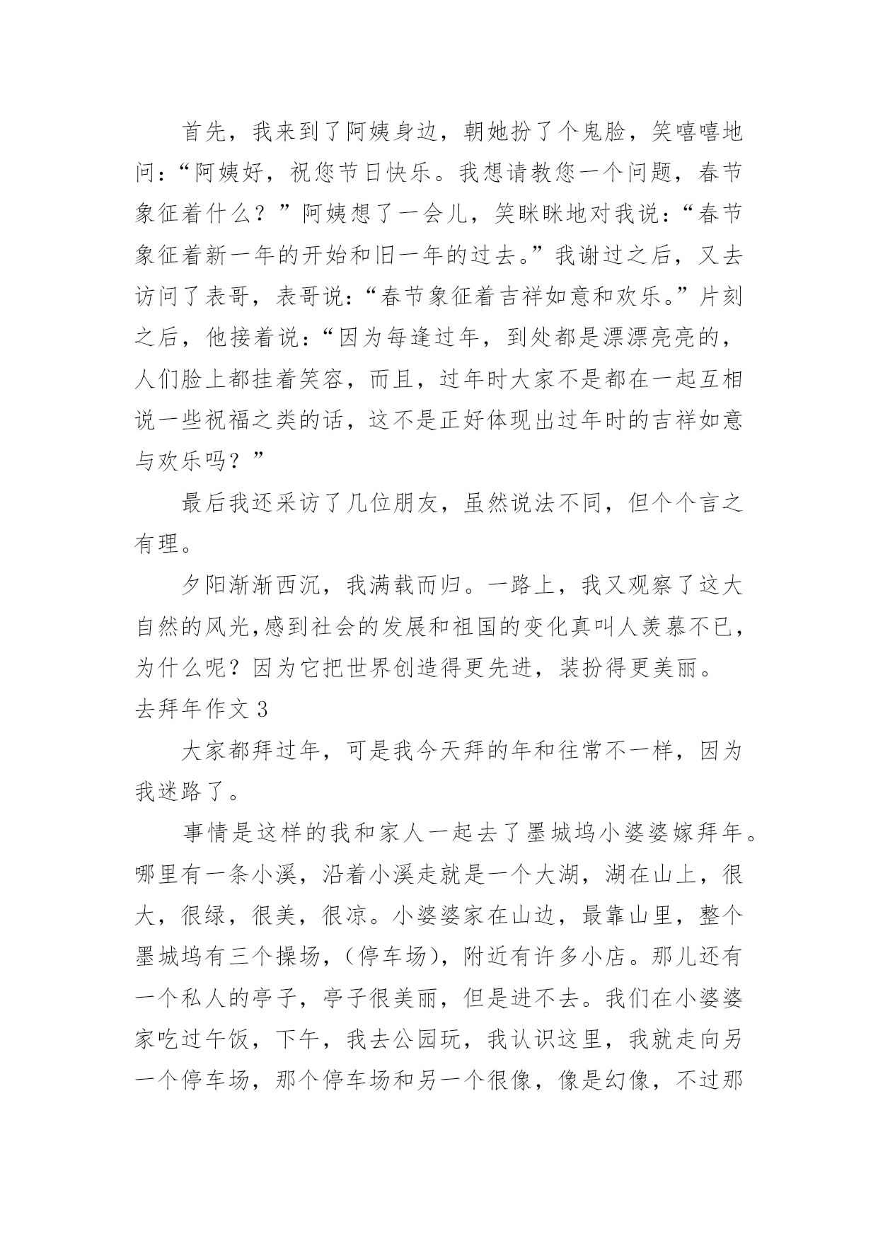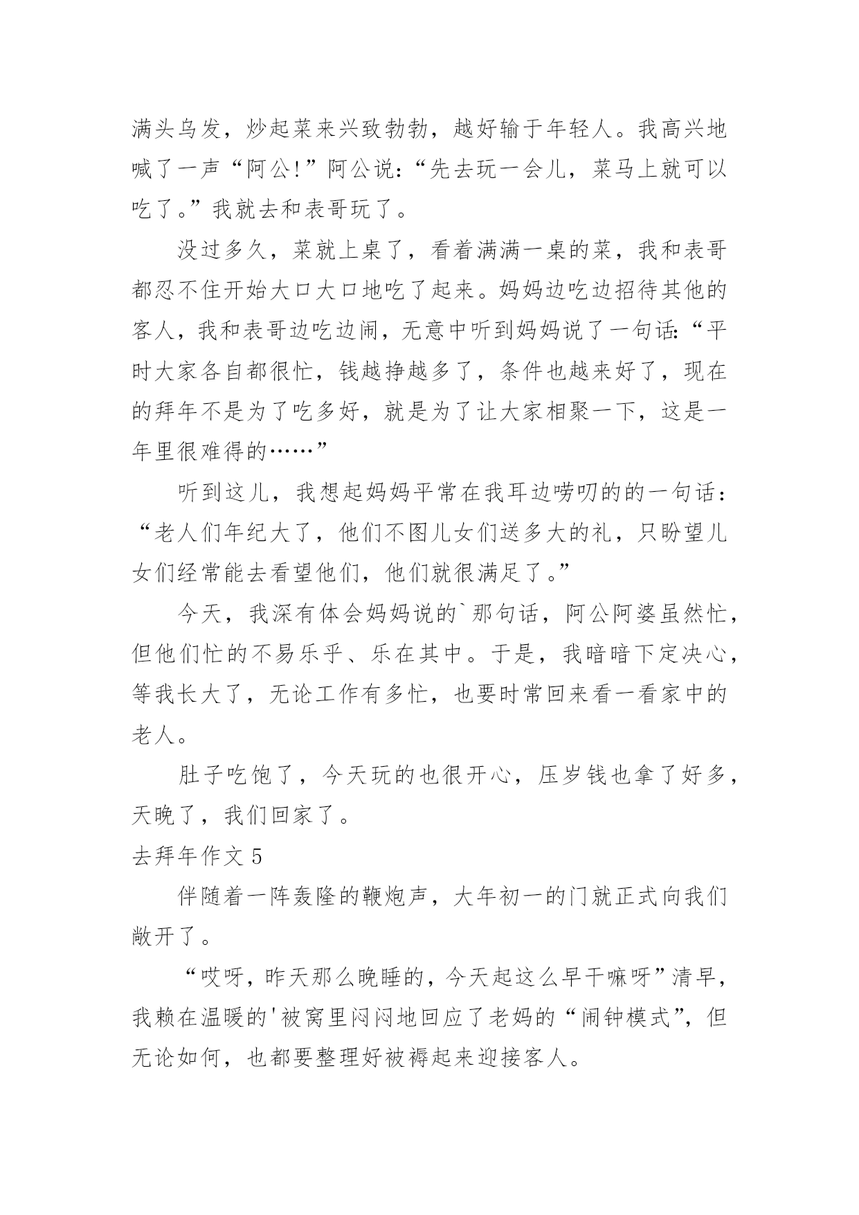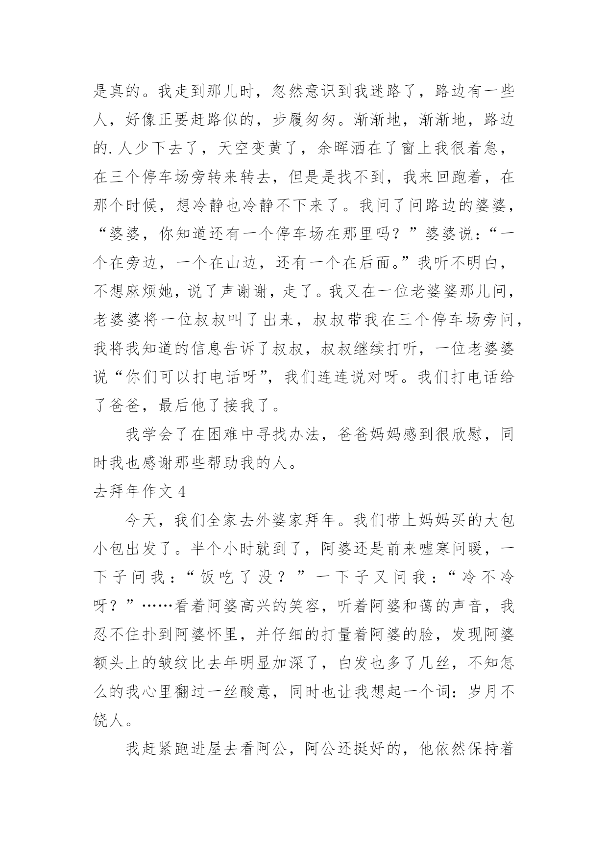去拜年作文 去拜年作文[锦集15篇]在日复一日的学习、工作或生活中,大家都经常接触到作文吧,作文是人们把记忆中所存储的有关知识、经验和思想用书面形式表达出来的记叙方式。相信很多朋友都对写作文感到非常苦恼吧,下面是小编为大家整理的去拜年作文,供大家参考借鉴,希望可以帮助到有需要的朋友。去拜年作文1去叔叔家拜年今天是农历大年三十。早晨天上下起了小雪。由于奶奶住在叔叔家,所以今天应该到叔叔家去给奶奶拜年。可是天上下着雪,还会不会去呢?我可是非常想去的呀!还好,到了9点多,爸爸妈妈拿上一些礼品,和我一起去叔叔家了。呵!路上的人真多,人来人往的。有的拿着水果,有的提着食用油,还有得提着一箱箱的.牛奶。有的人步行,有的骑着自行车,有的骑摩托车,有的坐公交车,有得打出租车。真是别有一番风趣。我想这些人也都是走亲访友,去拜年吧。到了叔叔家,我先给奶奶、叔叔、婶婶拜过年后,就忙着和叔叔家的小妹妹乐乐玩去了。乐乐今年6岁了,长得很可爱,聪明伶俐。他特别喜欢和我玩儿,今天一大早还给我打电话,让我一定早点过来呢。所以我们一见面就抱在一起了。我们在一起做了好多游戏。如12345,迈步逮人。正玩得高兴时,大人们就叫我们该吃饭了。我和乐乐洗完手,坐到了餐桌旁,午饭可真丰盛哪!鱼、红烧肘子、大虾等。我和乐乐比赛谁吃得多、吃得快,结果我先吃完了。等她吃完后,我们又一头钻进屋子去看书了。看的书有:《哪吒传奇》、《一千零一夜》、《故事大王》等。由于我是姐姐,我什么都让着她。不知不觉时间已是下午6点多了,爸爸说该回家了,可我还不愿走,在我的一再恳求和奶奶叔叔的劝说下,爸爸只好同意了。我和乐乐又高兴地跑进屋里,关上门,玩开了。吃过晚饭,我和乐乐再见,依依不舍地跟着爸妈回家了。到了路上一看,天不知何时放晴了。我望着满天的星云,回忆着这个快乐的今天,心里美滋滋的。多么令人愉快的一天哪!指导教师:朱玉峰去拜年作文2今天,我去外婆家拜年。一路上,迎春花竞相开放,鸟儿尽情高歌,人们披金戴银,世界上的一草一木都焕然一新,到处洋溢着春节的喜悦。陶醉在这诗情画意的景色之中,我脑子里忽然闪现出一个问题“春节象征着什么?”带着这个问题,我加快了速度,一会儿便来到了外婆家。外婆家里一片忙忙碌碌的景象,有的在剥瓜子吃,有的在拣菜,有的`在玩耍……外婆见我来了,忙来迎接,我与外婆家的客人谈了一会儿,便开始进行我的“工作”。首先,我来到了阿姨身边,朝她扮了个鬼脸,笑嘻嘻地问:“阿姨好,祝您节日快乐。我想请教您一个问题,春节象征着什么?”阿姨想了一会儿,笑眯眯地对我说:“春节象征着新一年的开始和旧一年的过去。”我谢过之后,又去访问了表哥,表哥说:“春节象征着吉祥如意和欢乐。”片刻之后,他接着说:“因为每逢过年,到处都是漂漂亮亮的,人们脸上都挂着笑容,而且,过年时大家不是都在一起互相说一些祝福之类的话,这不是正好体现出过年时的吉祥如意与欢乐吗?”最后我还采访了几位朋友,虽然说法不同,但个个言之有理。夕阳渐渐西沉,我满载而归。一路上,我又观察了这大自然的风光,感到社会的发展和祖国的变化真叫人羡慕不已,为什么呢?因为它把世界创造得更先进,装扮得更美丽。去拜年作文3大家都拜过年,可是我今天拜的年和往常不一样,因为我迷路了。事情是这样的我和家人一起去了墨城坞小婆婆嫁拜年。哪里有一条小溪,沿着小溪走就是一个大湖,湖在山上,很大,很绿,很美,很凉。小婆婆家在山边,最靠山里,整个墨城坞有三个操场,(停车场),附近有许多小店。那儿还有一个私人的亭子,亭子很美丽,但是进不去。我们在小婆婆家吃过午饭,下午,我去公园玩,我认识这里,我就走向另一个停车场,那个停车场和另一个很像,像是幻像,不过那是真的。我走到那儿时,忽然意识到我迷路了,路边有一些人,好像正要赶路似的,步履匆匆。渐渐地,渐渐地,路边的.人少下去了,天空变黄了,余晖洒在了窗上我很着急,在三个停车场旁转来转去,但是是找不到,我来回跑着,在那个时候,想冷静也冷静不下来了。我问了问路边的婆婆,“婆婆,你知道还有一个停车场在那里吗?”婆婆说:“一个在旁边,一个在山边,还有一个在后面。”我听不明白,不想麻烦她,说了声谢谢,走了。我又在一位老婆婆那儿问,老婆婆将一位叔叔叫了出来,叔叔带我在三个停车场旁问,我将我知道的信息告诉了叔叔,叔叔继续打听,一位老婆婆说“你们可以打电话呀”,我们连连说对呀。我们打电话给了爸爸,最后他了接我了。我学会了在困难中寻找办法,爸爸妈妈感到很欣慰,同时我也感谢那些帮助我的人。去拜年作文4今天,我们全家去外婆家拜年。我们带上妈妈买的大包小包出发了。半个小时就到了,阿婆还是前来嘘寒问暖,一下子问我:“饭吃了没?”一下子又问我:“冷不冷呀?”……看着阿婆高兴的笑容,听着阿婆和蔼的声音,我忍不住扑到阿婆怀里,并仔细的打量着阿婆的脸,发现阿婆额头上的皱