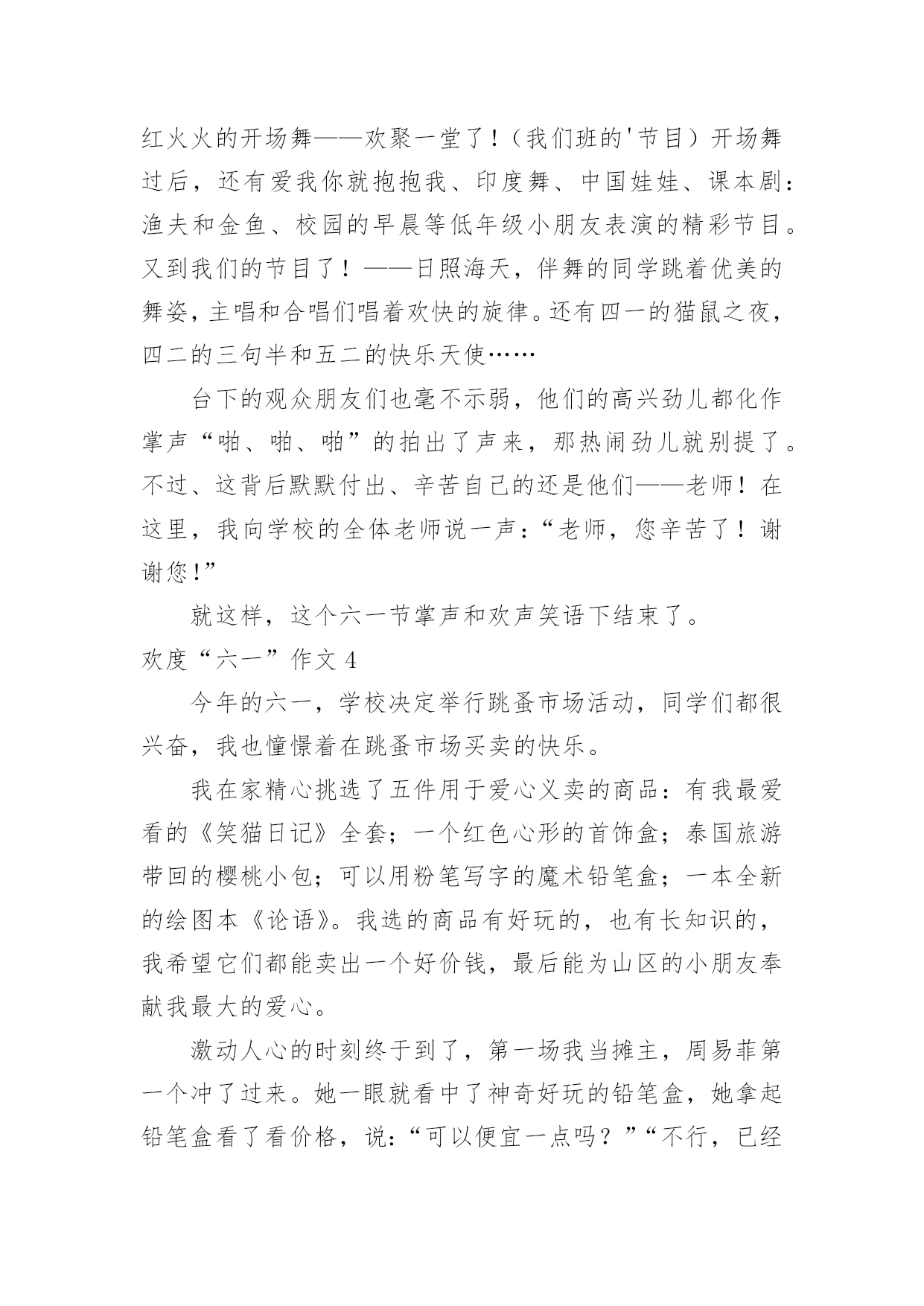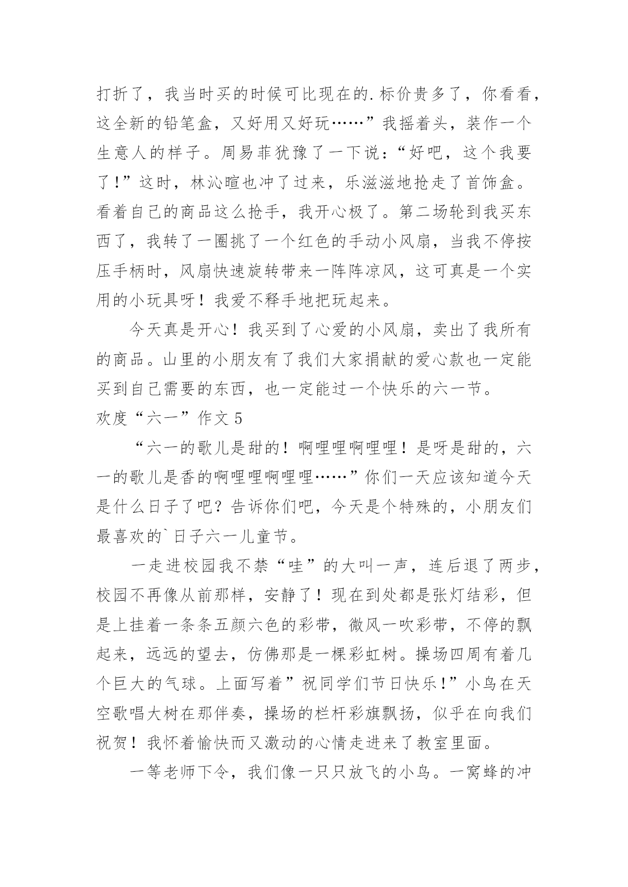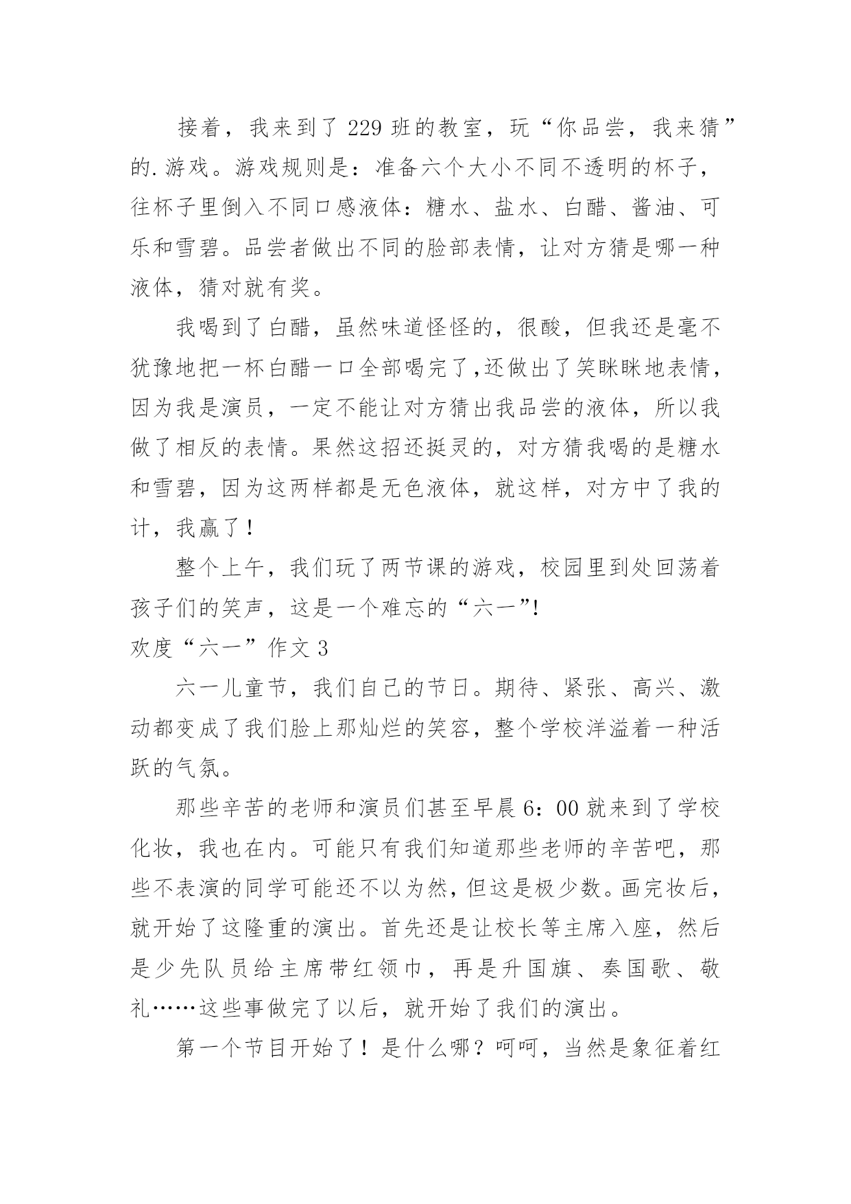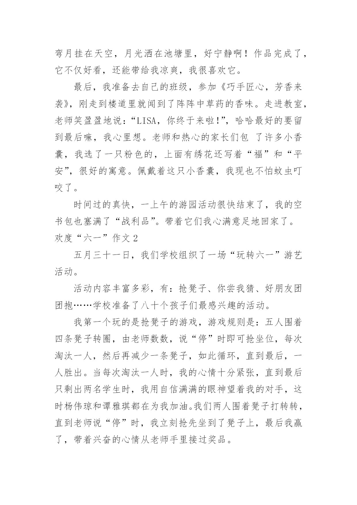 欢度“六一”作文 欢度“六一”作文在平平淡淡的日常中,大家都不可避免地要接触到作文吧,作文根据写作时限的不同可以分为限时作文和非限时作文。相信许多人会觉得作文很难写吧,下面是小编收集整理的欢度“六一”作文,希望能够帮助到大家。欢度“六一”作文1这是一个春光明媚的早晨,学校组织了“星星游园会”欢庆我们的节日——六一儿童节。今天不用带沉甸甸的书包,空书包里只要带好“星星券”和“地图”就能玩整个学校的项目,真开心。一到学校,就找到我的好朋友们,商量线路。我们先来到了音乐教室,参加了《24节气猜想图》——题目是:春回大地,万物复苏。我沉思了一会儿,回答:“惊蛰”——因为这个节气常常打雷,惊醒了沉睡的动物们。果然对啦,我得到了一片叶脉书签作为奖励,这样今后看书作记号更方便了。接下来我们又去了美术教室,活动的内容是《水墨团扇,清凉一夏》。从老师那里领取了一把雪白雪白的扇子,再照着图案画在扇面上就行了。我选择了一张夏夜池塘美景图——一朵盛开的粉色荷花,旁边还有一朵含苞欲放的.花骨朵,映衬着碧绿碧绿的荷叶和莲蓬,显得格外鲜艳。一轮弯月挂在天空,月光洒在池塘里,好宁静啊!作品完成了,它不仅好看,还能带给我凉爽,我很喜欢它。最后,我准备去自己的班级,参加《巧手匠心,芳香来袭》,刚走到楼道里就闻到了阵阵中草药的香味。走进教室,老师笑盈盈地说:“LISA,你终于来啦!”,哈哈最好的要留到最后嘛,我心里想。老师和热心的家长们包了许多小香囊,我选了一只粉色的,上面有绣花还写着“福”和“平安”,很好的寓意。佩戴着这只小香囊,我现也不怕蚊虫叮咬了。时间过的真快,一上午的游园活动很快结束了,我的空书包也塞满了“战利品”。带着它们我心满意足地回家了。欢度“六一”作文2五月三十一日,我们学校组织了一场“玩转六一”游艺活动。活动内容丰富多彩,有:抢凳子、你尝我猜、好朋友团团抱……学校准备了八十个孩子们最感兴趣的活动。我第一个玩的是抢凳子的游戏,游戏规则是:五人围着四条凳子转圈,由老师数数,说“停”时即可抢坐位,每次淘汰一人,然后再减少一条凳子,如此循环,直到最后,一人胜出。当每次淘汰一人时,我的心情十分紧张,直到最后只剩出两名学生时,我用自信满满的眼神望着我的对手,这时杨伟琼和谭雅琪都在为我加油。我们两人围着凳子打转转,直到老师说“停”时,我立刻抢先坐到了凳子上,最后我赢了,带着兴奋的心情从老师手里接过奖品。接着,我来到了229班的教室,玩“你品尝,我来猜”的.游戏。游戏规则是:准备六个大小不同不透明的杯子,往杯子里倒入不同口感液体:糖水、盐水、白醋、酱油、可乐和雪碧。品尝者做出不同的脸部表情,让对方猜是哪一种液体,猜对就有奖。我喝到了白醋,虽然味道怪怪的,很酸,但我还是毫不犹豫地把一杯白醋一口全部喝完了,还做出了笑眯眯地表情,因为我是演员,一定不能让对方猜出我品尝的液体,所以我做了相反的表情。果然这招还挺灵的,对方猜我喝的是糖水和雪碧,因为这两样都是无色液体,就这样,对方中了我的计,我赢了!整个上午,我们玩了两节课的游戏,校园里到处回荡着孩子们的笑声,这是一个难忘的“六一”!欢度“六一”作文3六一儿童节,我们自己的节日。期待、紧张、高兴、激动都变成了我们脸上那灿烂的笑容,整个学校洋溢着一种活跃的气氛。那些辛苦的老师和演员们甚至早晨6:00就来到了学校化妆,我也在内。可能只有我们知道那些老师的辛苦吧,那些不表演的同学可能还不以为然,但这是极少数。画完妆后,就开始了这隆重的演出。首先还是让校长等主席入座,然后是少先队员给主席带红领巾,再是升国旗、奏国歌、敬礼……这些事做完了以后,就开始了我们的演出。第一个节目开始了!是什么哪?呵呵,当然是象征着红红火火的开场舞——欢聚一堂了!(我们班的'节目)开场舞过后,还有爱我你就抱抱我、印度舞、中国娃娃、课本剧:渔夫和金鱼、校园的早晨等低年级小朋友表演的精彩节目。又到我们的节目了!——日照海天,伴舞的同学跳着优美的舞姿,主唱和合唱们唱着欢快的旋律。还有四一的猫鼠之夜,四二的三句半和五二的快乐天使……台下的观众朋友们也毫不示弱,他们的高兴劲儿都化作掌声“啪、啪、啪”的拍出了声来,那热闹劲儿就别提了。不过、这背后默默付出、辛苦自己的还是他们——老师!在这里,我向学校的全体老师说一声:“老师,您辛苦了!谢谢您!”就这样,这个六一节掌声和欢声笑语下结束了。欢度“六一”作文4今年的六一,学校决定举行跳蚤市场活动,同学们都很兴奋,我也憧憬着在跳蚤市场买卖的快乐。我在家精心挑选了五件用于爱心义卖的商品:有我最爱看的《笑猫日记》全套;一个红色心形的首饰盒;泰国旅游带回的樱桃小包;可以用粉笔写字的魔术铅笔盒;一本全新的绘图本《论语》。我选的商品有好玩的,也有长知识的,我希望它们都能卖出一个好价钱,最后能为山区的小朋友奉献我最大的爱心。激动人心的时