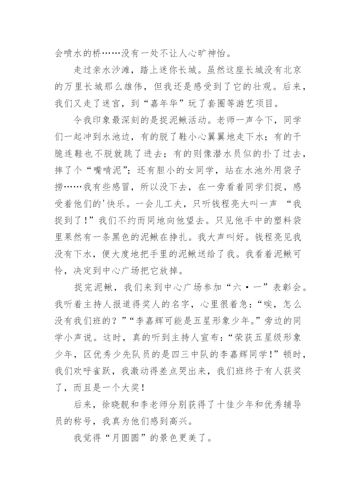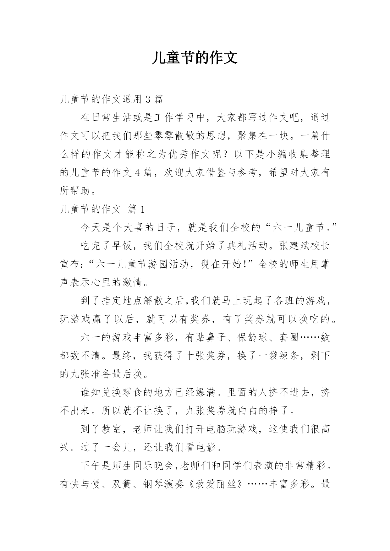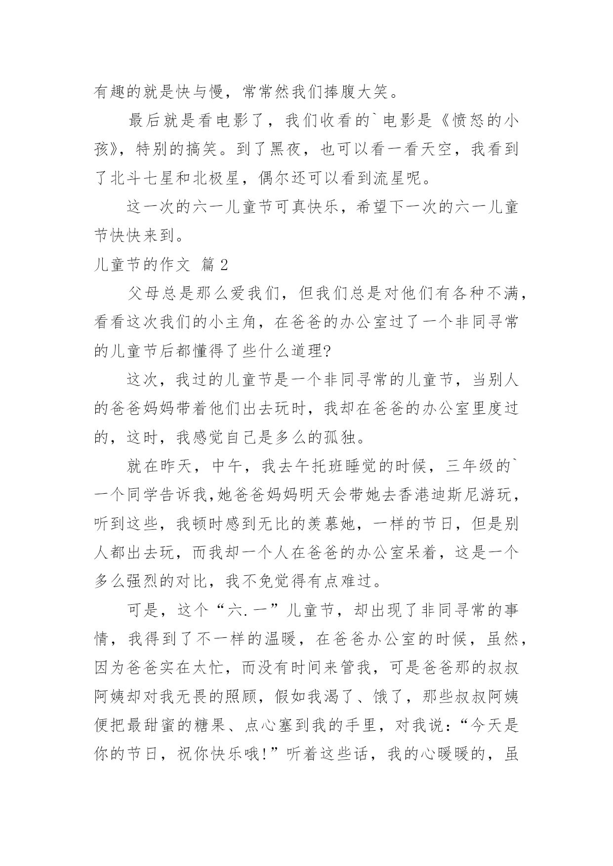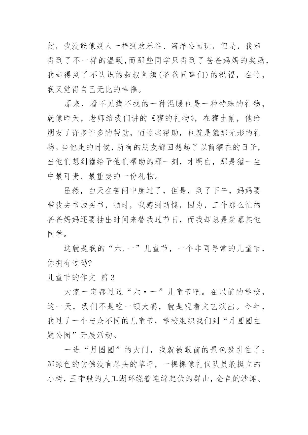 儿童节的作文 儿童节的作文通用3篇在日常生活或是工作学习中,大家都写过作文吧,通过作文可以把我们那些零零散散的思想,聚集在一块。一篇什么样的作文才能称之为优秀作文呢?以下是小编收集整理的儿童节的作文4篇,欢迎大家借鉴与参考,希望对大家有所帮助。儿童节的作文篇1今天是个大喜的日子,就是我们全校的“六一儿童节。”吃完了早饭,我们全校就开始了典礼活动。张建斌校长宣布:“六一儿童节游园活动,现在开始!”全校的师生用掌声表示心里的激情。到了指定地点解散之后,我们就马上玩起了各班的游戏,玩游戏赢了以后,就可以有奖券,有了奖券就可以换吃的。六一的游戏丰富多彩,有贴鼻子、保龄球、套圈……数都数不清。最终,我获得了十张奖券,换了一袋辣条,剩下的九张准备最后换。谁知兑换零食的地方已经爆满。里面的人挤不进去,挤不出来。所以就不让换了,九张奖券就白白的挣了。到了教室,老师让我们打开电脑玩游戏,这使我们很高兴。过了一会儿,还让我们看电影。下午是师生同乐晚会,老师们和同学们表演的非常精彩。有快与慢、双簧、钢琴演奏《致爱丽丝》……丰富多彩。最有趣的就是快与慢,常常然我们捧腹大笑。最后就是看电影了,我们收看的`电影是《愤怒的小孩》,特别的搞笑。到了黑夜,也可以看一看天空,我看到了北斗七星和北极星,偶尔还可以看到流星呢。这一次的六一儿童节可真快乐,希望下一次的六一儿童节快快来到。儿童节的作文篇2父母总是那么爱我们,但我们总是对他们有各种不满,看看这次我们的小主角,在爸爸的办公室过了一个非同寻常的儿童节后都懂得了些什么道理?这次,我过的儿童节是一个非同寻常的儿童节,当别人的爸爸妈妈带着他们出去玩时,我却在爸爸的办公室里度过的,这时,我感觉自己是多么的孤独。就在昨天,中午,我去午托班睡觉的时候,三年级的`一个同学告诉我,她爸爸妈妈明天会带她去香港迪斯尼游玩,听到这些,我顿时感到无比的羡慕她,一样的节日,但是别人都出去玩,而我却一个人在爸爸的办公室呆着,这是一个多么强烈的对比,我不免觉得有点难过。可是,这个“六.一”儿童节,却出现了非同寻常的事情,我得到了不一样的温暖,在爸爸办公室的时候,虽然,因为爸爸实在太忙,而没有时间来管我,可是爸爸那的叔叔阿姨却对我无畏的照顾,假如我渴了、饿了,那些叔叔阿姨便把最甜蜜的糖果、点心塞到我的手里,对我说:“今天是你的节日,祝你快乐哦!”听着这些话,我的心暖暖的,虽然,我没能像别人一样到欢乐谷、海洋公园玩,但是,我却得到了不一样的温暖,而那些同学只得到了爸爸妈妈的奖励,我却得到了不认识的叔叔阿姨(爸爸同事们)的祝福,在这,我又觉得自己无比的幸福。原来,看不见摸不找的一种温暖也是一种特殊的礼物,就像昨天,老师给我们讲的《獾的礼物》,在獾生前,他给朋友了许多许多的帮助,而这些帮助,也就是獾那无形的礼物。当他走的时候,所有的朋友都回想起了以前獾在的日子,当他们想到獾给予他们帮助的那一刻,才明白,那是獾一生中最可贵、最重要的一份礼物。虽然,白天在苦闷中度过了,但是,到了下午,妈妈要带我去书城买书,顿时,我感到惭愧,因为,工作那么忙的爸爸妈妈还要抽出时间来替我过节日,而我却总是羡慕其他同学。这就是我的“六.一”儿童节,一个非同寻常的儿童节,你拥有过吗?儿童节的作文篇3大家一定都过过“六·一”儿童节吧。在以前的学校,这一天,我们不是吃一顿大餐,就是观看文艺演出。今年,我过了一个与众不同的儿童节,学校组织我们到“月圆圆主题公园”开展活动。一进“月圆圆”的大门,我就被眼前的景色吸引住了:那绿色的仿佛没有尽头的草坪,一棵棵像礼仪队员般挺立的小树,玉带般的人工湖环绕着连绵起伏的群山,金色的沙滩、会喷水的桥……没有一处不让人心旷神怡。走过亲水沙滩,踏上迷你长城。虽然这座长城没有北京的万里长城那么雄伟,但我还是感受到了它的壮观。后来,我们又走了迷宫,到“嘉年华”玩了套圈等游艺项目。令我印象最深刻的是捉泥鳅活动。老师一声令下,同学们一起冲到水池边,有的脱了鞋小心翼翼地走下水;有的干脆连鞋也不脱就跳了进去;有的则像潜水员似的扑了过去,摔了个“嘴啃泥”;还有胆小的女同学,站在水池外用袋子捞……我有些感冒,所以没下去,在一旁看着同学们捉,感受着他们的'快乐。一会儿工夫,只听钱程亮大叫一声“我捉到了!”我们不约而同地向他望去。只见他手中的塑料袋里果然有一条黑色的泥鳅在挣扎。我大声叫好。钱程亮见我没有下水,便大度地把手里的泥鳅送给了我。我看着泥鳅可怜,决定到中心广场把它放掉。捉完泥鳅,我们来到中心广场参加“六·一”表彰会。我听着主持人报道得奖人的名字,心里很着急:“唉,怎么没有我们班的?”“李嘉辉可能是五星形象少年。”旁边的同学小声说。这时,真的听到主持人宣布:“荣获五星级形象少年,区优秀少先队员的是四三中队的李嘉辉同学!”顿时,我们欢呼雀跃,我激动得差点哭出来,我