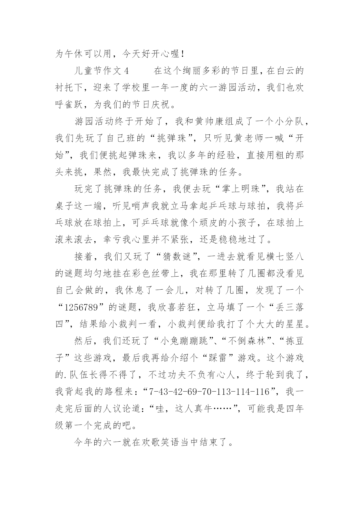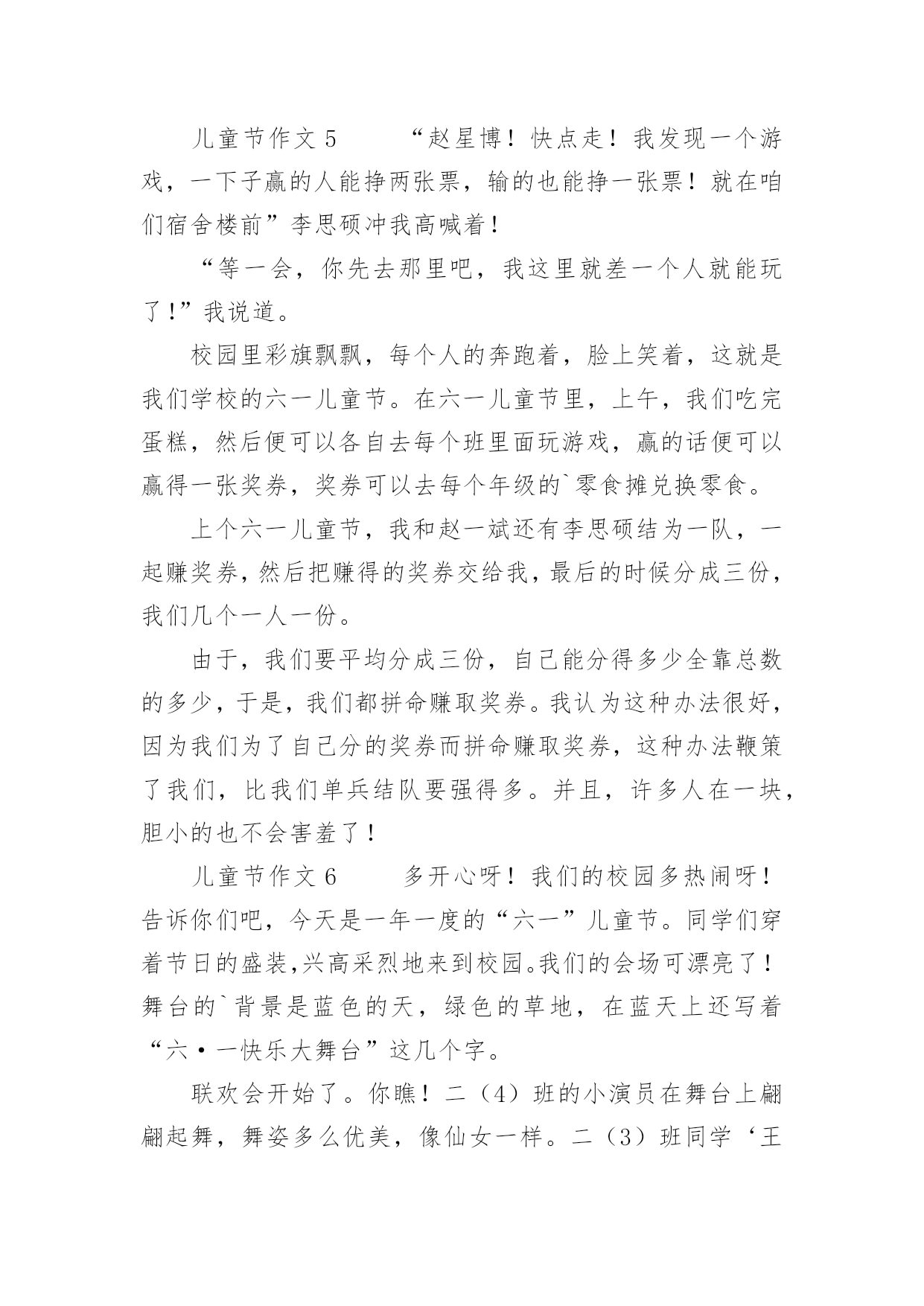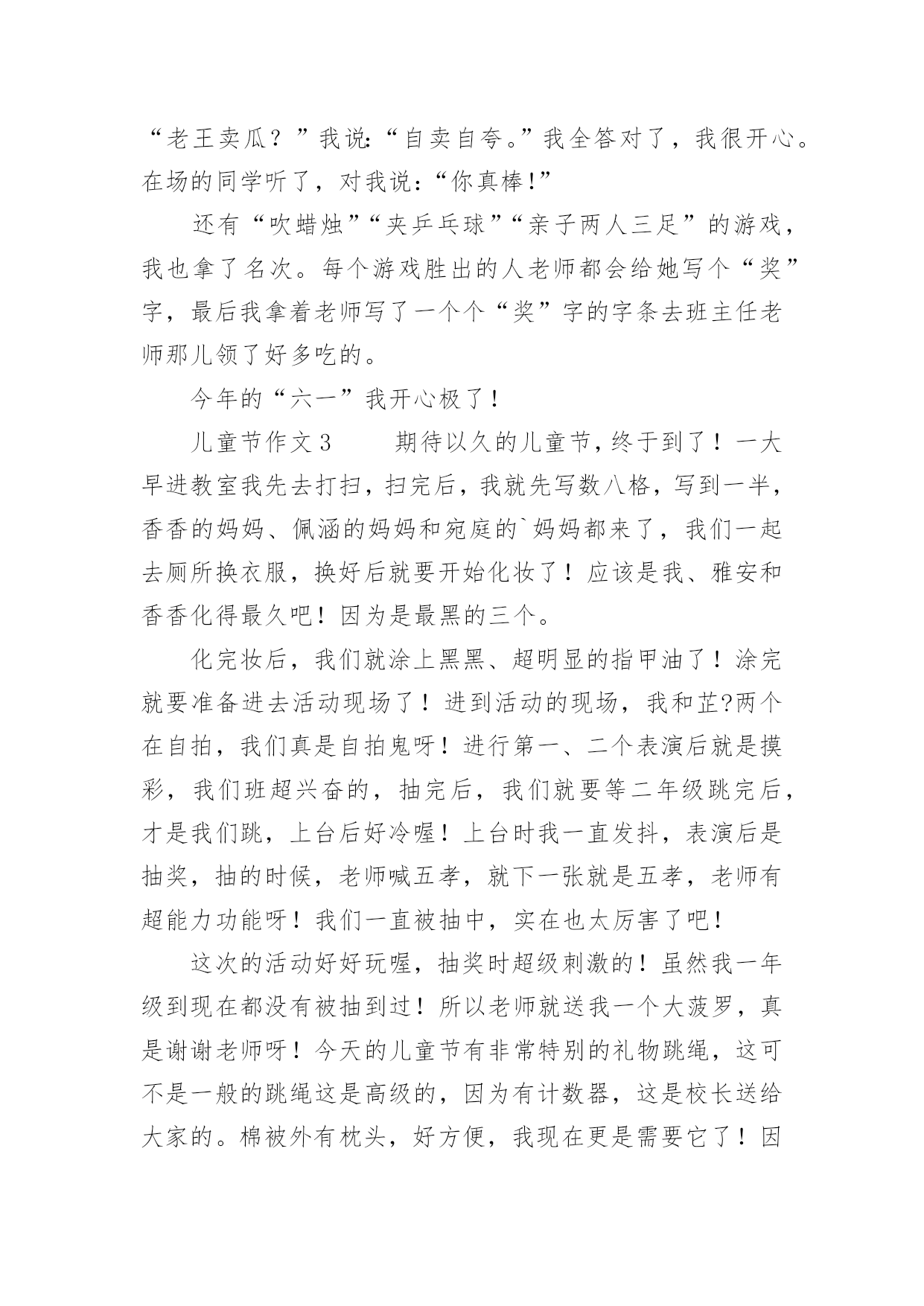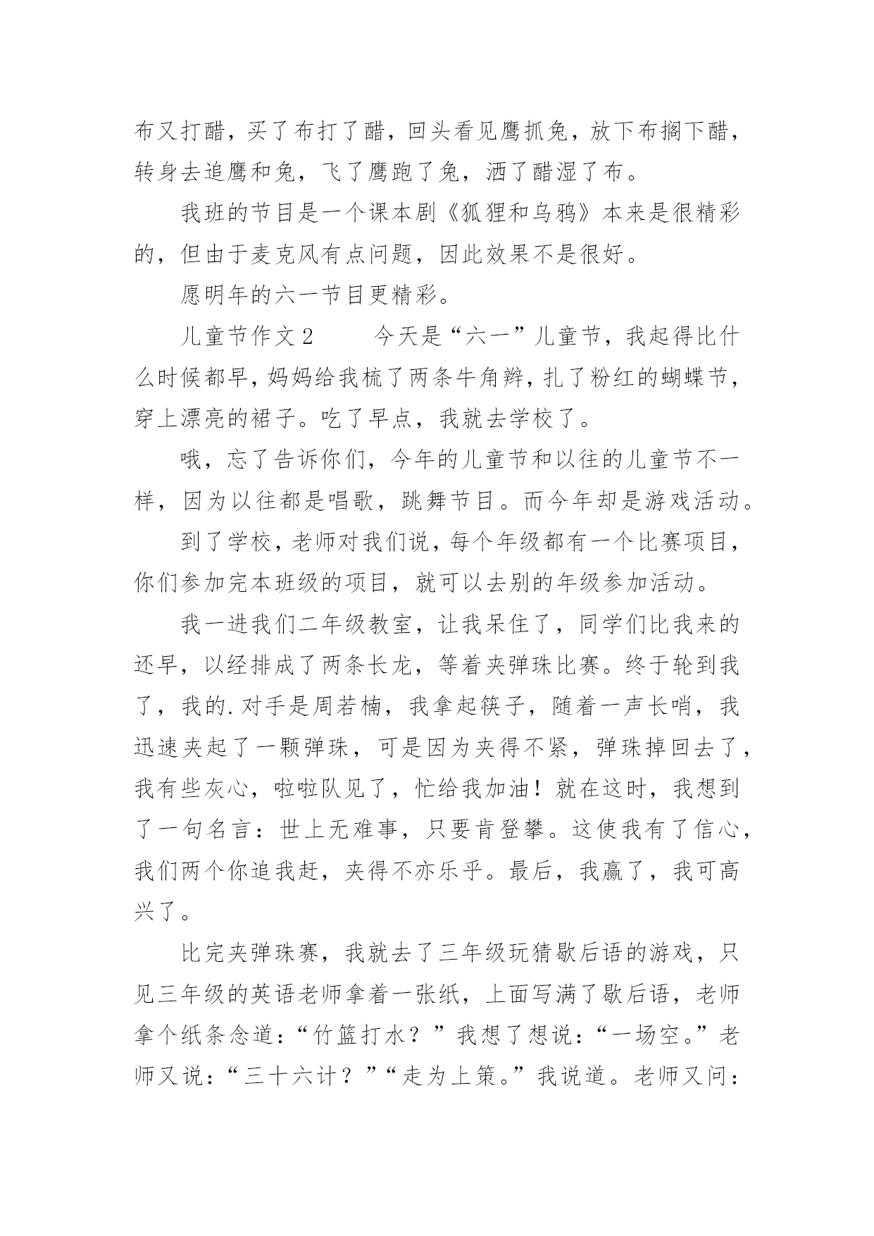 儿童节作文 【精选】儿童节作文锦集20篇无论在学习、工作或是生活中,大家对作文都不陌生吧,作文是通过文字来表达一个主题意义的记叙方法。你知道作文怎样写才规范吗?以下是小编为大家收集的儿童节作文20篇,供大家参考借鉴,希望可以帮助到有需要的朋友。儿童节作文1儿童节是我们所有小孩最盼望、最高兴的节日。因这个节日几乎每年都要在我校举行大型的庆祝活动。今年的儿童节也不例外,我校举行了主题为“庆六·一,迎奥运”的活动。我乡的村校:杉树坪、红旗小学一同相聚在我校展示才艺。这次的节目丰富多彩:有唱歌、舞蹈、小品、时装秀、话剧等共二十个节目。第一个节目是三·一班的合唱《保卫黄河》,他们唱得很整齐,几乎没有人唱错,就是唱完的时候本来指挥还有一点台词没说完,有几个同学就迫不及待的下台了。第二个节目是四·一班的舞蹈,他们不但跳得整齐,而且服装也很整齐,连头饰、发型都是一样的。可就在他们表演时,有个两、三岁的.小妹妹时不时的上台去打扰他们,逗得全场观众哄堂大笑。接下来,业余舞蹈班有三个节目,分别是时装秀、健美操和一个方言话剧。我觉得最有趣的是那个方言话剧,因为里面有几个非常绕口的顺口溜——有个小孩叫小杜,上街买布又打醋,买了布打了醋,回头看见鹰抓兔,放下布搁下醋,转身去追鹰和兔,飞了鹰跑了兔,洒了醋湿了布。我班的节目是一个课本剧《狐狸和乌鸦》本来是很精彩的,但由于麦克风有点问题,因此效果不是很好。愿明年的六一节目更精彩。儿童节作文2今天是“六一”儿童节,我起得比什么时候都早,妈妈给我梳了两条牛角辫,扎了粉红的蝴蝶节,穿上漂亮的裙子。吃了早点,我就去学校了。哦,忘了告诉你们,今年的儿童节和以往的儿童节不一样,因为以往都是唱歌,跳舞节目。而今年却是游戏活动。到了学校,老师对我们说,每个年级都有一个比赛项目,你们参加完本班级的项目,就可以去别的年级参加活动。我一进我们二年级教室,让我呆住了,同学们比我来的还早,以经排成了两条长龙,等着夹弹珠比赛。终于轮到我了,我的.对手是周若楠,我拿起筷子,随着一声长哨,我迅速夹起了一颗弹珠,可是因为夹得不紧,弹珠掉回去了,我有些灰心,啦啦队见了,忙给我加油!就在这时,我想到了一句名言:世上无难事,只要肯登攀。这使我有了信心,我们两个你追我赶,夹得不亦乐乎。最后,我赢了,我可高兴了。比完夹弹珠赛,我就去了三年级玩猜歇后语的游戏,只见三年级的英语老师拿着一张纸,上面写满了歇后语,老师拿个纸条念道:“竹篮打水?”我想了想说:“一场空。”老师又说:“三十六计?”“走为上策。”我说道。老师又问:“老王卖瓜?”我说:“自卖自夸。”我全答对了,我很开心。在场的同学听了,对我说:“你真棒!”还有“吹蜡烛”“夹乒乓球”“亲子两人三足”的游戏,我也拿了名次。每个游戏胜出的人老师都会给她写个“奖”字,最后我拿着老师写了一个个“奖”字的字条去班主任老师那儿领了好多吃的。今年的“六一”我开心极了!儿童节作文3期待以久的儿童节,终于到了!一大早进教室我先去打扫,扫完后,我就先写数八格,写到一半,香香的妈妈、佩涵的妈妈和宛庭的`妈妈都来了,我们一起去厕所换衣服,换好后就要开始化妆了!应该是我、雅安和香香化得最久吧!因为是最黑的三个。化完妆后,我们就涂上黑黑、超明显的指甲油了!涂完就要准备进去活动现场了!进到活动的现场,我和芷?两个在自拍,我们真是自拍鬼呀!进行第一、二个表演后就是摸彩,我们班超兴奋的,抽完后,我们就要等二年级跳完后,才是我们跳,上台后好冷喔!上台时我一直发抖,表演后是抽奖,抽的时候,老师喊五孝,就下一张就是五孝,老师有超能力功能呀!我们一直被抽中,实在也太厉害了吧!这次的活动好好玩喔,抽奖时超级刺激的!虽然我一年级到现在都没有被抽到过!所以老师就送我一个大菠罗,真是谢谢老师呀!今天的儿童节有非常特别的礼物跳绳,这可不是一般的跳绳这是高级的,因为有计数器,这是校长送给大家的。棉被外有枕头,好方便,我现在更是需要它了!因为午休可以用,今天好开心喔!儿童节作文4在这个绚丽多彩的节日里,在白云的衬托下,迎来了学校里一年一度的六一游园活动,我们也欢呼雀跃,为我们的节日庆祝。游园活动终于开始了,我和黄帅康组成了一个小分队,我们先玩了自己班的“挑弹珠”,只听见黄老师一喊“开始”,我们便挑起弹珠来,我以多年的经验,直接用粗的那头来挑,果然,我最快完成了挑弹珠的任务。玩完了挑弹珠的任务,我便去玩“掌上明珠”,我站在桌子这一端,听见哨声我就立马拿起乒乓球与球拍,我将乒乓球放在球拍上,可乒乓球就像个顽皮的小孩子,在球拍上滚来滚去,幸亏我心里并不紧张,还是稳稳地过了。接着,我们又玩了“猜数谜”,一进去就看见横七竖八的谜题均匀地挂在彩色丝带上,我在那里转了几圈都没看见自己会做的,我休息了一会儿,对转了几圈,发现了一个“1256789”的谜题,我欣喜若狂,立马