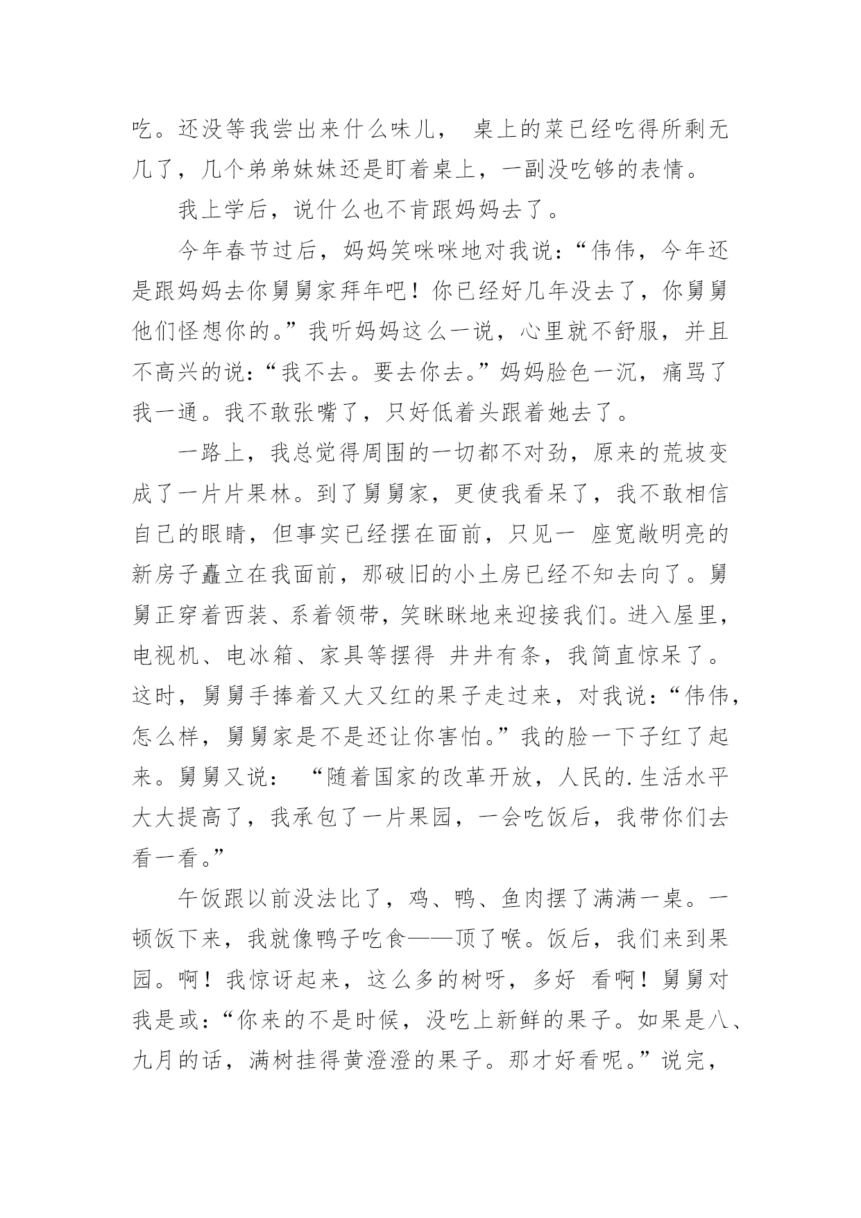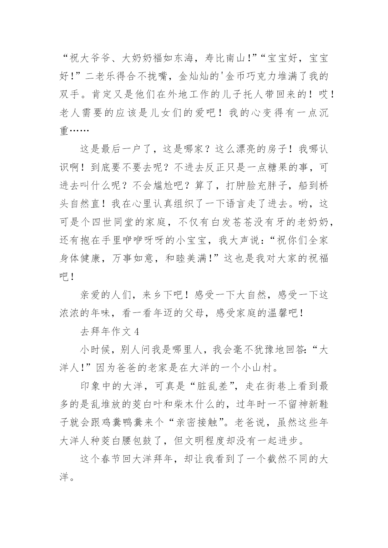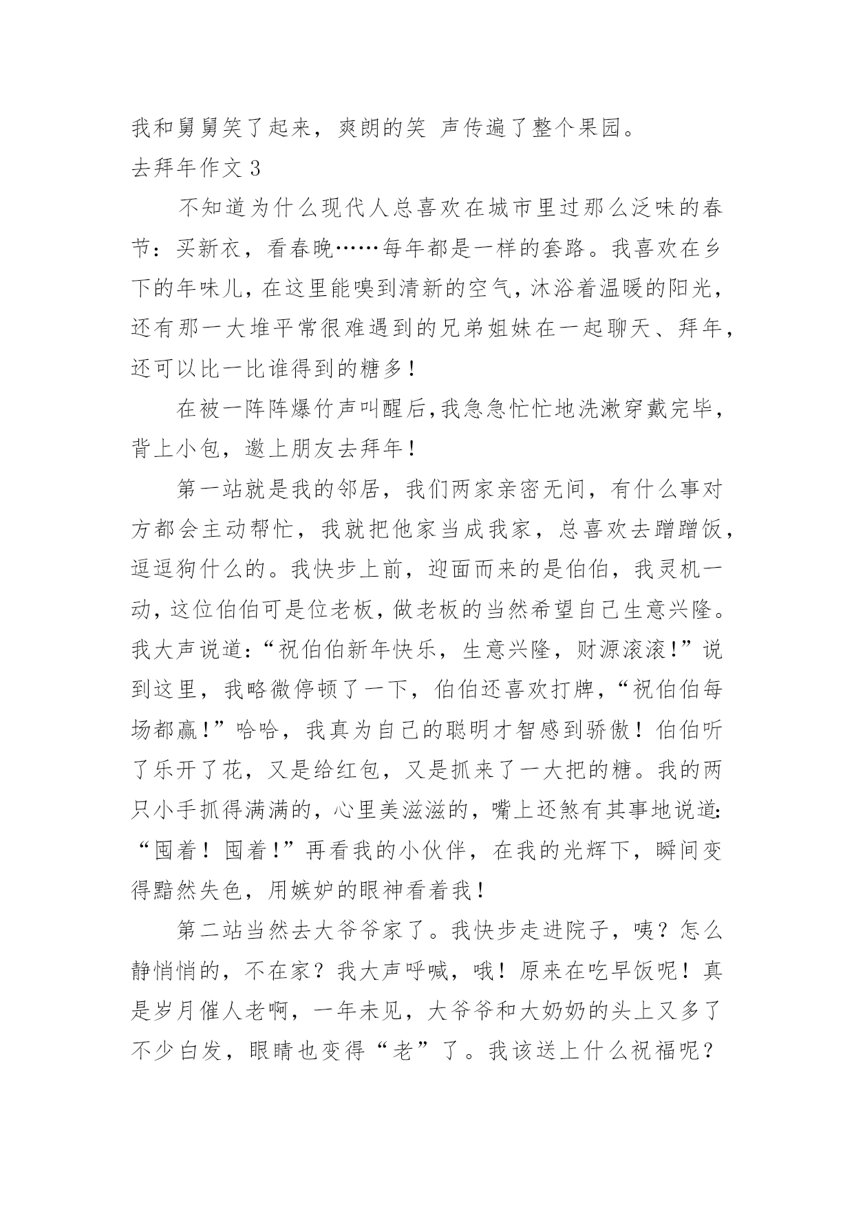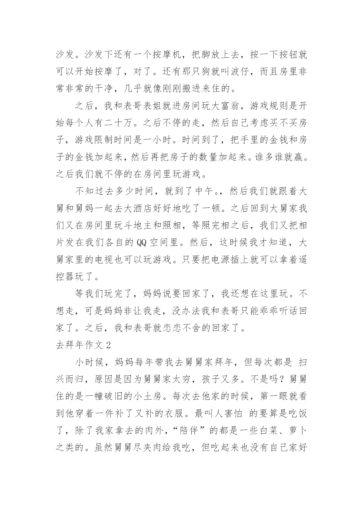 去拜年作文 去拜年作文9篇【精华】在平时的学习、工作或生活中,大家总少不了接触作文吧,作文根据体裁的不同可以分为记叙文、说明文、应用文、议论文。怎么写作文才能避免踩雷呢?下面是小编精心整理的去拜年作文,供大家参考借鉴,希望可以帮助到有需要的朋友。去拜年作文1前天早上,妈妈一大早就叫起我来,我非常的惊讶妈妈为什么要那么早叫我。我就问;“妈妈我们为什么要那么早起来呢?”妈妈说;“我们要去大舅家拜年呗。”我又问;“那也不至于那么早起来吧。”妈妈回答说;“大舅家离我们这里非常非常的远,坐车也要一个小时才到。”之后,我终于明白了,所以我就赶紧吃完早餐赶紧出发。等我和姨妈一家到了大舅家门前,我们按下门铃,大舅妈就跑过给我们开门。我进门的时候,我觉得我的腿好痒,之后我看看下有什么东西。结果竟然是一条狗在舔我的'脚,舅妈就跑过来说;“这条狗不咬人的,它只是接到你高兴,他喜欢你,因为他最喜欢热闹的场面,所以就跑过来了。”这时候我才叹了一口气。大舅家非常漂亮,一进门就是一个美丽的小池塘,里面有鱼还有龟。到了大厅,感觉更漂亮了,厅里有一座柔软的沙发。沙发下还有一个按摩机,把脚放上去,按一下按钮就可以开始按摩了,对了。还有那只狗就叫波仔,而且房里非常非常的干净,几乎就像刚刚搬进来住的。之后,我和表哥表姐就进房间玩大富翁,游戏规则是开始每个人有二十万。之后不停的走,然后自己考虑买不买房子,游戏限制时间是一小时。时间到了,把手里的金钱和房子的金钱加起来,然后再把房子的数量加起来。谁多谁就赢。之后我们就不停的在房间里玩游戏。不知过去多少时间,就到了中午。,然后我们就跟着大舅和舅妈一起去大酒店好好地吃了一顿。之后回到大舅家我们又在房间里玩斗地主和照相,等照完相之后,我们又把相片发在我们各自的QQ空间里。然后,这时候我才知道,大舅家里的电视也可以玩游戏。只要把电源插上就可以拿着遥控器玩了。等我们玩完了,妈妈说要回家了,我还想在这里玩。不想走,可是妈妈非让我走,没办法我和表哥只能乖乖听话回家了。之后,我和表哥就恋恋不舍的回家了。去拜年作文2小时候,妈妈每年带我去舅舅家拜年,但每次都是扫兴而归,原因是因为舅舅家太穷,孩子又多。不是吗?舅舅住的是一幢破旧的小土房。每次去他家的时候,第一眼就看到他穿着一件补了又补的衣服。最叫人害怕的要算是吃饭了,除了我家拿去的肉外,“陪伴”的都是一些白菜、萝卜之类的。虽然舅舅尽夹肉给我吃,但吃起来也没有自己家好吃。还没等我尝出来什么味儿,桌上的菜已经吃得所剩无几了,几个弟弟妹妹还是盯着桌上,一副没吃够的表情。我上学后,说什么也不肯跟妈妈去了。今年春节过后,妈妈笑咪咪地对我说:“伟伟,今年还是跟妈妈去你舅舅家拜年吧!你已经好几年没去了,你舅舅他们怪想你的。”我听妈妈这么一说,心里就不舒服,并且不高兴的说:“我不去。要去你去。”妈妈脸色一沉,痛骂了我一通。我不敢张嘴了,只好低着头跟着她去了。一路上,我总觉得周围的一切都不对劲,原来的荒坡变成了一片片果林。到了舅舅家,更使我看呆了,我不敢相信自己的眼睛,但事实已经摆在面前,只见一座宽敞明亮的新房子矗立在我面前,那破旧的小土房已经不知去向了。舅舅正穿着西装、系着领带,笑眯眯地来迎接我们。进入屋里,电视机、电冰箱、家具等摆得井井有条,我简直惊呆了。这时,舅舅手捧着又大又红的果子走过来,对我说:“伟伟,怎么样,舅舅家是不是还让你害怕。”我的脸一下子红了起来。舅舅又说:“随着国家的改革开放,人民的.生活水平大大提高了,我承包了一片果园,一会吃饭后,我带你们去看一看。”午饭跟以前没法比了,鸡、鸭、鱼肉摆了满满一桌。一顿饭下来,我就像鸭子吃食——顶了喉。饭后,我们来到果园。啊!我惊讶起来,这么多的树呀,多好看啊!舅舅对我是或:“你来的不是时候,没吃上新鲜的果子。如果是八、九月的话,满树挂得黄澄澄的果子。那才好看呢。”说完,我和舅舅笑了起来,爽朗的笑声传遍了整个果园。去拜年作文3不知道为什么现代人总喜欢在城市里过那么泛味的春节:买新衣,看春晚……每年都是一样的套路。我喜欢在乡下的年味儿,在这里能嗅到清新的空气,沐浴着温暖的阳光,还有那一大堆平常很难遇到的兄弟姐妹在一起聊天、拜年,还可以比一比谁得到的糖多!在被一阵阵爆竹声叫醒后,我急急忙忙地洗漱穿戴完毕,背上小包,邀上朋友去拜年!第一站就是我的邻居,我们两家亲密无间,有什么事对方都会主动帮忙,我就把他家当成我家,总喜欢去蹭蹭饭,逗逗狗什么的。我快步上前,迎面而来的是伯伯,我灵机一动,这位伯伯可是位老板,做老板的当然希望自己生意兴隆。我大声说道:“祝伯伯新年快乐,生意兴隆,财源滚滚!”说到这里,我略微停顿了一下,伯伯还喜欢打牌,“祝伯伯每场都赢!”哈哈,我真为自己的聪明才智感到骄傲!伯伯听了乐开了花,又是给红包,又是抓来了一大把的糖。我的两只小手抓得满满的