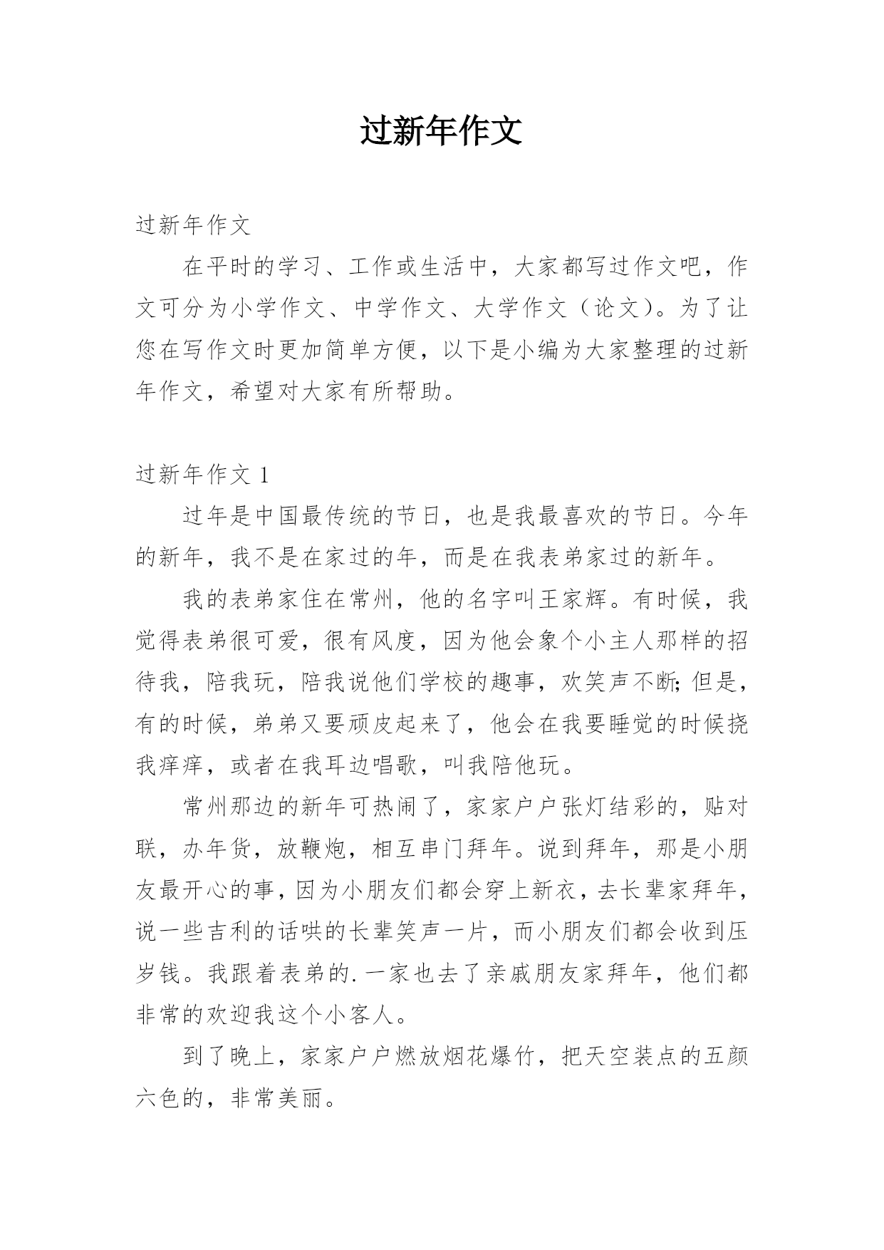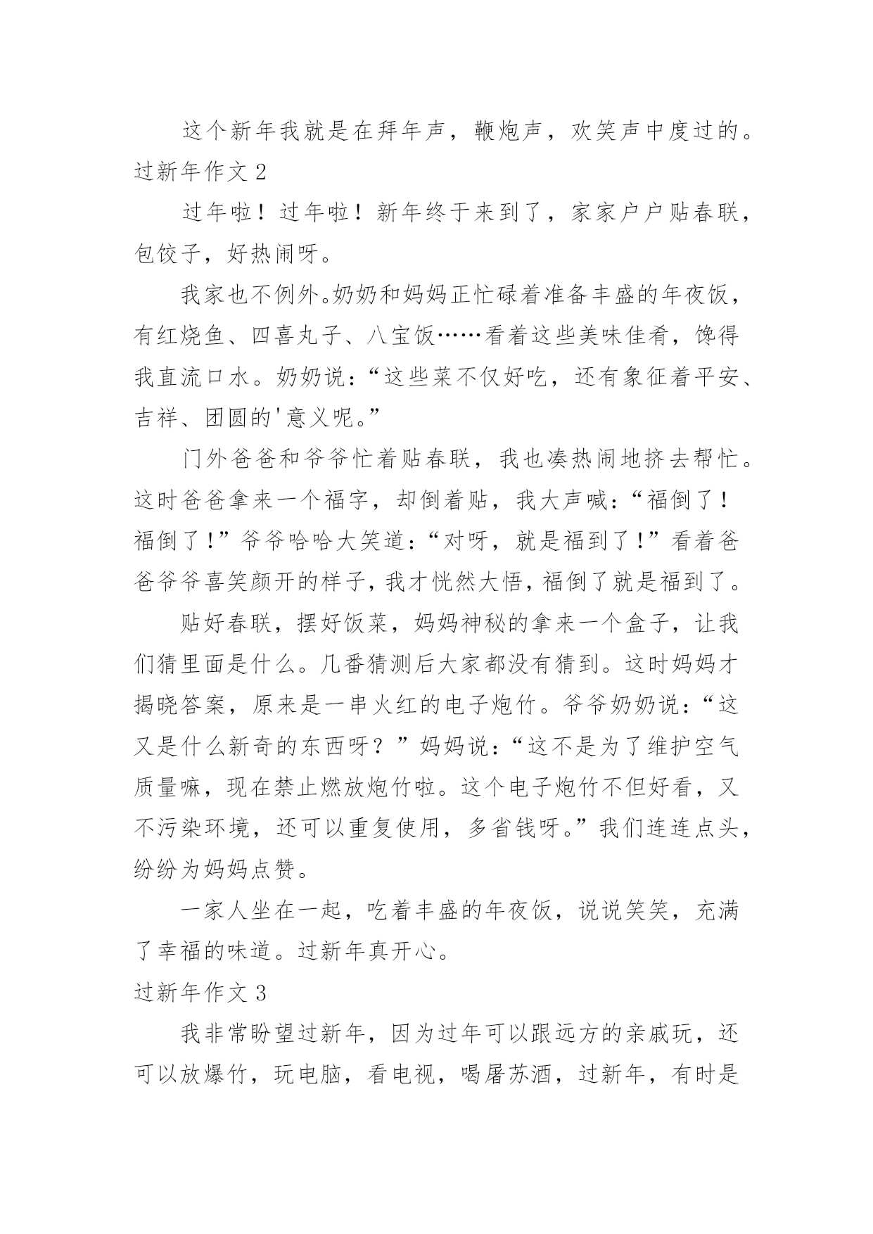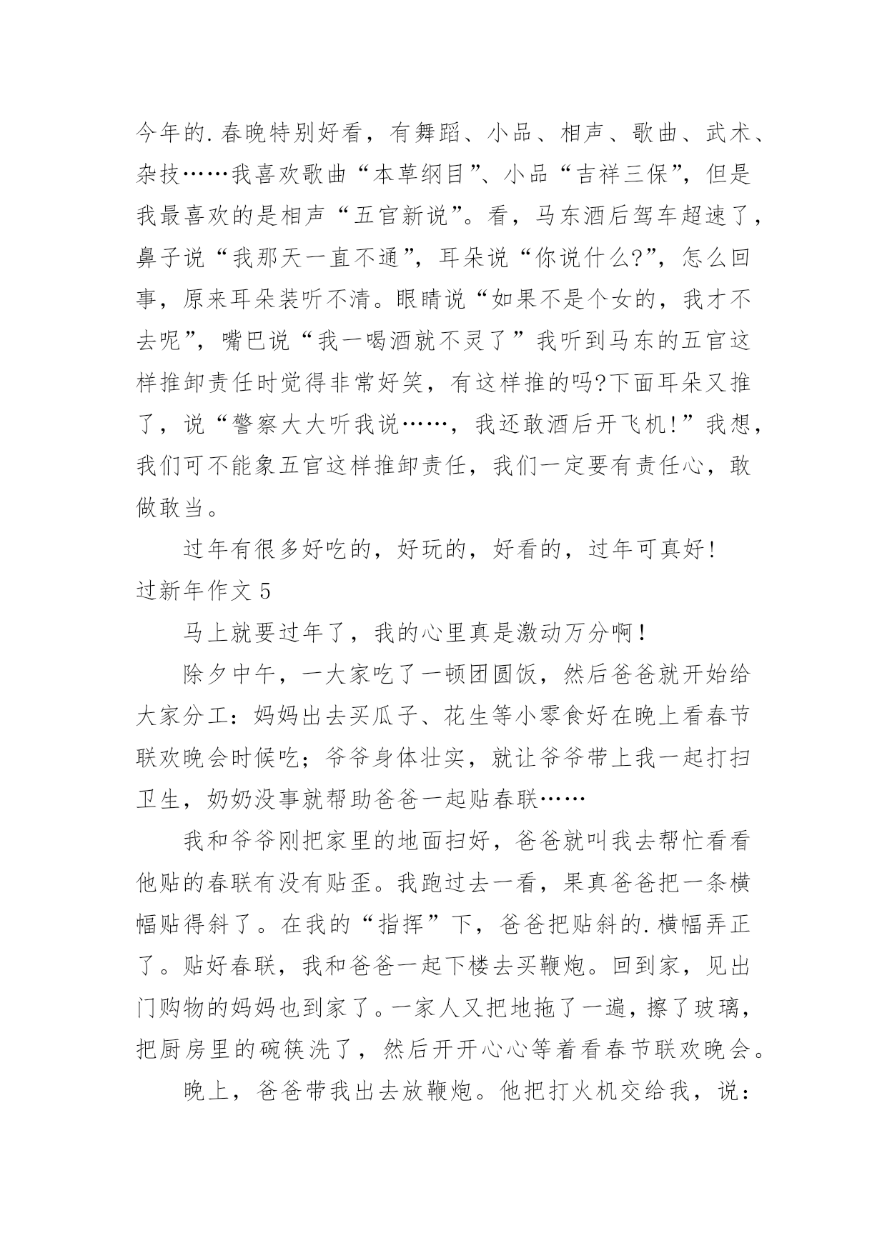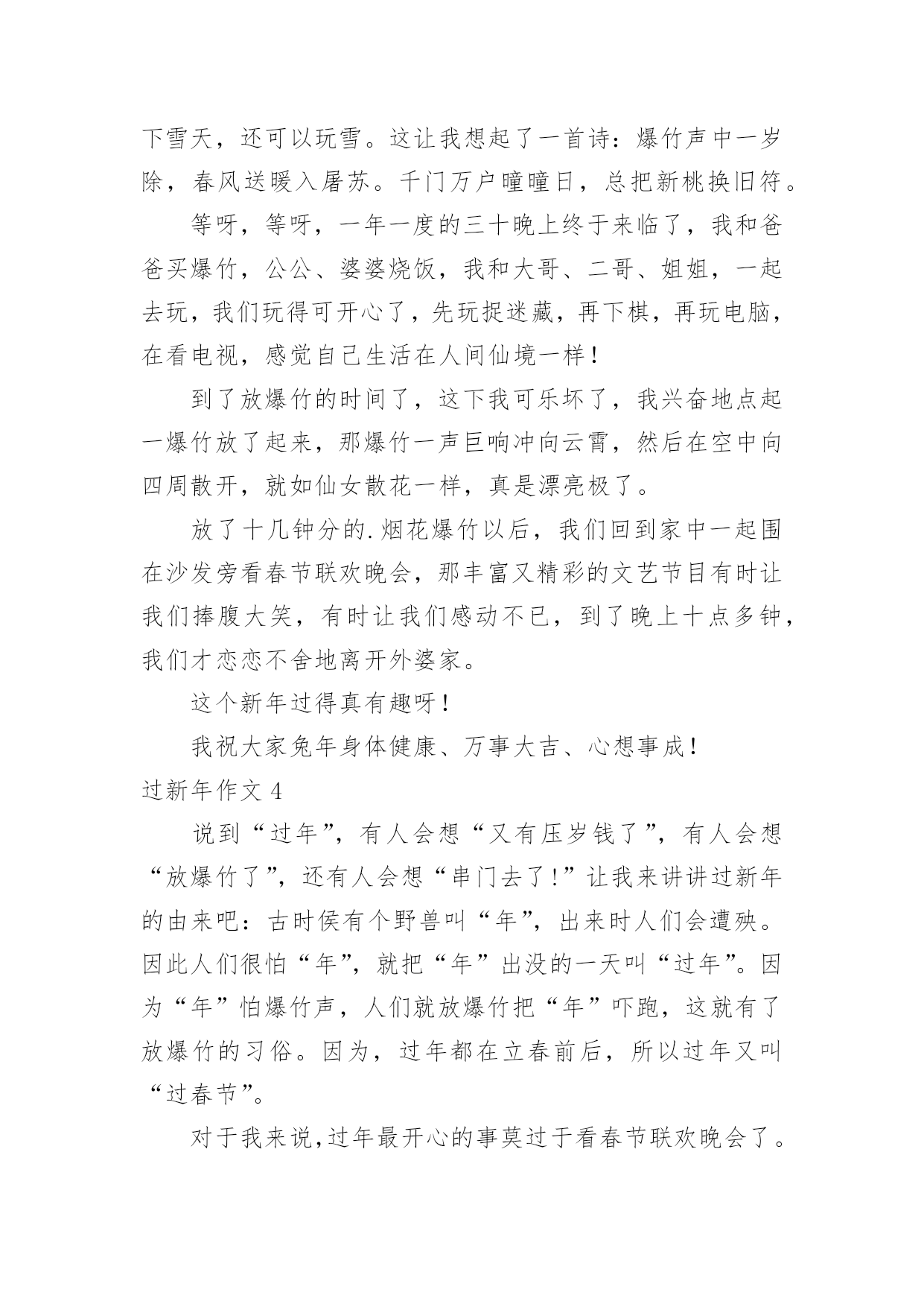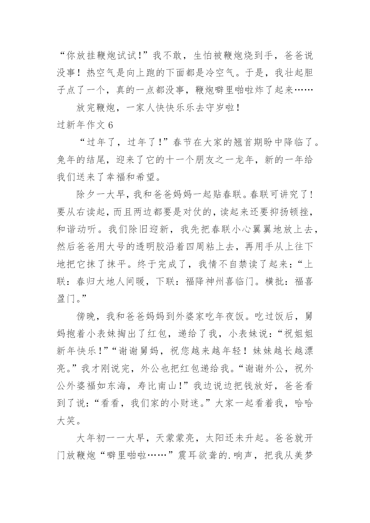 过新年作文 过新年作文在平时的学习、工作或生活中,大家都写过作文吧,作文可分为小学作文、中学作文、大学作文(论文)。为了让您在写作文时更加简单方便,以下是小编为大家整理的过新年作文,希望对大家有所帮助。过新年作文1过年是中国最传统的节日,也是我最喜欢的节日。今年的新年,我不是在家过的年,而是在我表弟家过的新年。我的表弟家住在常州,他的名字叫王家辉。有时候,我觉得表弟很可爱,很有风度,因为他会象个小主人那样的招待我,陪我玩,陪我说他们学校的趣事,欢笑声不断;但是,有的时候,弟弟又要顽皮起来了,他会在我要睡觉的时候挠我痒痒,或者在我耳边唱歌,叫我陪他玩。常州那边的新年可热闹了,家家户户张灯结彩的,贴对联,办年货,放鞭炮,相互串门拜年。说到拜年,那是小朋友最开心的事,因为小朋友们都会穿上新衣,去长辈家拜年,说一些吉利的话哄的长辈笑声一片,而小朋友们都会收到压岁钱。我跟着表弟的.一家也去了亲戚朋友家拜年,他们都非常的欢迎我这个小客人。到了晚上,家家户户燃放烟花爆竹,把天空装点的五颜六色的,非常美丽。这个新年我就是在拜年声,鞭炮声,欢笑声中度过的。过新年作文2过年啦!过年啦!新年终于来到了,家家户户贴春联,包饺子,好热闹呀。我家也不例外。奶奶和妈妈正忙碌着准备丰盛的年夜饭,有红烧鱼、四喜丸子、八宝饭……看着这些美味佳肴,馋得我直流口水。奶奶说:“这些菜不仅好吃,还有象征着平安、吉祥、团圆的'意义呢。”门外爸爸和爷爷忙着贴春联,我也凑热闹地挤去帮忙。这时爸爸拿来一个福字,却倒着贴,我大声喊:“福倒了!福倒了!”爷爷哈哈大笑道:“对呀,就是福到了!”看着爸爸爷爷喜笑颜开的样子,我才恍然大悟,福倒了就是福到了。贴好春联,摆好饭菜,妈妈神秘的拿来一个盒子,让我们猜里面是什么。几番猜测后大家都没有猜到。这时妈妈才揭晓答案,原来是一串火红的电子炮竹。爷爷奶奶说:“这又是什么新奇的东西呀?”妈妈说:“这不是为了维护空气质量嘛,现在禁止燃放炮竹啦。这个电子炮竹不但好看,又不污染环境,还可以重复使用,多省钱呀。”我们连连点头,纷纷为妈妈点赞。一家人坐在一起,吃着丰盛的年夜饭,说说笑笑,充满了幸福的味道。过新年真开心。过新年作文3我非常盼望过新年,因为过年可以跟远方的亲戚玩,还可以放爆竹,玩电脑,看电视,喝屠苏酒,过新年,有时是下雪天,还可以玩雪。这让我想起了一首诗:爆竹声中一岁除,春风送暖入屠苏。千门万户曈曈日,总把新桃换旧符。等呀,等呀,一年一度的三十晚上终于来临了,我和爸爸买爆竹,公公、婆婆烧饭,我和大哥、二哥、姐姐,一起去玩,我们玩得可开心了,先玩捉迷藏,再下棋,再玩电脑,在看电视,感觉自己生活在人间仙境一样!到了放爆竹的时间了,这下我可乐坏了,我兴奋地点起一爆竹放了起来,那爆竹一声巨响冲向云霄,然后在空中向四周散开,就如仙女散花一样,真是漂亮极了。放了十几钟分的.烟花爆竹以后,我们回到家中一起围在沙发旁看春节联欢晚会,那丰富又精彩的文艺节目有时让我们捧腹大笑,有时让我们感动不已,到了晚上十点多钟,我们才恋恋不舍地离开外婆家。这个新年过得真有趣呀!我祝大家兔年身体健康、万事大吉、心想事成!过新年作文4说到“过年”,有人会想“又有压岁钱了”,有人会想“放爆竹了”,还有人会想“串门去了!”让我来讲讲过新年的由来吧:古时侯有个野兽叫“年”,出来时人们会遭殃。因此人们很怕“年”,就把“年”出没的一天叫“过年”。因为“年”怕爆竹声,人们就放爆竹把“年”吓跑,这就有了放爆竹的习俗。因为,过年都在立春前后,所以过年又叫“过春节”。对于我来说,过年最开心的事莫过于看春节联欢晚会了。今年的.春晚特别好看,有舞蹈、小品、相声、歌曲、武术、杂技……我喜欢歌曲“本草纲目”、小品“吉祥三保”,但是我最喜欢的是相声“五官新说”。看,马东酒后驾车超速了,鼻子说“我那天一直不通”,耳朵说“你说什么?”,怎么回事,原来耳朵装听不清。眼睛说“如果不是个女的,我才不去呢”,嘴巴说“我一喝酒就不灵了”我听到马东的五官这样推卸责任时觉得非常好笑,有这样推的吗?下面耳朵又推了,说“警察大大听我说……,我还敢酒后开飞机!”我想,我们可不能象五官这样推卸责任,我们一定要有责任心,敢做敢当。过年有很多好吃的,好玩的,好看的,过年可真好!过新年作文5马上就要过年了,我的心里真是激动万分啊!除夕中午,一大家吃了一顿团圆饭,然后爸爸就开始给大家分工:妈妈出去买瓜子、花生等小零食好在晚上看春节联欢晚会时候吃;爷爷身体壮实,就让爷爷带上我一起打扫卫生,奶奶没事就帮助爸爸一起贴春联……我和爷爷刚把家里的地面扫好,爸爸就叫我去帮忙看看他贴的春联有没有贴歪。我跑过去一看,果真爸爸把一条横幅贴得斜了。在我的“指挥”下,爸爸把贴斜的.横幅弄正了。贴好春联,我和爸爸一起下楼去买鞭炮。回到家,见出门购物的妈妈也到家了。