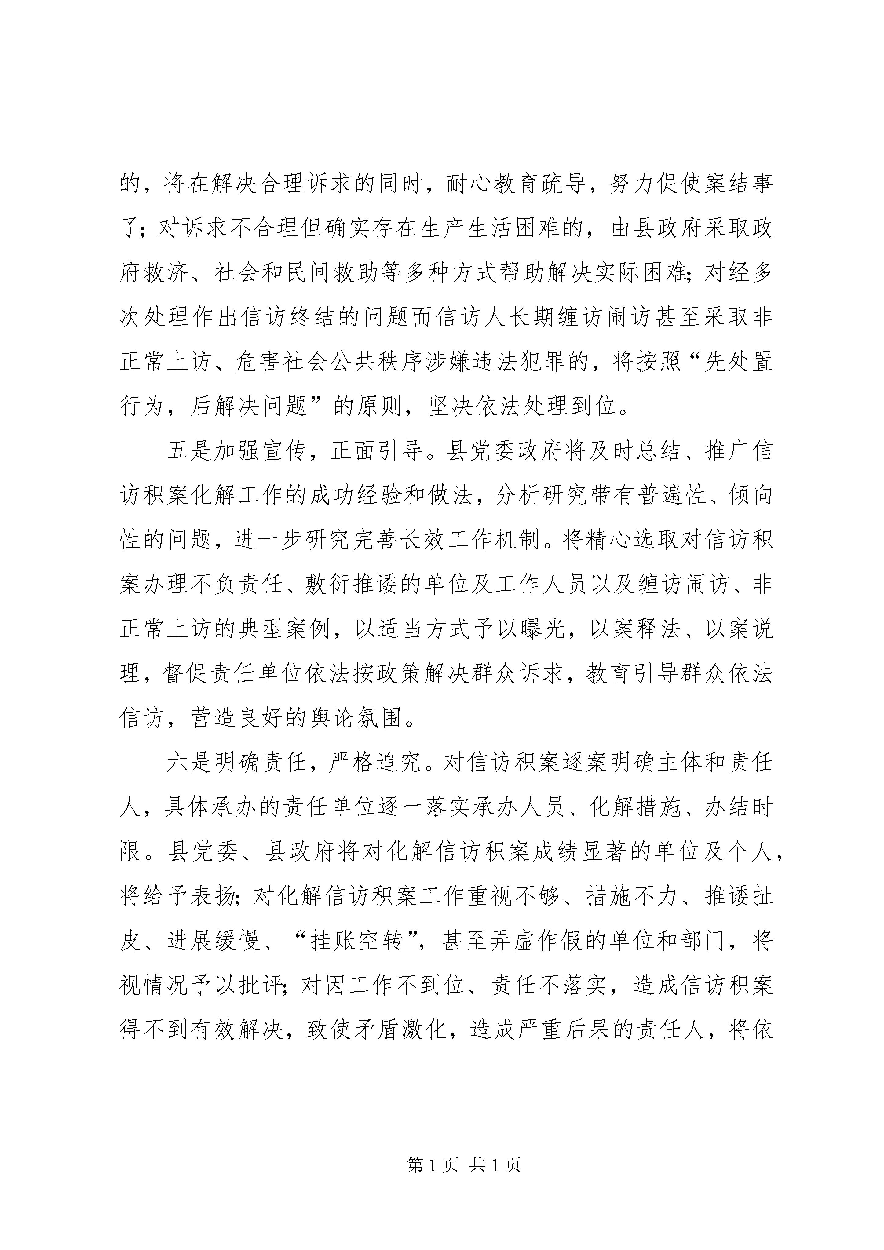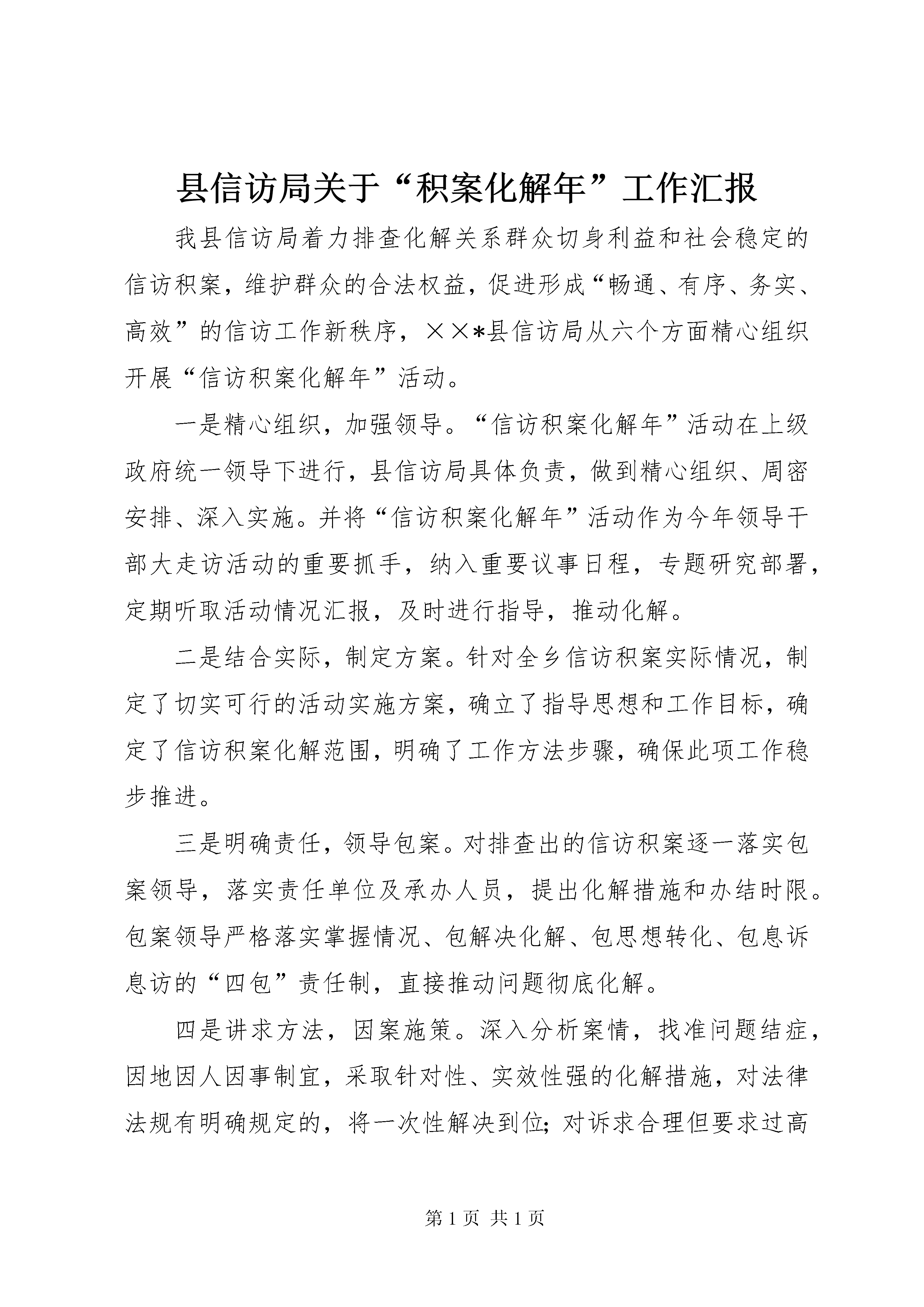 县信访局关于“积案化解年”工作汇报我县信访局着力排查化解关系群众切身利益和社会稳定的信访积案,维护群众的合法权益,促进形成“畅通、有序、务实、高效”的信访工作新秩序,××*县信访局从六个方面精心组织开展“信访积案化解年”活动。一是精心组织,加强领导。“信访积案化解年”活动在上级政府统一领导下进行,县信访局具体负责,做到精心组织、周密安排、深入实施。并将“信访积案化解年”活动作为今年领导干部大走访活动的重要抓手,纳入重要议事日程,专题研究部署,定期听取活动情况汇报,及时进行指导,推动化解。二是结合实际,制定方案。针对全乡信访积案实际情况,制定了切实可行的活动实施方案,确立了指导思想和工作目标,确定了信访积案化解范围,明确了工作方法步骤,确保此项工作稳步推进。三是明确责任,领导包案。对排查出的信访积案逐一落实包案领导,落实责任单位及承办人员,提出化解措施和办结时限。包案领导严格落实掌握情况、包解决化解、包思想转化、包息诉息访的“四包”责任制,直接推动问题彻底化解。四是讲求方法,因案施策。深入分析案情,找准问题结症,因地因人因事制宜,采取针对性、实效性强的化解措施,对法律法规有明确规定的,将一次性解决到位;对诉求合理但要求过高的,将在解决合理诉求的同时,耐心教育疏导,努力促使案结事了;对诉求不合理但确实存在生产生活困难的,由县政府采取政府救济、社会和民间救助等多种方式帮助解决实际困难;对经多次处理作出信访终结的问题而信访人长期缠访闹访甚至采取非正常上访、危害社会公共秩序涉嫌违法犯罪的,将按照“先处置行为,后解决问题”的原则,坚决依法处理到位。五是加强宣传,正面引导。县党委政府将及时总结、推广信访积案化解工作的成功经验和做法,分析研究带有普遍性、倾向性的问题,进一步研究完善长效工作机制。将精心选取对信访积案办理不负责任、敷衍推诿的单位及工作人员以及缠访闹访、非正常上访的典型案例,以适当方式予以曝光,以案释法、以案说理,督促责任单位依法按政策解决群众诉求,教育引导群众依法信访,营造良好的舆论氛围。六是明确责任,严格追究。对信访积案逐案明确主体和责任人,具体承办的责任单位逐一落实承办人员、化解措施、办结时限。县党委、县政府将对化解信访积案成绩显著的单位及个人,将给予表扬;对化解信访积案工作重视不够、措施不力、推诿扯皮、进展缓慢、“挂账空转”,甚至弄虚作假的单位和部门,将视情况予以批评;对因工作不到位、责任不落实,造成信访积案得不到有效解决,致使矛盾激化,造成严重后果的责任人,将依据相关规定严肃追究责任。