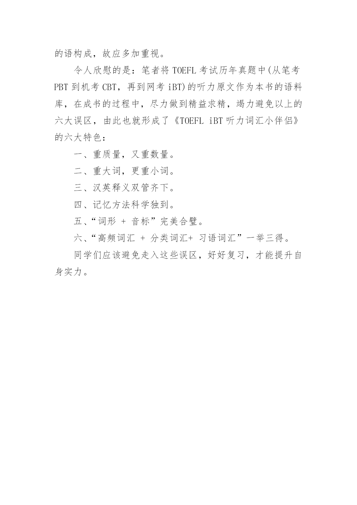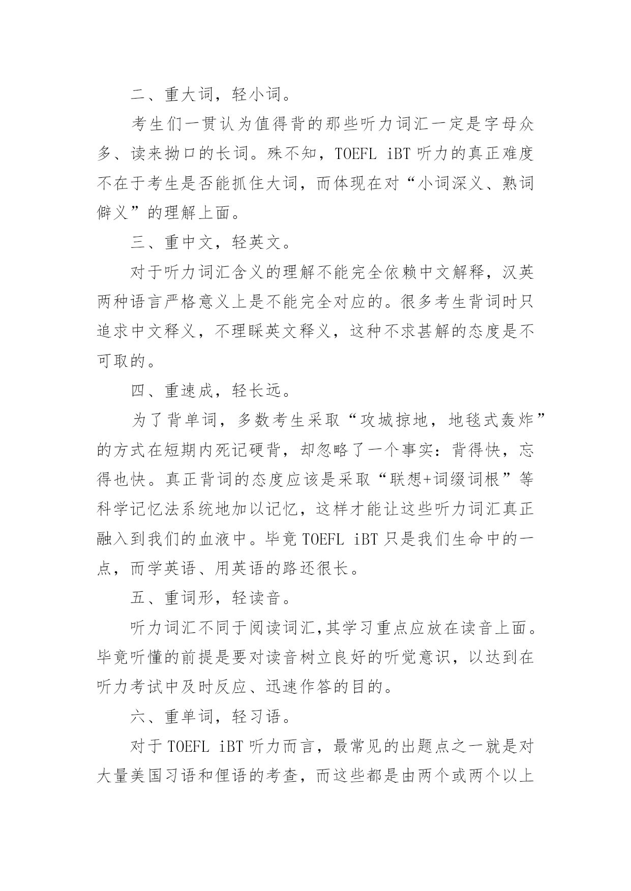 记忆托福词汇的6大误区 可想而知,如果考生一开始就听不懂,那么无论是写作题还是口试题都将无从下手。听力已经成为无数考生取得TOEFLiBT高分的拦路虎。其中一个重要的原因应归结为绝大多数考生有意、无意地忽视了对TOEFL听力词汇的学习。无可否认:TOEFL分数的高低与考生词汇量的多少密切相关。对于TOEFLiBT的听力而言,其测试的主要目的是考查考生在自然英语语境中的`适应力和理解力,也就是要求考生既能通晓SurvivalEnglish(生存性语言),又能听懂AcademicEnglish(学术性语言),而ETS规定听力考查的学术话题又可细分为1)Arts,2)LifeScience,3)PhysicalScience,4)SocialScience四大类。所谓“万变不离其宗”,当下考生们的当务之急就是迅速熟悉并熟背这些听力高频词汇和分类词汇,培养对听力的敏感度,以达到学以致用。不过,值得考生注意的是:对TOEFLiBT听力词汇的学习绝不同于其他阅读、写作、口语词汇的学习。考生们往往会不经意地步入以下“六大误区”:一、重数量,轻质量。实践证明:大多数考生听不懂,不在于没背过,而在于缺乏对词汇含义更深层、更灵活的把握。学习TOEFLiBT的听力词汇应该达到举一反三,触类旁通。二、重大词,轻小词。考生们一贯认为值得背的那些听力词汇一定是字母众多、读来拗口的长词。殊不知,TOEFLiBT听力的真正难度不在于考生是否能抓住大词,而体现在对“小词深义、熟词僻义”的理解上面。三、重中文,轻英文。对于听力词汇含义的理解不能完全依赖中文解释,汉英两种语言严格意义上是不能完全对应的。很多考生背词时只追求中文释义,不理睬英文释义,这种不求甚解的态度是不可取的。四、重速成,轻长远。为了背单词,多数考生采取“攻城掠地,地毯式轰炸”的方式在短期内死记硬背,却忽略了一个事实:背得快,忘得也快。真正背词的态度应该是采取“联想+词缀词根”等科学记忆法系统地加以记忆,这样才能让这些听力词汇真正融入到我们的血液中。毕竟TOEFLiBT只是我们生命中的一点,而学英语、用英语的路还很长。五、重词形,轻读音。听力词汇不同于阅读词汇,其学习重点应放在读音上面。毕竟听懂的前提是要对读音树立良好的听觉意识,以达到在听力考试中及时反应、迅速作答的目的。六、重单词,轻习语。对于TOEFLiBT听力而言,最常见的出题点之一就是对大量美国习语和俚语的考查,而这些都是由两个或两个以上的语构成,故应多加重视。令人欣慰的是:笔者将TOEFL考试历年真题中(从笔考PBT到机考CBT,再到网考iBT)的听力原文作为本书的语料库,在成书的过程中,尽力做到精益求精,竭力避免以上的六大误区,由此也就形成了《TOEFLiBT听力词汇小伴侣》的六大特色:一、重质量,又重数量。二、重大词,更重小词。三、汉英释义双管齐下。四、记忆方法科学独到。五、“词形+音标”完美合璧。六、“高频词汇+分类词汇+习语词汇”一举三得。同学们应该避免走入这些误区,好好复习,才能提升自身实力。