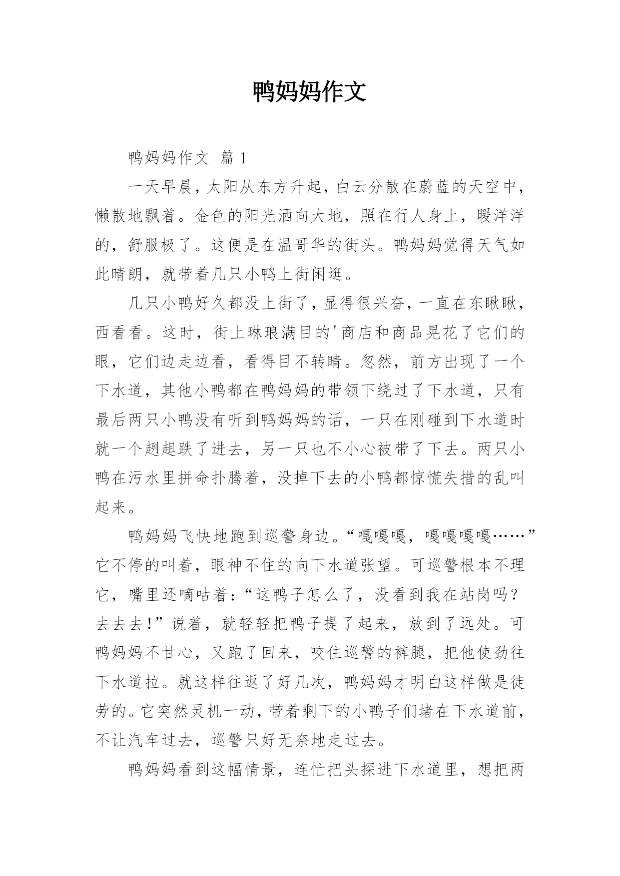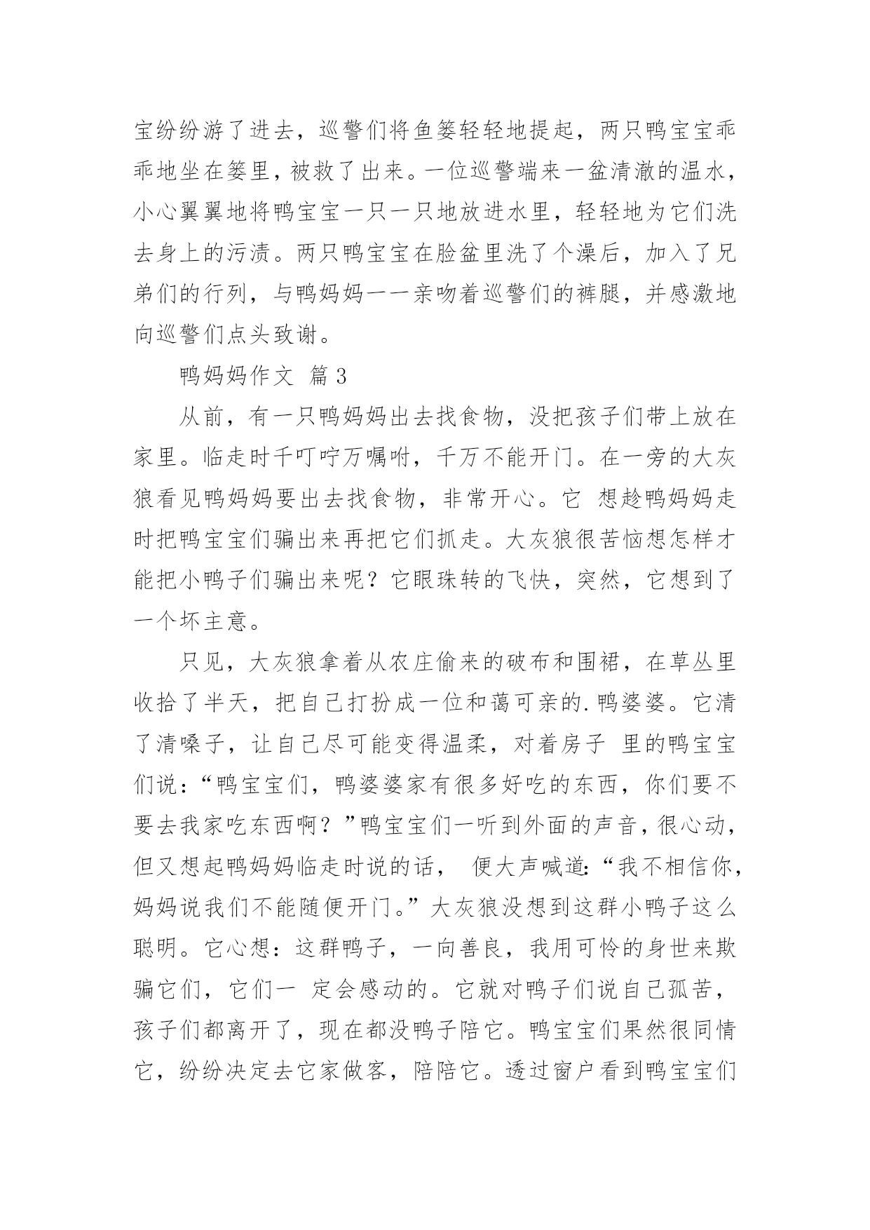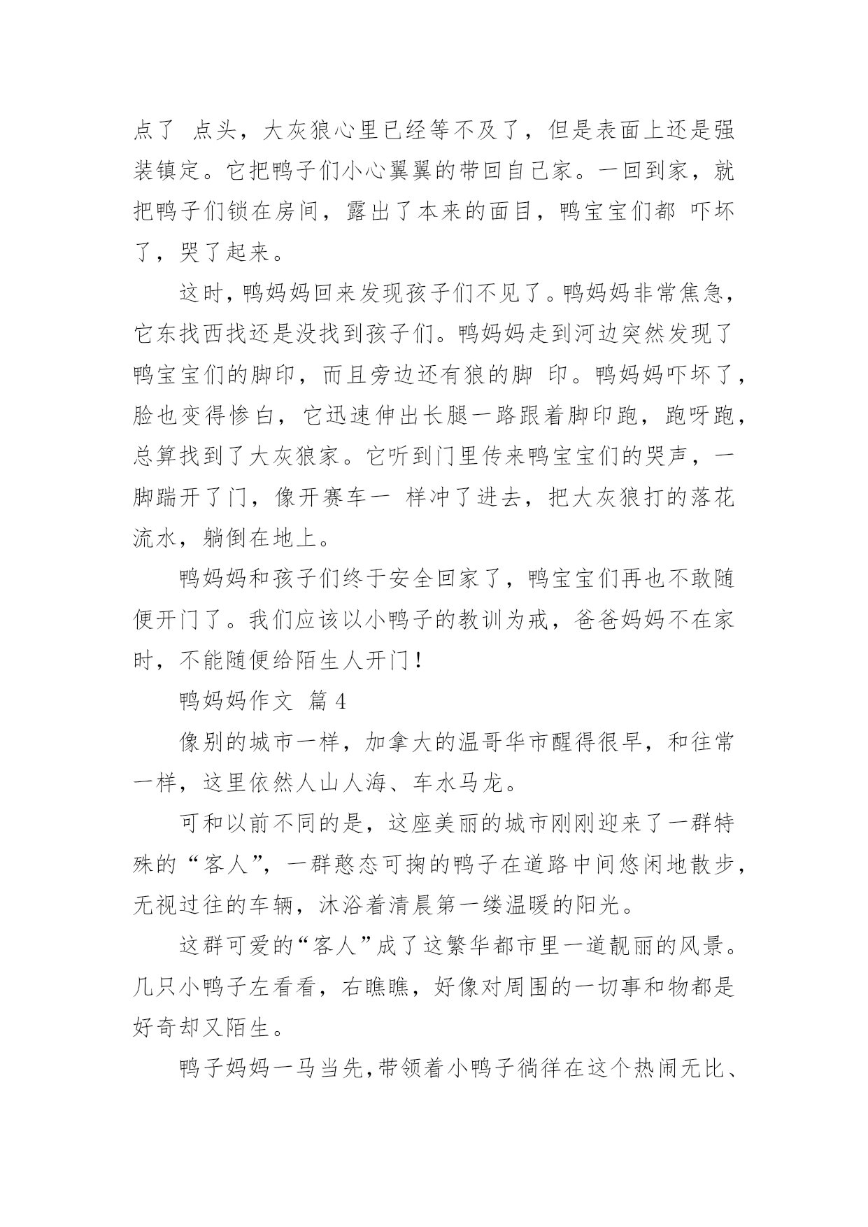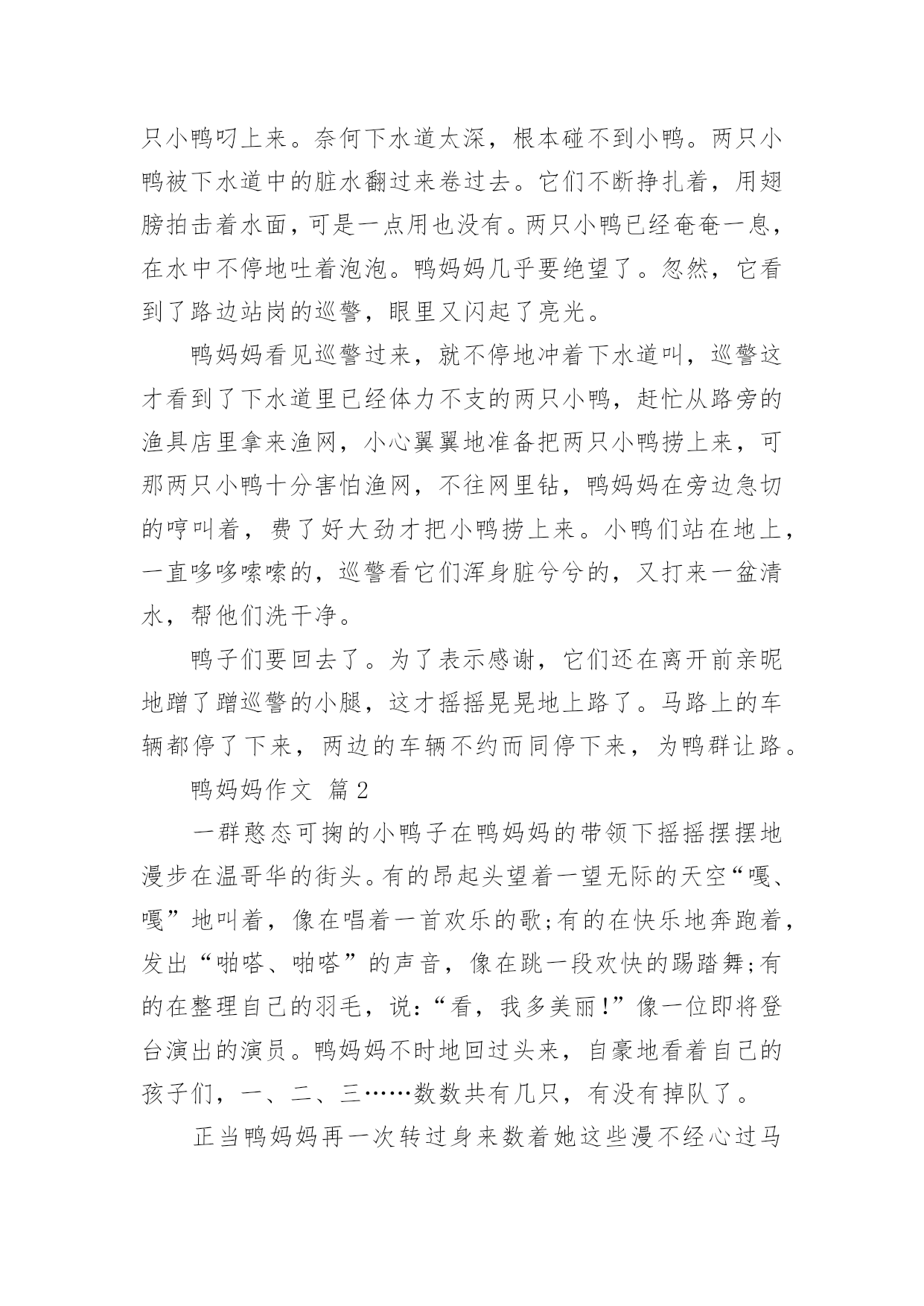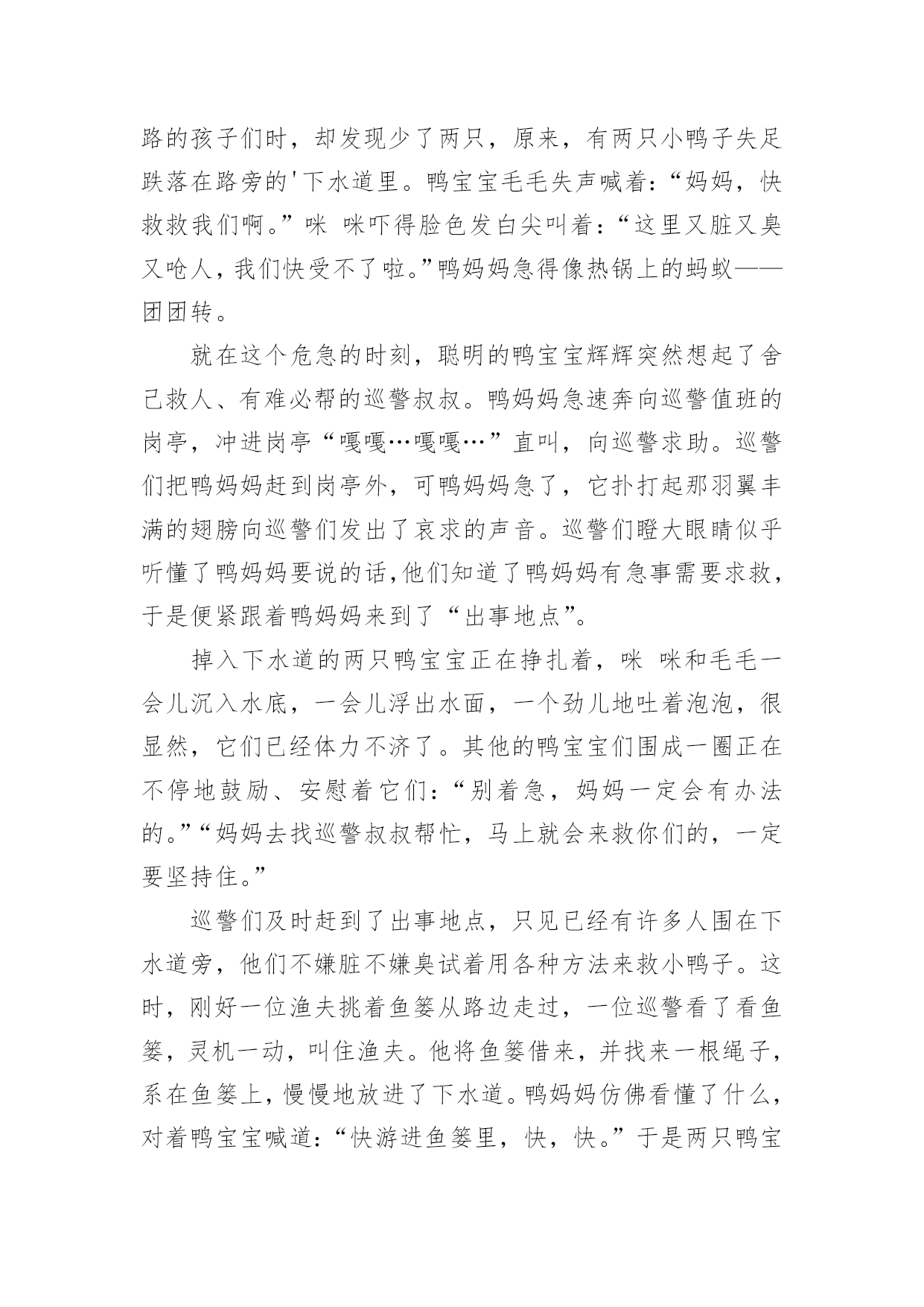 鸭妈妈作文 鸭妈妈作文篇1一天早晨,太阳从东方升起,白云分散在蔚蓝的天空中,懒散地飘着。金色的阳光洒向大地,照在行人身上,暖洋洋的,舒服极了。这便是在温哥华的街头。鸭妈妈觉得天气如此晴朗,就带着几只小鸭上街闲逛。几只小鸭好久都没上街了,显得很兴奋,一直在东瞅瞅,西看看。这时,街上琳琅满目的'商店和商品晃花了它们的眼,它们边走边看,看得目不转睛。忽然,前方出现了一个下水道,其他小鸭都在鸭妈妈的带领下绕过了下水道,只有最后两只小鸭没有听到鸭妈妈的话,一只在刚碰到下水道时就一个趔趄跌了进去,另一只也不小心被带了下去。两只小鸭在污水里拼命扑腾着,没掉下去的小鸭都惊慌失措的乱叫起来。鸭妈妈飞快地跑到巡警身边。“嘎嘎嘎,嘎嘎嘎嘎……”它不停的叫着,眼神不住的向下水道张望。可巡警根本不理它,嘴里还嘀咕着:“这鸭子怎么了,没看到我在站岗吗?去去去!”说着,就轻轻把鸭子提了起来,放到了远处。可鸭妈妈不甘心,又跑了回来,咬住巡警的裤腿,把他使劲往下水道拉。就这样往返了好几次,鸭妈妈才明白这样做是徒劳的。它突然灵机一动,带着剩下的小鸭子们堵在下水道前,不让汽车过去,巡警只好无奈地走过去。鸭妈妈看到这幅情景,连忙把头探进下水道里,想把两只小鸭叼上来。奈何下水道太深,根本碰不到小鸭。两只小鸭被下水道中的脏水翻过来卷过去。它们不断挣扎着,用翅膀拍击着水面,可是一点用也没有。两只小鸭已经奄奄一息,在水中不停地吐着泡泡。鸭妈妈几乎要绝望了。忽然,它看到了路边站岗的巡警,眼里又闪起了亮光。鸭妈妈看见巡警过来,就不停地冲着下水道叫,巡警这才看到了下水道里已经体力不支的两只小鸭,赶忙从路旁的渔具店里拿来渔网,小心翼翼地准备把两只小鸭捞上来,可那两只小鸭十分害怕渔网,不往网里钻,鸭妈妈在旁边急切的哼叫着,费了好大劲才把小鸭捞上来。小鸭们站在地上,一直哆哆嗦嗦的,巡警看它们浑身脏兮兮的,又打来一盆清水,帮他们洗干净。鸭子们要回去了。为了表示感谢,它们还在离开前亲昵地蹭了蹭巡警的小腿,这才摇摇晃晃地上路了。马路上的车辆都停了下来,两边的车辆不约而同停下来,为鸭群让路。鸭妈妈作文篇2一群憨态可掬的小鸭子在鸭妈妈的带领下摇摇摆摆地漫步在温哥华的街头。有的昂起头望着一望无际的天空“嘎、嘎”地叫着,像在唱着一首欢乐的歌;有的在快乐地奔跑着,发出“啪嗒、啪嗒”的声音,像在跳一段欢快的踢踏舞;有的在整理自己的羽毛,说:“看,我多美丽!”像一位即将登台演出的演员。鸭妈妈不时地回过头来,自豪地看着自己的孩子们,一、二、三……数数共有几只,有没有掉队了。正当鸭妈妈再一次转过身来数着她这些漫不经心过马路的孩子们时,却发现少了两只,原来,有两只小鸭子失足跌落在路旁的'下水道里。鸭宝宝毛毛失声喊着:“妈妈,快救救我们啊。”咪咪吓得脸色发白尖叫着:“这里又脏又臭又呛人,我们快受不了啦。”鸭妈妈急得像热锅上的蚂蚁——团团转。就在这个危急的时刻,聪明的鸭宝宝辉辉突然想起了舍己救人、有难必帮的巡警叔叔。鸭妈妈急速奔向巡警值班的岗亭,冲进岗亭“嘎嘎…嘎嘎…”直叫,向巡警求助。巡警们把鸭妈妈赶到岗亭外,可鸭妈妈急了,它扑打起那羽翼丰满的翅膀向巡警们发出了哀求的声音。巡警们瞪大眼睛似乎听懂了鸭妈妈要说的话,他们知道了鸭妈妈有急事需要求救,于是便紧跟着鸭妈妈来到了“出事地点”。掉入下水道的两只鸭宝宝正在挣扎着,咪咪和毛毛一会儿沉入水底,一会儿浮出水面,一个劲儿地吐着泡泡,很显然,它们已经体力不济了。其他的鸭宝宝们围成一圈正在不停地鼓励、安慰着它们:“别着急,妈妈一定会有办法的。”“妈妈去找巡警叔叔帮忙,马上就会来救你们的,一定要坚持住。”巡警们及时赶到了出事地点,只见已经有许多人围在下水道旁,他们不嫌脏不嫌臭试着用各种方法来救小鸭子。这时,刚好一位渔夫挑着鱼篓从路边走过,一位巡警看了看鱼篓,灵机一动,叫住渔夫。他将鱼篓借来,并找来一根绳子,系在鱼篓上,慢慢地放进了下水道。鸭妈妈仿佛看懂了什么,对着鸭宝宝喊道:“快游进鱼篓里,快,快。”于是两只鸭宝宝纷纷游了进去,巡警们将鱼篓轻轻地提起,两只鸭宝宝乖乖地坐在篓里,被救了出来。一位巡警端来一盆清澈的温水,小心翼翼地将鸭宝宝一只一只地放进水里,轻轻地为它们洗去身上的污渍。两只鸭宝宝在脸盆里洗了个澡后,加入了兄弟们的行列,与鸭妈妈一一亲吻着巡警们的裤腿,并感激地向巡警们点头致谢。鸭妈妈作文篇3从前,有一只鸭妈妈出去找食物,没把孩子们带上放在家里。临走时千叮咛万嘱咐,千万不能开门。在一旁的大灰狼看见鸭妈妈要出去找食物,非常开心。它想趁鸭妈妈走时把鸭宝宝们骗出来再把它们抓走。大灰狼很苦恼想怎样才能把小鸭子们骗出来呢?它眼珠转的飞快,突然,它想到了一个坏主意。只见,大灰狼拿着从农庄偷来的破布和围裙,在草丛里收拾了半天,把自己打扮成一位和蔼可亲的.鸭婆婆。它清了清嗓子,让自