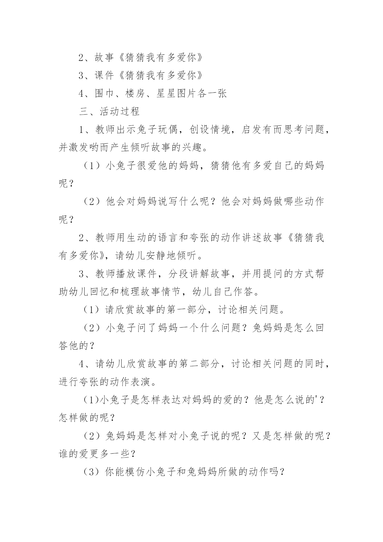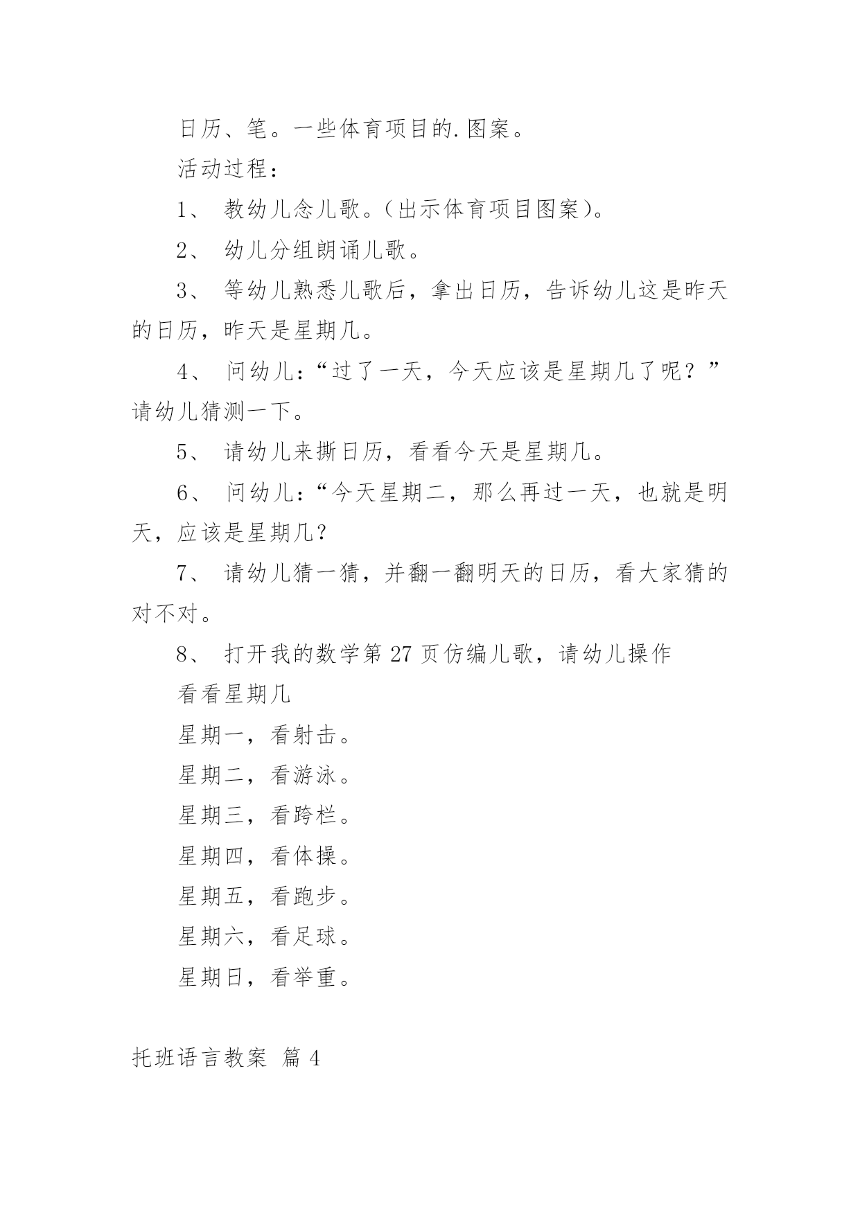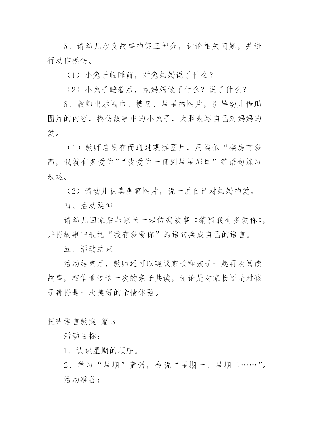 托班语言教案 托班语言教案模板汇总八篇作为一位兢兢业业的人民教师,常常需要准备教案,编写教案有利于我们弄通教材内容,进而选择科学、恰当的教学方法。那么问题来了,教案应该怎么写?下面是小编整理的托班语言教案8篇,供大家参考借鉴,希望可以帮助到有需要的朋友。托班语言教案篇1设计意图:《红绿灯》这首儿歌只有四句,语言直白,通过直观的图片引导来帮助幼儿学习儿歌,学起来比较容易。孩子们经常能在马路上看到汽车和红绿灯,而托班孩子的语言能力有限,通过本次活动,不但可以提高孩子的语言能力,丰富词句,还可以让孩子从小了解并遵守交通规则。活动目标:1.理解儿歌《红绿灯》。知道“红灯停,绿灯行”的交通规则。2.能有节奏地念儿歌,初步感受儿歌的韵律美。活动准备:布置场景(小动物的家)、塑料方向盘每人一个、磁带、录音机活动过程:一、教师带幼儿听音乐开汽车入场。二、教师在游戏中引导幼儿学习儿歌《红绿灯》1.根据儿歌内容提问:(1)刚才我们是怎么进来的?(开小汽车)(2)小汽车发出的'声音是怎么样的?(3)是谁在当司机啊?是小朋友自己当司机,我们说:“我来当司机。”2、途中碰到“红绿灯”,提问:看到红灯我们应该怎么样?(红灯停)变成绿灯了,我们才可以怎么样?(绿灯开)3、游戏:“到小动物家去”。教师带领幼儿去小动物家,边开车边学习儿歌,并邀请小动物上车。游戏可反复进行。4、教师发给每个幼儿一个方向盘,鼓励幼儿自己边开车边念儿歌。三、教师带幼儿听音乐边念儿歌边开车出活动室。附儿歌:红绿灯小汽车,嘀嘀嘀,我来当司机。红灯停,绿灯开,真呀真开心。托班语言教案篇2一、活动目标1、引导幼儿倾听故事,感受真挚且深切的母子深情。2、能在集体面前大胆的表述自己对妈妈的爱。3、联系用夸张的动作和语言表达抽象的情感。二、活动准备1、兔子玩偶一个2、故事《猜猜我有多爱你》3、课件《猜猜我有多爱你》4、围巾、楼房、星星图片各一张三、活动过程1、教师出示兔子玩偶,创设情境,启发有而思考问题,并激发哟而产生倾听故事的兴趣。(1)小兔子很爱他的妈妈,猜猜他有多爱自己的妈妈呢?(2)他会对妈妈说写什么呢?他会对妈妈做哪些动作呢?2、教师用生动的语言和夸张的动作讲述故事《猜猜我有多爱你》,请幼儿安静地倾听。3、教师播放课件,分段讲解故事,并用提问的方式帮助幼儿回忆和梳理故事情节,幼儿自己作答。(1)请欣赏故事的第一部分,讨论相关问题。(2)小兔子问了妈妈一个什么问题?兔妈妈是怎么回答他的?4、请幼儿欣赏故事的第二部分,讨论相关问题的同时,进行夸张的动作表演。(1)小兔子是怎样表达对妈妈的爱的?他是怎么说的'?怎样做的呢?(2)兔妈妈是怎样对小兔子说的呢?又是怎样做的呢?谁的爱更多一些?(3)你能模仿小兔子和兔妈妈所做的动作吗?5、请幼儿欣赏故事的第三部分,讨论相关问题,并进行动作模仿。(1)小兔子临睡前,对兔妈妈说了什么?(2)小兔子睡着后,兔妈妈做了什么?说了什么?6、教师出示围巾、楼房、星星的图片,引导幼儿借助图片的内容,模仿故事中的小兔子,大胆表述自己对妈妈的爱。(1)教师启发有而通过观察图片,用类似“楼房有多高,我就有多爱你”“我爱你一直到星星那里”等语句练习表达。(2)请幼儿认真观察图片,说一说自己对妈妈的爱。四、活动延伸请幼儿回家后与家长一起仿编故事《猜猜我有多爱你》,并将故事中表达“我有多爱你”的语句换成自己的语言。五、活动结束活动结束后,教师还可以建议家长和孩子一起再次阅读故事,相信通过这一次的亲子共读,无论是对家长还是对孩子都将是一次美好的亲情体验。托班语言教案篇3活动目标:1、认识星期的顺序。2、学习“星期”童谣,会说“星期一、星期二……”。活动准备:日历、笔。一些体育项目的.图案。活动过程:1、教幼儿念儿歌。(出示体育项目图案)。2、幼儿分组朗诵儿歌。3、等幼儿熟悉儿歌后,拿出日历,告诉幼儿这是昨天的日历,昨天是星期几。4、问幼儿:“过了一天,今天应该是星期几了呢?”请幼儿猜测一下。5、请幼儿来撕日历,看看今天是星期几。6、问幼儿:“今天星期二,那么再过一天,也就是明天,应该是星期几?7、请幼儿猜一猜,并翻一翻明天的日历,看大家猜的对不对。8、打开我的数学仿编儿歌,请幼儿操作看看星期几星期一,看射击。星期二,看游泳。星期三,看跨栏。星期四,看体操。星期五,看跑步。星期六,看足球。星期日,看举重。托班语言教案篇4适合学龄:托班涉及范围:故事、人际交往、语文一、活动目标1.理解故事的主要内容,喜欢听故事。2.说“白白的牙齿真漂亮”。二、活动准备1.玩具小熊。2.故事mp3三、活动过程1.出示玩具小熊,引起幼儿听故事的兴趣。——玩具小熊的故事可多了,今天我们要讲一个《小熊拔牙》的故事。2.教师讲述故事。——故事里有谁?他最喜欢吃什么?后来怎么办?3.放故事mp3第二遍,帮