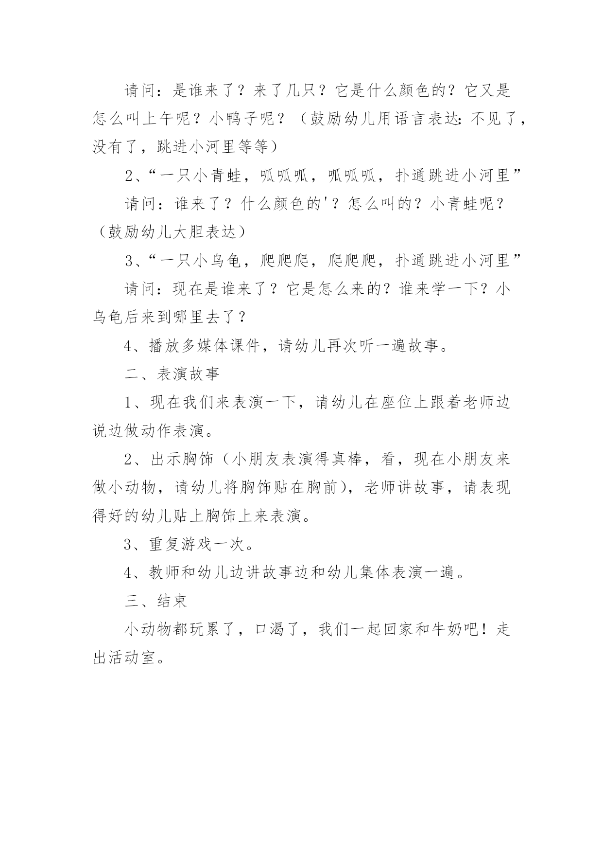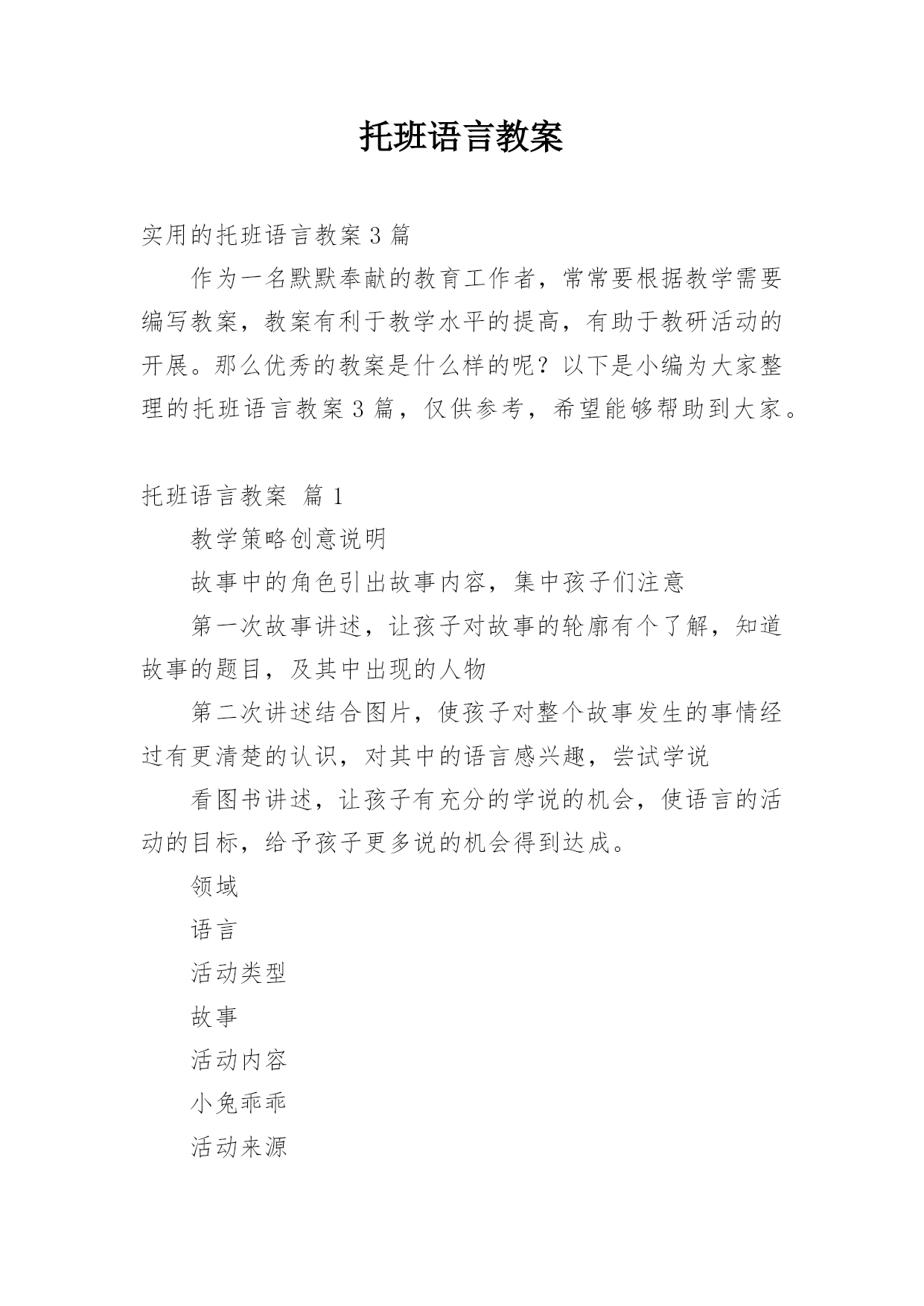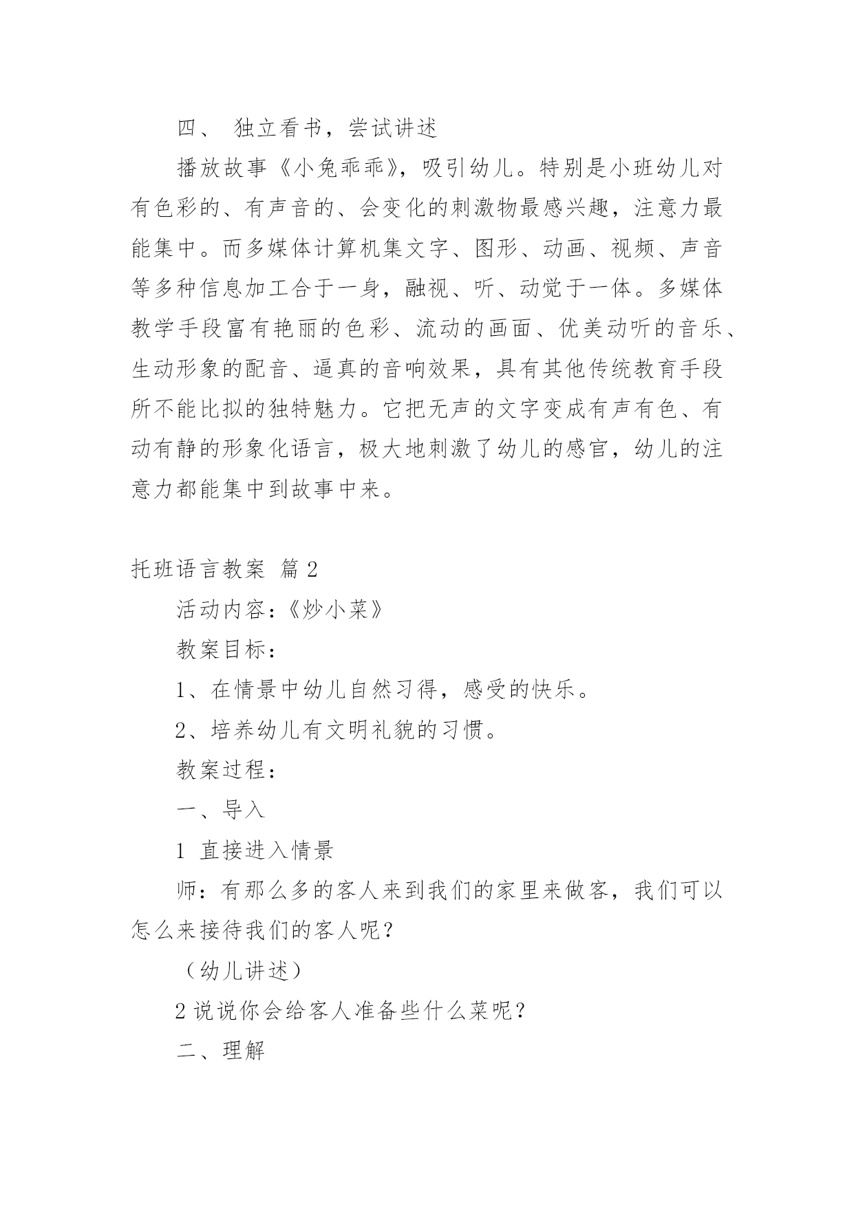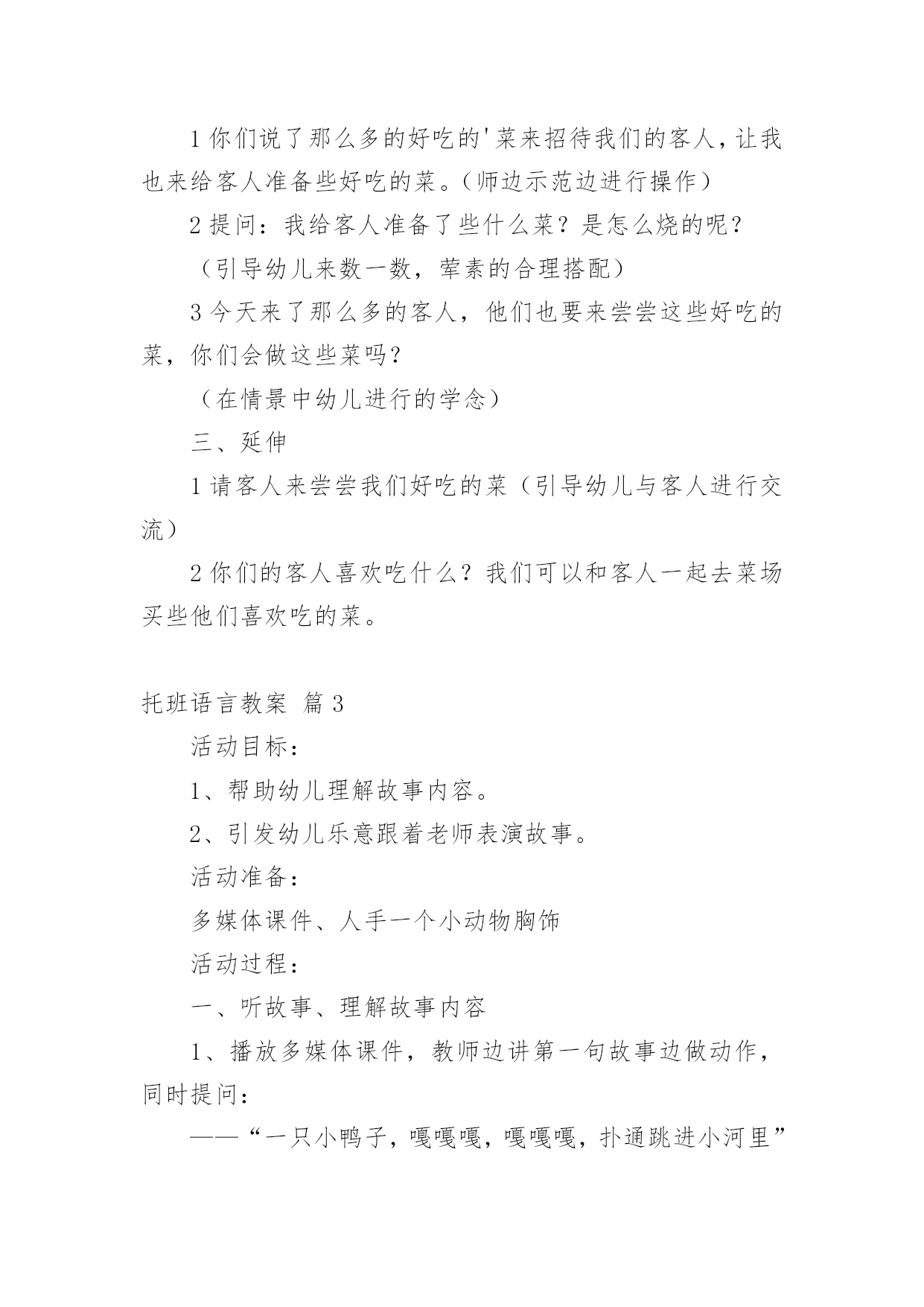 托班语言教案 实用的托班语言教案3篇作为一名默默奉献的教育工作者,常常要根据教学需要编写教案,教案有利于教学水平的提高,有助于教研活动的开展。那么优秀的教案是什么样的呢?以下是小编为大家整理的托班语言教案3篇,仅供参考,希望能够帮助到大家。托班语言教案篇1教学策略创意说明故事中的角色引出故事内容,集中孩子们注意第一次故事讲述,让孩子对故事的轮廓有个了解,知道故事的题目,及其中出现的人物第二次讲述结合图片,使孩子对整个故事发生的事情经过有更清楚的认识,对其中的语言感兴趣,尝试学说看图书讲述,让孩子有充分的学说的机会,使语言的活动的目标,给予孩子更多说的机会得到达成。领域语言活动类型故事活动内容小兔乖乖活动来源实施时间教育价值分析这是一个古老而又经典的语言教材,这个故事可能很多小朋友比较熟悉,故事的主要结构特点是情节有趣、简单,正好适合幼儿的心理需求。幼儿在安全、自我保护方面缺乏意识,而故事的`内容就是让孩子学会保护自己,独自在家的情况下,不随便让陌生人进来。活动目标1、喜欢听故事,能记住故事中的角色,初步了解小兔的基本特征;2、理解故事内容,具有初步的善恶感。活动准备活动难点图片、幼儿用书学习故事中重复的对话内容难点剖析幼儿对扮演角色还是非常感兴趣的,对话内容是故事的经典部分,语言的学习是个难点,那么先从重复的语言入手,反复学习。活动过程后续反思与调整策略一、出示头饰,引出故事二、讲述故事,进行提问三、出示挂图,再次讲述四、独立看书,尝试讲述播放故事《小兔乖乖》,吸引幼儿。特别是小班幼儿对有色彩的、有声音的、会变化的刺激物最感兴趣,注意力最能集中。而多媒体计算机集文字、图形、动画、视频、声音等多种信息加工合于一身,融视、听、动觉于一体。多媒体教学手段富有艳丽的色彩、流动的画面、优美动听的音乐、生动形象的配音、逼真的音响效果,具有其他传统教育手段所不能比拟的独特魅力。它把无声的文字变成有声有色、有动有静的形象化语言,极大地刺激了幼儿的感官,幼儿的注意力都能集中到故事中来。托班语言教案篇2活动内容:《炒小菜》教案目标:1、在情景中幼儿自然习得,感受的快乐。2、培养幼儿有文明礼貌的习惯。教案过程:一、导入1直接进入情景师:有那么多的客人来到我们的家里来做客,我们可以怎么来接待我们的客人呢?(幼儿讲述)2说说你会给客人准备些什么菜呢?二、理解1你们说了那么多的好吃的'菜来招待我们的客人,让我也来给客人准备些好吃的菜。(师边示范边进行操作)2提问:我给客人准备了些什么菜?是怎么烧的呢?(引导幼儿来数一数,荤素的合理搭配)3今天来了那么多的客人,他们也要来尝尝这些好吃的菜,你们会做这些菜吗?(在情景中幼儿进行的学念)三、延伸1请客人来尝尝我们好吃的菜(引导幼儿与客人进行交流)2你们的客人喜欢吃什么?我们可以和客人一起去菜场买些他们喜欢吃的菜。托班语言教案篇3活动目标:1、帮助幼儿理解故事内容。2、引发幼儿乐意跟着老师表演故事。活动准备:多媒体课件、人手一个小动物胸饰活动过程:一、听故事、理解故事内容1、播放多媒体课件,教师边讲第一句故事边做动作,同时提问:——“一只小鸭子,嘎嘎嘎,嘎嘎嘎,扑通跳进小河里”请问:是谁来了?来了几只?它是什么颜色的?它又是怎么叫上午呢?小鸭子呢?(鼓励幼儿用语言表达:不见了,没有了,跳进小河里等等)2、“一只小青蛙,呱呱呱,呱呱呱,扑通跳进小河里”请问:谁来了?什么颜色的'?怎么叫的?小青蛙呢?(鼓励幼儿大胆表达)3、“一只小乌龟,爬爬爬,爬爬爬,扑通跳进小河里”请问:现在是谁来了?它是怎么来的?谁来学一下?小乌龟后来到哪里去了?4、播放多媒体课件,请幼儿再次听一遍故事。二、表演故事1、现在我们来表演一下,请幼儿在座位上跟着老师边说边做动作表演。2、出示胸饰(小朋友表演得真棒,看,现在小朋友来做小动物,请幼儿将胸饰贴在胸前),老师讲故事,请表现得好的幼儿贴上胸饰上来表演。3、重复游戏一次。4、教师和幼儿边讲故事边和幼儿集体表演一遍。三、结束小动物都玩累了,口渴了,我们一起回家和牛奶吧!走出活动室。
