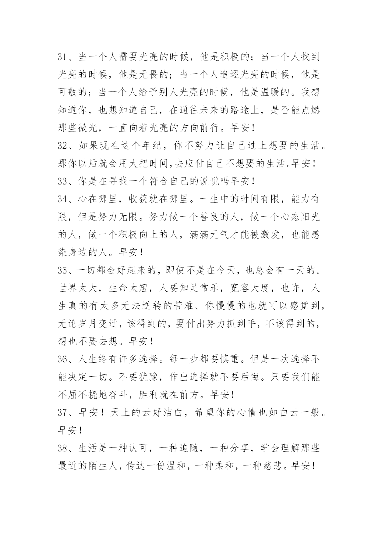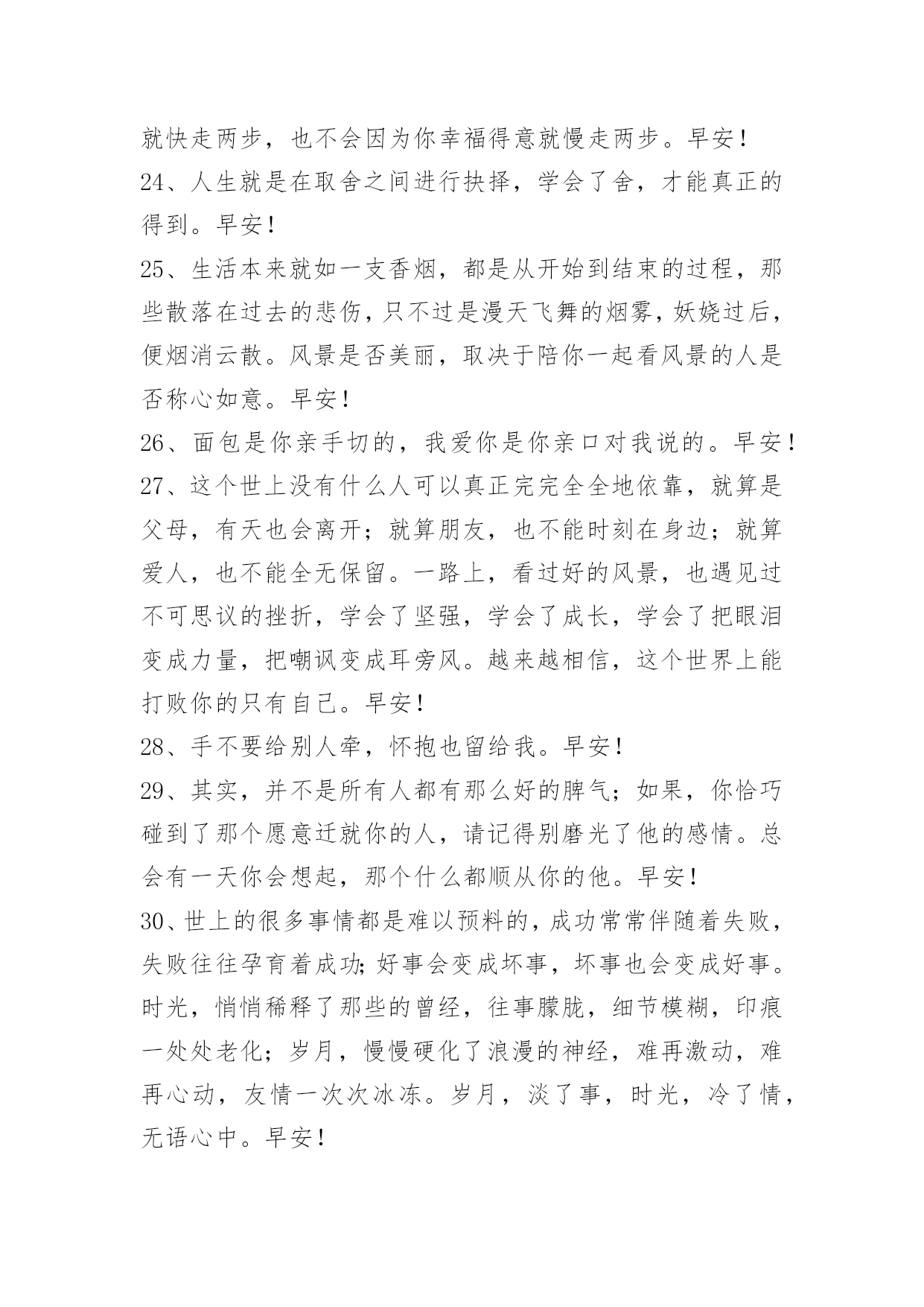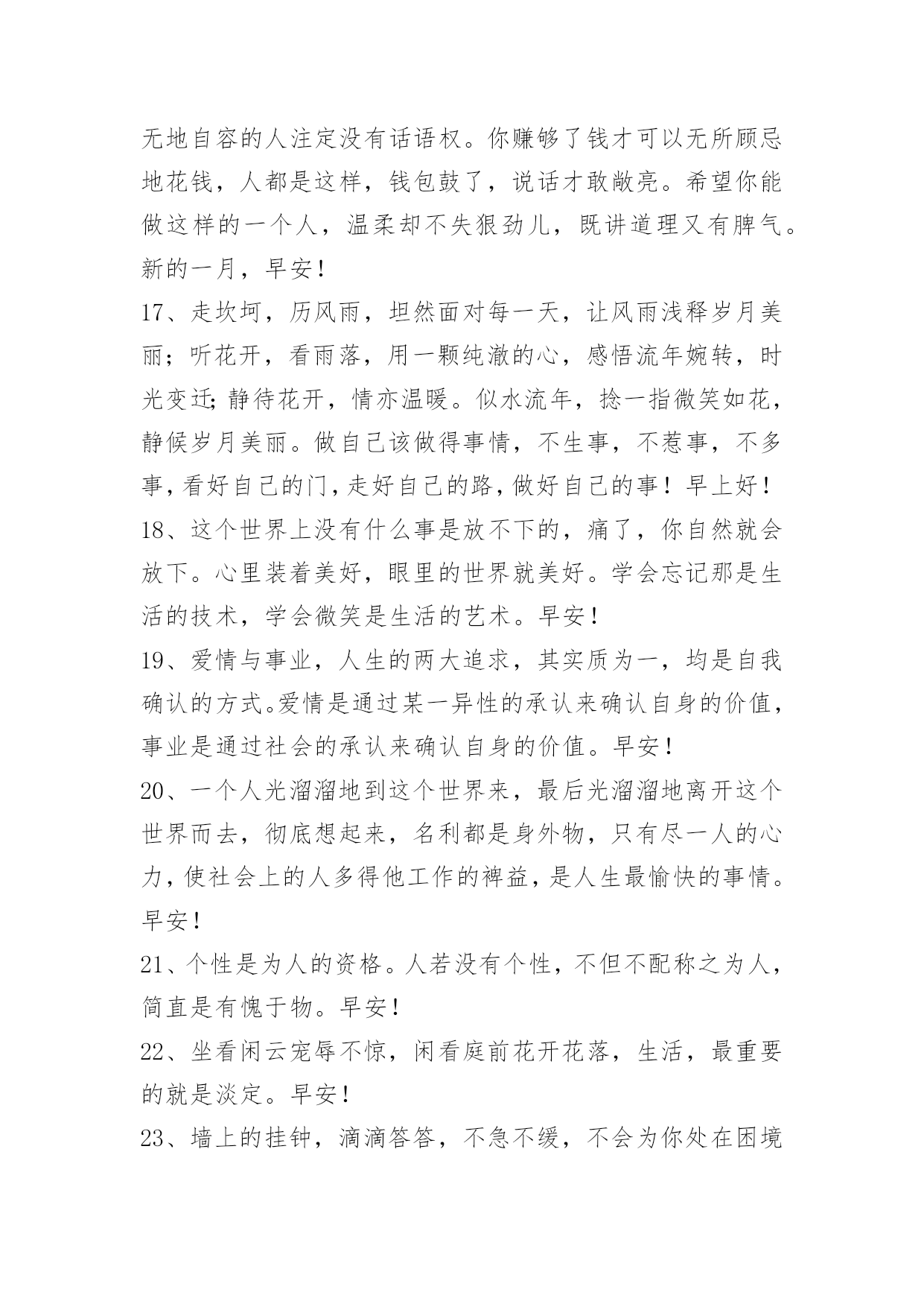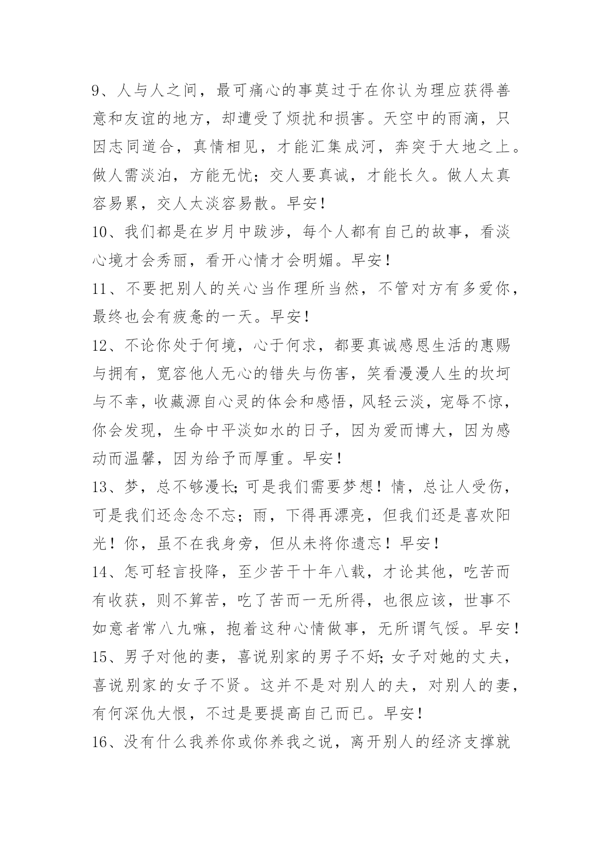 新版早安朋友圈问候语 常用新版早安朋友圈问候语48句我只知道,只有让我足够优秀,你的眼眸才会注意到我。因此,我能做的,只能让我一直努力、努力。早安!以下是小编帮大家整理的新版早安问候语48句,感兴趣的一起来看看吧。1、如果你想要成功,不要去追求成功;尽管做你自己热爱的事情并且相信它,成功自然到来。早安!2、有人大声表白,有人暗自关怀,爱的方式有千千万万种,能检验它们的,只有时间。早安!3、有时候,你得停一下脚步,等一等心灵,让心情平和,想一想自己生活中拥有的所有美好的东西。早安!4、生命在于矛盾,在于运动,一旦矛盾消除,运动停止,生命也就结束了。早安!5、专一不是一辈子只喜欢一个人,是喜欢一个人的时候一心一意、不离不弃。早安!6、我希望余生的你,能修炼五样东西,扬在脸上的自信,长在心底的善良,融进血里的骨气,清风拂面的温柔,刻进命里的坚强。早安!7、离你远去的人,是他失去了你,不是你失去了他。离开,也许是为了下个路口的更好的重逢。早安!8、不起是一种真诚,没关系是一种风度。如果你付出了真诚,却得不到风度,那只能说明对方的无知与粗俗!早安!9、人与人之间,最可痛心的事莫过于在你认为理应获得善意和友谊的地方,却遭受了烦扰和损害。天空中的雨滴,只因志同道合,真情相见,才能汇集成河,奔突于大地之上。做人需淡泊,方能无忧;交人要真诚,才能长久。做人太真容易累,交人太淡容易散。早安!10、我们都是在岁月中跋涉,每个人都有自己的故事,看淡心境才会秀丽,看开心情才会明媚。早安!11、不要把别人的关心当作理所当然,不管对方有多爱你,最终也会有疲惫的一天。早安!12、不论你处于何境,心于何求,都要真诚感恩生活的惠赐与拥有,宽容他人无心的错失与伤害,笑看漫漫人生的坎坷与不幸,收藏源自心灵的体会和感悟,风轻云淡,宠辱不惊,你会发现,生命中平淡如水的日子,因为爱而博大,因为感动而温馨,因为给予而厚重。早安!13、梦,总不够漫长;可是我们需要梦想!情,总让人受伤,可是我们还念念不忘;雨,下得再漂亮,但我们还是喜欢阳光!你,虽不在我身旁,但从未将你遗忘!早安!14、怎可轻言投降,至少苦干十年八载,才论其他,吃苦而有收获,则不算苦,吃了苦而一无所得,也很应该,世事不如意者常八九嘛,抱着这种心情做事,无所谓气馁。早安!15、男子对他的妻,喜说别家的男子不好;女子对她的丈夫,喜说别家的女子不贤。这并不是对别人的夫,对别人的妻,有何深仇大恨,不过是要提高自己而已。早安!16、没有什么我养你或你养我之说,离开别人的经济支撑就无地自容的人注定没有话语权。你赚够了钱才可以无所顾忌地花钱,人都是这样,钱包鼓了,说话才敢敞亮。希望你能做这样的一个人,温柔却不失狠劲儿,既讲道理又有脾气。新的一月,早安!17、走坎坷,历风雨,坦然面对每一天,让风雨浅释岁月美丽;听花开,看雨落,用一颗纯澈的心,感悟流年婉转,时光变迁;静待花开,情亦温暖。似水流年,捻一指微笑如花,静候岁月美丽。做自己该做得事情,不生事,不惹事,不多事,看好自己的门,走好自己的路,做好自己的事!早上好!18、这个世界上没有什么事是放不下的,痛了,你自然就会放下。心里装着美好,眼里的世界就美好。学会忘记那是生活的技术,学会微笑是生活的艺术。早安!19、爱情与事业,人生的两大追求,其实质为一,均是自我确认的方式。爱情是通过某一异性的承认来确认自身的价值,事业是通过社会的承认来确认自身的价值。早安!20、一个人光溜溜地到这个世界来,最后光溜溜地离开这个世界而去,彻底想起来,名利都是身外物,只有尽一人的心力,使社会上的人多得他工作的裨益,是人生最愉快的事情。早安!21、个性是为人的资格。人若没有个性,不但不配称之为人,简直是有愧于物。早安!22、坐看闲云宠辱不惊,闲看庭前花开花落,生活,最重要的就是淡定。早安!23、墙上的挂钟,滴滴答答,不急不缓,不会为你处在困境就快走两步,也不会因为你幸福得意就慢走两步。早安!24、人生就是在取舍之间进行抉择,学会了舍,才能真正的得到。早安!25、生活本来就如一支香烟,都是从开始到结束的过程,那些散落在过去的悲伤,只不过是漫天飞舞的烟雾,妖娆过后,便烟消云散。风景是否美丽,取决于陪你一起看风景的人是否称心如意。早安!26、面包是你亲手切的,我爱你是你亲口对我说的。早安!27、这个世上没有什么人可以真正完完全全地依靠,就算是父母,有天也会离开;就算朋友,也不能时刻在身边;就算爱人,也不能全无保留。一路上,看过好的风景,也遇见过不可思议的挫折,学会了坚强,学会了成长,学会了把眼泪变成力量,把嘲讽变成耳旁风。越来越相信,这个世界上能打败你的只有自己。早安!28、手不要给别人牵,怀抱也留给我。早安!29、其实,并不是所有人都有那么好的脾气;如果,你恰巧碰到了那个愿意迁就你的人,请记得别磨光了他
