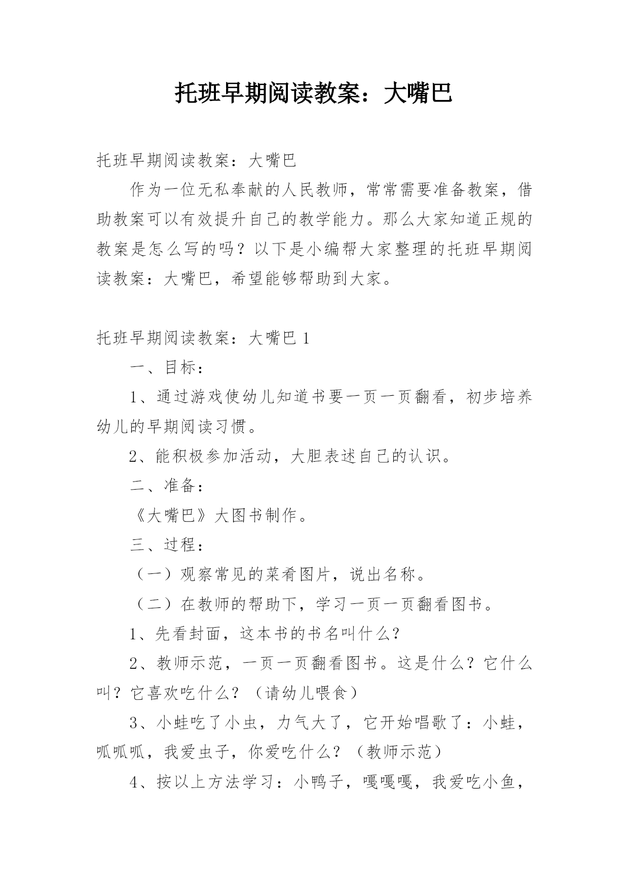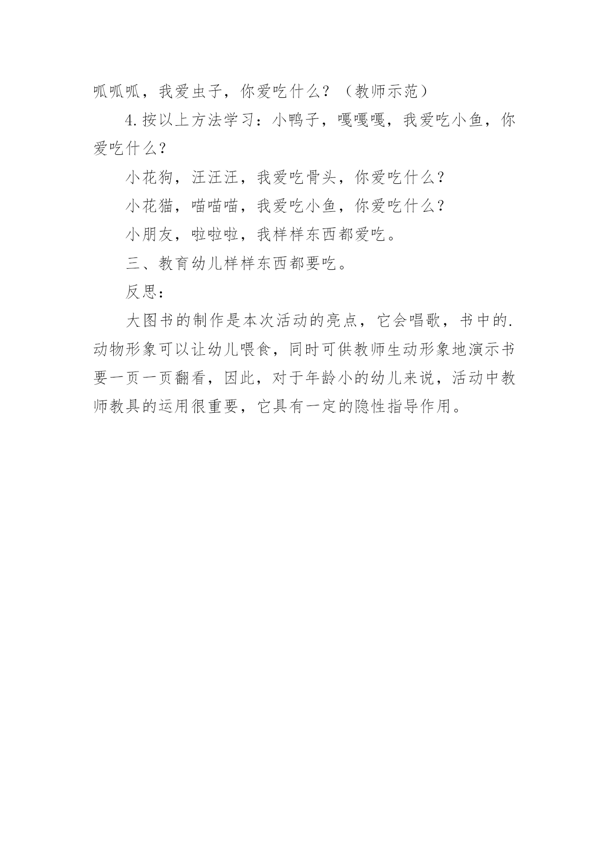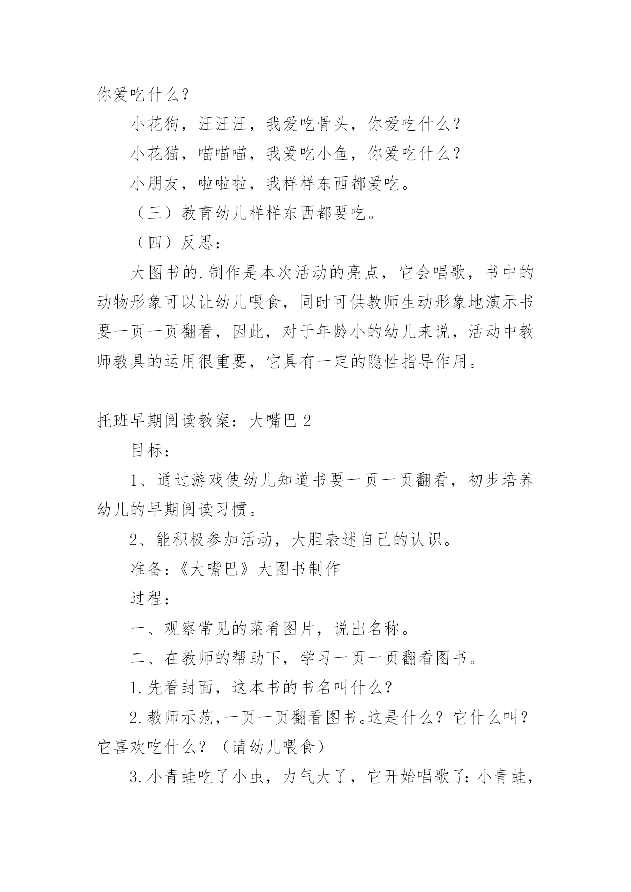 托班早期阅读教案:大嘴巴 托班早期阅读教案:大嘴巴作为一位无私奉献的人民教师,常常需要准备教案,借助教案可以有效提升自己的教学能力。那么大家知道正规的教案是怎么写的吗?以下是小编帮大家整理的托班早期阅读教案:大嘴巴,希望能够帮助到大家。托班早期阅读教案:大嘴巴1一、目标:1、通过游戏使幼儿知道书要一页一页翻看,初步培养幼儿的早期阅读习惯。2、能积极参加活动,大胆表述自己的认识。二、准备:《大嘴巴》大图书制作。三、过程:(一)观察常见的菜肴图片,说出名称。(二)在教师的帮助下,学习一页一页翻看图书。1、先看封面,这本书的书名叫什么?2、教师示范,一页一页翻看图书。这是什么?它什么叫?它喜欢吃什么?(请幼儿喂食)3、小蛙吃了小虫,力气大了,它开始唱歌了:小蛙,呱呱呱,我爱虫子,你爱吃什么?(教师示范)4、按以上方法学习:小鸭子,嘎嘎嘎,我爱吃小鱼,你爱吃什么?小花狗,汪汪汪,我爱吃骨头,你爱吃什么?小花猫,喵喵喵,我爱吃小鱼,你爱吃什么?小朋友,啦啦啦,我样样东西都爱吃。(三)教育幼儿样样东西都要吃。(四)反思:大图书的.制作是本次活动的亮点,它会唱歌,书中的动物形象可以让幼儿喂食,同时可供教师生动形象地演示书要一页一页翻看,因此,对于年龄小的幼儿来说,活动中教师教具的运用很重要,它具有一定的隐性指导作用。托班早期阅读教案:大嘴巴2目标:1、通过游戏使幼儿知道书要一页一页翻看,初步培养幼儿的早期阅读习惯。2、能积极参加活动,大胆表述自己的认识。准备:《大嘴巴》大图书制作过程:一、观察常见的菜肴图片,说出名称。二、在教师的帮助下,学习一页一页翻看图书。1.先看封面,这本书的书名叫什么?2.教师示范,一页一页翻看图书。这是什么?它什么叫?它喜欢吃什么?(请幼儿喂食)3.小青蛙吃了小虫,力气大了,它开始唱歌了:小青蛙,呱呱呱,我爱虫子,你爱吃什么?(教师示范)4.按以上方法学习:小鸭子,嘎嘎嘎,我爱吃小鱼,你爱吃什么?小花狗,汪汪汪,我爱吃骨头,你爱吃什么?小花猫,喵喵喵,我爱吃小鱼,你爱吃什么?小朋友,啦啦啦,我样样东西都爱吃。三、教育幼儿样样东西都要吃。反思:大图书的制作是本次活动的亮点,它会唱歌,书中的.动物形象可以让幼儿喂食,同时可供教师生动形象地演示书要一页一页翻看,因此,对于年龄小的幼儿来说,活动中教师教具的运用很重要,它具有一定的隐性指导作用。