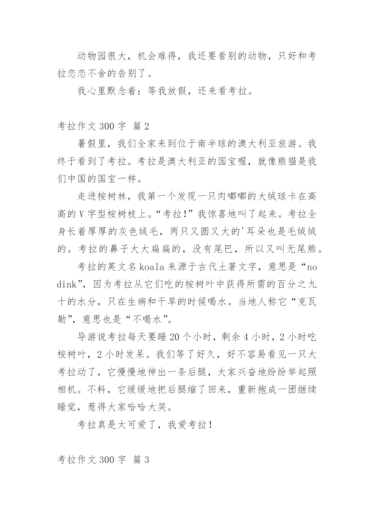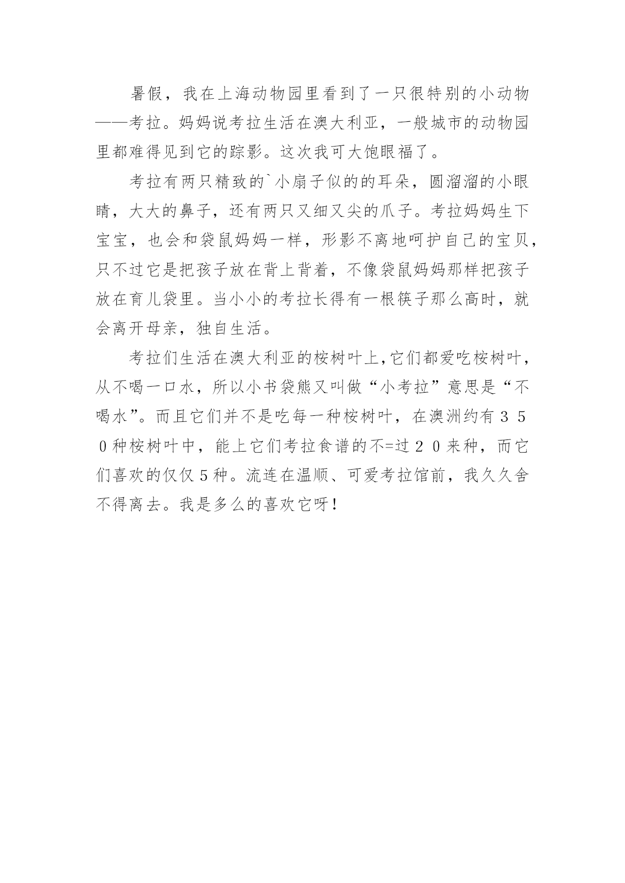 考拉作文300字 精选考拉作文300字3篇在平日的学习、工作和生活里,大家总少不了接触作文吧,借助作文人们可以反映客观事物、表达思想感情、传递知识信息。相信许多人会觉得作文很难写吧,下面是小编帮大家整理的考拉作文300字3篇,欢迎大家分享。考拉作文300字篇1今天,我和姑姑来到动物园,看到了许多的动物。在我的印象里,最有趣的就是动物考拉……它的原名是树袋熊。它喜欢吃有毒的桉树叶。听到有小姐说:“树袋熊还有一个特别的称号:树懒熊”。它每天要睡18个小时。似乎怎么也睡不够。及时醒来也不愿意多活动。假如实在有事情需要走动。它们的步子也是慢吞吞的,导游姐姐又说:“考拉源于土著的文字是不喝水的意思”。树袋熊长着两只大耳朵。脸圆圆的,脑袋也是圆形的。眼睛大大的.像葡萄一样。它疑惑的看着我,像作文是在说:“你是谁?我怎么从来没见过你?’”萌萌的样子真是可爱!导游姐姐告诉了我一个特别令人激动的消息:我们可以去喂树袋熊。我迫不及待地拿起来一筐的桉树叶。跑向了考拉,我举着一片叶子递给它,它就会慢慢的吃掉了桉树叶,看起来吃的好香好香。慢慢的享受美食。一会的功夫,我把一整筐的叶子都喂完了,可是,我还是舍不得离开它。动物园很大,机会难得,我还要看别的动物,只好和考拉恋恋不舍的告别了。我心里默念着:等我放假,还来看考拉。考拉作文300字篇2暑假里,我们全家来到位于南半球的澳大利亚旅游。我终于看到了考拉。考拉是澳大利亚的国宝喔,就像熊猫是我们中国的国宝一样。走进桉树林,我第一个发现一只肉嘟嘟的大绒球卡在高高的V字型桉树枝上。“考拉!”我惊喜地叫了起来。考拉全身长着厚厚的灰色绒毛,两只又圆又大的'耳朵也是毛绒绒的。考拉的鼻子大大扁扁的,没有尾巴,所以又叫无尾熊。考拉的英文名koala来源于古代土著文字,意思是“nodink”,因为考拉从它们吃的桉树叶中获得所需的百分之九十的水分,只在生病和干旱的时候喝水。当地人称它“克瓦勒”,意思也是“不喝水”。导游说考拉每天要睡20个小时,剩余4小时,2小时吃桉树叶,2小时发呆。我们等了好久,好不容易看见一只大考拉动了,它慢慢地伸出一条后腿,大家兴奋地纷纷举起照相机。不料,它缓缓地把后腿缩了回来,重新抱成一团继续睡觉,惹得大家哈哈大笑。考拉真是太可爱了,我爱考拉!考拉作文300字篇3暑假,我在上海动物园里看到了一只很特别的小动物——考拉。妈妈说考拉生活在澳大利亚,一般城市的动物园里都难得见到它的踪影。这次我可大饱眼福了。考拉有两只精致的`小扇子似的的耳朵,圆溜溜的小眼睛,大大的鼻子,还有两只又细又尖的爪子。考拉妈妈生下宝宝,也会和袋鼠妈妈一样,形影不离地呵护自己的宝贝,只不过它是把孩子放在背上背着,不像袋鼠妈妈那样把孩子放在育儿袋里。当小小的考拉长得有一根筷子那么高时,就会离开母亲,独自生活。考拉们生活在澳大利亚的桉树叶上,它们都爱吃桉树叶,从不喝一口水,所以小书袋熊又叫做“小考拉”意思是“不喝水”。而且它们并不是吃每一种桉树叶,在澳洲约有350种桉树叶中,能上它们考拉食谱的不=过20来种,而它们喜欢的仅仅5种。流连在温顺、可爱考拉馆前,我久久舍不得离去。我是多么的喜欢它呀!