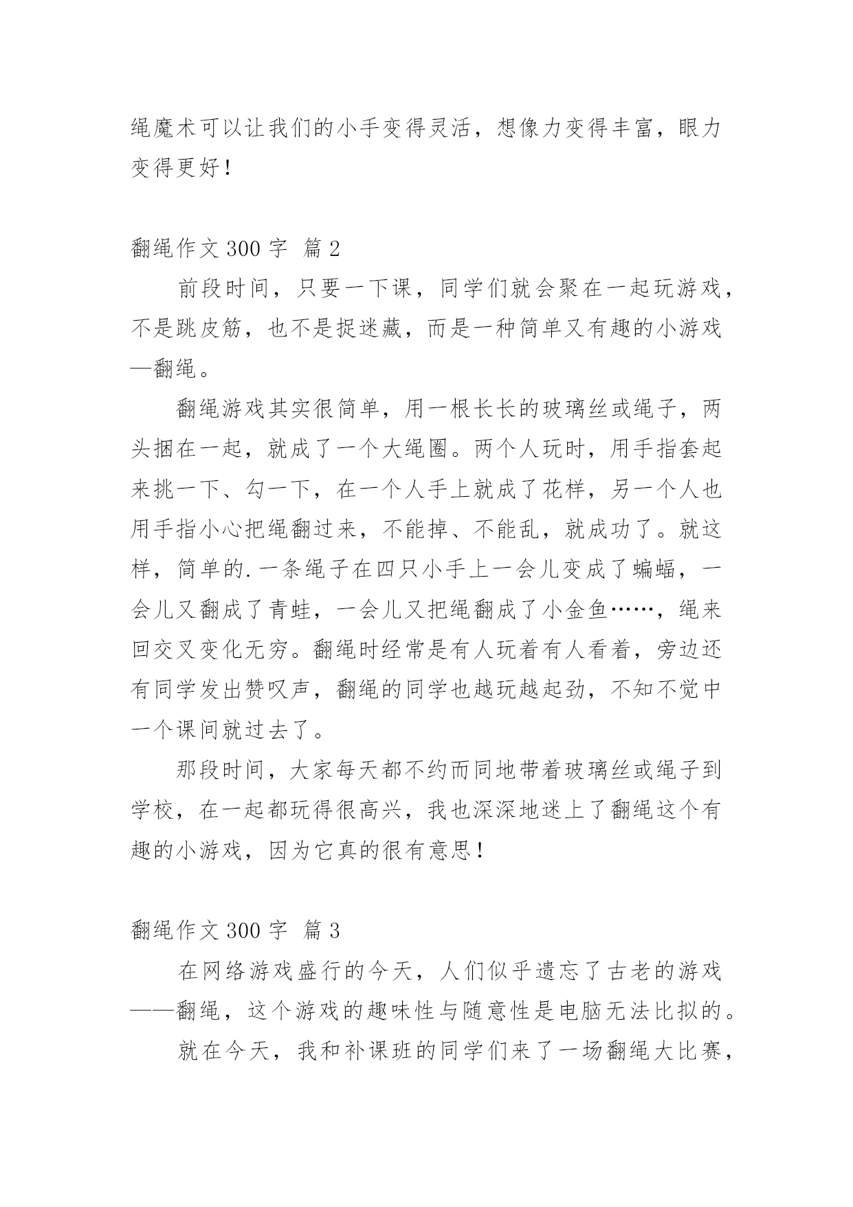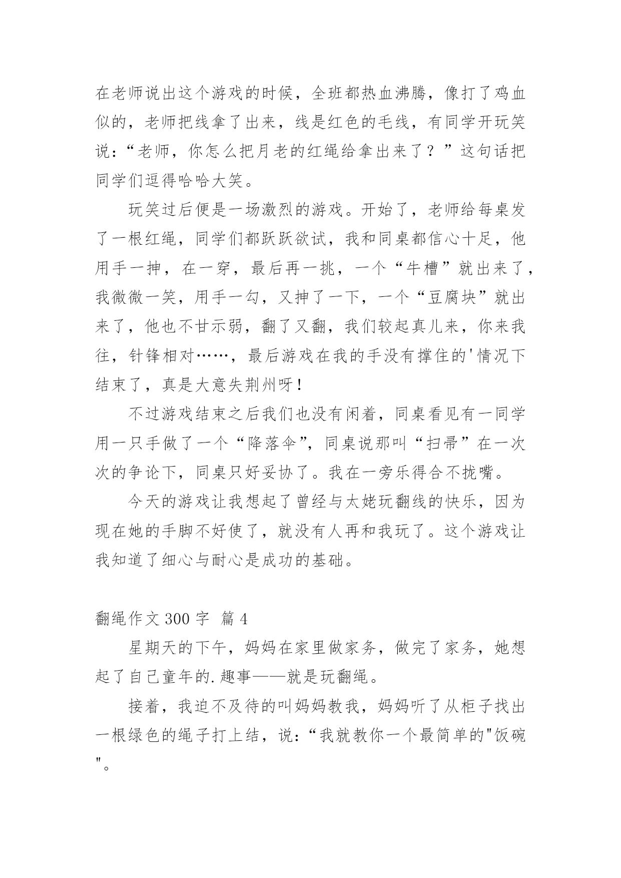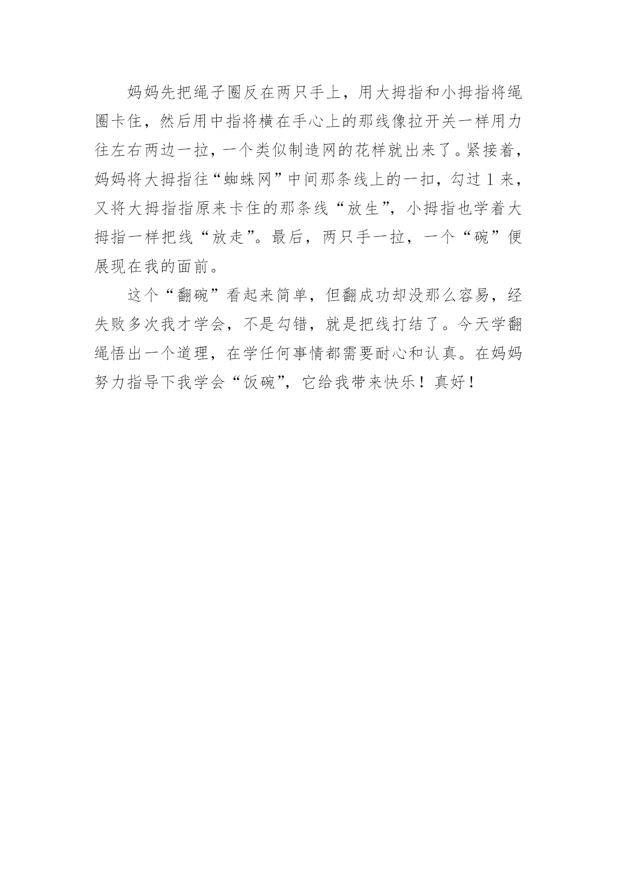 翻绳作文300字 精选翻绳作文300字四篇在日常学习、工作或生活中,大家都写过作文吧,作文是经过人的思想考虑和语言组织,通过文字来表达一个主题意义的记叙方法。作文的注意事项有许多,你确定会写吗?以下是小编收集整理的翻绳作文300字4篇,欢迎大家借鉴与参考,希望对大家有所帮助。翻绳作文300字篇1今天写作课上,董老师说要变一个魔术,一听要变魔术,教室里一下子炸开了锅,同学们乐得像捡到宝贝似的。我们有的半信半疑,想:老师怎么会变魔术;有的不相信;还有的开心地在地上直跳。魔术开始了,老师先从袋子里神秘地抽出一根又细又长的绳子,再把它对折,打了结。然后把绳子架在手上,又把左手绕过右手中的绳子,把右手又绕过左手中的绳子。接着把左手的中指绕在右手中的绳线上,又从右手的中指绕在左手中的.绳线上。只见,老师叫到的小女孩上去把老师的线一挑,变成了一张渔网、一张蹦床。她再一挑,变成了飞机、铁轨、五角星,真有趣!小女孩又一挑,绳线变成了饼干,太神奇了!老师让我们同桌搭配,我和佳安都说实在是太简单了,可是让我们自己做却都不会做了,做了几次才做成功。这次的写作课我很开心,下次我还要再玩翻绳魔术。翻绳魔术可以让我们的小手变得灵活,想像力变得丰富,眼力变得更好!翻绳作文300字篇2前段时间,只要一下课,同学们就会聚在一起玩游戏,不是跳皮筋,也不是捉迷藏,而是一种简单又有趣的小游戏—翻绳。翻绳游戏其实很简单,用一根长长的玻璃丝或绳子,两头捆在一起,就成了一个大绳圈。两个人玩时,用手指套起来挑一下、勾一下,在一个人手上就成了花样,另一个人也用手指小心把绳翻过来,不能掉、不能乱,就成功了。就这样,简单的.一条绳子在四只小手上一会儿变成了蝙蝠,一会儿又翻成了青蛙,一会儿又把绳翻成了小金鱼……,绳来回交叉变化无穷。翻绳时经常是有人玩着有人看着,旁边还有同学发出赞叹声,翻绳的同学也越玩越起劲,不知不觉中一个课间就过去了。那段时间,大家每天都不约而同地带着玻璃丝或绳子到学校,在一起都玩得很高兴,我也深深地迷上了翻绳这个有趣的小游戏,因为它真的很有意思!翻绳作文300字篇3在网络游戏盛行的今天,人们似乎遗忘了古老的游戏——翻绳,这个游戏的趣味性与随意性是电脑无法比拟的。就在今天,我和补课班的同学们来了一场翻绳大比赛,在老师说出这个游戏的时候,全班都热血沸腾,像打了鸡血似的,老师把线拿了出来,线是红色的毛线,有同学开玩笑说:“老师,你怎么把月老的红绳给拿出来了?”这句话把同学们逗得哈哈大笑。玩笑过后便是一场激烈的游戏。开始了,老师给每桌发了一根红绳,同学们都跃跃欲试,我和同桌都信心十足,他用手一抻,在一穿,最后再一挑,一个“牛槽”就出来了,我微微一笑,用手一勾,又抻了一下,一个“豆腐块”就出来了,他也不甘示弱,翻了又翻,我们较起真儿来,你来我往,针锋相对……,最后游戏在我的手没有撑住的'情况下结束了,真是大意失荆州呀!不过游戏结束之后我们也没有闲着,同桌看见有一同学用一只手做了一个“降落伞”,同桌说那叫“扫帚”在一次次的争论下,同桌只好妥协了。我在一旁乐得合不拢嘴。今天的游戏让我想起了曾经与太姥玩翻线的快乐,因为现在她的手脚不好使了,就没有人再和我玩了。这个游戏让我知道了细心与耐心是成功的基础。翻绳作文300字篇4星期天的下午,妈妈在家里做家务,做完了家务,她想起了自己童年的.趣事——就是玩翻绳。接着,我迫不及待的叫妈妈教我,妈妈听了从柜子找出一根绿色的绳子打上结,说:“我就教你一个最简单的"饭碗"。妈妈先把绳子圈反在两只手上,用大拇指和小拇指将绳圈卡住,然后用中指将横在手心上的那线像拉开关一样用力往左右两边一拉,一个类似制造网的花样就出来了。紧接着,妈妈将大拇指往“蜘蛛网”中间那条线上的一扣,勾过l来,又将大拇指指原来卡住的那条线“放生”,小拇指也学着大拇指一样把线“放走”。最后,两只手一拉,一个“碗”便展现在我的面前。这个“翻碗”看起来简单,但翻成功却没那么容易,经失败多次我才学会,不是勾错,就是把线打结了。今天学翻绳悟出一个道理,在学任何事情都需要耐心和认真。在妈妈努力指导下我学会“饭碗”,它给我带来快乐!真好!