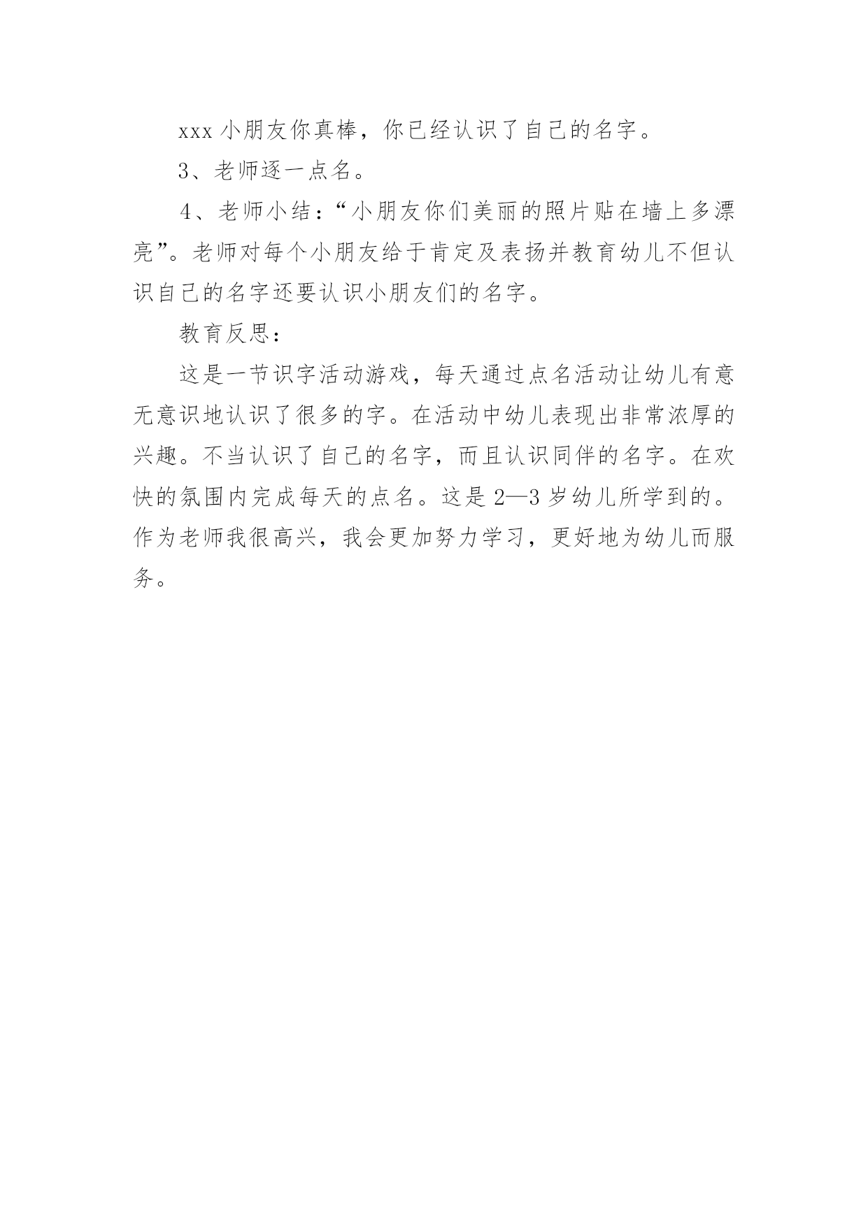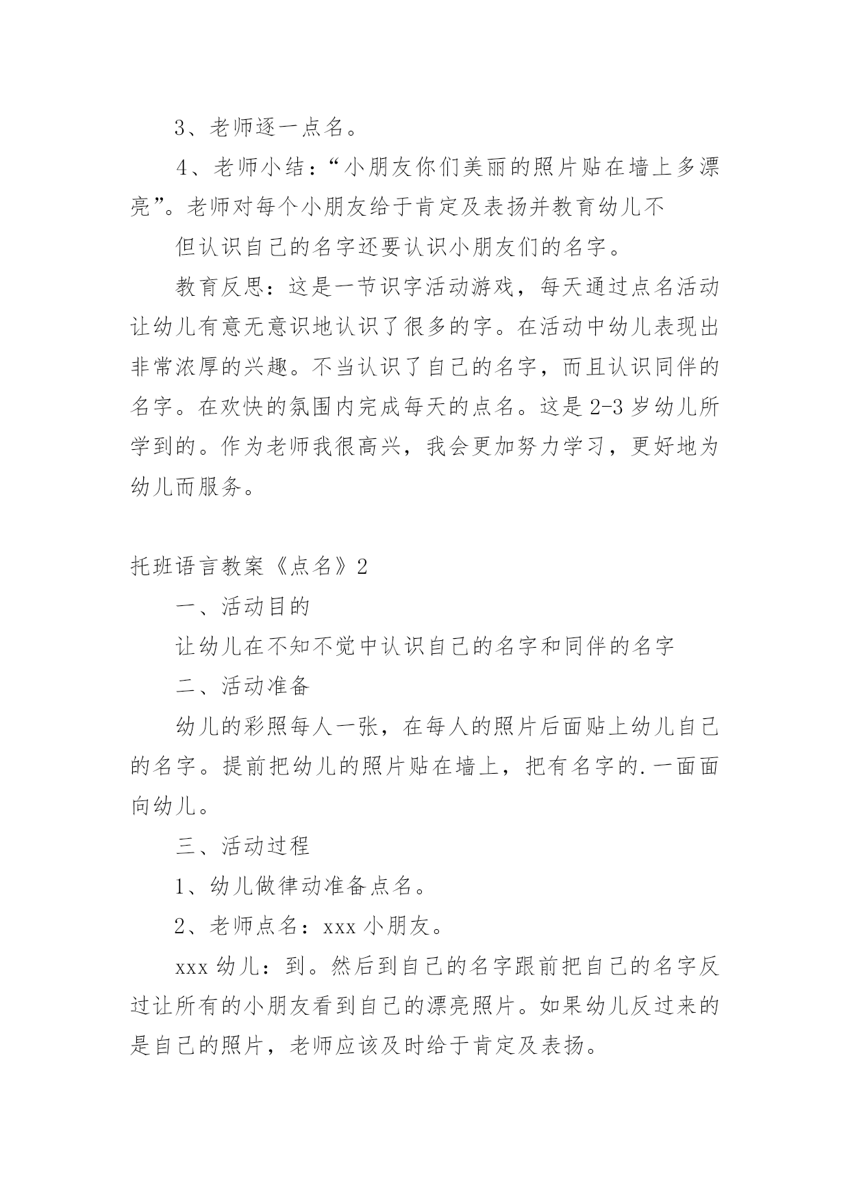 托班语言教案《点名》 托班语言教案《点名》作为一位杰出的老师,编写教案是必不可少的,借助教案可以更好地组织教学活动。教案应该怎么写呢?以下是小编为大家整理的托班语言教案《点名》,仅供参考,大家一起来看看吧。托班语言教案《点名》1一、目的让幼儿在不知不觉中认识自己的名字和同伴的名字。二、教学准备幼儿的彩照每人一张,在每人的照片后面贴上幼儿自己的名字。提前把幼儿的照片贴在墙上,把有名字的一面面向幼儿。三、教学过程1、幼儿做律动准备点名。2、老师点名:XXX小朋友。XXX幼儿:到。然后到自己的名字跟前把自己的'名字反过让所有的小朋友看到自己的漂亮照片。如果幼儿反过来的是自己的照片,老师应该及时给于肯定及表扬。XXX小朋友你真棒,你已经认识了自己的名字。3、老师逐一点名。4、老师小结:“小朋友你们美丽的照片贴在墙上多漂亮”。老师对每个小朋友给于肯定及表扬并教育幼儿不但认识自己的名字还要认识小朋友们的名字。教育反思:这是一节识字活动游戏,每天通过点名活动让幼儿有意无意识地认识了很多的字。在活动中幼儿表现出非常浓厚的兴趣。不当认识了自己的名字,而且认识同伴的名字。在欢快的氛围内完成每天的点名。这是2-3岁幼儿所学到的。作为老师我很高兴,我会更加努力学习,更好地为幼儿而服务。托班语言教案《点名》2一、活动目的让幼儿在不知不觉中认识自己的名字和同伴的名字二、活动准备幼儿的彩照每人一张,在每人的照片后面贴上幼儿自己的名字。提前把幼儿的照片贴在墙上,把有名字的.一面面向幼儿。三、活动过程1、幼儿做律动准备点名。2、老师点名:xxx小朋友。xxx幼儿:到。然后到自己的名字跟前把自己的名字反过让所有的小朋友看到自己的漂亮照片。如果幼儿反过来的是自己的照片,老师应该及时给于肯定及表扬。xxx小朋友你真棒,你已经认识了自己的名字。3、老师逐一点名。4、老师小结:“小朋友你们美丽的照片贴在墙上多漂亮”。老师对每个小朋友给于肯定及表扬并教育幼儿不但认识自己的名字还要认识小朋友们的名字。教育反思:这是一节识字活动游戏,每天通过点名活动让幼儿有意无意识地认识了很多的字。在活动中幼儿表现出非常浓厚的兴趣。不当认识了自己的名字,而且认识同伴的名字。在欢快的氛围内完成每天的点名。这是2—3岁幼儿所学到的。作为老师我很高兴,我会更加努力学习,更好地为幼儿而服务。