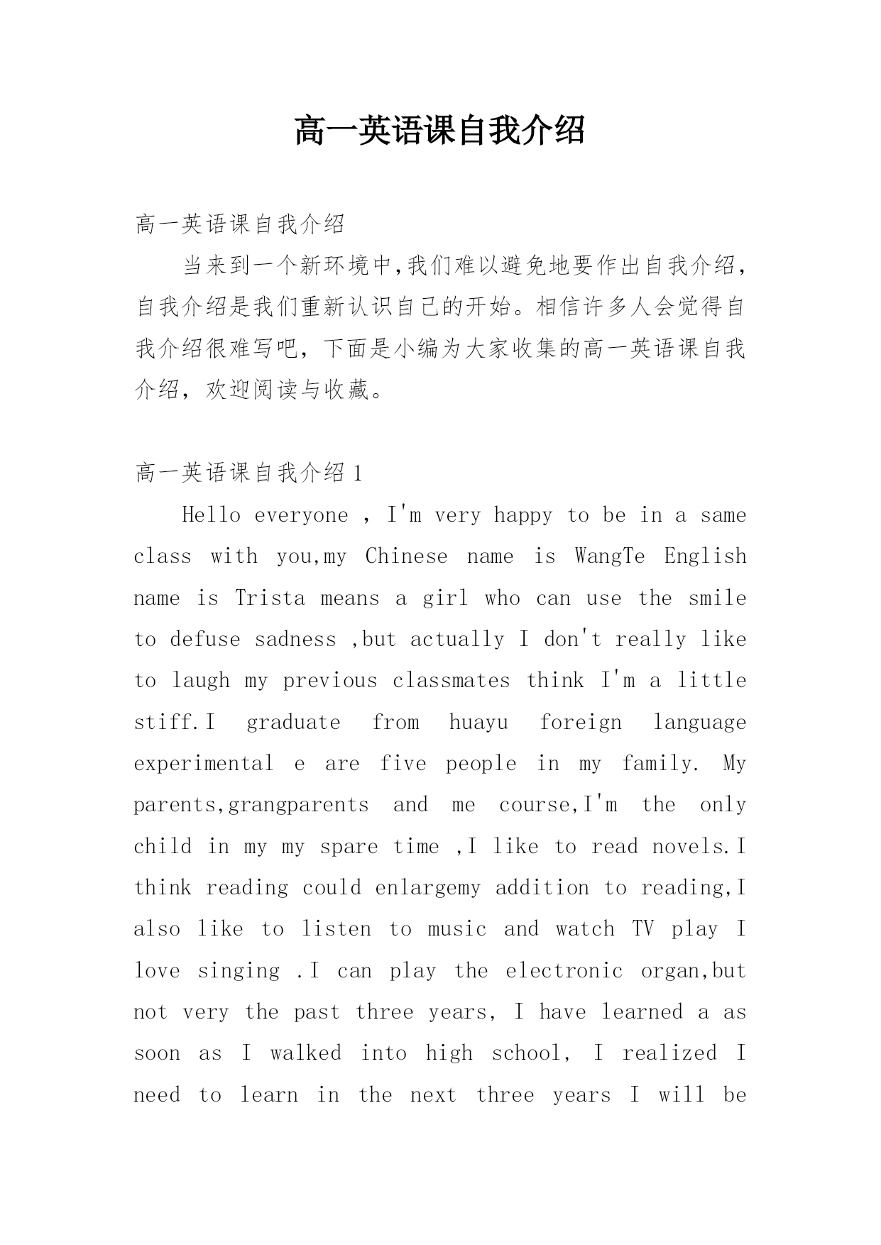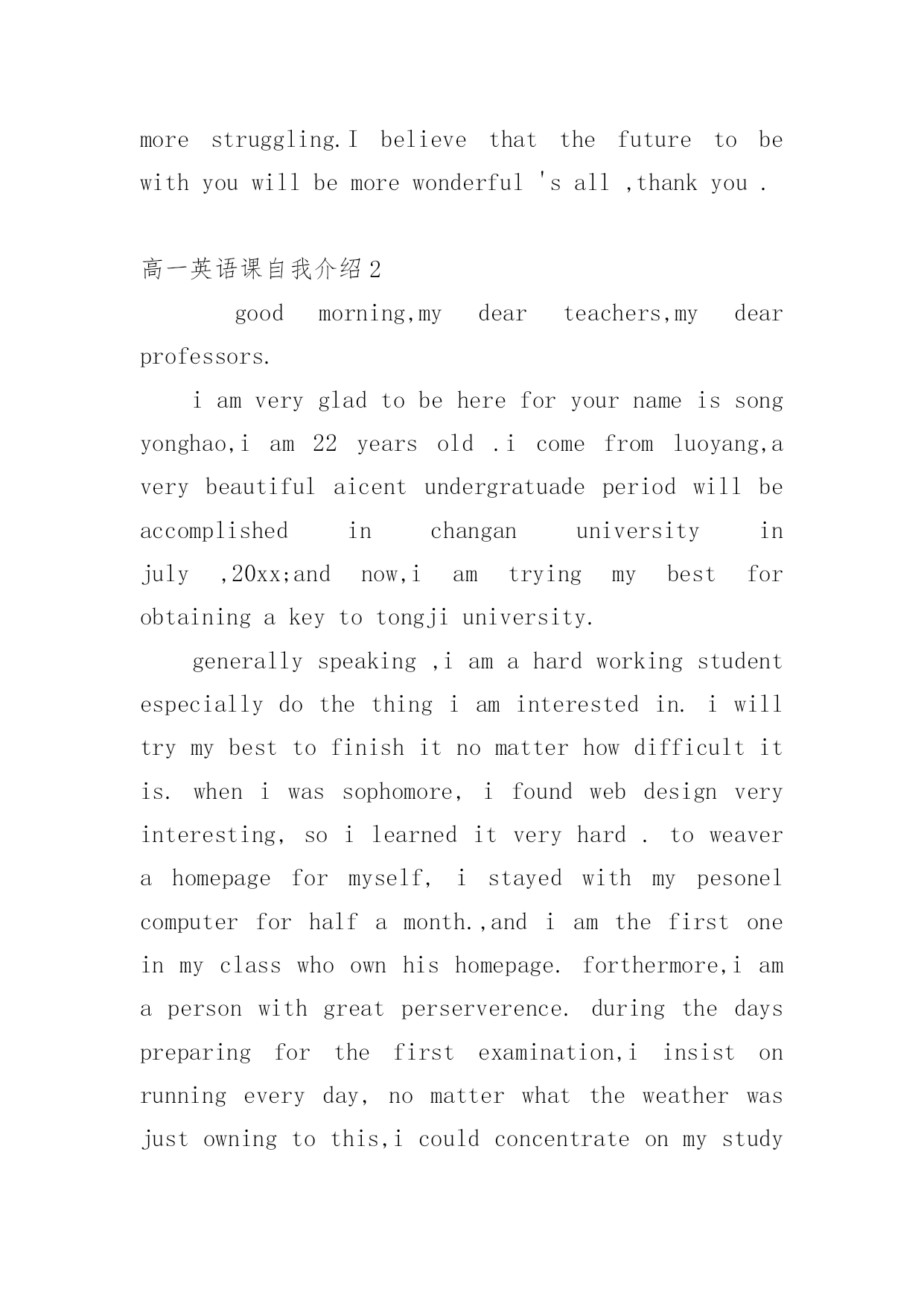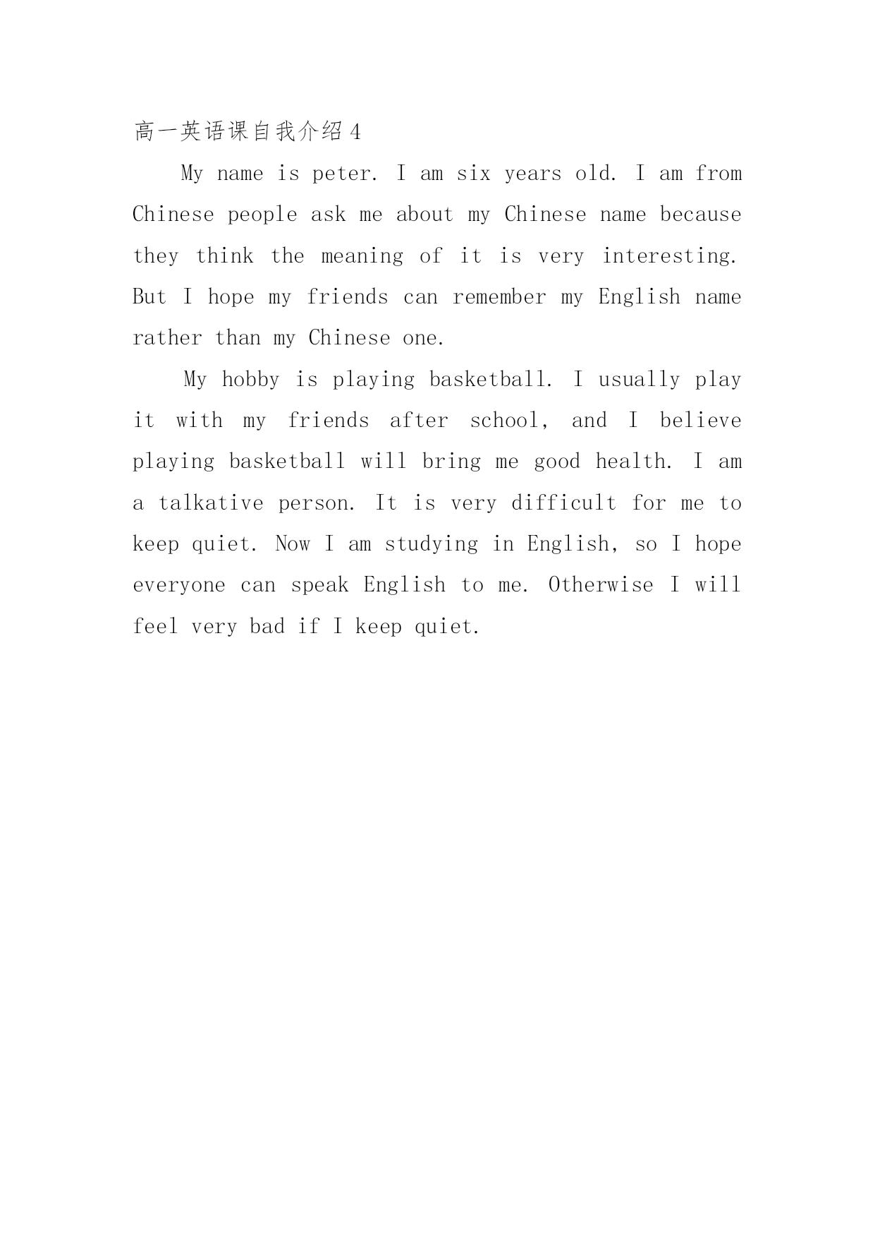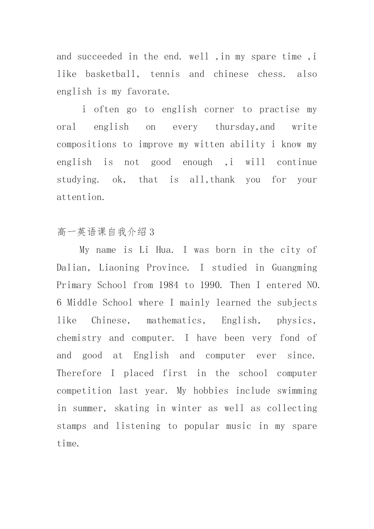 高一英语课自我介绍 高一英语课自我介绍当来到一个新环境中,我们难以避免地要作出自我介绍,自我介绍是我们重新认识自己的开始。相信许多人会觉得自我介绍很难写吧,下面是小编为大家收集的高一英语课自我介绍,欢迎阅读与收藏。高一英语课自我介绍1Helloeveryone,I'mveryhappytobeinasameclasswithyou,myChinesenameisWangTeEnglishnameisTristameansagirlwhocanusethesmiletodefusesadness,butactuallyIdon'treallyliketolaughmypreviousclassmatesthinkI'malittlestiff.Igraduatefromhuayuforeignlanguageexperimentalearefivepeopleinmyfamily.Myparents,grangparentsandmecourse,I'mtheonlychildinmymysparetime,Iliketoreadnovels.Ithinkreadingcouldenlargemyadditiontoreading,IalsoliketolistentomusicandwatchTVplayIlovesinging.Icanplaytheelectronicorgan,butnotverythepastthreeyears,IhavelearnedaassoonasIwalkedintohighschool,IrealizedIneedtolearninthenextthreeyearsIwillbemorestruggling.Ibelievethatthefuturetobewithyouwillbemorewonderful'sall,thankyou.高一英语课自我介绍2goodmorning,mydearteachers,mydearprofessors.iamverygladtobehereforyournameissongyonghao,iam22yearsold.icomefromluoyang,averybeautifulaicentundergratuadeperiodwillbeaccomplishedinchanganuniversityinjuly,20xx;andnow,iamtryingmybestforobtainingakeytotongjiuniversity.generallyspeaking,iamahardworkingstudentespeciallydothethingiaminterestedin.iwilltrymybesttofinishitnomatterhowdifficultitis.wheniwassophomore,ifoundwebdesignveryinteresting,soilearneditveryhard.toweaverahomepageformyself,istayedwithmypesonelcomputerforhalfamonth.,andiamthefirstoneinmyclasswhoownhishomepage.forthermore,iamapersonwithgreatperserverence.duringthedayspreparingforthefirstexamination,iinsistonrunningeveryday,nomatterwhattheweatherwasjustowningtothis,icouldconcentrateonmystudyandsucceededintheend.well,inmysparetime,ilikebasketball,tennisandchinesechess.alsoenglishismyfavorate.ioftengotoenglishcornertopractisemyoralenglishoneverythursday,andwritecompositionstoimprovemywittenabilityiknowmyenglishisnotgoodenough,iwillcontinuestudying.ok,thatisall,thankyouforyourattention.高一英语课自我介绍3MynameisLiHua.IwasborninthecityofDalian,LiaoningProvince.IstudiedinGuangmingPrimarySchoolfrom1984to1990.ThenIenteredNO.6Middl