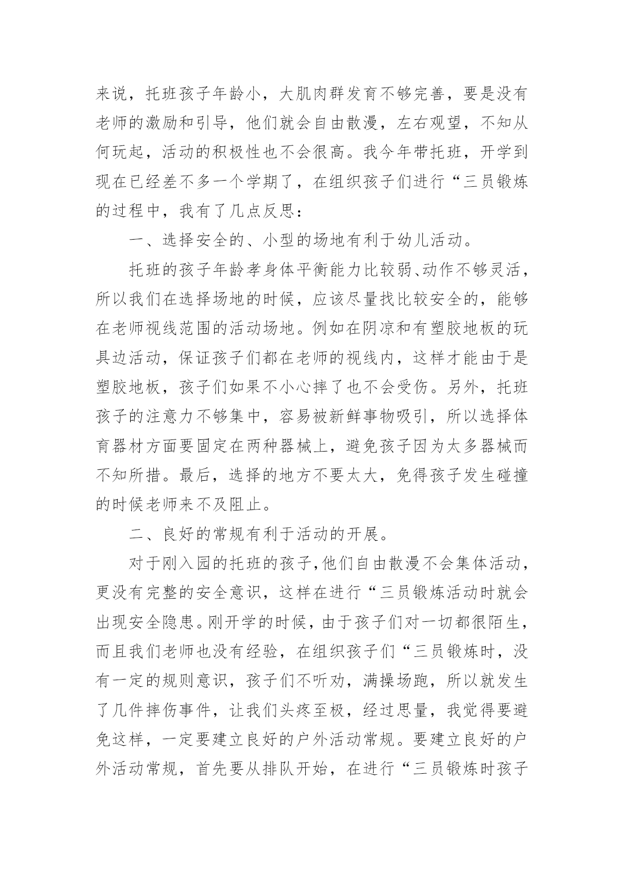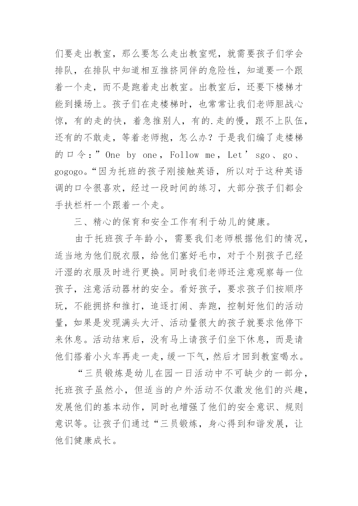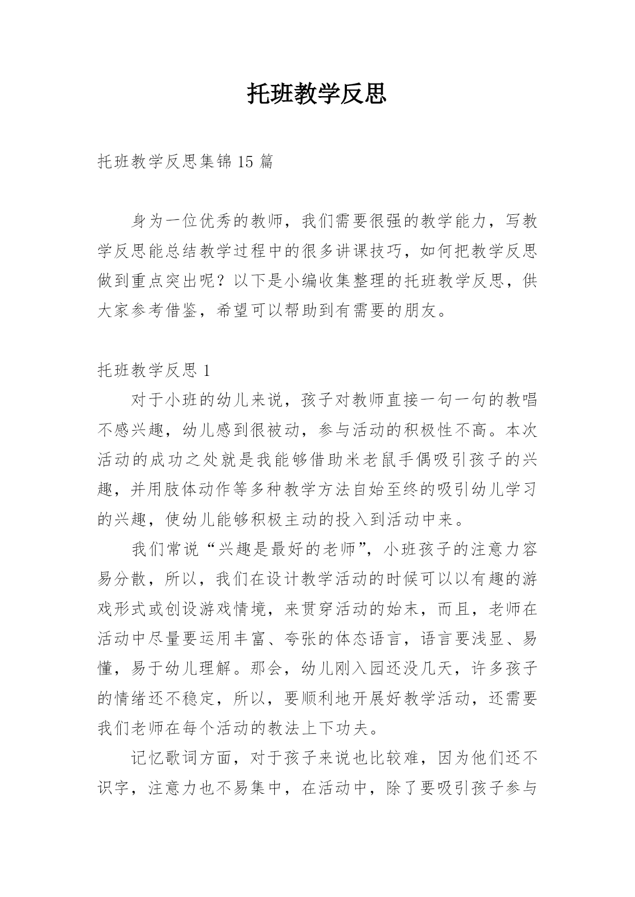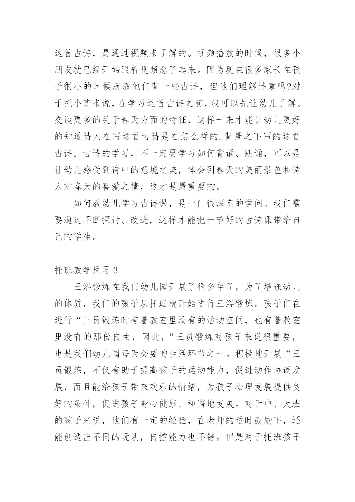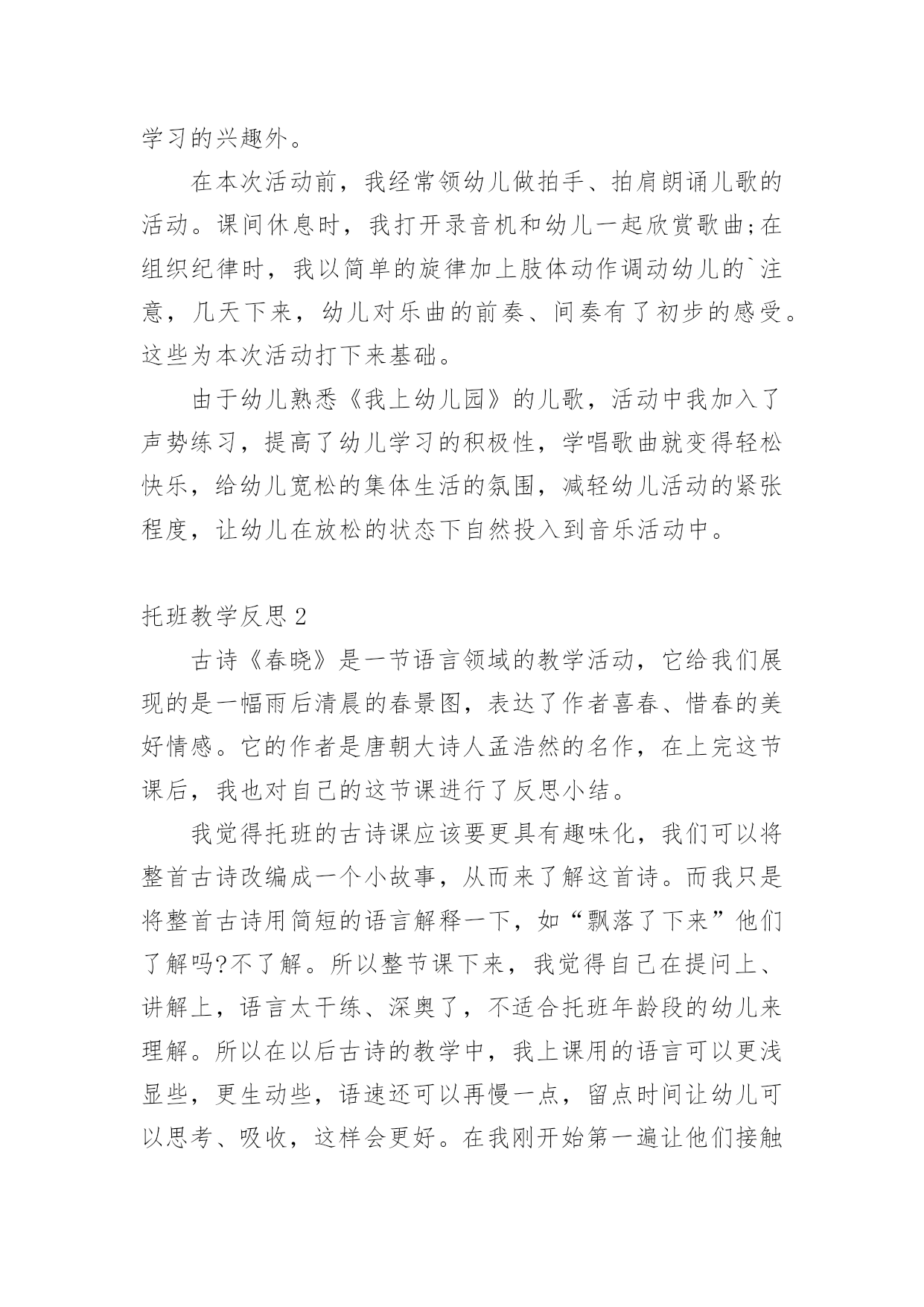 托班教学反思 托班教学反思集锦15篇身为一位优秀的教师,我们需要很强的教学能力,写教学反思能总结教学过程中的很多讲课技巧,如何把教学反思做到重点突出呢?以下是小编收集整理的托班教学反思,供大家参考借鉴,希望可以帮助到有需要的朋友。托班教学反思1对于小班的幼儿来说,孩子对教师直接一句一句的教唱不感兴趣,幼儿感到很被动,参与活动的积极性不高。本次活动的成功之处就是我能够借助米老鼠手偶吸引孩子的兴趣,并用肢体动作等多种教学方法自始至终的吸引幼儿学习的兴趣,使幼儿能够积极主动的投入到活动中来。我们常说“兴趣是最好的老师”,小班孩子的注意力容易分散,所以,我们在设计教学活动的时候可以以有趣的游戏形式或创设游戏情境,来贯穿活动的始末,而且,老师在活动中尽量要运用丰富、夸张的体态语言,语言要浅显、易懂,易于幼儿理解。那会,幼儿刚入园还没几天,许多孩子的情绪还不稳定,所以,要顺利地开展好教学活动,还需要我们老师在每个活动的教法上下功夫。记忆歌词方面,对于孩子来说也比较难,因为他们还不识字,注意力也不易集中,在活动中,除了要吸引孩子参与学习的兴趣外。在本次活动前,我经常领幼儿做拍手、拍肩朗诵儿歌的活动。课间休息时,我打开录音机和幼儿一起欣赏歌曲;在组织纪律时,我以简单的旋律加上肢体动作调动幼儿的`注意,几天下来,幼儿对乐曲的前奏、间奏有了初步的感受。这些为本次活动打下来基础。由于幼儿熟悉《我上幼儿园》的儿歌,活动中我加入了声势练习,提高了幼儿学习的积极性,学唱歌曲就变得轻松快乐,给幼儿宽松的集体生活的氛围,减轻幼儿活动的紧张程度,让幼儿在放松的状态下自然投入到音乐活动中。托班教学反思2古诗《春晓》是一节语言领域的教学活动,它给我们展现的是一幅雨后清晨的春景图,表达了作者喜春、惜春的美好情感。它的作者是唐朝大诗人孟浩然的名作,在上完这节课后,我也对自己的这节课进行了反思小结。我觉得托班的古诗课应该要更具有趣味化,我们可以将整首古诗改编成一个小故事,从而来了解这首诗。而我只是将整首古诗用简短的语言解释一下,如“飘落了下来”他们了解吗?不了解。所以整节课下来,我觉得自己在提问上、讲解上,语言太干练、深奥了,不适合托班年龄段的幼儿来理解。所以在以后古诗的教学中,我上课用的语言可以更浅显些,更生动些,语速还可以再慢一点,留点时间让幼儿可以思考、吸收,这样会更好。在我刚开始第一遍让他们接触这首古诗,是通过视频来了解的。视频播放的时候,很多小朋友就已经开始跟着视频念了起来。因为现在很多家长在孩子很小的时候就教他们背一些古诗,但他们理解诗意吗?对于托小班来说,在学习这首古诗之前,我可以先让幼儿了解、交谈更多的关于春天方面的特征,这样一来才能让幼儿更好的知道诗人在写这首古诗是在怎么样的.背景之下写的这首古诗。古诗的学习,不一定要学习如何背诵、朗诵,可以是让幼儿感受到诗中的意境之美,体会到春天的美丽景色和诗人对春天的喜爱之情,这才是最重要的。如何教幼儿学习古诗课,是一门很深奥的学问。我们需要通过不断探讨、改进,这样才能把一节好的古诗课带给自己的学生。托班教学反思3三浴锻炼在我们幼儿园开展了很多年了,为了增强幼儿的体质,我们的孩子从托班就开始进行三浴锻炼。孩子们在进行“三员锻炼时有着教室里没有的活动空间,也有着教室里没有的那份自由,因此,“三员锻炼对孩子来说很重要,也是我们幼儿园每天必要的生活环节之一。积极地开展“三员锻炼,不仅有助于提高孩子的运动能力,促进动作协调发展,而且能给孩子带来欢乐的情绪,为孩子心理发展提供良好的条件,促进孩子身心健康、和谐地发展。对于中、大班的孩子来说,他们有一定的经验,在老师的适时鼓励下,还能创造出不同的玩法,自控能力也不错。但是对于托班孩子来说,托班孩子年龄小,大肌肉群发育不够完善,要是没有老师的激励和引导,他们就会自由散漫,左右观望,不知从何玩起,活动的积极性也不会很高。我今年带托班,开学到现在已经差不多一个学期了,在组织孩子们进行“三员锻炼的过程中,我有了几点反思:一、选择安全的、小型的场地有利于幼儿活动。托班的孩子年龄孝身体平衡能力比较弱、动作不够灵活,所以我们在选择场地的时候,应该尽量找比较安全的,能够在老师视线范围的活动场地。例如在阴凉和有塑胶地板的玩具边活动,保证孩子们都在老师的视线内,这样才能由于是塑胶地板,孩子们如果不小心摔了也不会受伤。另外,托班孩子的注意力不够集中,容易被新鲜事物吸引,所以选择体育器材方面要固定在两种器械上,避免孩子因为太多器械而不知所措。最后,选择的地方不要太大,免得孩子发生碰撞的时候老师来不及阻止。二、良好的常规有利于活动的开展。对于刚入园的托班的孩子,他们自由散漫不会集体活动,更没有完整的安全意识,这样在进行“三员锻炼活动时就会出现安全隐患。刚开学的时候,由于孩子们对一切都很陌生,而且我们老
