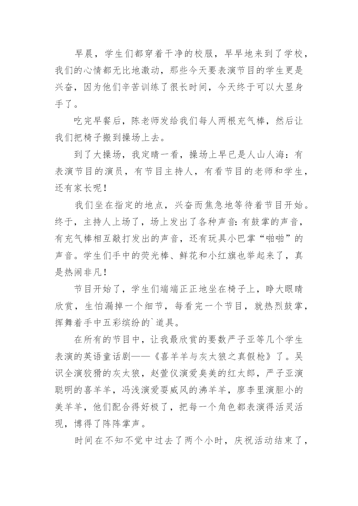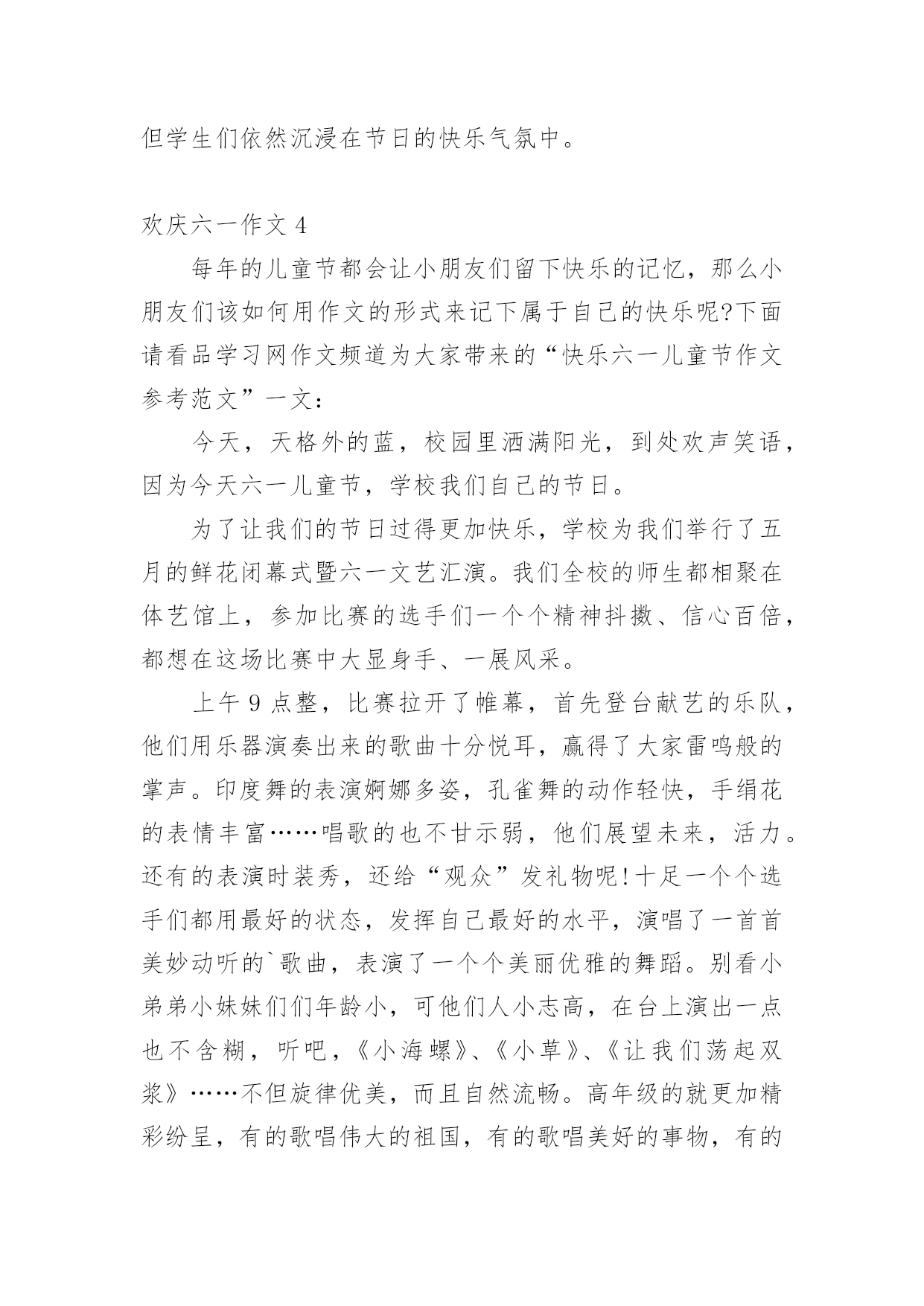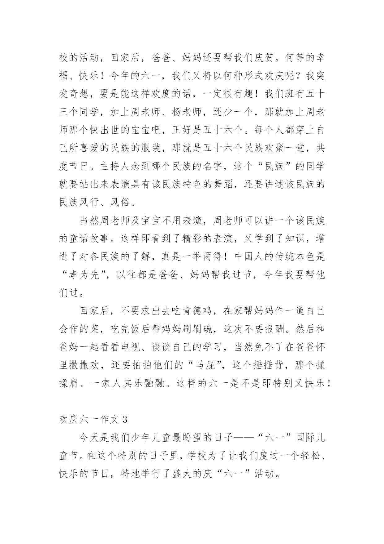 欢庆六一作文 欢庆六一作文【推荐】在现实生活或工作学习中,大家都写过作文吧,借助作文人们可以实现文化交流的目的。你知道作文怎样写才规范吗?以下是小编帮大家整理的欢庆六一作文,希望能够帮助到大家。欢庆六一作文1六一儿童节是儿童的盛宴。在儿童节里,我们欢庆着属于自己的时光。今天是一年一度的六一儿童节,每一位同学的脸上都挂着欣喜的笑容。我是主持人,这一天,我是多么的开心呀,活象一只刚被放出来的小鸟,在蔚蓝的天空中自由自在地飞翔。刚到教室,只听见教室传来一阵阵欢快的笑声。原来是同学们在布置教室啊,教室里非常热闹,这里在吹一串串气球,那里在拉一个个灯笼,还有一些同学拉起了好多拉花。同学们可忙碌啦,一会儿,教室里焕然一新,简直就是孩子们的天堂!终于,我要开始主持节目了。临走上主持台,我非常紧张,感觉到自己的心怦怦地跳个不停,但我看见同学们期待的'目光,我力保镇定,挂着灿烂的笑容走上主持台。同学们表演的节目可真丰富。我很喜欢李菲一演奏的古筝曲,她的双手在弦上自由自在地移动跳跃,古筝便发出连续的美妙的旋律。她的指尖流淌出声音如展翅欲飞的蝴蝶,扑闪着灵动的翅膀,清亮亮的流淌着。真是“此曲只应天上有,人间那得几回闻。”我还很喜欢邓心怡她们表演的童话剧《小熊请客》,非常有趣。主人公是狐狸和小熊,狐狸好吃懒做,喜欢贪小便宜。一天,小熊请森林里的动物来它家做客,狐狸知道了,心想:什么都不用做,真是件好事。可是,森林里的动物都知道狐狸好吃懒做,一个也不肯带它去;于是,狐狸就自己到了小熊家。小熊知道了,和其它动物一起赶走了狐狸。看过了这个童话剧,我知道了人不能好吃懒做,不能贪小便宜,如果和狐狸这样,一定会非常讨人厌,走到哪儿,都没人喜欢。这次的六一儿童节,同学们过得都十分开心,至今,校园里还久久回荡着我们欢乐的笑声!欢庆六一作文2一年一度的六一国际儿童节又快来临了。虽然还有两周时间,但在商场不时地可碰到一些性急的爷爷、奶奶,爸爸、妈妈已经在帮自己的宝贝挑选礼物了,不外乎是衣服、玩具和书籍,毫无新意。六一儿童节是全世界小朋友的节日,也是小朋友们一年中最快乐的`一天!这一天小朋友们穿着节日的盛装参加学校的活动,回家后,爸爸、妈妈还要帮我们庆贺。何等的幸福、快乐!今年的六一,我们又将以何种形式欢庆呢?我突发奇想,要是能这样欢度的话,一定很有趣!我们班有五十三个同学,加上周老师、杨老师,还少一个,那就加上周老师那个快出世的宝宝吧,正好是五十六个。每个人都穿上自己所喜爱的民族的服装,那就是五十六个民族欢聚一堂,共度节日。主持人念到哪个民族的名字,这个“民族”的同学就要站出来表演具有该民族特色的舞蹈,还要讲述该民族的民族风行、风俗。当然周老师及宝宝不用表演,周老师可以讲一个该民族的童话故事。这样即看到了精彩的表演,又学到了知识,增进了对各民族的了解,真是一举两得!中国人的传统本色是“孝为先”,以往都是爸爸、妈妈帮我过节,今年我要帮他们过。回家后,不要求出去吃肯德鸡,在家帮妈妈作一道自己会作的菜,吃完饭后帮妈妈刷刷碗,这次不要报酬。然后和爸妈一起看看电视、谈谈自己的学习,当然免不了在爸爸怀里撒撒欢,还要拍拍他们的“马屁”,这个捶捶背,那个揉揉肩。一家人其乐融融。这样的六一是不是即特别又快乐!欢庆六一作文3今天是我们少年儿童最盼望的日子——“六一”国际儿童节。在这个特别的日子里,学校为了让我们度过一个轻松、快乐的节日,特地举行了盛大的庆“六一”活动。早晨,学生们都穿着干净的校服,早早地来到了学校,我们的心情都无比地激动,那些今天要表演节目的学生更是兴奋,因为他们辛苦训练了很长时间,今天终于可以大显身手了。吃完早餐后,陈老师发给我们每人两根充气棒,然后让我们把椅子搬到操场上去。到了大操场,我定睛一看,操场上早已是人山人海:有表演节目的演员,有节目主持人,有看节目的老师和学生,还有家长呢!我们坐在指定的地点,兴奋而焦急地等待着节目开始。终于,主持人上场了,场上发出了各种声音:有鼓掌的声音,有充气棒相互敲打发出的声音,还有玩具小巴掌“啪啪”的声音。学生们手中的荧光棒、鲜花和小红旗也举起来了,真是热闹非凡!节目开始了,学生们端端正正地坐在椅子上,睁大眼睛欣赏,生怕漏掉一个细节,每看完一个节目,就热烈鼓掌,挥舞着手中五彩缤纷的`道具。在所有的节目中,让我最欣赏的要数严子亚等几个学生表演的英语童话剧——《喜羊羊与灰太狼之真假枪》了。吴识全演狡猾的灰太狼,赵萱仪演爱臭美的红太郎,严子亚演聪明的喜羊羊,冯浅演爱耍威风的沸羊羊,廖李里演胆小的美羊羊,他们配合得好极了,把每一个角色都表演得活灵活现,博得了阵阵掌声。时间在不知不觉中过去了两个小时,庆祝活动结束了,但学生们依然沉浸在节日的快乐气氛中。欢庆六一作文4每年的儿童节都会让小朋友们留下快乐的记忆,那么小朋友们该如何用作文的形式来记下属