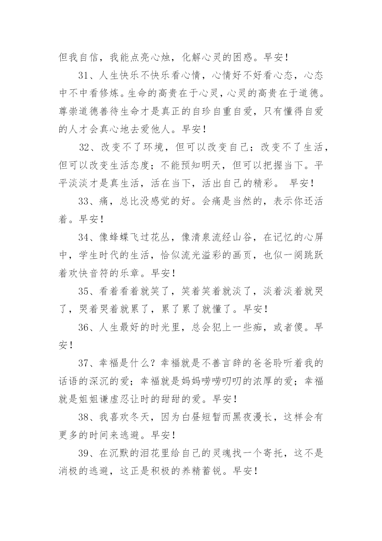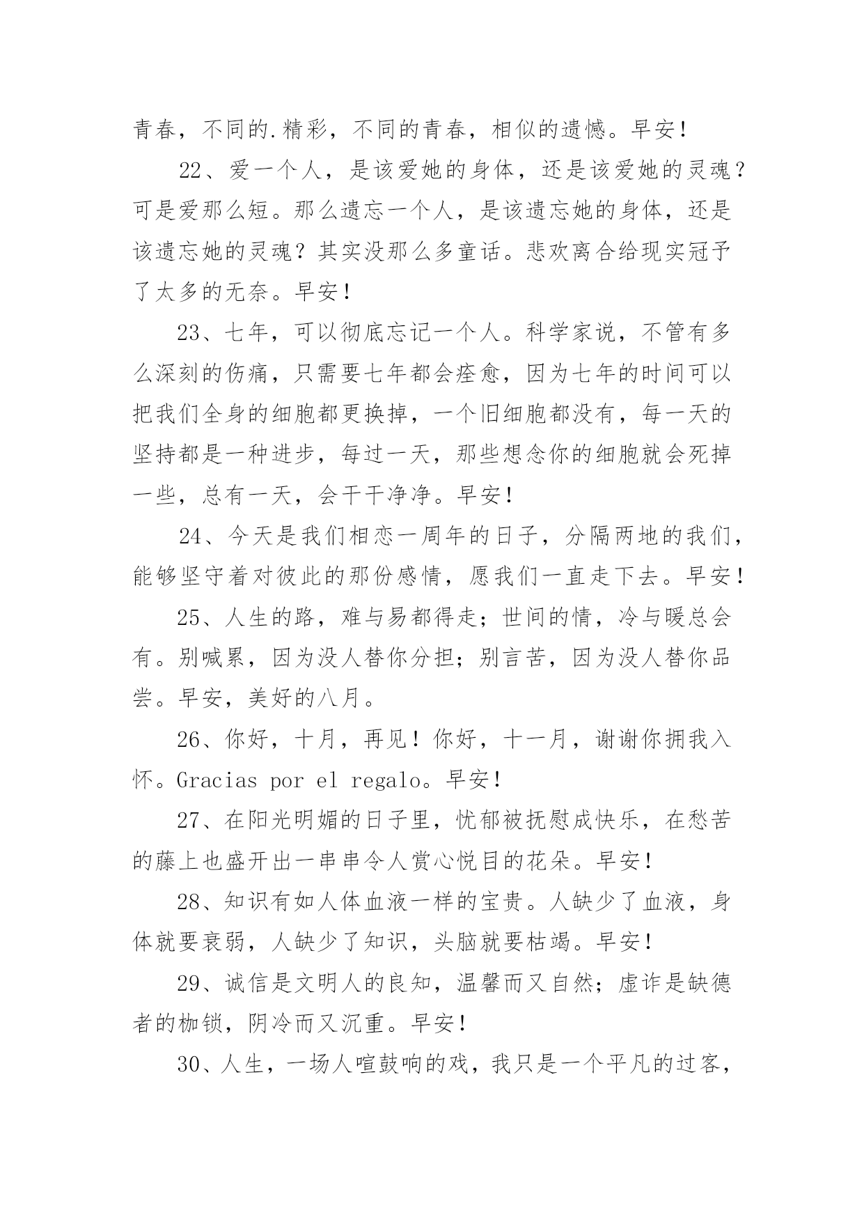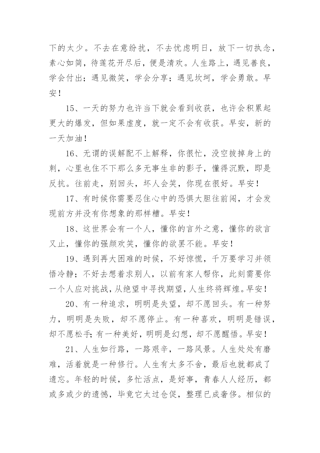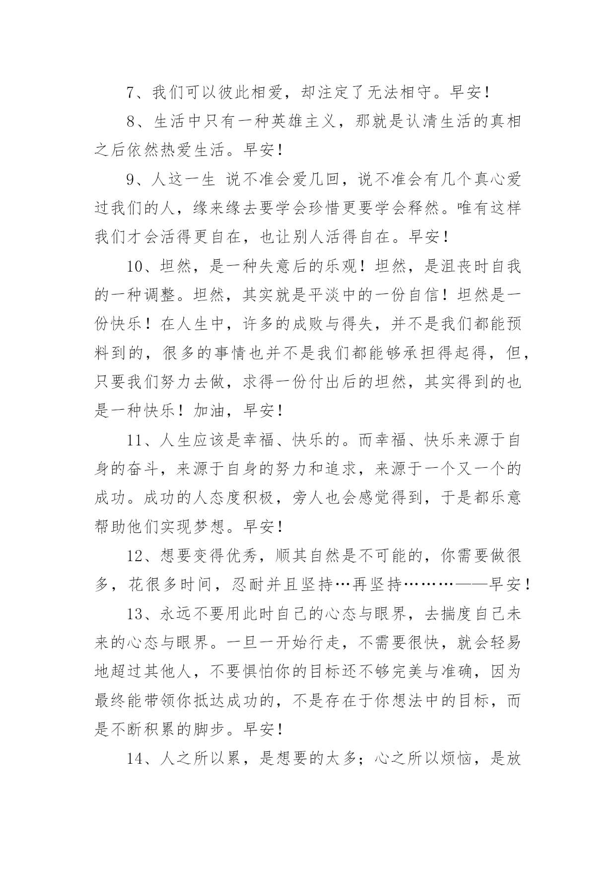 简单的新版早安问候语 简单的新版早安问候语41句任何一颗心灵的成熟,都必须经过寂寞的洗礼和孤独的磨炼。早安!以下是小编为大家整理的新版早安问候语41句,一起来欣赏吧。1、我宁可听到你说不喜欢我,也不愿意这样被你忽略。早安!2、爱一个人,不仅要爱他的优点,也要爱他的缺点;爱一个人,并不是要从他身上索取自己想要的东西,而应不求回报地付出与给予。早安!3、丰富的知识靠一点一滴积累而来。谁不懂得这个道理,谁就会停滞不前,一生无知:谁懂得这个道理,谁就能日有所进,终有所成。早安!4、我总是呆在一段时光里,怀念另一段时光。如果把童年再放映一遍,我们一定会先大笑,然后放声痛哭,最后挂着泪,微笑着睡去。有时我沉默,不是不快乐,只是想把心净空,就像宁静明朗的清晨。早安!5、人心的距离越大,世界就越复杂。人心的距离拉近了,世界就变得简单了。简单从人心开始。早安!6、不论什么鞋,最重要的是合脚;不论什么样的姻缘,最美妙的是和谐。切莫只贪图鞋的华贵,而委屈了自己的脚。别人看到的是鞋,自己感受到的是脚。脚比鞋重要,这是一条真理,许许多多的人却常常忘记。早安!7、我们可以彼此相爱,却注定了无法相守。早安!8、生活中只有一种英雄主义,那就是认清生活的真相之后依然热爱生活。早安!9、人这一生说不准会爱几回,说不准会有几个真心爱过我们的人,缘来缘去要学会珍惜更要学会释然。唯有这样我们才会活得更自在,也让别人活得自在。早安!10、坦然,是一种失意后的乐观!坦然,是沮丧时自我的一种调整。坦然,其实就是平淡中的一份自信!坦然是一份快乐!在人生中,许多的成败与得失,并不是我们都能预料到的,很多的事情也并不是我们都能够承担得起得,但,只要我们努力去做,求得一份付出后的坦然,其实得到的也是一种快乐!加油,早安!11、人生应该是幸福、快乐的。而幸福、快乐来源于自身的奋斗,来源于自身的努力和追求,来源于一个又一个的成功。成功的人态度积极,旁人也会感觉得到,于是都乐意帮助他们实现梦想。早安!12、想要变得优秀,顺其自然是不可能的,你需要做很多,花很多时间,忍耐并且坚持…再坚持………——早安!13、永远不要用此时自己的心态与眼界,去揣度自己未来的心态与眼界。一旦一开始行走,不需要很快,就会轻易地超过其他人,不要惧怕你的目标还不够完美与准确,因为最终能带领你抵达成功的,不是存在于你想法中的目标,而是不断积累的脚步。早安!14、人之所以累,是想要的太多;心之所以烦恼,是放下的太少。不去在意纷扰,不去忧虑明日,放下一切执念,素心如简,待莲花开尽后,便是清欢。人生路上,遇见善良,学会付出;遇见微笑,学会分享;遇见坎坷,学会勇敢。早安!15、一天的努力也许当下就会看到收获,也许会积累起更大的爆发,但如果虚度,就一定不会有收获。早安,新的一天加油!16、无谓的误解配不上解释,你很忙,没空拔掉身上的刺,心里也住不下那么多无事生非的影子,懂得沉默,即是反抗。往前走,别回头,坏人会笑,你现在很好。早安!17、有时候你需要忍住心中的恐惧大胆往前闯,才会发现前方并没有你想象的那样糟。早安!18、这世界会有一个人,懂你的言外之意,懂你的欲言又止,懂你的强颜欢笑,懂你的欲罢不能。早安!19、遇到再大困难的时候,不好惊慌,千万要学习并领悟冷静;不好去想着求别人,以前有家人帮你,此刻需要你一个人应对挑战,从绝望中寻找期望,人生终将辉煌。早安!20、有一种追求,明明是失望,却不愿回头。有一种努力,明明是失败,却不愿停止。有一种喜欢,明明是错误,却不愿松手;有一种美好,明明是幻想,却不愿醒悟。早安!21、人生如行路,一路艰辛,一路风景。人生处处有磨难,活着就是一种修行。人生有太多不舍,最后也就都成了遗忘。年轻的时候,多忙活点,是好事,青春人人经历,都或多或少的遗憾,毕竟它太过仓促,整理已成奢侈。相似的青春,不同的.精彩,不同的青春,相似的遗憾。早安!22、爱一个人,是该爱她的身体,还是该爱她的灵魂?可是爱那么短。那么遗忘一个人,是该遗忘她的身体,还是该遗忘她的灵魂?其实没那么多童话。悲欢离合给现实冠予了太多的无奈。早安!23、七年,可以彻底忘记一个人。科学家说,不管有多么深刻的伤痛,只需要七年都会痊愈,因为七年的时间可以把我们全身的细胞都更换掉,一个旧细胞都没有,每一天的坚持都是一种进步,每过一天,那些想念你的细胞就会死掉一些,总有一天,会干干净净。早安!24、今天是我们相恋一周年的日子,分隔两地的我们,能够坚守着对彼此的那份感情,愿我们一直走下去。早安!25、人生的路,难与易都得走;世间的情,冷与暖总会有。别喊累,因为没人替你分担;别言苦,因为没人替你品尝。早安,美好的八月。26、你好,十月,再见!你好,十一月,谢谢你拥我入怀。Graciasporelregalo。早安!27、在阳光明媚的日子里,忧郁被抚慰成