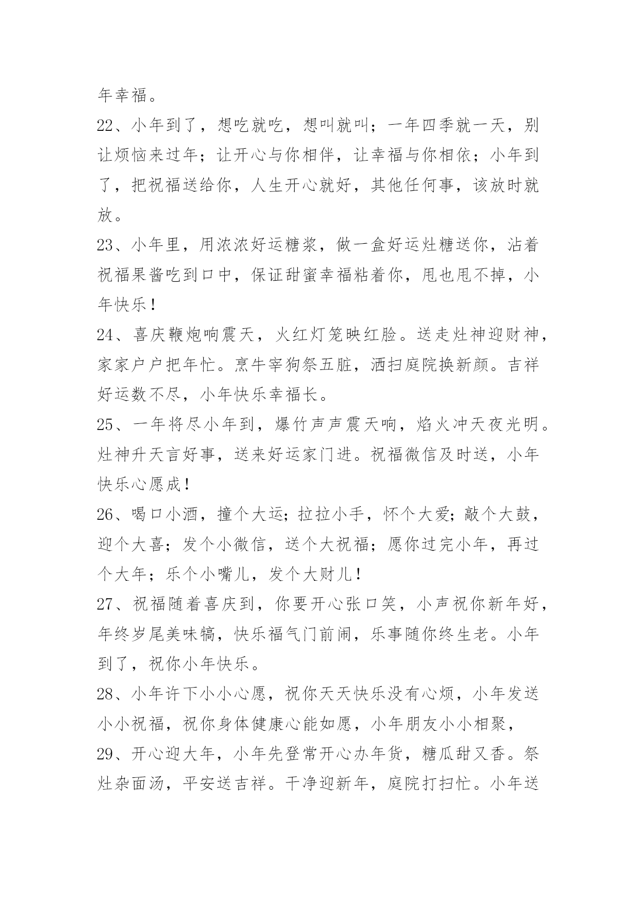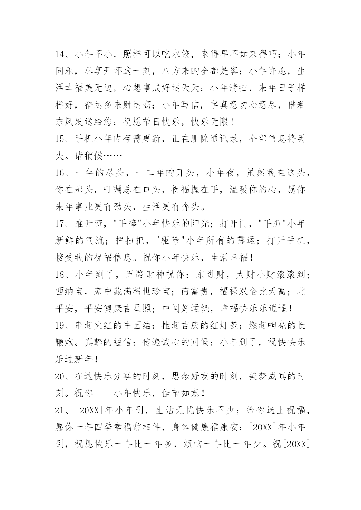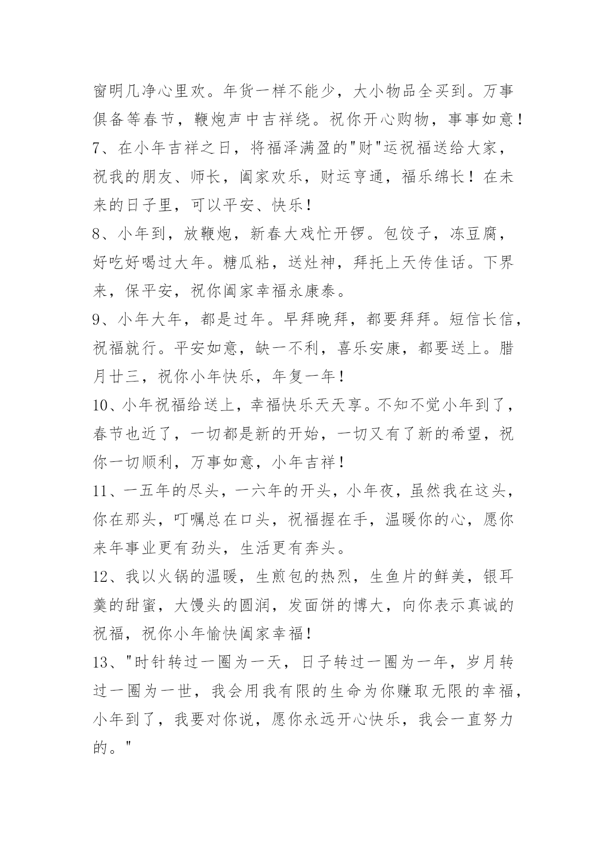 小年问候语 2023年小年问候语30句年虽小,可五福俱全,一福在脸上,笑语盈盈!二福在身上,健康欢乐!三福在家里,吉祥如意!四福在路上,平平安安!五福在心上,好梦永远!小年快乐!以下是小编精心整理的小年问候语30句,希望对大家有所帮助。1、小年到来新年临,屋内屋外打扫净。窗户明亮旧如新,事事如意人顺心。恭送灶王迎福音,快快乐乐新年迎。祝小年快乐!2、旧年将逝小年到,新春即将身边绕。爆竹声声是欢笑,烟火翩翩在欢跳。祭拜祖先送灶神,迎来好运烦恼消。祝福短信不可少,祝你小年步步高!3、小年到,福喜到,新年吹响集结号;请财神,请灶神,财富梦想在燃烧;办年货,蒸年糕,新年展望步步高;发短信,祝福友,愿你新年幸福发发发!4、送你一声祝福,愿你富贵满满,送你一份祝愿,愿你好运不断,送你一份祈祷,愿你幸福相伴,送你一句问候,愿你吉祥如意,送你一条短信,愿你小年快乐。5、今天是农历廿三,是传统节日"小年",也称为"扫尘日"。在这一天,大家要将家打扫干净为过节做好准备。春节更近了,愿迎接春节的人们都有好心情!6、快快乐乐小年到,忙忙碌碌迎新春。家家户户忙打扫,窗明几净心里欢。年货一样不能少,大小物品全买到。万事俱备等春节,鞭炮声中吉祥绕。祝你开心购物,事事如意!7、在小年吉祥之日,将福泽满盈的"财"运祝福送给大家,祝我的朋友、师长,阖家欢乐,财运亨通,福乐绵长!在未来的日子里,可以平安、快乐!8、小年到,放鞭炮,新春大戏忙开锣。包饺子,冻豆腐,好吃好喝过大年。糖瓜粘,送灶神,拜托上天传佳话。下界来,保平安,祝你阖家幸福永康泰。9、小年大年,都是过年。早拜晚拜,都要拜拜。短信长信,祝福就行。平安如意,缺一不利,喜乐安康,都要送上。腊月廿三,祝你小年快乐,年复一年!10、小年祝福给送上,幸福快乐天天享。不知不觉小年到了,春节也近了,一切都是新的开始,一切又有了新的希望,祝你一切顺利,万事如意,小年吉祥!11、一五年的尽头,一六年的开头,小年夜,虽然我在这头,你在那头,叮嘱总在口头,祝福握在手,温暖你的心,愿你来年事业更有劲头,生活更有奔头。12、我以火锅的温暖,生煎包的热烈,生鱼片的鲜美,银耳羹的甜蜜,大馒头的圆润,发面饼的博大,向你表示真诚的祝福,祝你小年愉快阖家幸福!13、"时针转过一圈为一天,日子转过一圈为一年,岁月转过一圈为一世,我会用我有限的生命为你赚取无限的幸福,小年到了,我要对你说,愿你永远开心快乐,我会一直努力的。"14、小年不小,照样可以吃水饺,来得早不如来得巧;小年同乐,尽享开怀这一刻,八方来的全都是客;小年许愿,生活幸福美无边,心想事成好运天天;小年清扫,来年日子样样好,福运多来财运高;小年写信,字真意切心意尽,借着东风发送给您:祝愿节日快乐,快乐无限!15、手机小年内存需更新,正在删除通讯录,全部信息将丢失。请稍候……16、一年的尽头,一二年的开头,小年夜,虽然我在这头,你在那头,叮嘱总在口头,祝福握在手,温暖你的心,愿你来年事业更有劲头,生活更有奔头。17、推开窗,"手捧"小年快乐的阳光;打开门,"手抓"小年新鲜的气流;挥扫把,"驱除"小年所有的霉运;打开手机,接受我的祝福信息。祝你小年快乐,生活幸福!18、小年到了,五路财神祝你:东进财,大财小财滚滚到;西纳宝,家中藏满稀世珍宝;南富贵,福禄双全比天高;北平安,平安健康吉星照;中间好运绕,幸福快乐乐逍遥!19、串起火红的中国结;挂起吉庆的红灯笼;燃起响亮的长鞭炮。真挚的短信;传递诚心的问候:小年到了,祝快快乐乐过新年!20、在这快乐分享的时刻,思念好友的时刻,美梦成真的时刻。祝你——小年快乐,佳节如意!21、[20XX]年小年到,生活无忧快乐不少;给你送上祝福,愿你一年四季幸福常相伴,身体健康福康安;[20XX]年小年到,祝愿快乐一年比一年多,烦恼一年比一年少。祝[20XX]年幸福。22、小年到了,想吃就吃,想叫就叫;一年四季就一天,别让烦恼来过年;让开心与你相伴,让幸福与你相依;小年到了,把祝福送给你,人生开心就好,其他任何事,该放时就放。23、小年里,用浓浓好运糖浆,做一盒好运灶糖送你,沾着祝福果酱吃到口中,保证甜蜜幸福粘着你,甩也甩不掉,小年快乐!24、喜庆鞭炮响震天,火红灯笼映红脸。送走灶神迎财神,家家户户把年忙。烹牛宰狗祭五脏,洒扫庭院换新颜。吉祥好运数不尽,小年快乐幸福长。25、一年将尽小年到,爆竹声声震天响,焰火冲天夜光明。灶神升天言好事,送来好运家门进。祝福微信及时送,小年快乐心愿成!26、喝口小酒,撞个大运;拉拉小手,怀个大爱;敲个大鼓,迎个大喜;发个小微信,送个大祝福;愿你过完小年,再过个大年;乐个小嘴儿,发个大财儿!27、祝福随着喜庆到,你要开心张口笑,小声祝你新年好,年终岁尾美味犒,快乐福气门前闹,乐事随你终生老。小年到了,祝你小年快乐。28、小年