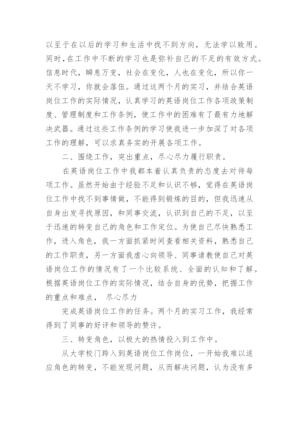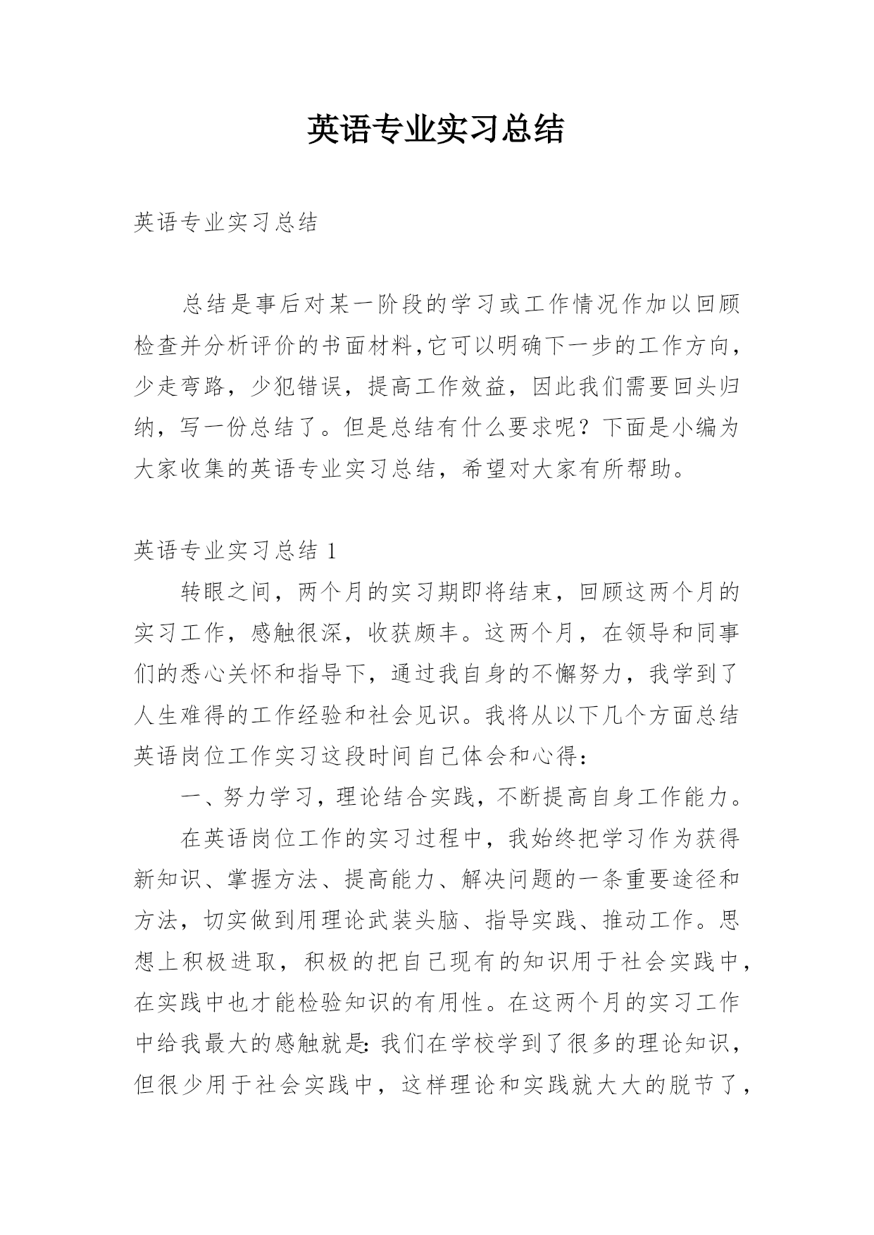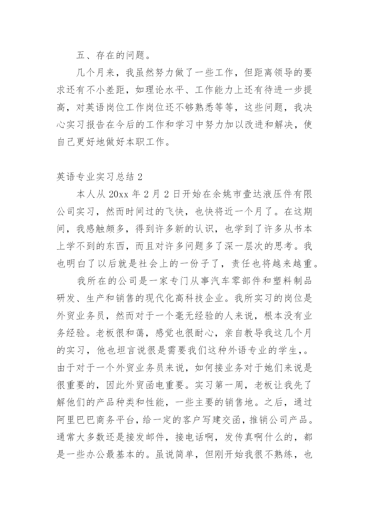 英语专业实习总结 英语专业实习总结总结是事后对某一阶段的学习或工作情况作加以回顾检查并分析评价的书面材料,它可以明确下一步的工作方向,少走弯路,少犯错误,提高工作效益,因此我们需要回头归纳,写一份总结了。但是总结有什么要求呢?下面是小编为大家收集的英语专业实习总结,希望对大家有所帮助。英语专业实习总结1转眼之间,两个月的实习期即将结束,回顾这两个月的实习工作,感触很深,收获颇丰。这两个月,在领导和同事们的悉心关怀和指导下,通过我自身的不懈努力,我学到了人生难得的工作经验和社会见识。我将从以下几个方面总结英语岗位工作实习这段时间自己体会和心得:一、努力学习,理论结合实践,不断提高自身工作能力。在英语岗位工作的实习过程中,我始终把学习作为获得新知识、掌握方法、提高能力、解决问题的一条重要途径和方法,切实做到用理论武装头脑、指导实践、推动工作。思想上积极进取,积极的把自己现有的知识用于社会实践中,在实践中也才能检验知识的有用性。在这两个月的实习工作中给我最大的感触就是:我们在学校学到了很多的理论知识,但很少用于社会实践中,这样理论和实践就大大的脱节了,以至于在以后的学习和生活中找不到方向,无法学以致用。同时,在工作中不断的学习也是弥补自己的不足的有效方式。信息时代,瞬息万变,社会在变化,人也在变化,所以你一天不学习,你就会落伍。通过这两个月的实习,并结合英语岗位工作的实际情况,认真学习的英语岗位工作各项政策制度、管理制度和工作条例,使工作中的困难有了最有力地解决武器。通过这些工作条例的学习使我进一步加深了对各项工作的理解,可以求真务实的开展各项工作。二、围绕工作,突出重点,尽心尽力履行职责。在英语岗位工作中我都本着认真负责的态度去对待每项工作。虽然开始由于经验不足和认识不够,觉得在英语岗位工作中找不到事情做,不能得到锻炼的目的,但我迅速从自身出发寻找原因,和同事交流,认识到自己的不足,以至于迅速的转变自己的角色和工作定位。为使自己尽快熟悉工作,进入角色,我一方面抓紧时间查看相关资料,熟悉自己的工作职责,另一方面我虚心向领导、同事请教使自己对英语岗位工作的情况有了一个比较系统、全面的认知和了解。根据英语岗位工作的实际情况,结合自身的优势,把握工作的重点和难点,尽心尽力完成英语岗位工作的任务。两个月的实习工作,我经常得到了同事的好评和领导的赞许。三、转变角色,以极大的热情投入到工作中。从大学校门跨入到英语岗位工作岗位,一开始我难以适应角色的转变,不能发现问题,从而解决问题,认为没有多少事情可以做,我就有一点失望,开始的热情有点消退,完全找不到方向。但我还是尽量保持当初的那份热情,想干有用的事的态度,不断的做好一些杂事,同时也勇于协助同事做好各项工作,慢慢的就找到了自己的角色,明白自己该干什么,这就是一个热情的问题,只要我保持极大的热情,相信自己一定会得到认可,没有不会做,没有做不好,只有你愿不愿意做。转变自己的角色,从一位学生到一位工作人员的转变,不仅仅是角色的变化,更是思想观念的转变。四、发扬团队精神,在完成本职工作的同时协同其他同事。在工作间能得到领导的充分信任,并在按时完成上级分配给我的各项工作的同时,还能积极主动地协助其他同事处理一些内务工作。个人的能力只有融入团队,才能实现最大的价值。实习期的工作,让我充分认识到团队精神的重要性。团队的精髓是共同进步。没有共同进步,相互合作,团队如同一盘散沙。相互合作,团队就会齐心协力,成为一个强有力的集体。很多人经常把团队和工作团体混为一谈,其实两者之间存在本质上的区别。优秀的工作团体与团队一样,具有能够一起分享信息、观点和创意,共同决策以帮助每个成员能够更好地工作,同时强化个人工作标准的特点。但工作团体主要是把工作目标分解到个人,其本质上是注重个人目标和责任,工作团体目标只是个人目标的简单总和,工作团体的成员不会为超出自己义务范围的结果负责,也不会尝试那种因为多名成员共同工作而带来的增值效应。五、存在的问题。几个月来,我虽然努力做了一些工作,但距离领导的要求还有不小差距,如理论水平、工作能力上还有待进一步提高,对英语岗位工作岗位还不够熟悉等等,这些问题,我决心实习报告在今后的工作和学习中努力加以改进和解决,使自己更好地做好本职工作。英语专业实习总结2本人从20xx年2月2日开始在余姚市壹达液压件有限公司实习,然而时间过的飞快,也快将近一个月了。在这期间,我感触颇多,得到许多新的认识,也学到了许多从书本上学不到的东西,而且对许多问题多了深一层次的思考。我也明白了以后就是社会上的一份子了,责任也将越来越重。我所在的公司是一家专门从事汽车零部件和塑料制品研发、生产和销售的现代化高科技企业。我所实习的岗位是外贸业务员,然而对于一个毫无经验的人来说,根本没有业务经验。老板很和蔼,感觉也很耐心,亲自