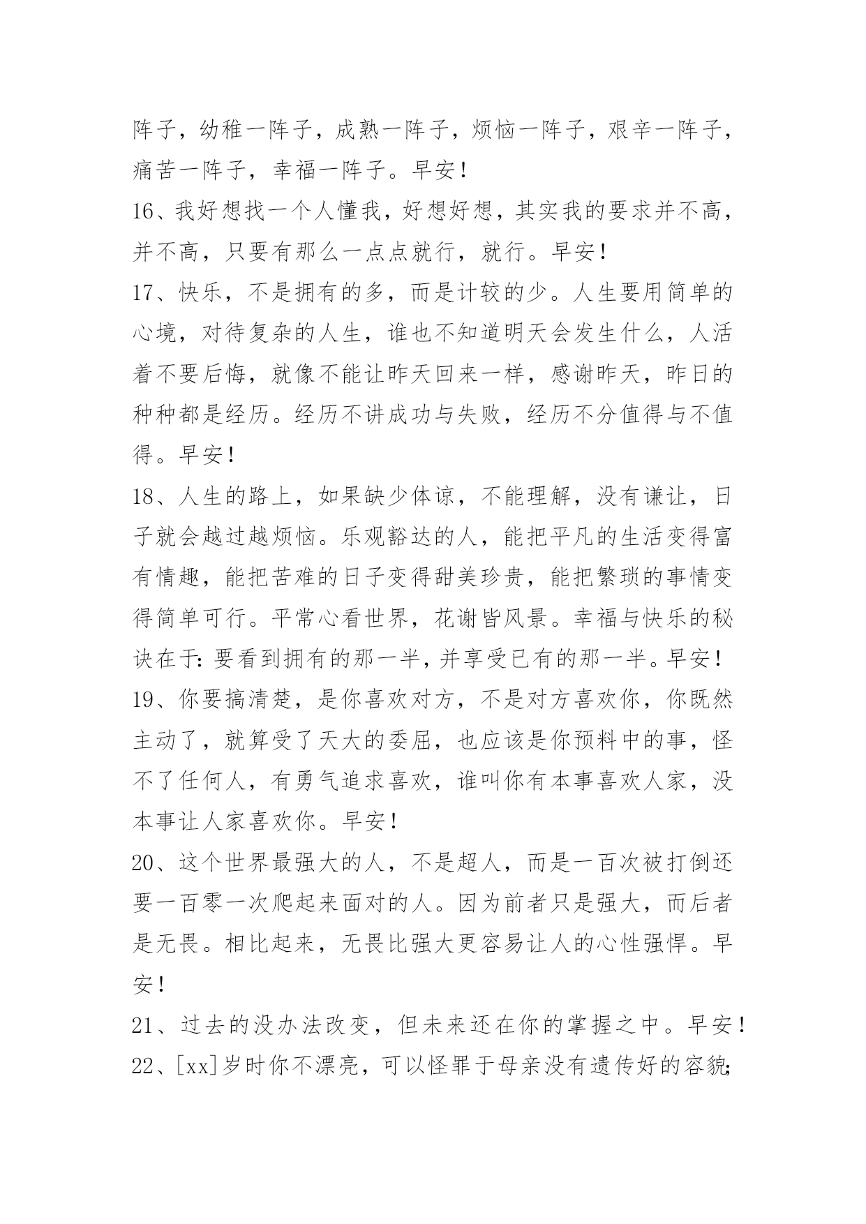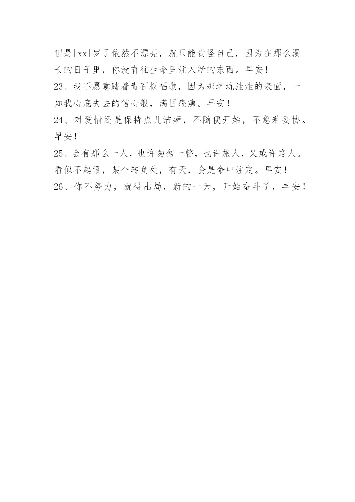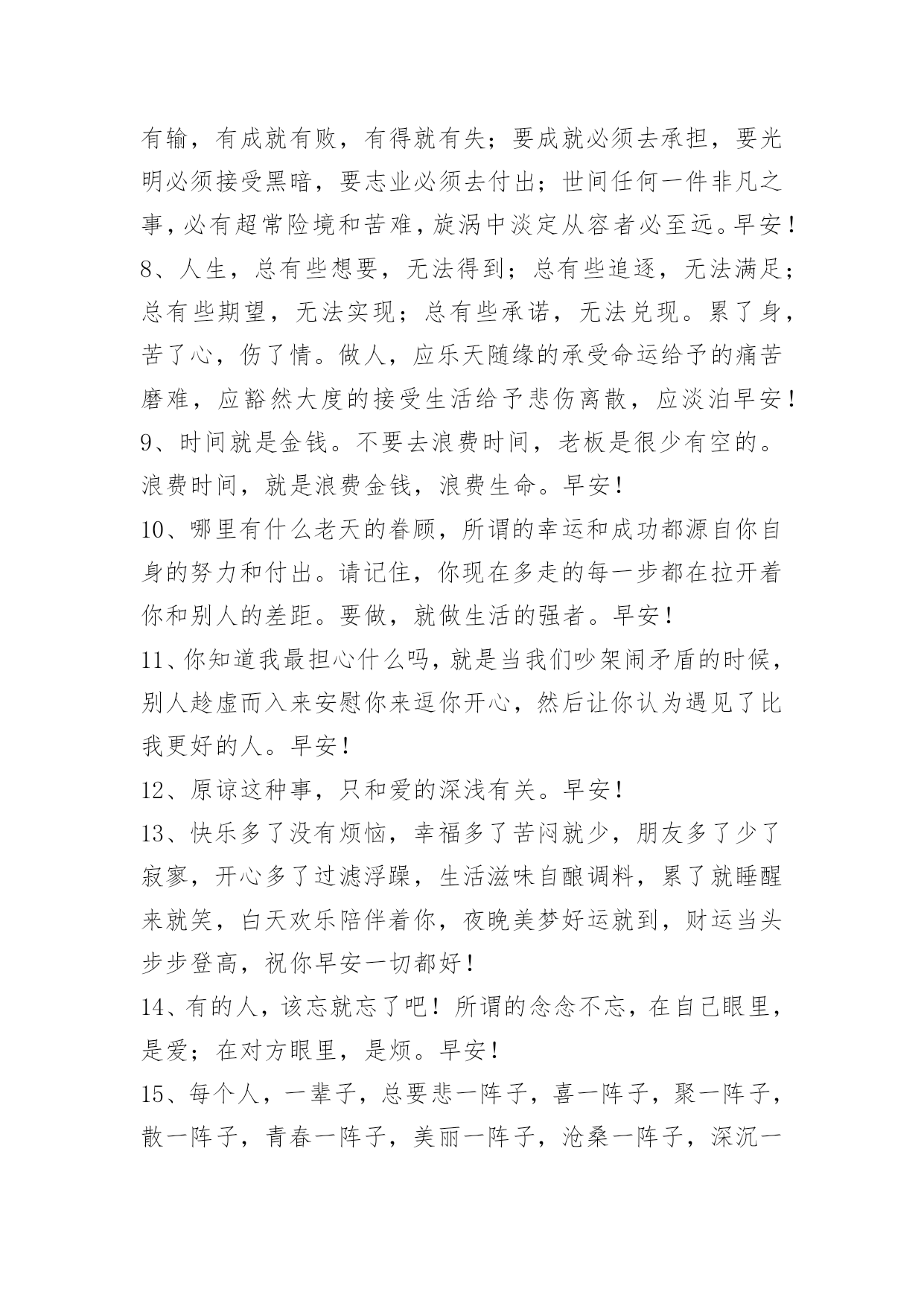 新版早安问候语语录26条 精选新版早安问候语语录26条只要你畅开心扉去迎接新的生活和经历,哪怕有所疼痛都是值得的!早安!下面是小编为大家推荐的新版早安问候语26条,仅供参考,欢迎大家阅读。1、人生没有捷径。唯一的捷径是从一开始就知道没有捷径,踏实付出坚持到底。等到别人试过数条捷径最终失败,你已经走过花开,结出果实。早安,有梦想的孩子,清晨令一天变得更长。2、人心像做面团一样,揉搓劲越大,韧性越强;人性像皮球一样,打击力越大,跳得越高。早安!3、通宵复习是因为平时没有努力学习,拼命减肥是因为吃零食从来不会控制,分手了才开始后悔是因为之前不懂珍惜。于是,别人开始钦佩你的勤劳,同情你的遭遇,可是只有你知道,你所有的痛苦都是罪有应得。早安!4、有时候最简单的渴望,却成了最遥不可及的奢求。早安!5、不能因为第一次飞翔遇到了乌云风暴,从此就怀疑有蓝天彩霞。早安!6、只要有你在,什么样的未来我都想要,因为你有,就是幸福。早安,八月!7、有苦有乐的人生是充实的;有成有败的人生是合理的;有得有失的人生是公平的;人生坎坷不平才有价值。有赢就有输,有成就有败,有得就有失;要成就必须去承担,要光明必须接受黑暗,要志业必须去付出;世间任何一件非凡之事,必有超常险境和苦难,旋涡中淡定从容者必至远。早安!8、人生,总有些想要,无法得到;总有些追逐,无法满足;总有些期望,无法实现;总有些承诺,无法兑现。累了身,苦了心,伤了情。做人,应乐天随缘的承受命运给予的痛苦磨难,应豁然大度的接受生活给予悲伤离散,应淡泊早安!9、时间就是金钱。不要去浪费时间,老板是很少有空的。浪费时间,就是浪费金钱,浪费生命。早安!10、哪里有什么老天的眷顾,所谓的幸运和成功都源自你自身的努力和付出。请记住,你现在多走的每一步都在拉开着你和别人的差距。要做,就做生活的强者。早安!11、你知道我最担心什么吗,就是当我们吵架闹矛盾的时候,别人趁虚而入来安慰你来逗你开心,然后让你认为遇见了比我更好的人。早安!12、原谅这种事,只和爱的深浅有关。早安!13、快乐多了没有烦恼,幸福多了苦闷就少,朋友多了少了寂寥,开心多了过滤浮躁,生活滋味自酿调料,累了就睡醒来就笑,白天欢乐陪伴着你,夜晚美梦好运就到,财运当头步步登高,祝你早安一切都好!14、有的人,该忘就忘了吧!所谓的念念不忘,在自己眼里,是爱;在对方眼里,是烦。早安!15、每个人,一辈子,总要悲一阵子,喜一阵子,聚一阵子,散一阵子,青春一阵子,美丽一阵子,沧桑一阵子,深沉一阵子,幼稚一阵子,成熟一阵子,烦恼一阵子,艰辛一阵子,痛苦一阵子,幸福一阵子。早安!16、我好想找一个人懂我,好想好想,其实我的要求并不高,并不高,只要有那么一点点就行,就行。早安!17、快乐,不是拥有的多,而是计较的少。人生要用简单的心境,对待复杂的人生,谁也不知道明天会发生什么,人活着不要后悔,就像不能让昨天回来一样,感谢昨天,昨日的种种都是经历。经历不讲成功与失败,经历不分值得与不值得。早安!18、人生的路上,如果缺少体谅,不能理解,没有谦让,日子就会越过越烦恼。乐观豁达的人,能把平凡的生活变得富有情趣,能把苦难的日子变得甜美珍贵,能把繁琐的事情变得简单可行。平常心看世界,花谢皆风景。幸福与快乐的秘诀在于:要看到拥有的那一半,并享受已有的那一半。早安!19、你要搞清楚,是你喜欢对方,不是对方喜欢你,你既然主动了,就算受了天大的委屈,也应该是你预料中的事,怪不了任何人,有勇气追求喜欢,谁叫你有本事喜欢人家,没本事让人家喜欢你。早安!20、这个世界最强大的人,不是超人,而是一百次被打倒还要一百零一次爬起来面对的人。因为前者只是强大,而后者是无畏。相比起来,无畏比强大更容易让人的心性强悍。早安!21、过去的没办法改变,但未来还在你的掌握之中。早安!22、[xx]岁时你不漂亮,可以怪罪于母亲没有遗传好的容貌;但是[xx]岁了依然不漂亮,就只能责怪自己,因为在那么漫长的日子里,你没有往生命里注入新的东西。早安!23、我不愿意踏着青石板唱歌,因为那坑坑洼洼的表面,一如我心底失去的信心般,满目疮痍。早安!24、对爱情还是保持点儿洁癖,不随便开始,不急着妥协。早安!25、会有那么一人,也许匆匆一瞥,也许旅人,又或许路人。看似不起眼,某个转角处,有天,会是命中注定。早安!26、你不努力,就得出局,新的一天,开始奋斗了,早安!