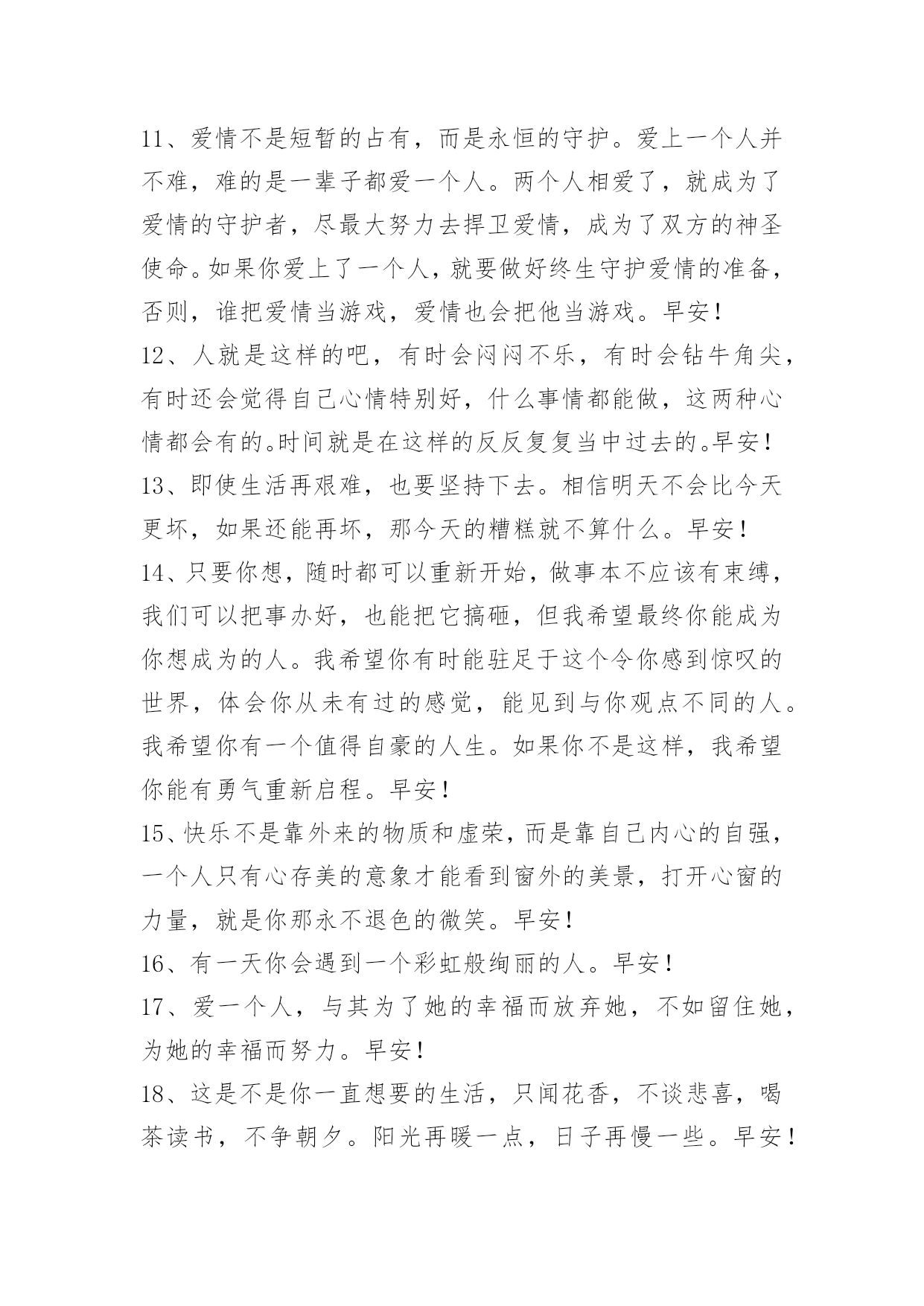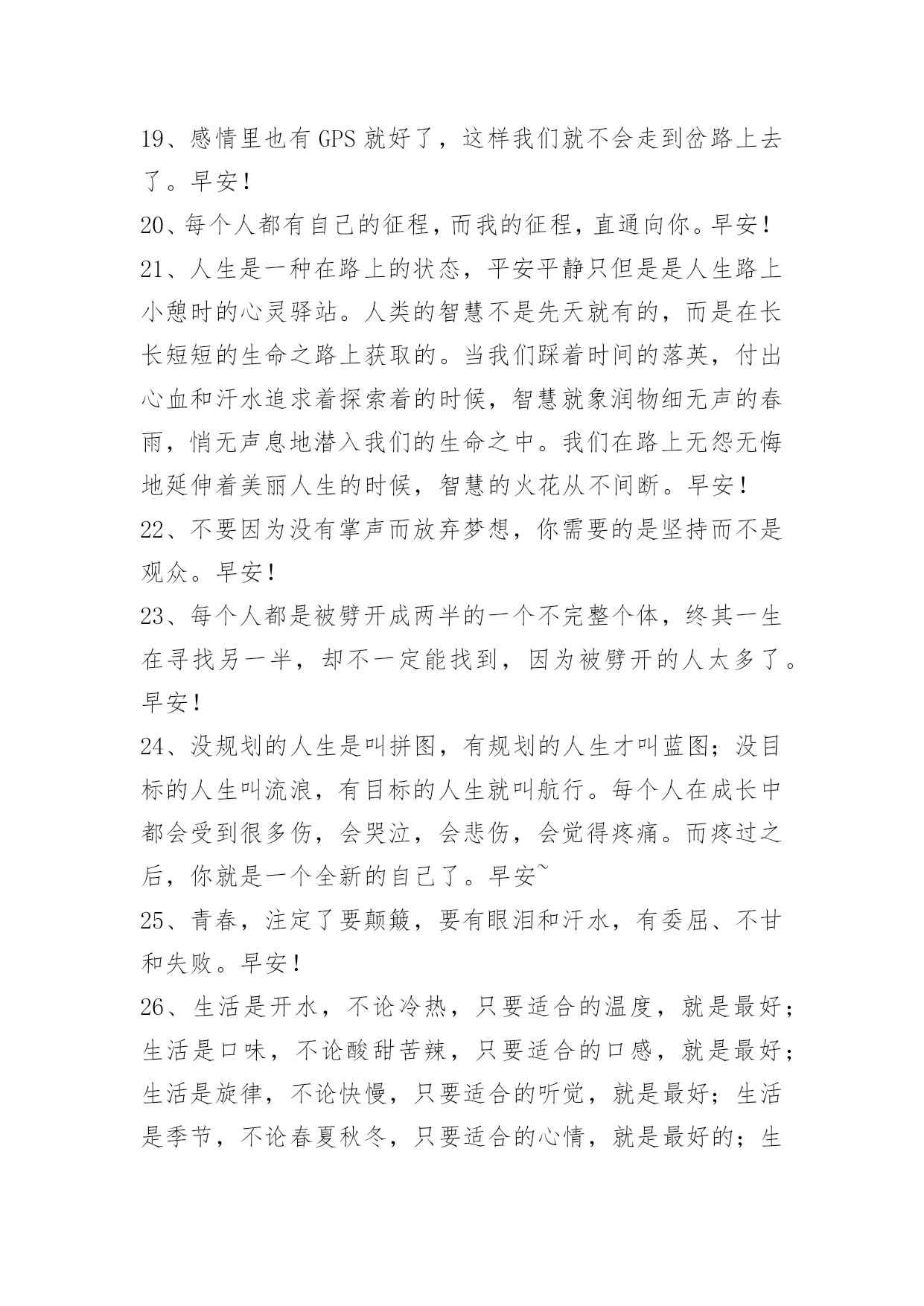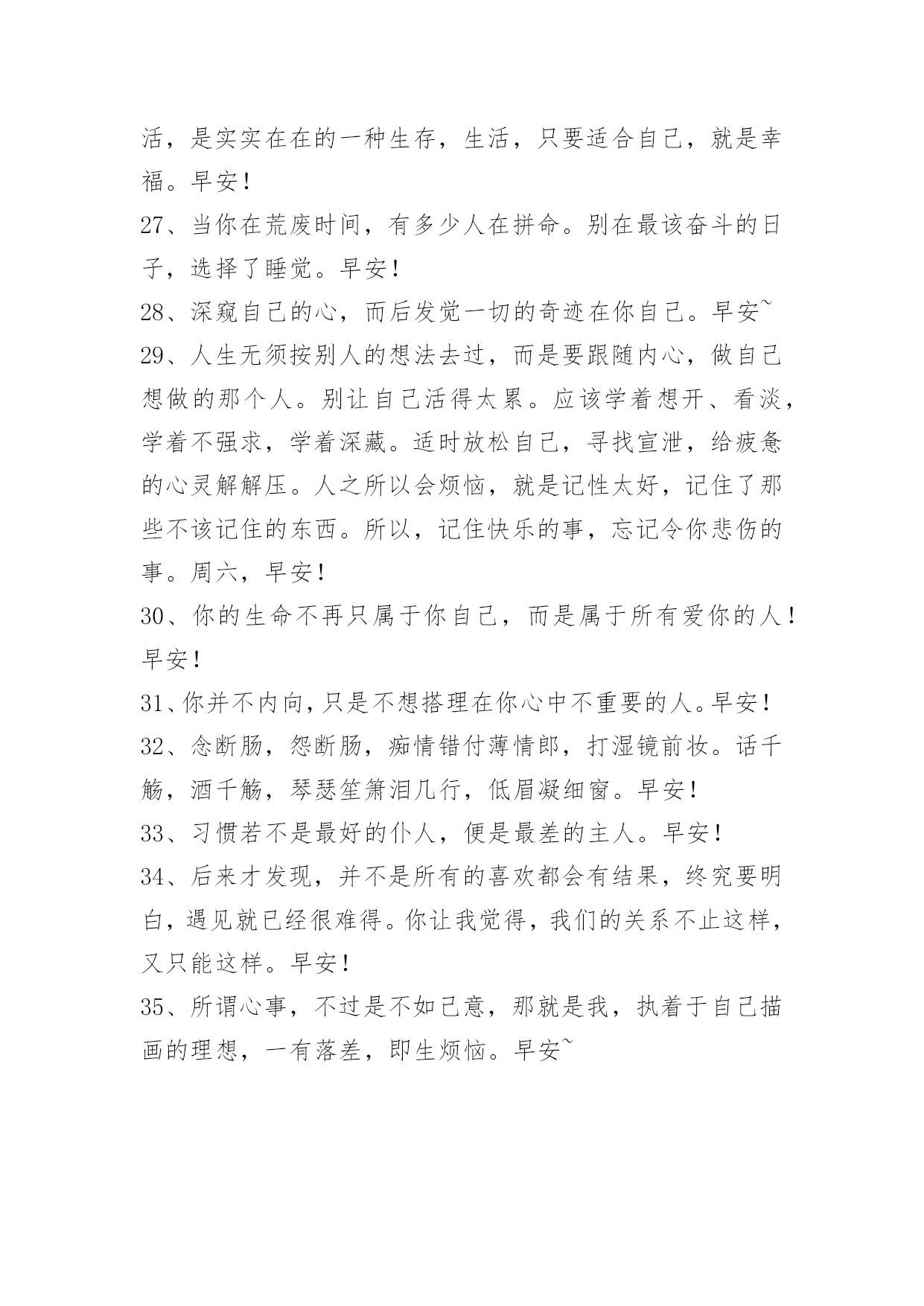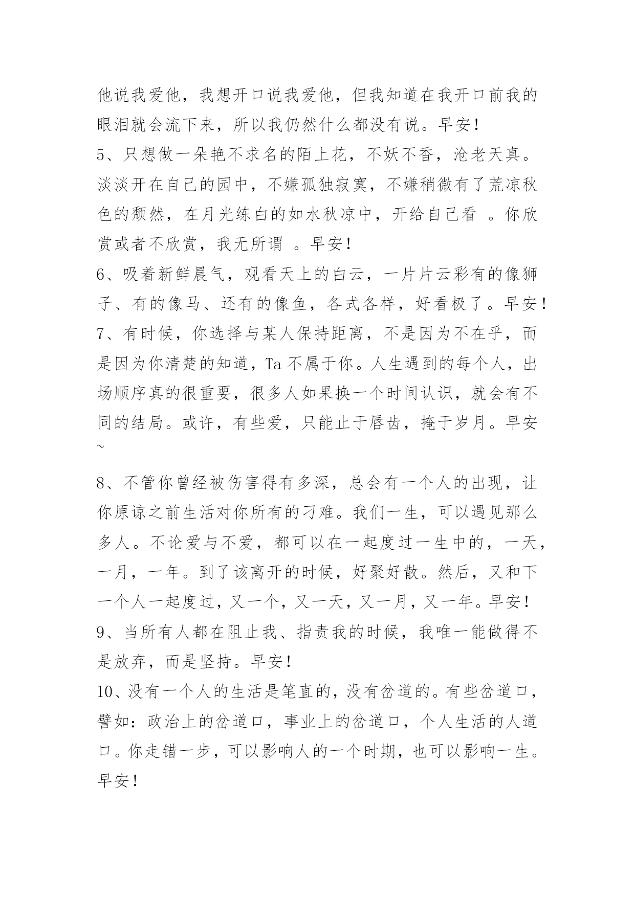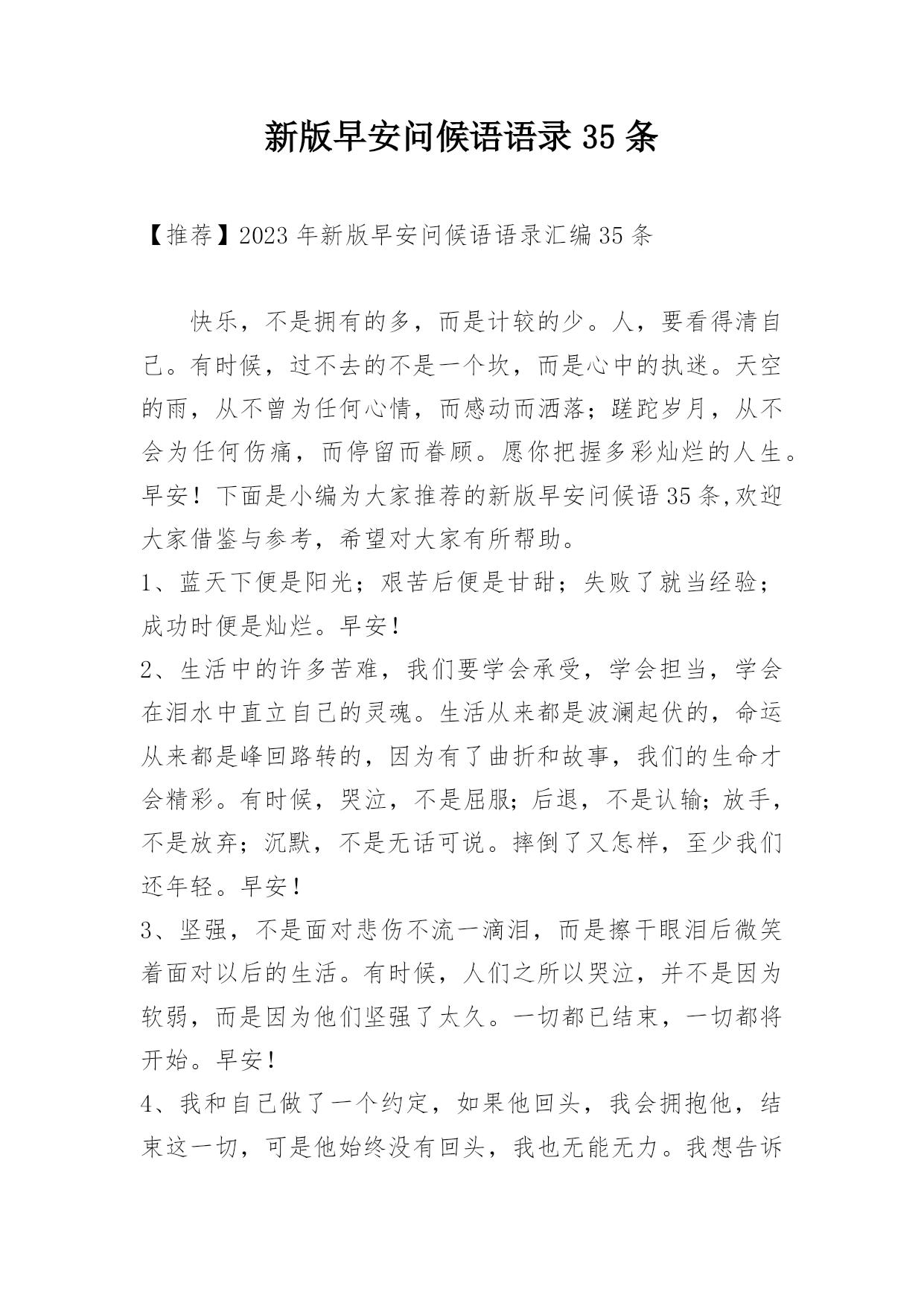 新版早安问候语语录35条 【推荐】2023年新版早安问候语语录汇编35条快乐,不是拥有的多,而是计较的少。人,要看得清自己。有时候,过不去的不是一个坎,而是心中的执迷。天空的雨,从不曾为任何心情,而感动而洒落;蹉跎岁月,从不会为任何伤痛,而停留而眷顾。愿你把握多彩灿烂的人生。早安!下面是小编为大家推荐的新版早安问候语35条,欢迎大家借鉴与参考,希望对大家有所帮助。1、蓝天下便是阳光;艰苦后便是甘甜;失败了就当经验;成功时便是灿烂。早安!2、生活中的许多苦难,我们要学会承受,学会担当,学会在泪水中直立自己的灵魂。生活从来都是波澜起伏的,命运从来都是峰回路转的,因为有了曲折和故事,我们的生命才会精彩。有时候,哭泣,不是屈服;后退,不是认输;放手,不是放弃;沉默,不是无话可说。摔倒了又怎样,至少我们还年轻。早安!3、坚强,不是面对悲伤不流一滴泪,而是擦干眼泪后微笑着面对以后的生活。有时候,人们之所以哭泣,并不是因为软弱,而是因为他们坚强了太久。一切都已结束,一切都将开始。早安!4、我和自己做了一个约定,如果他回头,我会拥抱他,结束这一切,可是他始终没有回头,我也无能无力。我想告诉他说我爱他,我想开口说我爱他,但我知道在我开口前我的眼泪就会流下来,所以我仍然什么都没有说。早安!5、只想做一朵艳不求名的陌上花,不妖不香,沧老天真。淡淡开在自己的园中,不嫌孤独寂寞,不嫌稍微有了荒凉秋色的颓然,在月光练白的如水秋凉中,开给自己看。你欣赏或者不欣赏,我无所谓。早安!6、吸着新鲜晨气,观看天上的白云,一片片云彩有的像狮子、有的像马、还有的像鱼,各式各样,好看极了。早安!7、有时候,你选择与某人保持距离,不是因为不在乎,而是因为你清楚的知道,Ta不属于你。人生遇到的每个人,出场顺序真的很重要,很多人如果换一个时间认识,就会有不同的结局。或许,有些爱,只能止于唇齿,掩于岁月。早安~8、不管你曾经被伤害得有多深,总会有一个人的出现,让你原谅之前生活对你所有的刁难。我们一生,可以遇见那么多人。不论爱与不爱,都可以在一起度过一生中的,一天,一月,一年。到了该离开的时候,好聚好散。然后,又和下一个人一起度过,又一个,又一天,又一月,又一年。早安!9、当所有人都在阻止我、指责我的时候,我唯一能做得不是放弃,而是坚持。早安!10、没有一个人的生活是笔直的,没有岔道的。有些岔道口,譬如:政治上的岔道口,事业上的岔道口,个人生活的人道口。你走错一步,可以影响人的一个时期,也可以影响一生。早安!11、爱情不是短暂的占有,而是永恒的守护。爱上一个人并不难,难的是一辈子都爱一个人。两个人相爱了,就成为了爱情的守护者,尽最大努力去捍卫爱情,成为了双方的神圣使命。如果你爱上了一个人,就要做好终生守护爱情的准备,否则,谁把爱情当游戏,爱情也会把他当游戏。早安!12、人就是这样的吧,有时会闷闷不乐,有时会钻牛角尖,有时还会觉得自己心情特别好,什么事情都能做,这两种心情都会有的。时间就是在这样的反反复复当中过去的。早安!13、即使生活再艰难,也要坚持下去。相信明天不会比今天更坏,如果还能再坏,那今天的糟糕就不算什么。早安!14、只要你想,随时都可以重新开始,做事本不应该有束缚,我们可以把事办好,也能把它搞砸,但我希望最终你能成为你想成为的人。我希望你有时能驻足于这个令你感到惊叹的世界,体会你从未有过的感觉,能见到与你观点不同的人。我希望你有一个值得自豪的人生。如果你不是这样,我希望你能有勇气重新启程。早安!15、快乐不是靠外来的物质和虚荣,而是靠自己内心的自强,一个人只有心存美的意象才能看到窗外的美景,打开心窗的力量,就是你那永不退色的微笑。早安!16、有一天你会遇到一个彩虹般绚丽的人。早安!17、爱一个人,与其为了她的幸福而放弃她,不如留住她,为她的幸福而努力。早安!18、这是不是你一直想要的生活,只闻花香,不谈悲喜,喝茶读书,不争朝夕。阳光再暖一点,日子再慢一些。早安!19、感情里也有GPS就好了,这样我们就不会走到岔路上去了。早安!20、每个人都有自己的征程,而我的征程,直通向你。早安!21、人生是一种在路上的状态,平安平静只但是是人生路上小憩时的心灵驿站。人类的智慧不是先天就有的,而是在长长短短的生命之路上获取的。当我们踩着时间的落英,付出心血和汗水追求着探索着的时候,智慧就象润物细无声的春雨,悄无声息地潜入我们的生命之中。我们在路上无怨无悔地延伸着美丽人生的时候,智慧的火花从不间断。早安!22、不要因为没有掌声而放弃梦想,你需要的是坚持而不是观众。早安!23、每个人都是被劈开成两半的一个不完整个体,终其一生在寻找另一半,却不一定能找到,因为被劈开的人太多了。早安!24、没规划的人生是叫拼图,有规划的人生才叫蓝图;没目标的人生叫流浪,有目标的人生就叫航行。每个人在成长中
