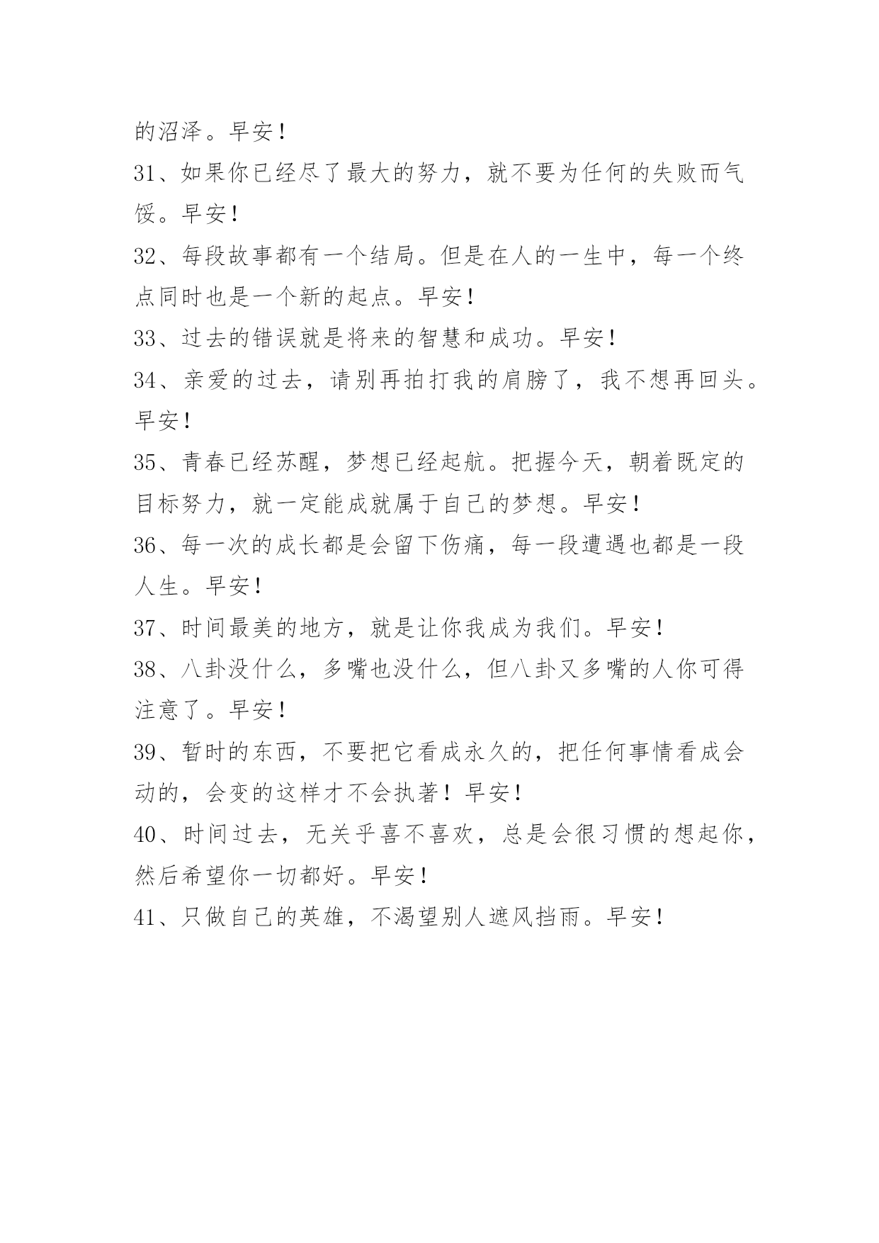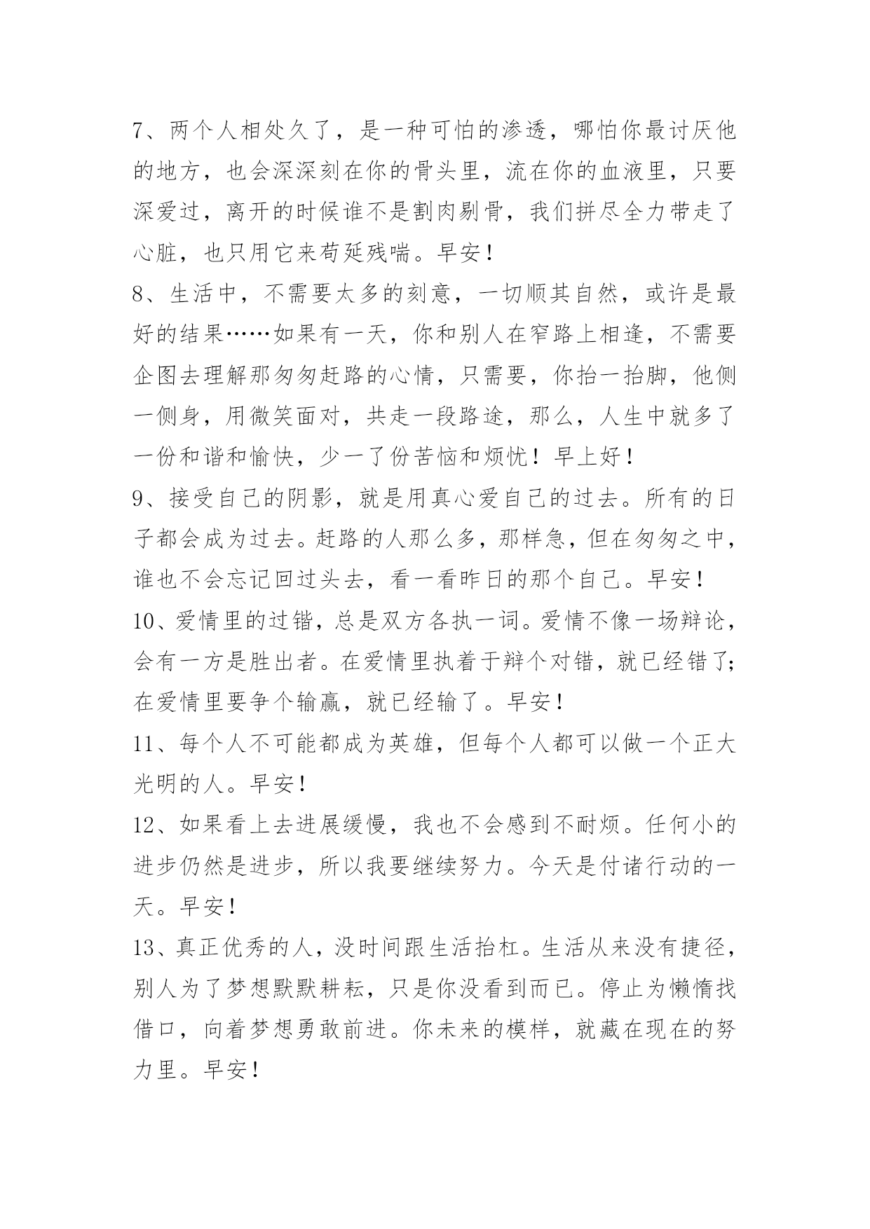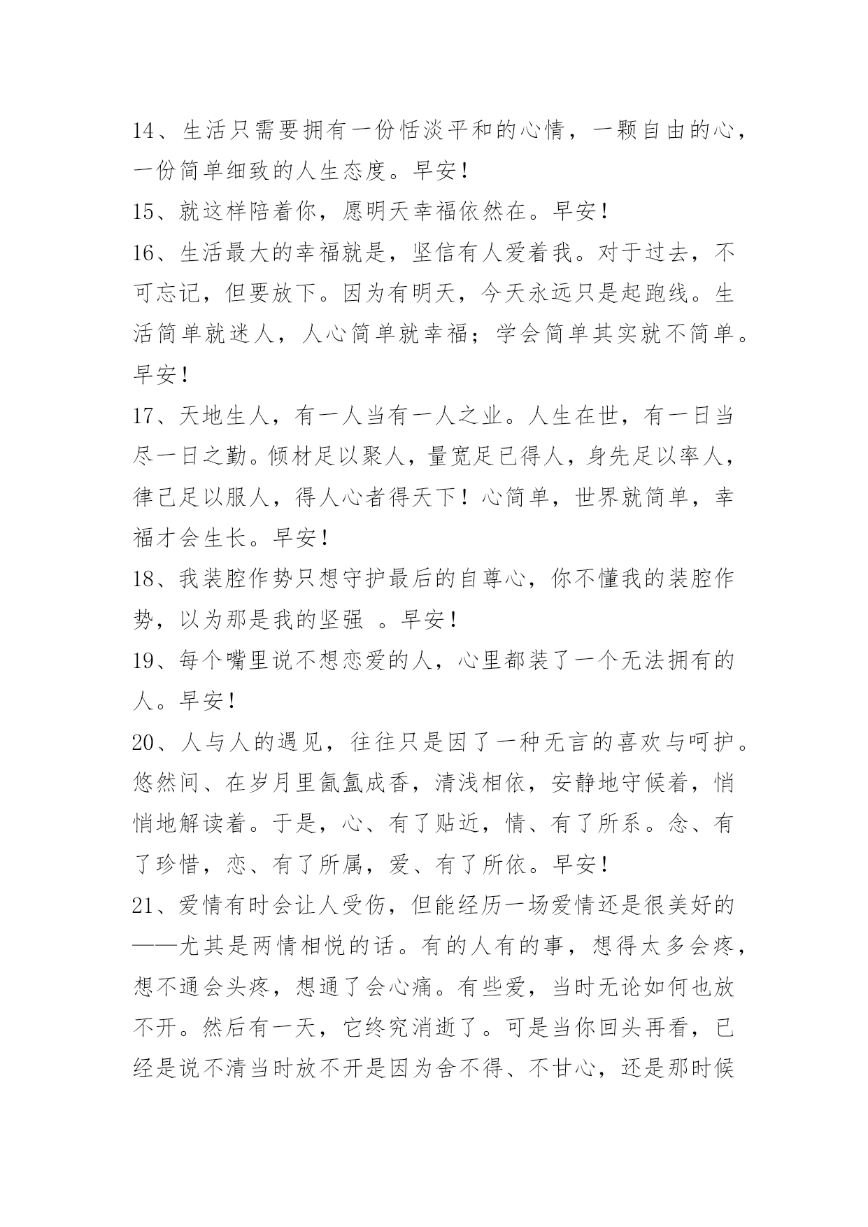 新版早安问候语语录41条 2023年常用新版早安问候语语录41条我主动,你不主动,你不主动,我也不主动,很多关系就这样,然后就没有然后了。早安!下面是小编给各位读者分享的新版早安问候语41条,希望对大家有所帮助。1、我就是这样一个人,从一开始就决心,不要抱太大期望,不要有过高期许,不要以为事情能成功,不要觉得很多人都喜欢你——不会的,没有。我们都是必须靠能靠自己埋头苦干去换来一些价值的人。早安!2、人的一生,经历才是最重要的!成功的经历,鼓舞我再接再厉;失败的经历,激励我必须努力。而一次次的失败与成功,我们才能认识自己,才能真正成长!早安。3、我也有我的骄傲,我的自尊,不应该为某人把这一切都放弃掉。早安!4、你划定的楚河汉界,我不敢轻易犯规,爱你爱到妥协。你前进,看着你背影,就足够世界无条件的放晴。静者恒静,就让我的心安静地守着你,我愿给你幸福不灭的定理。早安!5、人生不过如此,且行且珍惜,每一次的失败,都是成功的伏笔;每一次的考验,都有一份收获;每一次的泪水,都有一次醒悟;每一次的磨难,都有生命的财富。早安!6、没有谁的人生注定糟糕,也没有谁的未来注定荒芜。脚下的路,要自己一步步走出来才踏实!早安!7、两个人相处久了,是一种可怕的渗透,哪怕你最讨厌他的地方,也会深深刻在你的骨头里,流在你的血液里,只要深爱过,离开的时候谁不是割肉剔骨,我们拼尽全力带走了心脏,也只用它来苟延残喘。早安!8、生活中,不需要太多的刻意,一切顺其自然,或许是最好的结果……如果有一天,你和别人在窄路上相逢,不需要企图去理解那匆匆赶路的心情,只需要,你抬一抬脚,他侧一侧身,用微笑面对,共走一段路途,那么,人生中就多了一份和谐和愉快,少一了份苦恼和烦忧!早上好!9、接受自己的阴影,就是用真心爱自己的过去。所有的日子都会成为过去。赶路的人那么多,那样急,但在匆匆之中,谁也不会忘记回过头去,看一看昨日的那个自己。早安!10、爱情里的过锴,总是双方各执一词。爱情不像一场辩论,会有一方是胜出者。在爱情里执着于辩个对错,就已经错了;在爱情里要争个输赢,就已经输了。早安!11、每个人不可能都成为英雄,但每个人都可以做一个正大光明的人。早安!12、如果看上去进展缓慢,我也不会感到不耐烦。任何小的进步仍然是进步,所以我要继续努力。今天是付诸行动的一天。早安!13、真正优秀的人,没时间跟生活抬杠。生活从来没有捷径,别人为了梦想默默耕耘,只是你没看到而已。停止为懒惰找借口,向着梦想勇敢前进。你未来的模样,就藏在现在的努力里。早安!14、生活只需要拥有一份恬淡平和的心情,一颗自由的心,一份简单细致的人生态度。早安!15、就这样陪着你,愿明天幸福依然在。早安!16、生活最大的幸福就是,坚信有人爱着我。对于过去,不可忘记,但要放下。因为有明天,今天永远只是起跑线。生活简单就迷人,人心简单就幸福;学会简单其实就不简单。早安!17、天地生人,有一人当有一人之业。人生在世,有一日当尽一日之勤。倾材足以聚人,量宽足已得人,身先足以率人,律己足以服人,得人心者得天下!心简单,世界就简单,幸福才会生长。早安!18、我装腔作势只想守护最后的自尊心,你不懂我的装腔作势,以为那是我的坚强。早安!19、每个嘴里说不想恋爱的人,心里都装了一个无法拥有的人。早安!20、人与人的遇见,往往只是因了一种无言的喜欢与呵护。悠然间、在岁月里氤氲成香,清浅相依,安静地守候着,悄悄地解读着。于是,心、有了贴近,情、有了所系。念、有了珍惜,恋、有了所属,爱、有了所依。早安!21、爱情有时会让人受伤,但能经历一场爱情还是很美好的——尤其是两情相悦的话。有的人有的事,想得太多会疼,想不通会头疼,想通了会心痛。有些爱,当时无论如何也放不开。然后有一天,它终究消逝了。可是当你回头再看,已经是说不清当时放不开是因为舍不得、不甘心,还是那时候到底是太年轻了。早安!22、以前觉得自己性格能和很多人合的来,什么样的朋友都能结交;后来明白结交朋友或许不难,难的是变成知己。人与人之间真的有磁场这回事,一接触就能感觉出来。有些人能和你一见如故,有些人和你永远不会深交。不是不好,只是磁场不合。所以能遇到对味的人,真的挺幸运的,感谢相遇吧。早安!23、生命的绳索,用力握住,希望掌握在自己手里。早安!24、寻觅故地,追思风月,匆匆一眼千年人事,几个世纪就在一眼间往返,那铭刻在世人眼中的往事,在我的眼里已物是人非,那消失不见的背影,怎么也不能飞越,模糊而留下的华丽,只能是代价的走向,哽在喉咙,欲诉不能,欲哭不泪。早安!25、没有什么过不去的心事,只是看你愿不愿意过去。早安!26、不去追逐你所渴求,你将永远不会拥有。不往前走,就将永远停留在原地。早安!27、你不是担心没有人爱你,你担心的是没有人用你要的方式爱你,到头来你会发现:没有人能以你想要的方