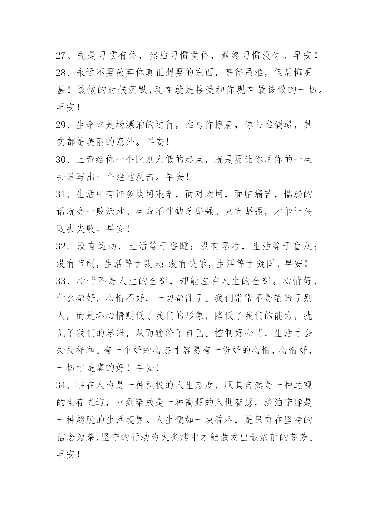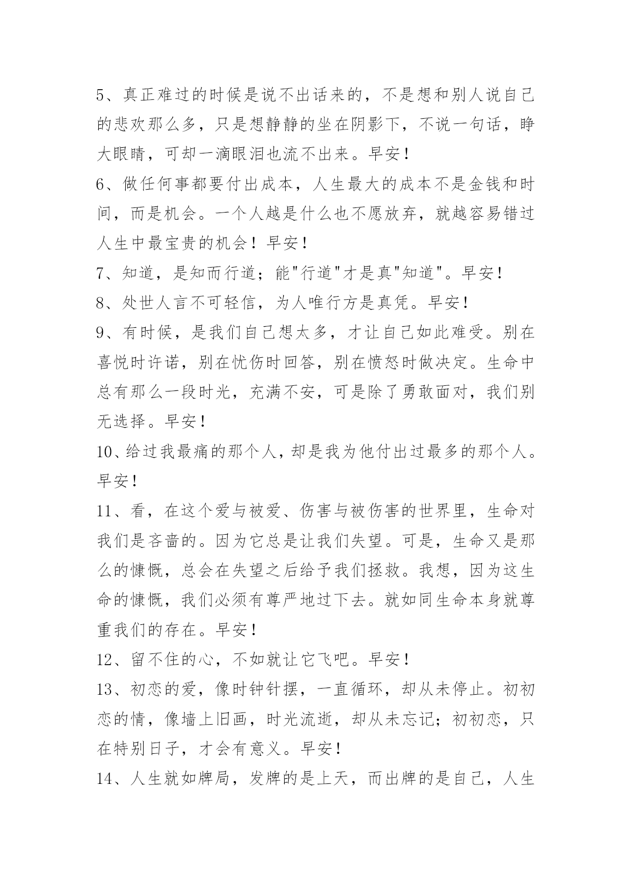 新版早安问候语语录39条 【热门】新版早安问候语语录39条不管发生什么,都不要放弃,坚持走下去,肯定会有意想不到的风景。也许不是你本来想走的路,也不是你本来想登临的山顶,可另一条路有另一条路的风景,不同的山顶也一样会有美丽的日出。朋友早安!以下是小编为大家收集的新版早安问候语39条,希望大家喜欢。1、当初有些事,让我们刻骨铭心;曾经有些人,令我们难以释怀。我们一路走来,告别一段往事,走入下一段风景。路在延伸,风景在变幻,人生没有不变的永恒。生命的精彩,以一种无法想象的形式展现出来,我们只能描摹。早安!2、人最多情,也最无情。爱的时候海誓山盟,许下天荒地老。厌的时候,恨不能立刻从生命中抽离,一刀两断,再无瓜葛。早安!3、其实我们缺乏的不是够好够对够靠谱的那个人,而是最后的最后,大家变成了彼此都需要的那一个人。如果你给他多一点时间,他也多给你一点时间,多好。来,我们来谈一场不赶时间的恋爱。早安!4、两个人在一起久了,就像左手和右手,即使不再相爱也会选择相守。因为放弃这么多年的时光需要很大的勇气。也许生命中会出现你爱的人,但那终归是过客,你还是会牵着你的左手或者右手一直走下去,幸福真的和爱情无关。早安!5、真正难过的时候是说不出话来的,不是想和别人说自己的悲欢那么多,只是想静静的坐在阴影下,不说一句话,睁大眼睛,可却一滴眼泪也流不出来。早安!6、做任何事都要付出成本,人生最大的成本不是金钱和时间,而是机会。一个人越是什么也不愿放弃,就越容易错过人生中最宝贵的机会!早安!7、知道,是知而行道;能"行道"才是真"知道"。早安!8、处世人言不可轻信,为人唯行方是真凭。早安!9、有时候,是我们自己想太多,才让自己如此难受。别在喜悦时许诺,别在忧伤时回答,别在愤怒时做决定。生命中总有那么一段时光,充满不安,可是除了勇敢面对,我们别无选择。早安!10、给过我最痛的那个人,却是我为他付出过最多的那个人。早安!11、看,在这个爱与被爱、伤害与被伤害的世界里,生命对我们是吝啬的。因为它总是让我们失望。可是,生命又是那么的慷慨,总会在失望之后给予我们拯救。我想,因为这生命的慷慨,我们必须有尊严地过下去。就如同生命本身就尊重我们的存在。早安!12、留不住的心,不如就让它飞吧。早安!13、初恋的爱,像时钟针摆,一直循环,却从未停止。初初恋的情,像墙上旧画,时光流逝,却从未忘记;初初恋,只在特别日子,才会有意义。早安!14、人生就如牌局,发牌的是上天,而出牌的是自己,人生的航船要靠自己掌舵,只有高高扬起自信的风帆,乘风破浪,勇敢前行,穿越层层险滩暗礁,才会抵达成功的彼岸。早安!15、人之所以快乐,并不是因为拥有的多,而是因为计较的少。乐观的心态来自宽容,来自大度,来自善解人意,来自与世无争。人生没有完美,想通了,想开了就是完美。早安!16、我们应该常常反省自己:我有爱心,但是有没有发挥出来呢?我的言语行动是否有失检点呢?如能常常检讨、反省,不让行为、观念有所偏差,就绝对不会发生缺失过错。早安!17、生活中,在现实中,纷争的解决不会这么简单。但是,倘若没有这样一种终极眼光,人类就会迷失方向,任何解决方式都只能是在错误的路上越走越远。早安!18、故事开头总是这样,适逢其会,猝不及防。故事的结局总是这样,花开两朵,天各一方。早安!19、短信到,早上好!知道你美梦还没做完,把你吵醒也别抱怨。揉揉迷茫的小眼,洗洗困倦的小脸,再吃顿美美的早饭,开始自己美好的一天20、在我的感情世界里,谢谢你曾经爱过我,也谢谢你不爱我!让我明白有的东西最终还是会输给时间。可是我还爱着你!看到现在你和你的那个她那么幸福,可能这才是你真正想要的吧!我不知道什么时候才会放下你,不打扰,是我爱你最后的方式!早安!21、生活一直都是美好的,虽然有辛苦的奔波,有人情的淡漠,也有偶尔的碰壁和受挫,有许许多多的痛和不幸,然而,这些都不能掩饰了生活的美好,生活中总有许多值得我们追求和向往的东西。早安!22、一定要学会化淡妆,能让自己有气质也是对人的一种尊重。早安!23、如果你是狮子,别人骂你是狗,你不会真的变成狗,故不用为此而生嗔;如果你是狗,别人赞叹你是狮子,你也不会真的变成狮子,故不必为此而生喜。所以,别人的赞叹,不会让你变好;别人的指责,也不会让你变坏,这些没什么可执着的。不要太在意别人的评价,只要做最好的自己。早安!24、有时候,明明自己身边很多朋友,却依然觉得孤单;有时候,走过熟悉的街角,看到熟悉的背影,突然就想起一个人的脸;有时候,突然很想哭,却难过的哭不出来;有时候,夜深人静的时候,突然觉得寂寞深入骨髓;有时候,突然找不到自己,把自己丢了。早安!25、过去的,就让它过吧,如果放下了,它仅仅是一段回忆。有些事情是急不来的,等到条件成熟时,自然水到渠成。世界上那些了不起的成就,大多是由耐心堆积