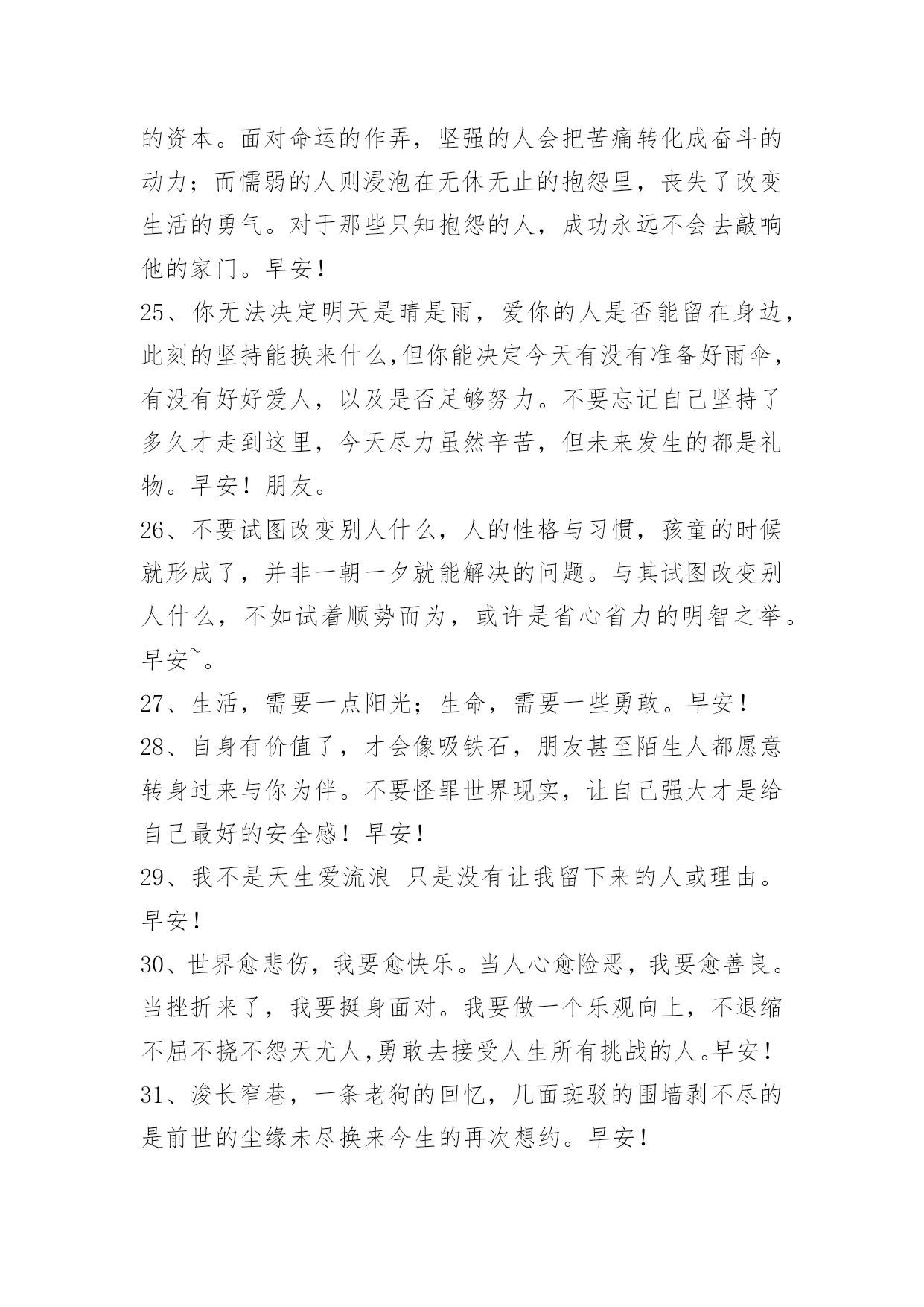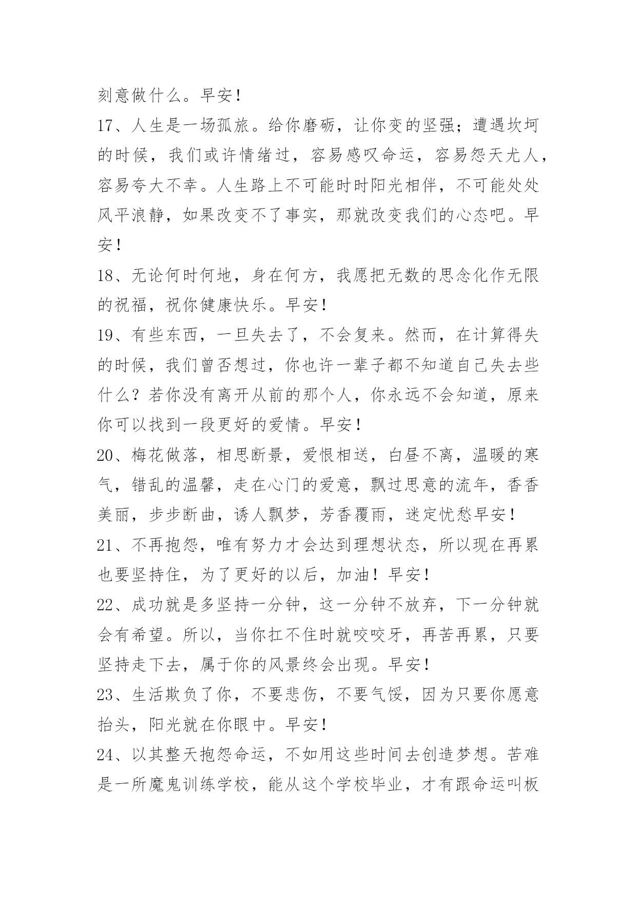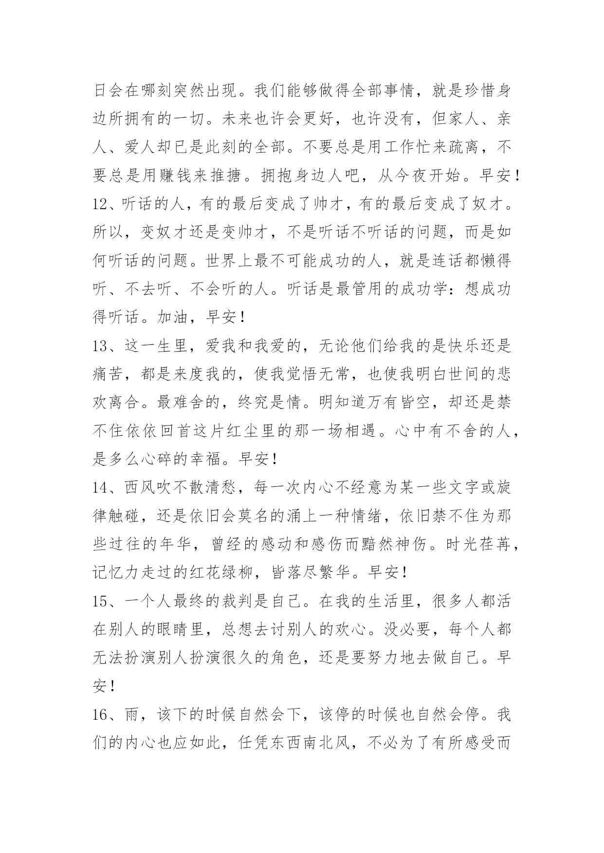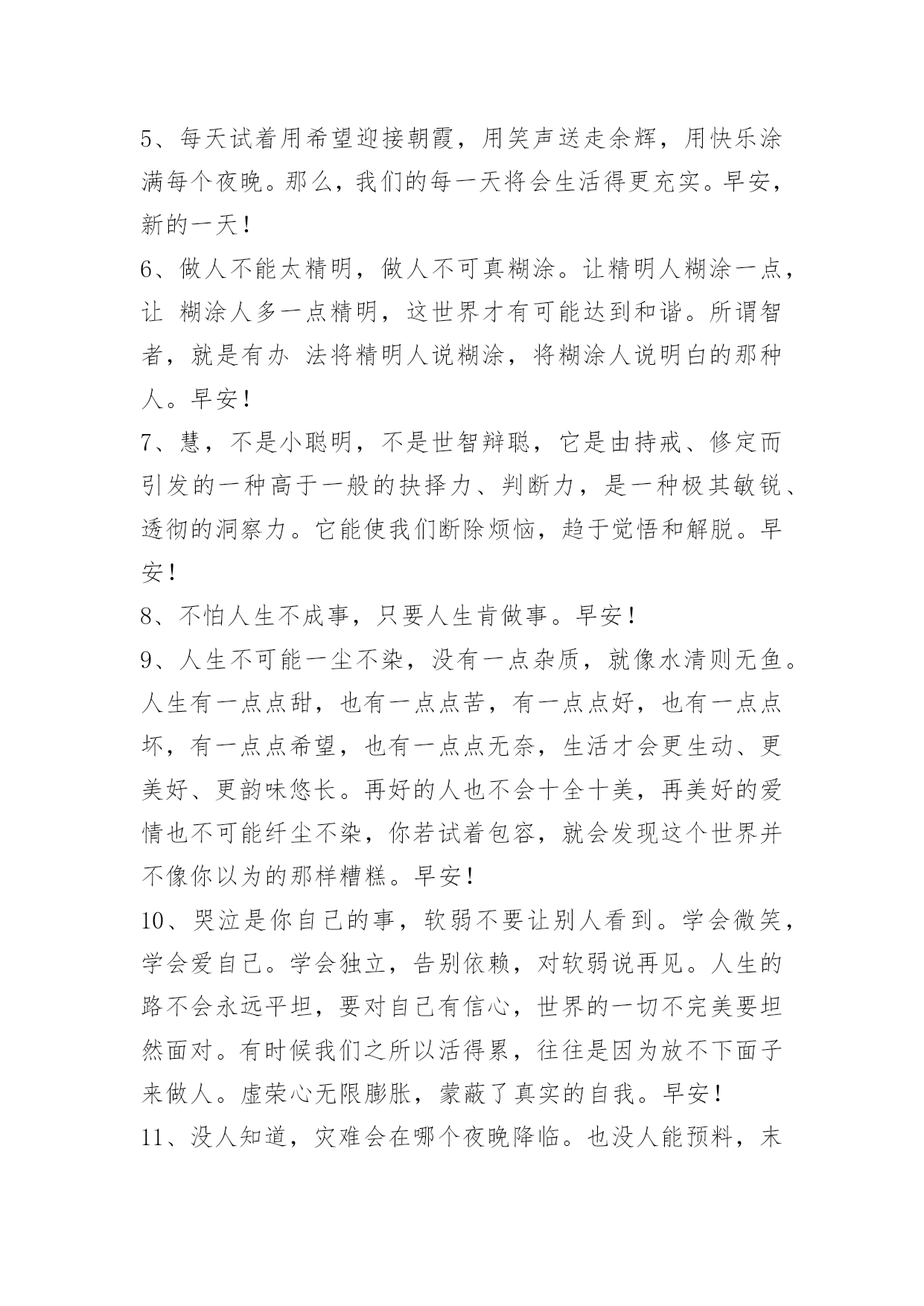 新版早安问候语语录45条 2023年通用新版早安问候语语录锦集45条生活是属于每个人自己的感受,不属于任何别人的看法。大家早安~以下是小编收集整理的新版早安问候语45条,欢迎阅读,希望能够对大家有所帮助。1、心善,自然美丽;心直,自然诚挚;心慈,自然柔和,心净,自然庄严。三千繁华,弹指刹那,百年过后,不过一捧黄沙。以岁月做笺,在时光的隧道中播种美好,欣然每一个日出,用心感悟,释然每一个日落,用心聆听,抖落岁月的尘埃,以一颗无尘的心,还原生命的本真,以一颗感恩的心对待生活中的所有。早安!2、送你颗星,早上舒心,出门顺心,路上小心,遇事耐心,做是细心,交友留心,待人诚心,回家开心,夜里安心,对自己有信心,对别人有爱心,祝你永远开心每一天!3、谁对时间吝啬,时间就对谁慷慨。要让时间不辜负你,首先你要不辜负时间。与其暮年礼赞人生,不如奋斗推迟暮年。早安!4、每天对自己说对他人说:我多么幸运!多么美丽!多么智慧!多么健康!多么富有!多么善良!世界多么美好!面对工作和问题,永远只说"好的!"、"没有问题!"、"一定会有办法!"不要怀疑,简单相信,只管这样去做!你一定会收获一个个人生的惊喜!早安!5、每天试着用希望迎接朝霞,用笑声送走余辉,用快乐涂满每个夜晚。那么,我们的每一天将会生活得更充实。早安,新的一天!6、做人不能太精明,做人不可真糊涂。让精明人糊涂一点,让糊涂人多一点精明,这世界才有可能达到和谐。所谓智者,就是有办法将精明人说糊涂,将糊涂人说明白的那种人。早安!7、慧,不是小聪明,不是世智辩聪,它是由持戒、修定而引发的一种高于一般的抉择力、判断力,是一种极其敏锐、透彻的洞察力。它能使我们断除烦恼,趋于觉悟和解脱。早安!8、不怕人生不成事,只要人生肯做事。早安!9、人生不可能一尘不染,没有一点杂质,就像水清则无鱼。人生有一点点甜,也有一点点苦,有一点点好,也有一点点坏,有一点点希望,也有一点点无奈,生活才会更生动、更美好、更韵味悠长。再好的人也不会十全十美,再美好的爱情也不可能纤尘不染,你若试着包容,就会发现这个世界并不像你以为的那样糟糕。早安!10、哭泣是你自己的事,软弱不要让别人看到。学会微笑,学会爱自己。学会独立,告别依赖,对软弱说再见。人生的路不会永远平坦,要对自己有信心,世界的一切不完美要坦然面对。有时候我们之所以活得累,往往是因为放不下面子来做人。虚荣心无限膨胀,蒙蔽了真实的自我。早安!11、没人知道,灾难会在哪个夜晚降临。也没人能预料,末日会在哪刻突然出现。我们能够做得全部事情,就是珍惜身边所拥有的一切。未来也许会更好,也许没有,但家人、亲人、爱人却已是此刻的全部。不要总是用工作忙来疏离,不要总是用赚钱来推搪。拥抱身边人吧,从今夜开始。早安!12、听话的人,有的最后变成了帅才,有的最后变成了奴才。所以,变奴才还是变帅才,不是听话不听话的问题,而是如何听话的问题。世界上最不可能成功的人,就是连话都懒得听、不去听、不会听的人。听话是最管用的成功学:想成功得听话。加油,早安!13、这一生里,爱我和我爱的,无论他们给我的是快乐还是痛苦,都是来度我的,使我觉悟无常,也使我明白世间的悲欢离合。最难舍的,终究是情。明知道万有皆空,却还是禁不住依依回首这片红尘里的那一场相遇。心中有不舍的人,是多么心碎的幸福。早安!14、西风吹不散清愁,每一次内心不经意为某一些文字或旋律触碰,还是依旧会莫名的涌上一种情绪,依旧禁不住为那些过往的年华,曾经的感动和感伤而黯然神伤。时光荏苒,记忆力走过的红花绿柳,皆落尽繁华。早安!15、一个人最终的裁判是自己。在我的生活里,很多人都活在别人的眼睛里,总想去讨别人的欢心。没必要,每个人都无法扮演别人扮演很久的角色,还是要努力地去做自己。早安!16、雨,该下的时候自然会下,该停的时候也自然会停。我们的内心也应如此,任凭东西南北风,不必为了有所感受而刻意做什么。早安!17、人生是一场孤旅。给你磨砺,让你变的坚强;遭遇坎坷的时候,我们或许情绪过,容易感叹命运,容易怨天尤人,容易夸大不幸。人生路上不可能时时阳光相伴,不可能处处风平浪静,如果改变不了事实,那就改变我们的心态吧。早安!18、无论何时何地,身在何方,我愿把无数的思念化作无限的祝福,祝你健康快乐。早安!19、有些东西,一旦失去了,不会复来。然而,在计算得失的时候,我们曾否想过,你也许一辈子都不知道自己失去些什么?若你没有离开从前的那个人,你永远不会知道,原来你可以找到一段更好的爱情。早安!20、梅花做落,相思断景,爱恨相送,白昼不离,温暖的寒气,错乱的温馨,走在心门的爱意,飘过思意的流年,香香美丽,步步断曲,诱人飘梦,芳香覆雨,迷定忧愁早安!21、不再抱怨,唯有努力才会达到理想状态,所以现在再累也要坚持住,为了更好的以后,加油!早安!22、成功就是多坚持一