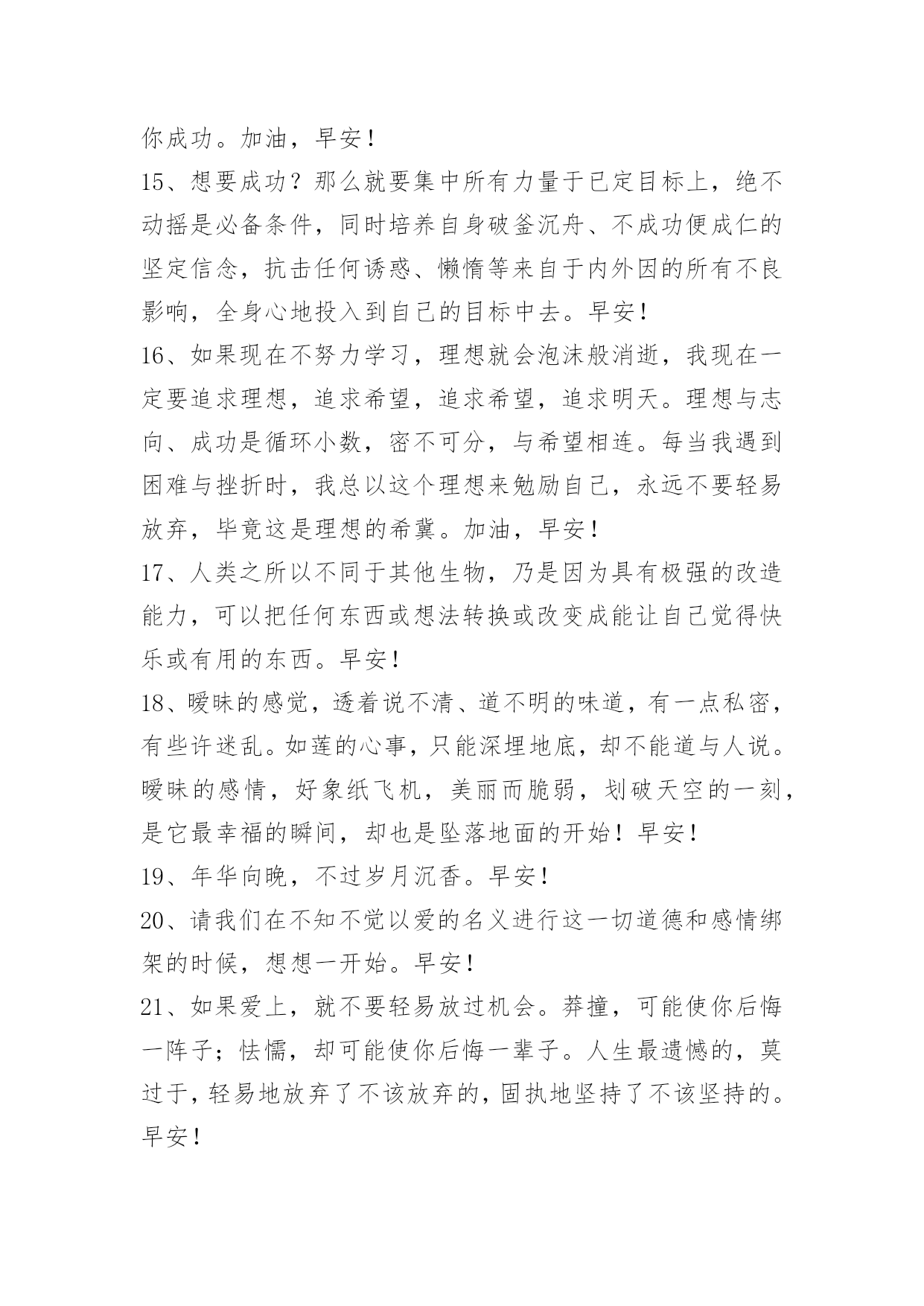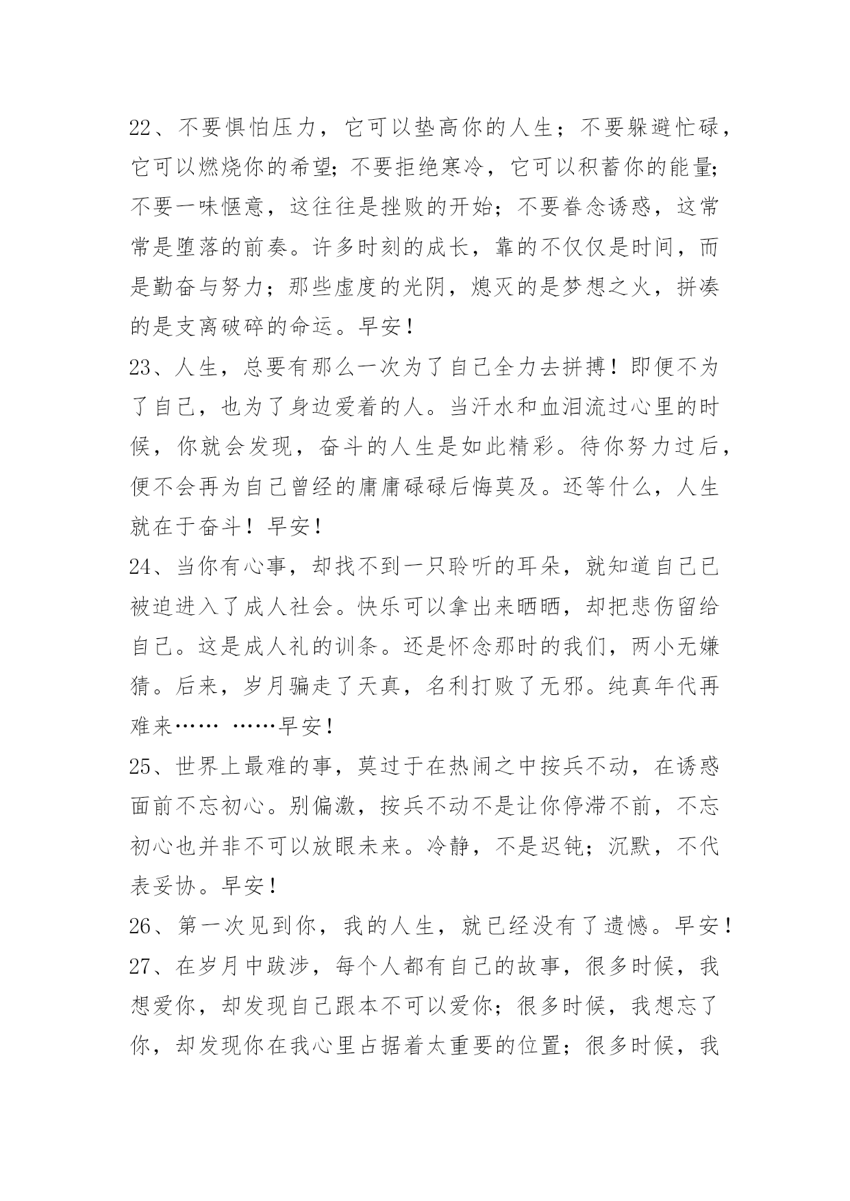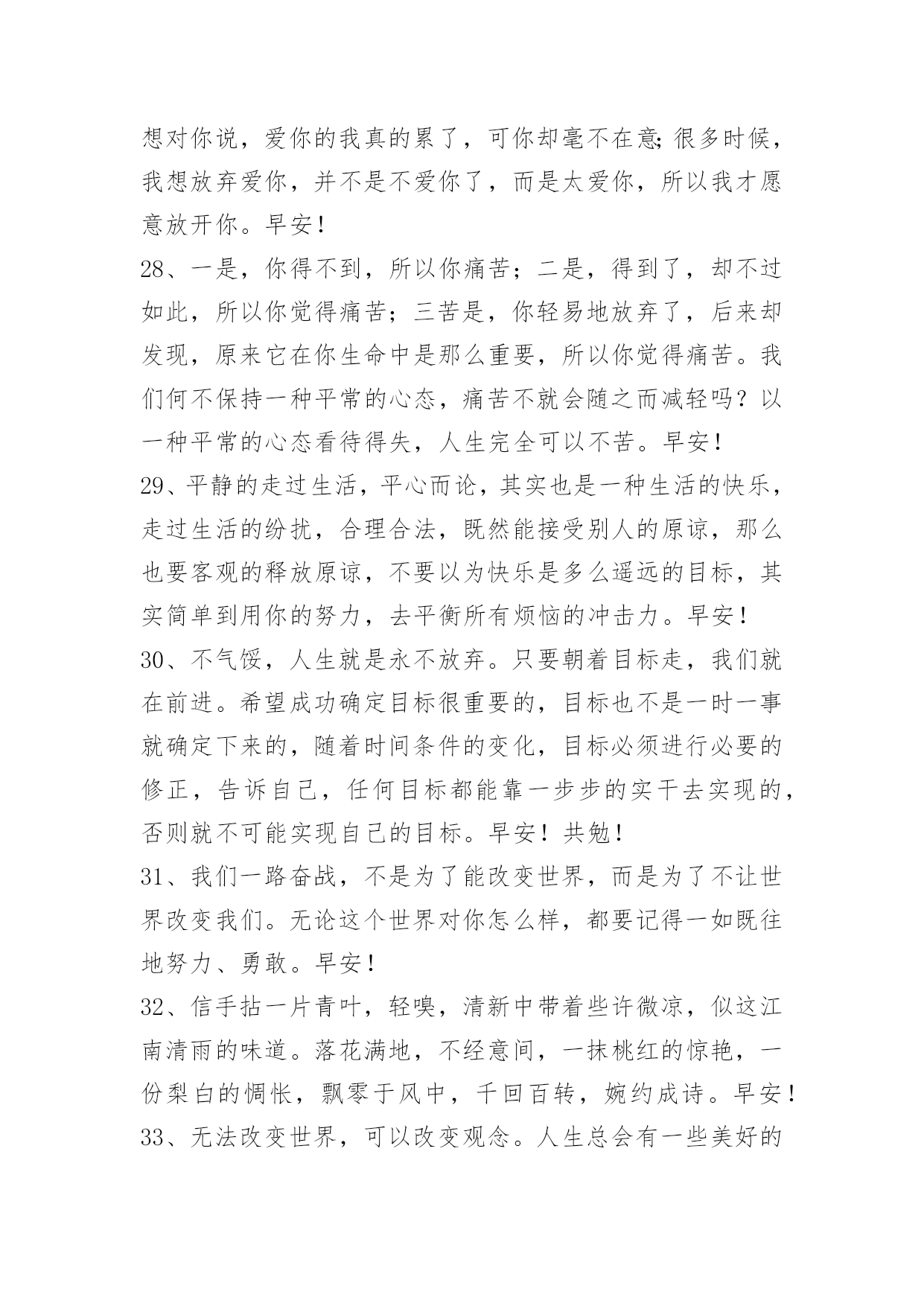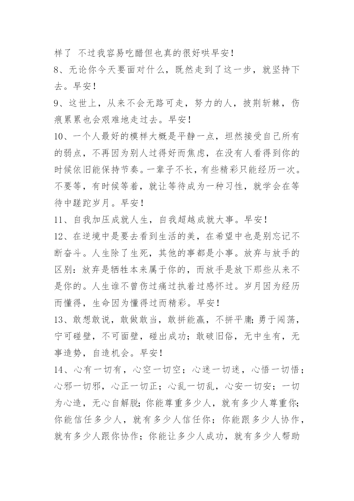 新版早安问候语语录47条 有关新版早安问候语语录合集47条听见起床铃神清气爽,常被小事情感动心底,敢爱又敢恨全部随性,辩证看自已不去攀比,不钻牛角尖妄自菲。早安!下面是小编为大家推荐的新版早安问候语47条,供各位参考。1、越长大越是越是小心翼翼,越是瞻前顾后,越是脆弱。早安!2、没有什么事情是简单简单的,唯有不断努力,才能更加顺利。早安!3、我们无法选择命运,我们唯一可以去选择的就是,当命运露出那狰狞的一面时,坦然无畏地活下去。早安!4、不是所有人都是真心,不要那么轻易的就相信。早安!5、一个人所说的话,是他价值观、格调及情绪的映射。喜欢说无聊话的人,会让听者觉得他素养不高,内心空虚,有意无意说挑拨之语的人,会让人认为他品质有问题。早安!6、一些美丽,只能尘封,细细品味,才能刻骨铭心;一些心事,只能珍藏,静默如花,才可闻其馨香;一些情怀,只能无言,放逐岁月,才会愈加清晰。早安!7、像我这种人吃醋了也不会告诉你要么就是对你说话很冲要么就是特别冷你能猜出来最好猜不出来我俩也就这样了不过我容易吃醋但也真的很好哄早安!8、无论你今天要面对什么,既然走到了这一步,就坚持下去。早安!9、这世上,从来不会无路可走,努力的人,披荆斩棘,伤痕累累也会艰难地走过去。早安!10、一个人最好的模样大概是平静一点,坦然接受自己所有的弱点,不再因为别人过得好而焦虑,在没有人看得到你的时候依旧能保持节奏。一辈子不长,有些精彩只能经历一次。不要等,有时候等着,就让等待成为一种习性,就学会在等待中蹉跎岁月。早安!11、自我加压成就人生,自我超越成就大事。早安!12、在逆境中是要去看到生活的美,在希望中也是别忘记不断奋斗。人生除了生死,其他的事都是小事。放弃与放手的区别:放弃是牺牲本来属于你的,而放手是放下那些从来不是你的。人生谁不曾伤过痛过执着过感怀过。岁月因为经历而懂得,生命因为懂得过而精彩。早安!13、敢想敢说,敢做敢当,敢拼能赢,不拼平庸;勇于闯荡,宁可碰壁,不可面壁,碰出成功;敢破旧俗,无中生有,无事造势,自造机会。早安!14、心有一切有,心空一切空;心迷一切迷,心悟一切悟;心邪一切邪,心正一切正;心乱一切乱,心安一切安;一切为心造,无心自解脱;你能尊重多少人,就有多少人尊重你;你能信任多少人,就有多少人信任你;你能跟多少人协作,就有多少人跟你协作;你能让多少人成功,就有多少人帮助你成功。加油,早安!15、想要成功?那么就要集中所有力量于已定目标上,绝不动摇是必备条件,同时培养自身破釜沉舟、不成功便成仁的坚定信念,抗击任何诱惑、懒惰等来自于内外因的所有不良影响,全身心地投入到自己的目标中去。早安!16、如果现在不努力学习,理想就会泡沫般消逝,我现在一定要追求理想,追求希望,追求希望,追求明天。理想与志向、成功是循环小数,密不可分,与希望相连。每当我遇到困难与挫折时,我总以这个理想来勉励自己,永远不要轻易放弃,毕竟这是理想的希冀。加油,早安!17、人类之所以不同于其他生物,乃是因为具有极强的改造能力,可以把任何东西或想法转换或改变成能让自己觉得快乐或有用的东西。早安!18、暧昧的感觉,透着说不清、道不明的味道,有一点私密,有些许迷乱。如莲的心事,只能深埋地底,却不能道与人说。暧昧的感情,好象纸飞机,美丽而脆弱,划破天空的一刻,是它最幸福的瞬间,却也是坠落地面的开始!早安!19、年华向晚,不过岁月沉香。早安!20、请我们在不知不觉以爱的名义进行这一切道德和感情绑架的时候,想想一开始。早安!21、如果爱上,就不要轻易放过机会。莽撞,可能使你后悔一阵子;怯懦,却可能使你后悔一辈子。人生最遗憾的,莫过于,轻易地放弃了不该放弃的,固执地坚持了不该坚持的。早安!22、不要惧怕压力,它可以垫高你的人生;不要躲避忙碌,它可以燃烧你的希望;不要拒绝寒冷,它可以积蓄你的能量;不要一味惬意,这往往是挫败的开始;不要眷念诱惑,这常常是堕落的前奏。许多时刻的成长,靠的不仅仅是时间,而是勤奋与努力;那些虚度的光阴,熄灭的是梦想之火,拼凑的是支离破碎的命运。早安!23、人生,总要有那么一次为了自己全力去拼搏!即便不为了自己,也为了身边爱着的人。当汗水和血泪流过心里的时候,你就会发现,奋斗的人生是如此精彩。待你努力过后,便不会再为自己曾经的庸庸碌碌后悔莫及。还等什么,人生就在于奋斗!早安!24、当你有心事,却找不到一只聆听的耳朵,就知道自己已被迫进入了成人社会。快乐可以拿出来晒晒,却把悲伤留给自己。这是成人礼的训条。还是怀念那时的我们,两小无嫌猜。后来,岁月骗走了天真,名利打败了无邪。纯真年代再难来…………早安!25、世界上最难的事,莫过于在热闹之中按兵不动,在诱惑面前不忘初心。别偏激,按兵不动不是让你停滞不前,不忘初心也并非不可以放眼未来。冷静,不是迟钝;沉默,不代表妥协。早安!2