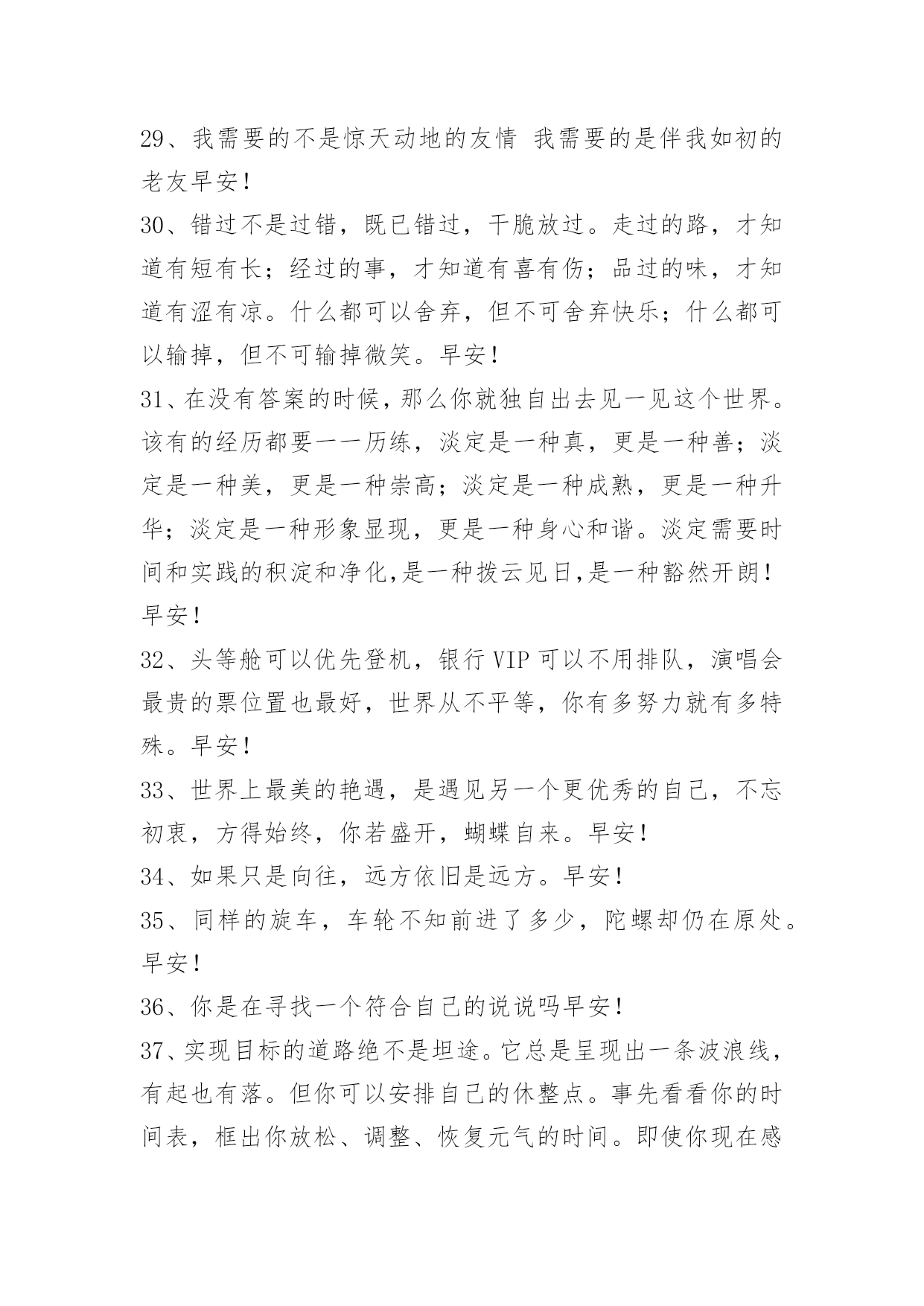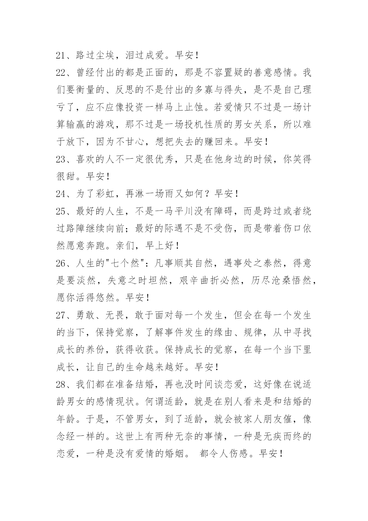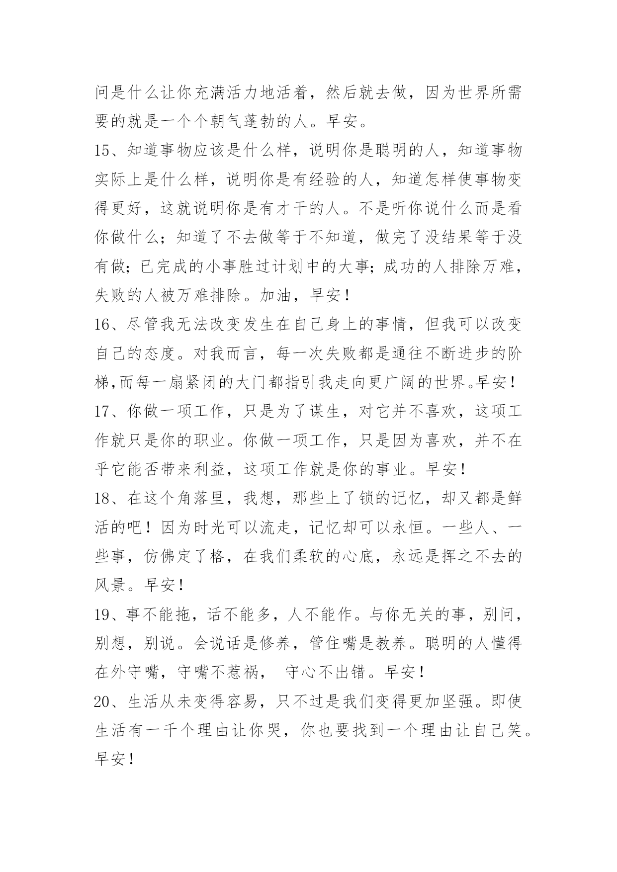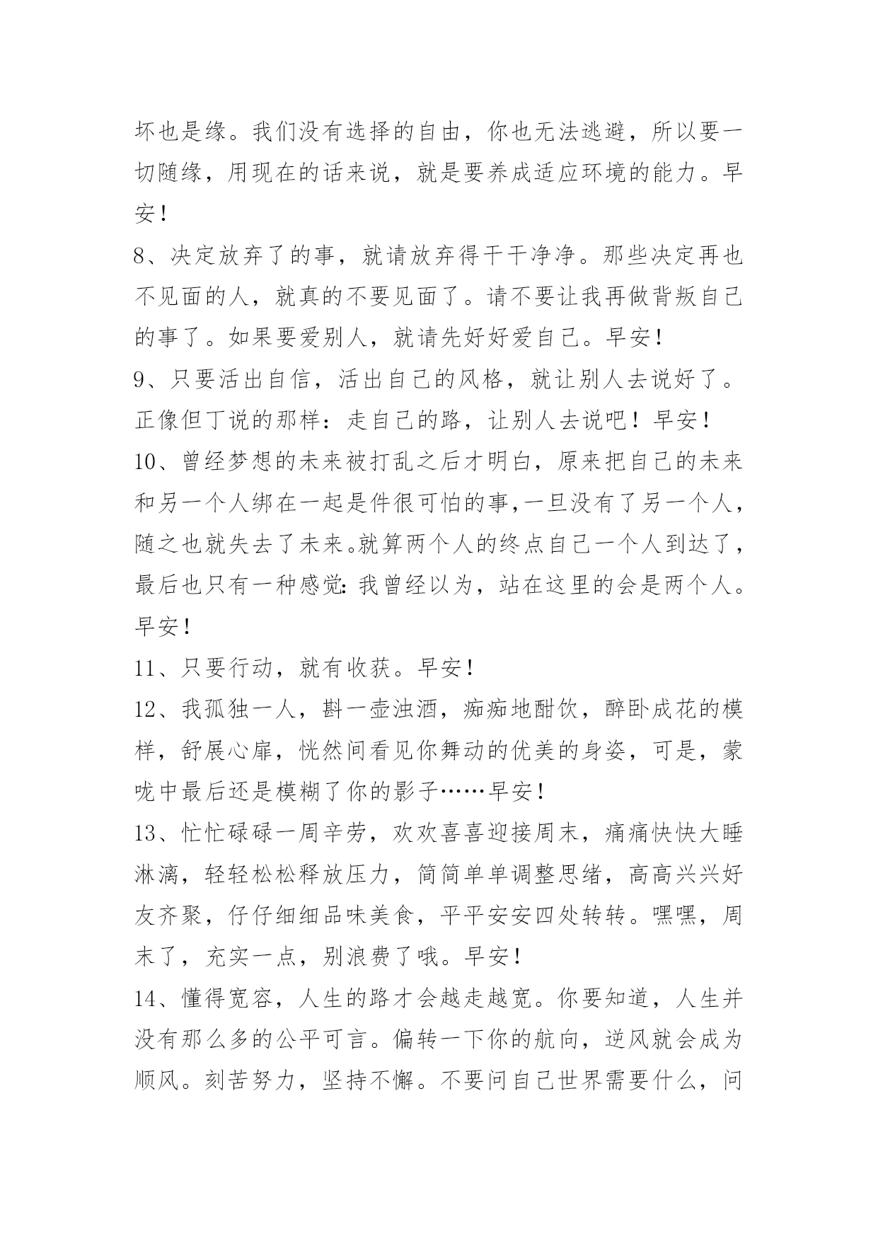 新版早安问候语语录52条 【推荐】新版早安问候语语录集合52条也许就是因为你表现的太过坚强,所以别人才以为你不需要被疼爱。早安!以下是关于新版早安问候语52条,欢迎大家分享。1、人生就是一场修行,修的就是一颗心,花开花落,日复一日。得到的、失去的、在乎的、忘掉的、都让它随风而去。看人生得失,一切皆因命中注定,不必过于在意。生命本是虚幻,来也空空,去也空空。早安!2、从儿时落地的一声哭喊,那也就注定每个人的今生,都是在痛苦中长大,在泪水中蜕变着成蝶,飞舞在曾经的岁月花园。舞出一个全新的世界,荒芜的旷野,美丽的森林,还有童话里的白雪公主。早安!3、我们的未来都不是梦,未来的成功与每个人都是等距离的,从来只有拼出来的美丽,没有等出来的辉煌。早安!4、因为他心里总是在想,你到底挣了他多少钱?而不是你帮他省了多少钱!这就是穷人思维!早安!5、生命像音乐,暗带命定的声调;亦像画面,挟着一种命定的血色。早安!6、我目光拥抱的都是你的过去,而你的现在我总无法提及。早安!7、人生于世间,一切都是缘——苦是缘,乐是缘,好是缘,坏也是缘。我们没有选择的自由,你也无法逃避,所以要一切随缘,用现在的话来说,就是要养成适应环境的能力。早安!8、决定放弃了的事,就请放弃得干干净净。那些决定再也不见面的人,就真的不要见面了。请不要让我再做背叛自己的事了。如果要爱别人,就请先好好爱自己。早安!9、只要活出自信,活出自己的风格,就让别人去说好了。正像但丁说的那样:走自己的路,让别人去说吧!早安!10、曾经梦想的未来被打乱之后才明白,原来把自己的未来和另一个人绑在一起是件很可怕的事,一旦没有了另一个人,随之也就失去了未来。就算两个人的终点自己一个人到达了,最后也只有一种感觉:我曾经以为,站在这里的会是两个人。早安!11、只要行动,就有收获。早安!12、我孤独一人,斟一壶浊酒,痴痴地酣饮,醉卧成花的模样,舒展心扉,恍然间看见你舞动的优美的身姿,可是,蒙咙中最后还是模糊了你的影子……早安!13、忙忙碌碌一周辛劳,欢欢喜喜迎接周末,痛痛快快大睡淋漓,轻轻松松释放压力,简简单单调整思绪,高高兴兴好友齐聚,仔仔细细品味美食,平平安安四处转转。嘿嘿,周末了,充实一点,别浪费了哦。早安!14、懂得宽容,人生的路才会越走越宽。你要知道,人生并没有那么多的公平可言。偏转一下你的航向,逆风就会成为顺风。刻苦努力,坚持不懈。不要问自己世界需要什么,问问是什么让你充满活力地活着,然后就去做,因为世界所需要的就是一个个朝气蓬勃的人。早安。15、知道事物应该是什么样,说明你是聪明的人,知道事物实际上是什么样,说明你是有经验的人,知道怎样使事物变得更好,这就说明你是有才干的人。不是听你说什么而是看你做什么;知道了不去做等于不知道,做完了没结果等于没有做;已完成的小事胜过计划中的大事;成功的人排除万难,失败的人被万难排除。加油,早安!16、尽管我无法改变发生在自己身上的事情,但我可以改变自己的态度。对我而言,每一次失败都是通往不断进步的阶梯,而每一扇紧闭的大门都指引我走向更广阔的世界。早安!17、你做一项工作,只是为了谋生,对它并不喜欢,这项工作就只是你的职业。你做一项工作,只是因为喜欢,并不在乎它能否带来利益,这项工作就是你的事业。早安!18、在这个角落里,我想,那些上了锁的记忆,却又都是鲜活的吧!因为时光可以流走,记忆却可以永恒。一些人、一些事,仿佛定了格,在我们柔软的心底,永远是挥之不去的风景。早安!19、事不能拖,话不能多,人不能作。与你无关的事,别问,别想,别说。会说话是修养,管住嘴是教养。聪明的人懂得在外守嘴,守嘴不惹祸,守心不出错。早安!20、生活从未变得容易,只不过是我们变得更加坚强。即使生活有一千个理由让你哭,你也要找到一个理由让自己笑。早安!21、路过尘埃,泪过成爱。早安!22、曾经付出的都是正面的,那是不容置疑的善意感情。我们要衡量的、反思的不是付出的多寡与得失,是不是自己理亏了,应不应像投资一样马上止蚀。若爱情只不过是一场计算输赢的游戏,那不过是一场投机性质的男女关系,所以难于放下,因为不甘心,想把失去的赚回来。早安!23、喜欢的人不一定很优秀,只是在他身边的时候,你笑得很甜。早安!24、为了彩虹,再淋一场雨又如何?早安!25、最好的人生,不是一马平川没有障碍,而是跨过或者绕过路障继续向前;最好的际遇不是不受伤,而是带着伤口依然愿意奔跑。亲们,早上好!26、人生的"七个然":凡事顺其自然,遇事处之泰然,得意是要淡然,失意之时坦然,艰辛曲折必然,历尽沧桑悟然,愿你活得悠然。早安!27、勇敢、无畏,敢于面对每一个发生,但会在每一个发生的当下,保持觉察,了解事件发生的缘由、规律,从中寻找成长的养份,获得收获。保持成长的觉察,在每一个当下里成长,让自己的生命越来越好。早安!28