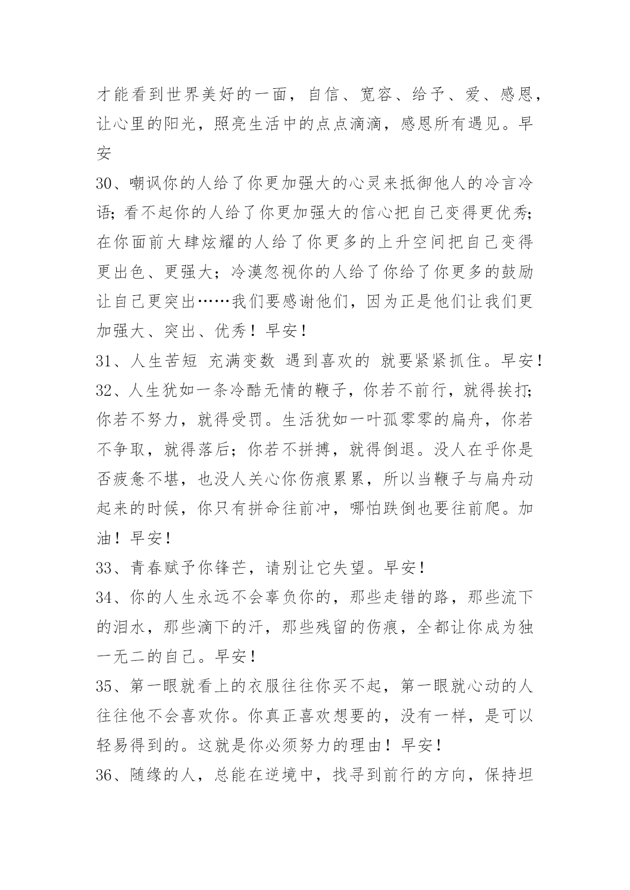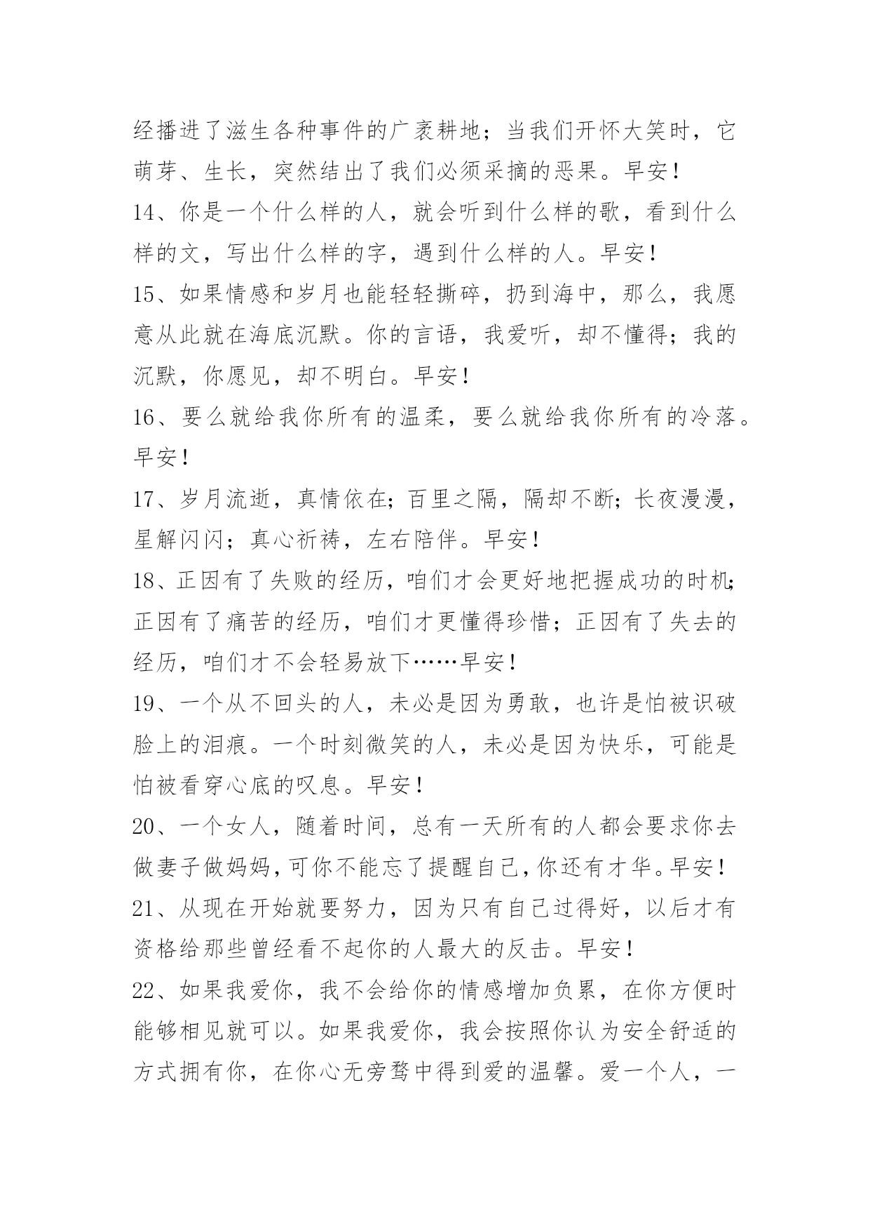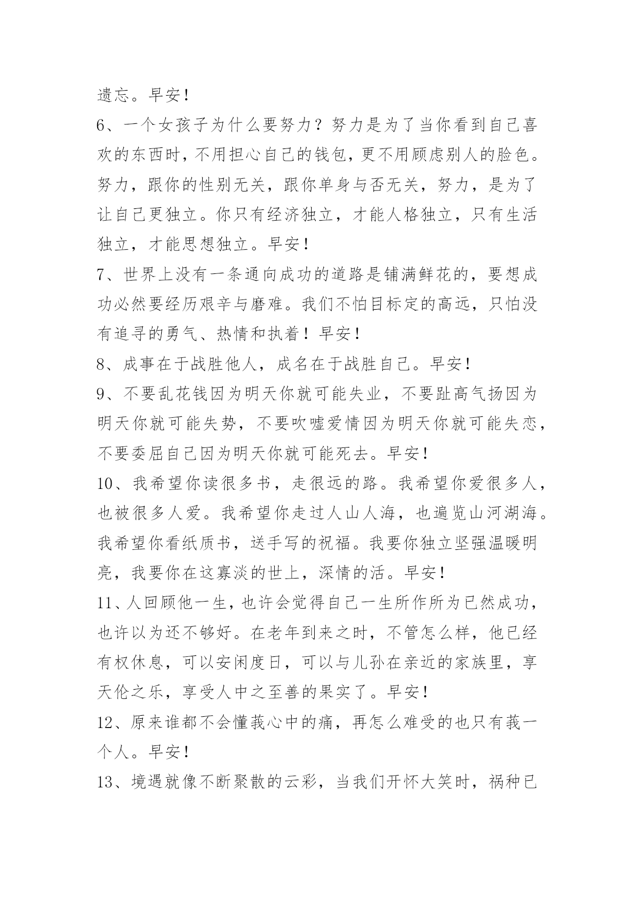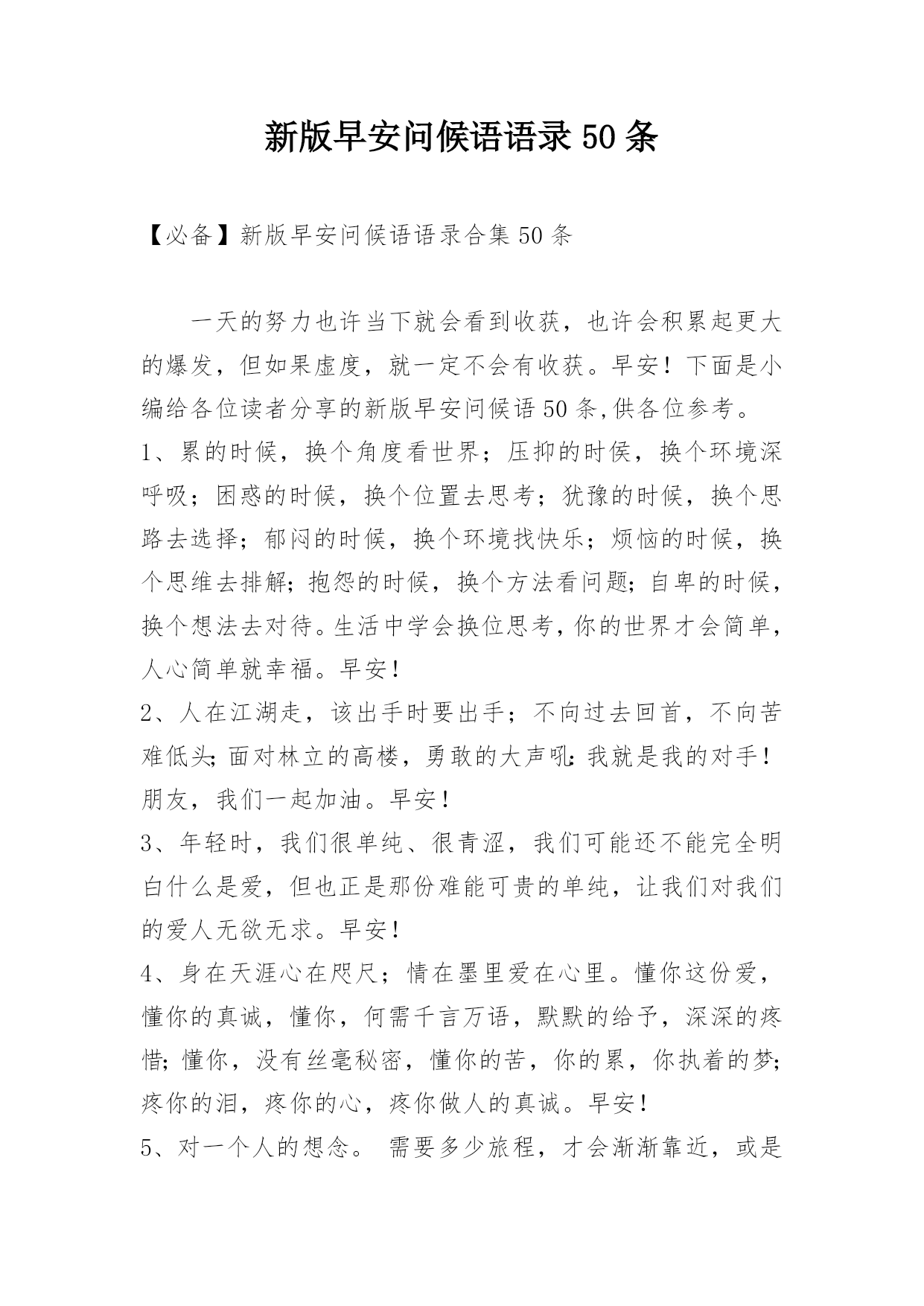 新版早安问候语语录50条 【必备】新版早安问候语语录合集50条一天的努力也许当下就会看到收获,也许会积累起更大的爆发,但如果虚度,就一定不会有收获。早安!下面是小编给各位读者分享的新版早安问候语50条,供各位参考。1、累的时候,换个角度看世界;压抑的时侯,换个环境深呼吸;困惑的时候,换个位置去思考;犹豫的时候,换个思路去选择;郁闷的时候,换个环境找快乐;烦恼的时候,换个思维去排解;抱怨的时候,换个方法看问题;自卑的时候,换个想法去对待。生活中学会换位思考,你的世界才会简单,人心简单就幸福。早安!2、人在江湖走,该出手时要出手;不向过去回首,不向苦难低头;面对林立的高楼,勇敢的大声吼:我就是我的对手!朋友,我们一起加油。早安!3、年轻时,我们很单纯、很青涩,我们可能还不能完全明白什么是爱,但也正是那份难能可贵的单纯,让我们对我们的爱人无欲无求。早安!4、身在天涯心在咫尺;情在墨里爱在心里。懂你这份爱,懂你的真诚,懂你,何需千言万语,默默的给予,深深的疼惜;懂你,没有丝毫秘密,懂你的苦,你的累,你执着的梦;疼你的泪,疼你的心,疼你做人的真诚。早安!5、对一个人的想念。需要多少旅程,才会渐渐靠近,或是遗忘。早安!6、一个女孩子为什么要努力?努力是为了当你看到自己喜欢的东西时,不用担心自己的钱包,更不用顾虑别人的脸色。努力,跟你的性别无关,跟你单身与否无关,努力,是为了让自己更独立。你只有经济独立,才能人格独立,只有生活独立,才能思想独立。早安!7、世界上没有一条通向成功的道路是铺满鲜花的,要想成功必然要经历艰辛与磨难。我们不怕目标定的高远,只怕没有追寻的勇气、热情和执着!早安!8、成事在于战胜他人,成名在于战胜自己。早安!9、不要乱花钱因为明天你就可能失业,不要趾高气扬因为明天你就可能失势,不要吹嘘爱情因为明天你就可能失恋,不要委屈自己因为明天你就可能死去。早安!10、我希望你读很多书,走很远的路。我希望你爱很多人,也被很多人爱。我希望你走过人山人海,也遍览山河湖海。我希望你看纸质书,送手写的祝福。我要你独立坚强温暖明亮,我要你在这寡淡的世上,深情的活。早安!11、人回顾他一生,也许会觉得自己一生所作所为已然成功,也许以为还不够好。在老年到来之时,不管怎么样,他已经有权休息,可以安闲度日,可以与儿孙在亲近的家族里,享天伦之乐,享受人中之至善的果实了。早安!12、原来谁都不会懂莪心中的痛,再怎么难受的也只有莪一个人。早安!13、境遇就像不断聚散的云彩,当我们开怀大笑时,祸种已经播进了滋生各种事件的广袤耕地;当我们开怀大笑时,它萌芽、生长,突然结出了我们必须采摘的恶果。早安!14、你是一个什么样的人,就会听到什么样的歌,看到什么样的文,写出什么样的字,遇到什么样的人。早安!15、如果情感和岁月也能轻轻撕碎,扔到海中,那么,我愿意从此就在海底沉默。你的言语,我爱听,却不懂得;我的沉默,你愿见,却不明白。早安!16、要么就给我你所有的温柔,要么就给我你所有的冷落。早安!17、岁月流逝,真情依在;百里之隔,隔却不断;长夜漫漫,星解闪闪;真心祈祷,左右陪伴。早安!18、正因有了失败的经历,咱们才会更好地把握成功的时机;正因有了痛苦的经历,咱们才更懂得珍惜;正因有了失去的经历,咱们才不会轻易放下……早安!19、一个从不回头的人,未必是因为勇敢,也许是怕被识破脸上的泪痕。一个时刻微笑的人,未必是因为快乐,可能是怕被看穿心底的叹息。早安!20、一个女人,随着时间,总有一天所有的人都会要求你去做妻子做妈妈,可你不能忘了提醒自己,你还有才华。早安!21、从现在开始就要努力,因为只有自己过得好,以后才有资格给那些曾经看不起你的人最大的反击。早安!22、如果我爱你,我不会给你的情感增加负累,在你方便时能够相见就可以。如果我爱你,我会按照你认为安全舒适的方式拥有你,在你心无旁骛中得到爱的温馨。爱一个人,一定要用对方能够接受的方式去爱,否则将与恨无异。爱得太霸道是对爱情的亵渎。早安!23、"当你累了,会有人对你说,累就别干了;可给你钱花的有几个?当你生病了,会有人对你说,吃点药吧;可真正给你买药的人能有几个?当你遇到困难了,会有很多人说没事,可是真正能帮你的人会有几个?不要只听说,要看怎么做;这世界从来不缺看热闹的。请珍惜你身边那些不说空话,只办实事的人!"早安!24、人生的一大误区就是埋葬真实的自己并渴望着自己能成为其他的人。不要成为其他人,而是要做自己,对的人只爱真实的你。早安!25、梦想总是跑在我的前面。努力追寻它们,为了那一瞬间的同步,这就是动人的生命奇迹。早安!26、总是有这样的一些女孩,她们自己赚钱给自己花,她们相信爱情,她们可能活在异乡,她们满身伤痕却不哭给别人看。在别人眼里,她们总光彩照人,而其实不过是坚强的活着……每个女孩,都有自己的了不起。