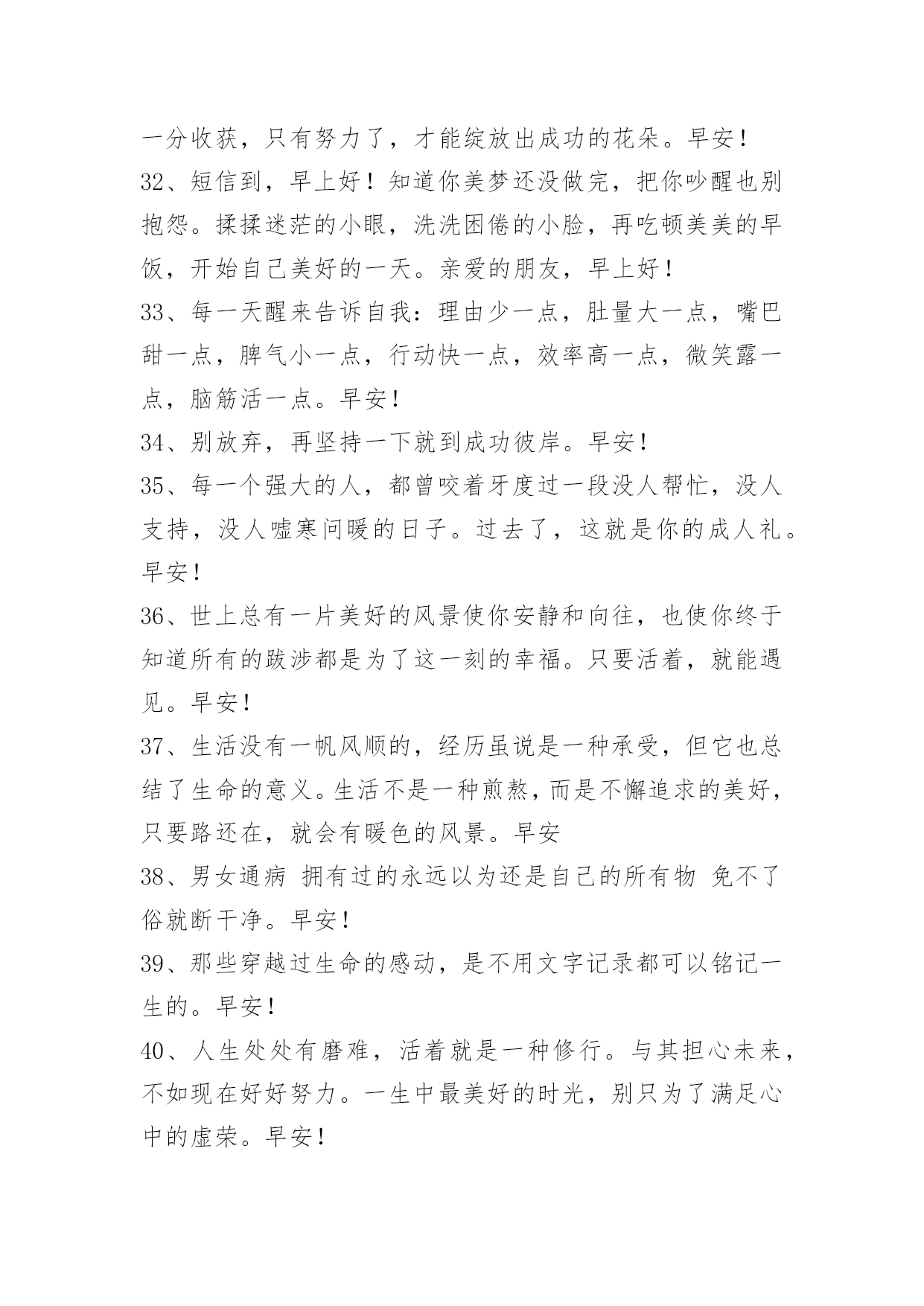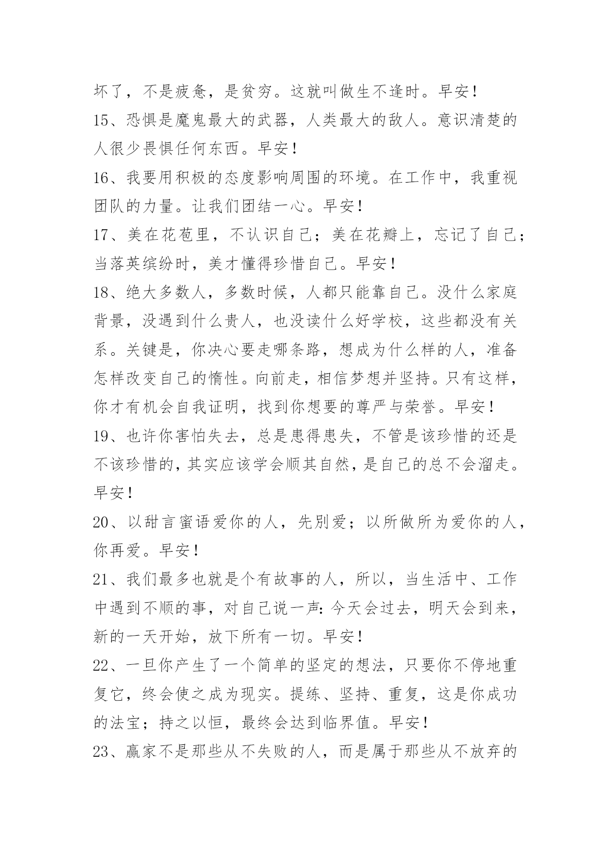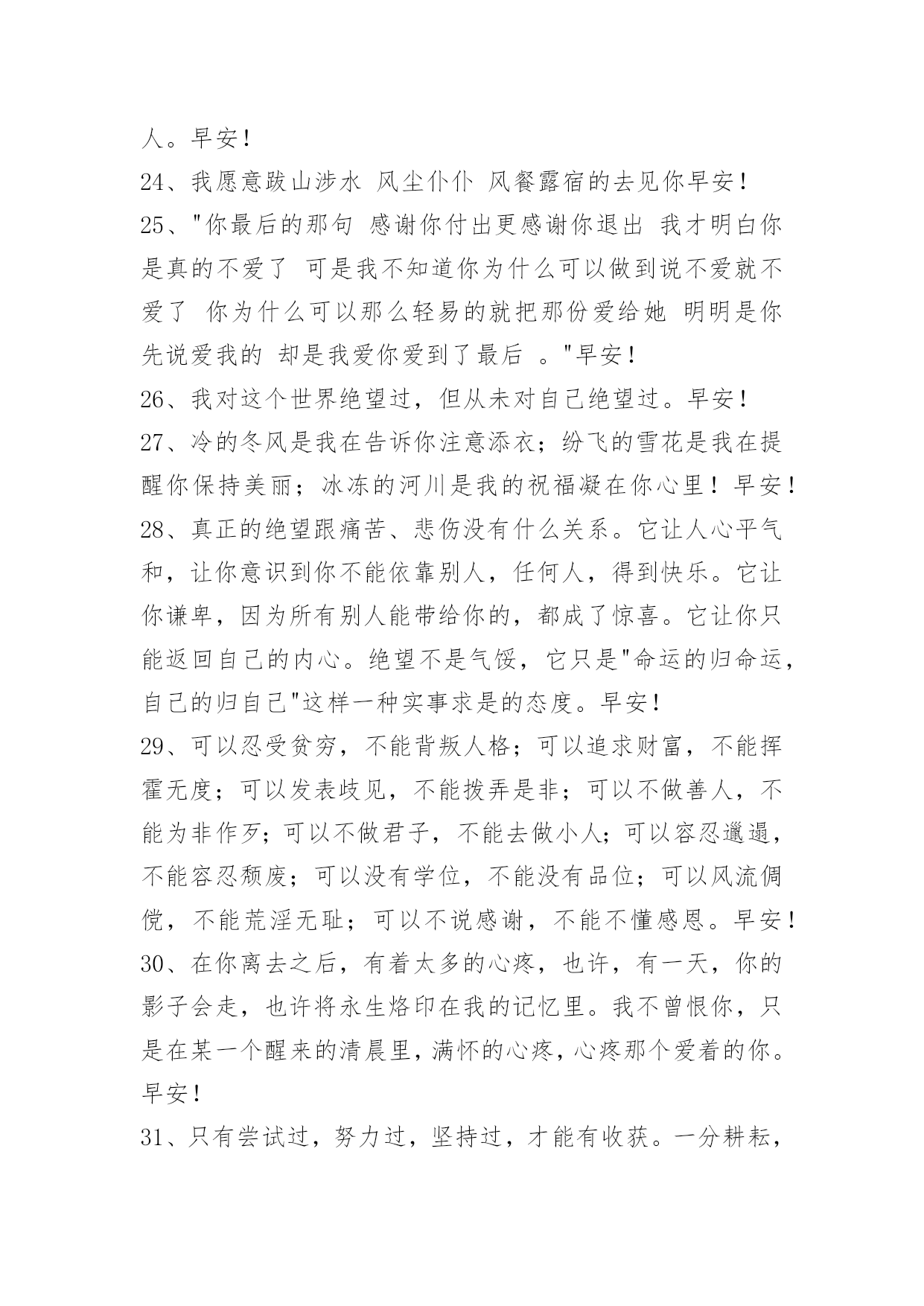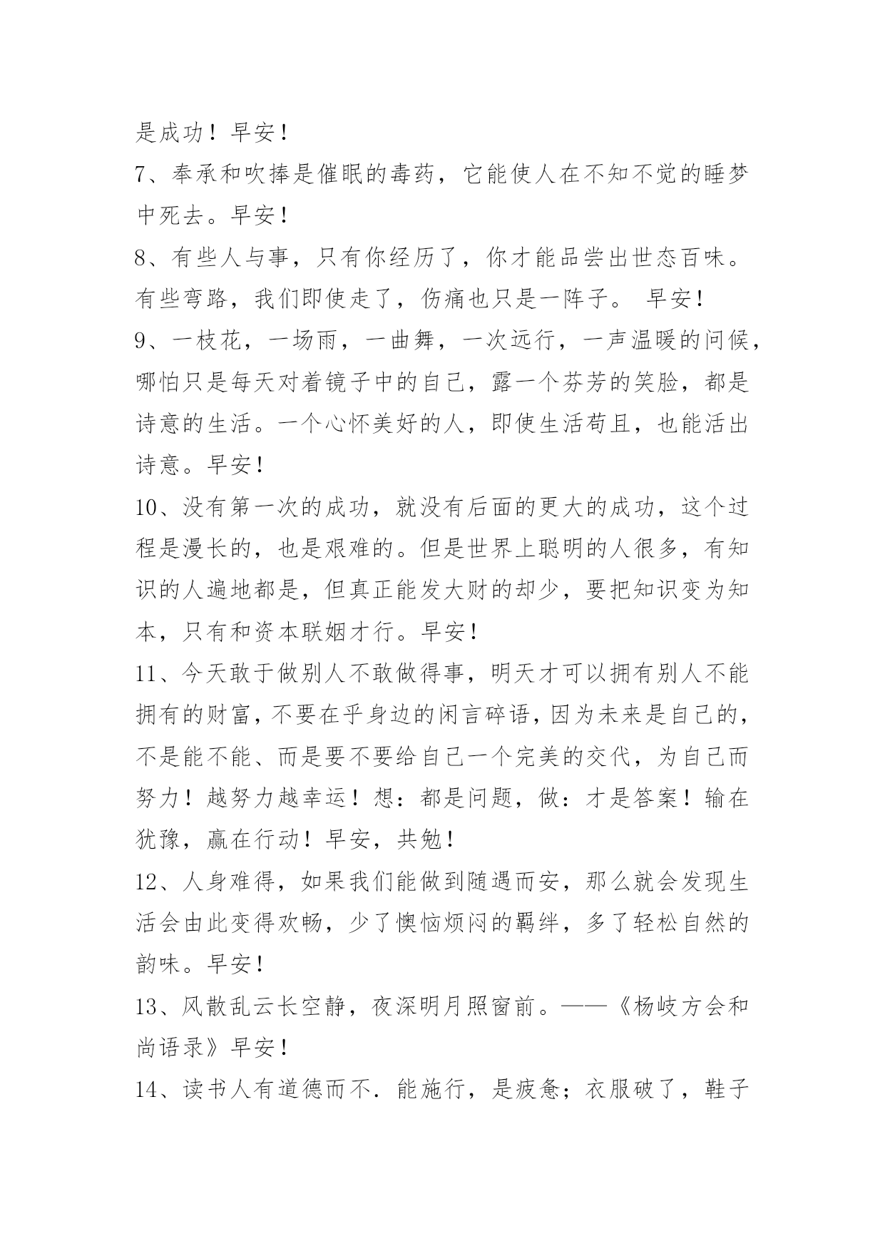 新版早安问候语语录56条 2024年常用新版早安问候语语录汇编56条人生最痛苦的;并不是没有得到所爱的人,而是所爱的人一生没有得到幸福。早安!下面是小编收集整理的新版早安问候语56条,欢迎大家借鉴与参考,希望对大家有所帮助。1、书读得越多而不加思考,你就会觉得你知道得很多,而当你读书思考得越多的时候,你就会清楚地看到你知道的还很少。早安!2、当需要人陪,需要人安慰的时候,才发现能够陪你的就只有手机。早安!3、在这个人云亦云,所有人都面目相似的世界上,记得:即使头破血流,也要守望独一无二的梦想,做独一无二的自己。早安!4、人生,没有永远的伤痛,再深的痛,伤口总会痊愈;人生,没有过不去的坎,你不可以坐在坎边等它消失,你只能想办法穿过它;人生,没有永远的爱情,没有结局的感情,总要结束;不能拥有的人,总会忘记。慢慢地,你不会再流泪;慢慢地,一切都过去了…适当的放弃,是人生优雅的转身。早安!5、做一个安静的人,读书,旅行,等待爱情。给自己一段柔软的时光。早安!6、需要解释的失败,它就是失败!没有解释的成功,它就是成功!早安!7、奉承和吹捧是催眠的毒药,它能使人在不知不觉的睡梦中死去。早安!8、有些人与事,只有你经历了,你才能品尝出世态百味。有些弯路,我们即使走了,伤痛也只是一阵子。早安!9、一枝花,一场雨,一曲舞,一次远行,一声温暖的问候,哪怕只是每天对着镜子中的自己,露一个芬芳的笑脸,都是诗意的生活。一个心怀美好的人,即使生活苟且,也能活出诗意。早安!10、没有第一次的成功,就没有后面的更大的成功,这个过程是漫长的,也是艰难的。但是世界上聪明的人很多,有知识的人遍地都是,但真正能发大财的却少,要把知识变为知本,只有和资本联姻才行。早安!11、今天敢于做别人不敢做得事,明天才可以拥有别人不能拥有的财富,不要在乎身边的闲言碎语,因为未来是自己的,不是能不能、而是要不要给自己一个完美的交代,为自己而努力!越努力越幸运!想:都是问题,做:才是答案!输在犹豫,赢在行动!早安,共勉!12、人身难得,如果我们能做到随遇而安,那么就会发现生活会由此变得欢畅,少了懊恼烦闷的羁绊,多了轻松自然的韵味。早安!13、风散乱云长空静,夜深明月照窗前。——《杨岐方会和尚语录》早安!14、读书人有道德而不.能施行,是疲惫;衣服破了,鞋子坏了,不是疲惫,是贫穷。这就叫做生不逢时。早安!15、恐惧是魔鬼最大的武器,人类最大的敌人。意识清楚的人很少畏惧任何东西。早安!16、我要用积极的态度影响周围的环境。在工作中,我重视团队的力量。让我们团结一心。早安!17、美在花苞里,不认识自己;美在花瓣上,忘记了自己;当落英缤纷时,美才懂得珍惜自己。早安!18、绝大多数人,多数时候,人都只能靠自己。没什么家庭背景,没遇到什么贵人,也没读什么好学校,这些都没有关系。关键是,你决心要走哪条路,想成为什么样的人,准备怎样改变自己的惰性。向前走,相信梦想并坚持。只有这样,你才有机会自我证明,找到你想要的尊严与荣誉。早安!19、也许你害怕失去,总是患得患失,不管是该珍惜的还是不该珍惜的,其实应该学会顺其自然,是自己的总不会溜走。早安!20、以甜言蜜语爱你的人,先別爱;以所做所为爱你的人,你再爱。早安!21、我们最多也就是个有故事的人,所以,当生活中、工作中遇到不顺的事,对自己说一声:今天会过去,明天会到来,新的一天开始,放下所有一切。早安!22、一旦你产生了一个简单的坚定的想法,只要你不停地重复它,终会使之成为现实。提练、坚持、重复,这是你成功的法宝;持之以恒,最终会达到临界值。早安!23、赢家不是那些从不失败的人,而是属于那些从不放弃的人。早安!24、我愿意跋山涉水风尘仆仆风餐露宿的去见你早安!25、"你最后的那句感谢你付出更感谢你退出我才明白你是真的不爱了可是我不知道你为什么可以做到说不爱就不爱了你为什么可以那么轻易的就把那份爱给她明明是你先说爱我的却是我爱你爱到了最后。"早安!26、我对这个世界绝望过,但从未对自己绝望过。早安!27、冷的冬风是我在告诉你注意添衣;纷飞的雪花是我在提醒你保持美丽;冰冻的河川是我的祝福凝在你心里!早安!28、真正的绝望跟痛苦、悲伤没有什么关系。它让人心平气和,让你意识到你不能依靠别人,任何人,得到快乐。它让你谦卑,因为所有别人能带给你的,都成了惊喜。它让你只能返回自己的内心。绝望不是气馁,它只是"命运的归命运,自己的归自己"这样一种实事求是的态度。早安!29、可以忍受贫穷,不能背叛人格;可以追求财富,不能挥霍无度;可以发表歧见,不能拨弄是非;可以不做善人,不能为非作歹;可以不做君子,不能去做小人;可以容忍邋遢,不能容忍颓废;可以没有学位,不能没有品位;可以风流倜傥,不能荒淫无耻;可以不说感谢,不能不懂感恩。早安!30、在你离去之后,有着太多的心疼,也许,