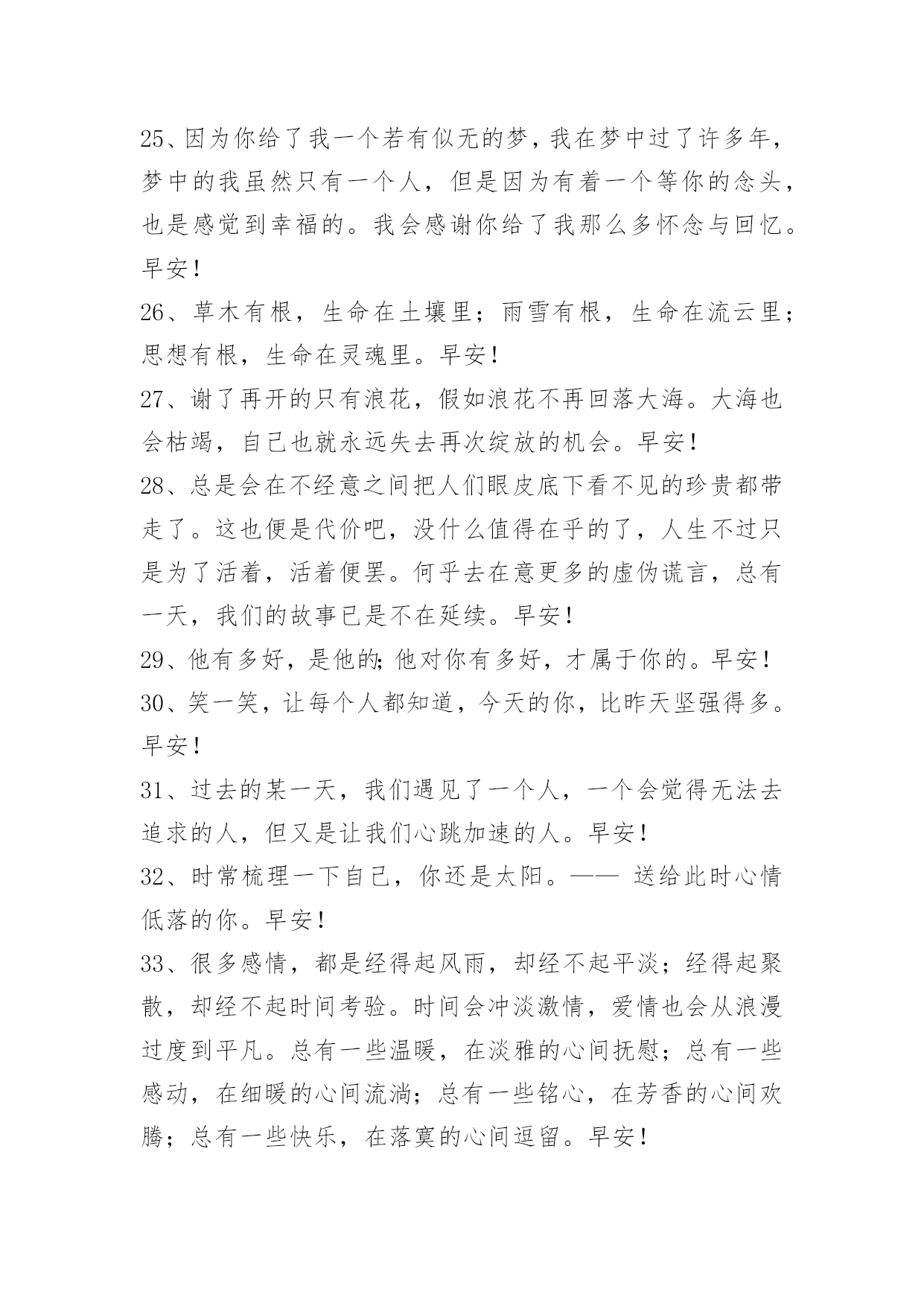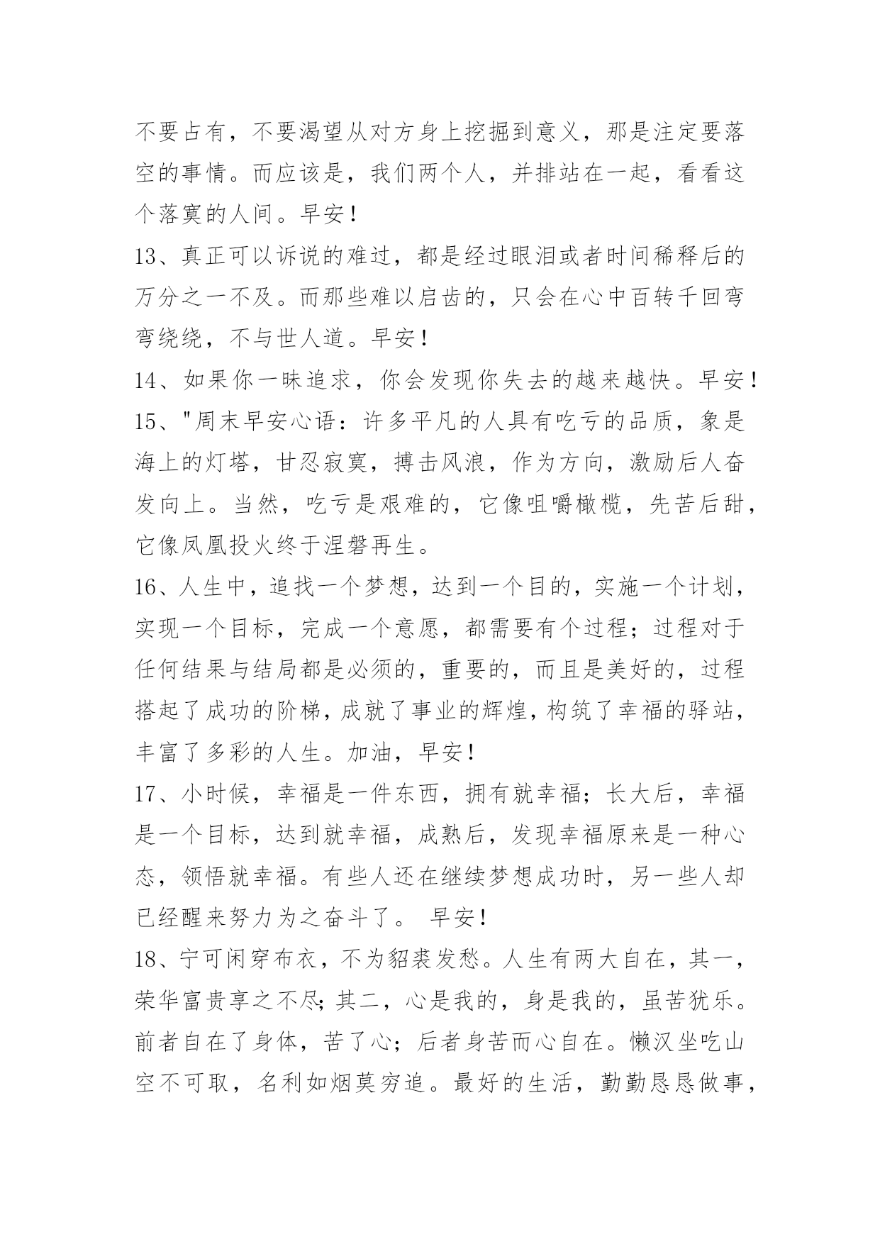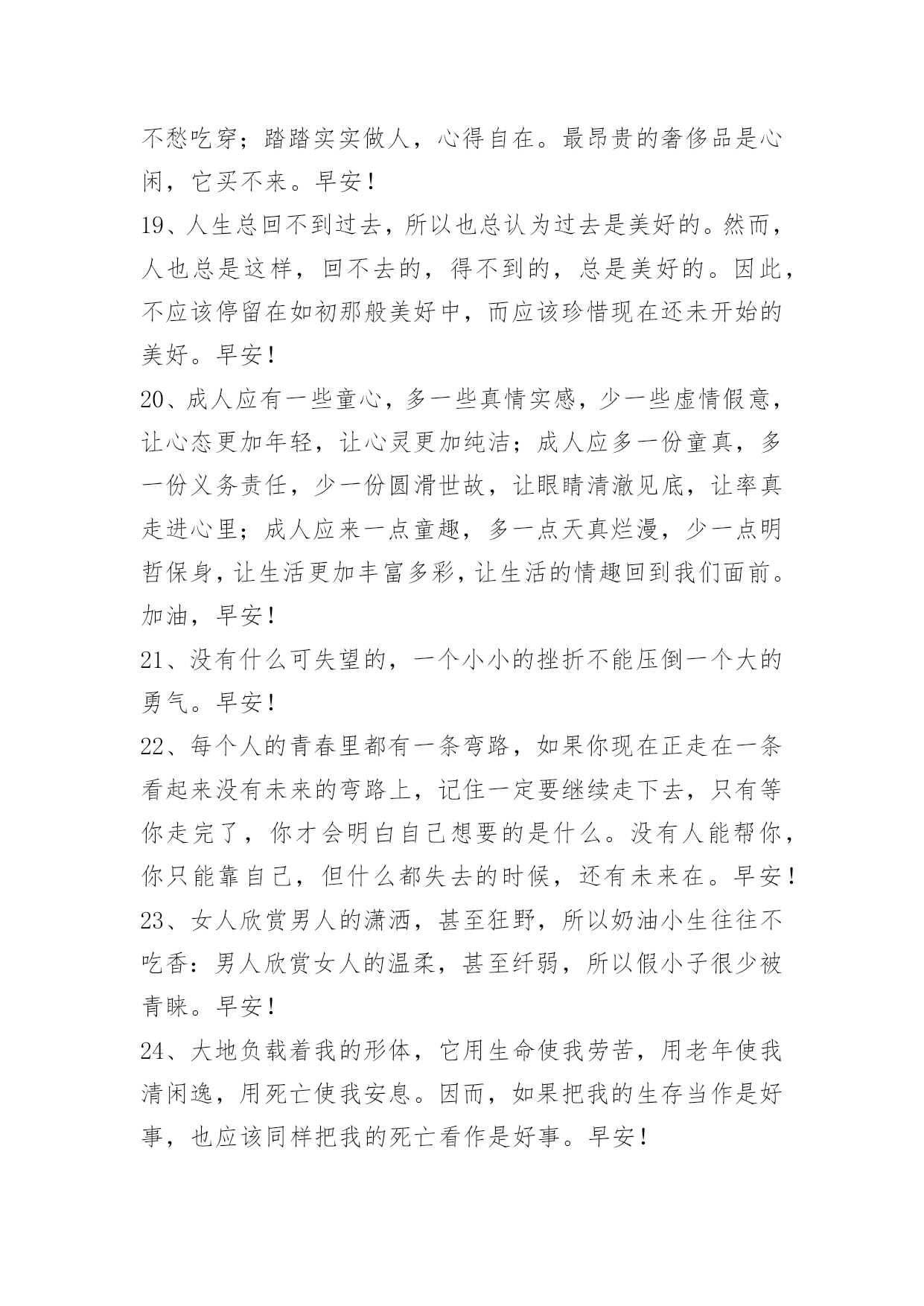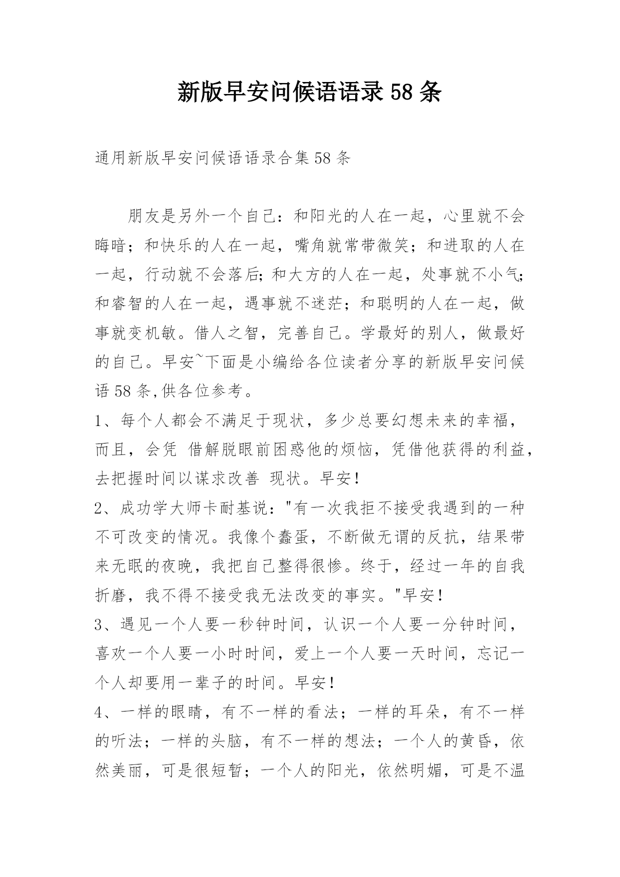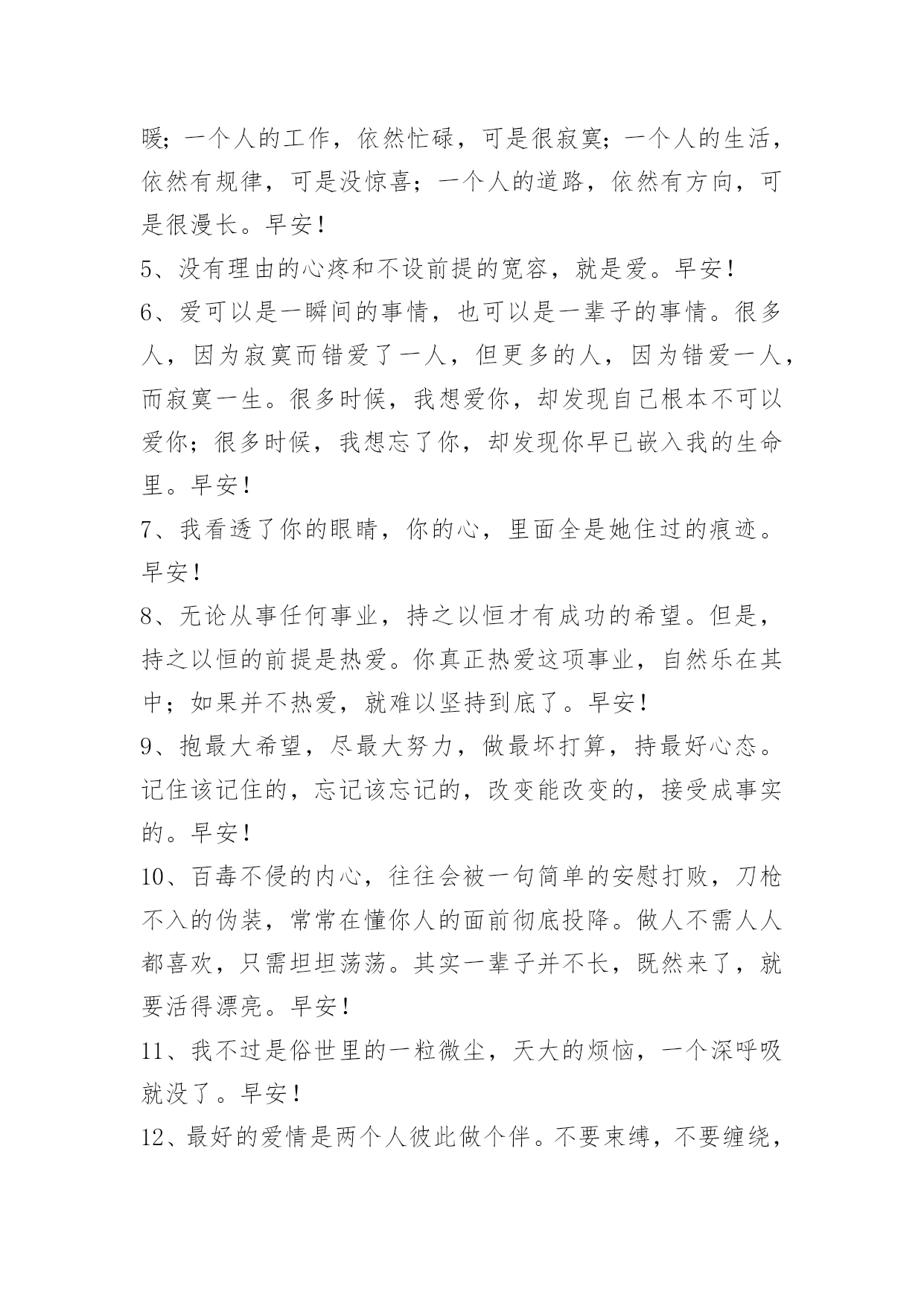 新版早安问候语语录58条 通用新版早安问候语语录合集58条朋友是另外一个自己:和阳光的人在一起,心里就不会晦暗;和快乐的人在一起,嘴角就常带微笑;和进取的人在一起,行动就不会落后;和大方的人在一起,处事就不小气;和睿智的人在一起,遇事就不迷茫;和聪明的人在一起,做事就变机敏。借人之智,完善自己。学最好的别人,做最好的自己。早安~下面是小编给各位读者分享的新版早安问候语58条,供各位参考。1、每个人都会不满足于现状,多少总要幻想未来的幸福,而且,会凭借解脱眼前困惑他的烦恼,凭借他获得的利益,去把握时间以谋求改善现状。早安!2、成功学大师卡耐基说:"有一次我拒不接受我遇到的一种不可改变的情况。我像个蠢蛋,不断做无谓的反抗,结果带来无眠的夜晚,我把自己整得很惨。终于,经过一年的自我折磨,我不得不接受我无法改变的事实。"早安!3、遇见一个人要一秒钟时间,认识一个人要一分钟时间,喜欢一个人要一小时时间,爱上一个人要一天时间,忘记一个人却要用一辈子的时间。早安!4、一样的眼睛,有不一样的看法;一样的耳朵,有不一样的听法;一样的头脑,有不一样的想法;一个人的黄昏,依然美丽,可是很短暂;一个人的阳光,依然明媚,可是不温暖;一个人的工作,依然忙碌,可是很寂寞;一个人的生活,依然有规律,可是没惊喜;一个人的道路,依然有方向,可是很漫长。早安!5、没有理由的心疼和不设前提的宽容,就是爱。早安!6、爱可以是一瞬间的事情,也可以是一辈子的事情。很多人,因为寂寞而错爱了一人,但更多的人,因为错爱一人,而寂寞一生。很多时候,我想爱你,却发现自己根本不可以爱你;很多时候,我想忘了你,却发现你早已嵌入我的生命里。早安!7、我看透了你的眼睛,你的心,里面全是她住过的痕迹。早安!8、无论从事任何事业,持之以恒才有成功的希望。但是,持之以恒的前提是热爱。你真正热爱这项事业,自然乐在其中;如果并不热爱,就难以坚持到底了。早安!9、抱最大希望,尽最大努力,做最坏打算,持最好心态。记住该记住的,忘记该忘记的,改变能改变的,接受成事实的。早安!10、百毒不侵的内心,往往会被一句简单的安慰打败,刀枪不入的伪装,常常在懂你人的面前彻底投降。做人不需人人都喜欢,只需坦坦荡荡。其实一辈子并不长,既然来了,就要活得漂亮。早安!11、我不过是俗世里的一粒微尘,天大的烦恼,一个深呼吸就没了。早安!12、最好的爱情是两个人彼此做个伴。不要束缚,不要缠绕,不要占有,不要渴望从对方身上挖掘到意义,那是注定要落空的事情。而应该是,我们两个人,并排站在一起,看看这个落寞的人间。早安!13、真正可以诉说的难过,都是经过眼泪或者时间稀释后的万分之一不及。而那些难以启齿的,只会在心中百转千回弯弯绕绕,不与世人道。早安!14、如果你一昧追求,你会发现你失去的越来越快。早安!15、"周末早安心语:许多平凡的人具有吃亏的品质,象是海上的灯塔,甘忍寂寞,搏击风浪,作为方向,激励后人奋发向上。当然,吃亏是艰难的,它像咀嚼橄榄,先苦后甜,它像凤凰投火终于涅磐再生。16、人生中,追找一个梦想,达到一个目的,实施一个计划,实现一个目标,完成一个意愿,都需要有个过程;过程对于任何结果与结局都是必须的,重要的,而且是美好的,过程搭起了成功的阶梯,成就了事业的辉煌,构筑了幸福的驿站,丰富了多彩的人生。加油,早安!17、小时候,幸福是一件东西,拥有就幸福;长大后,幸福是一个目标,达到就幸福,成熟后,发现幸福原来是一种心态,领悟就幸福。有些人还在继续梦想成功时,另一些人却已经醒来努力为之奋斗了。早安!18、宁可闲穿布衣,不为貂裘发愁。人生有两大自在,其一,荣华富贵享之不尽;其二,心是我的,身是我的,虽苦犹乐。前者自在了身体,苦了心;后者身苦而心自在。懒汉坐吃山空不可取,名利如烟莫穷追。最好的生活,勤勤恳恳做事,不愁吃穿;踏踏实实做人,心得自在。最昂贵的奢侈品是心闲,它买不来。早安!19、人生总回不到过去,所以也总认为过去是美好的。然而,人也总是这样,回不去的,得不到的,总是美好的。因此,不应该停留在如初那般美好中,而应该珍惜现在还未开始的美好。早安!20、成人应有一些童心,多一些真情实感,少一些虚情假意,让心态更加年轻,让心灵更加纯洁;成人应多一份童真,多一份义务责任,少一份圆滑世故,让眼睛清澈见底,让率真走进心里;成人应来一点童趣,多一点天真烂漫,少一点明哲保身,让生活更加丰富多彩,让生活的情趣回到我们面前。加油,早安!21、没有什么可失望的,一个小小的挫折不能压倒一个大的勇气。早安!22、每个人的青春里都有一条弯路,如果你现在正走在一条看起来没有未来的弯路上,记住一定要继续走下去,只有等你走完了,你才会明白自己想要的是什么。没有人能帮你,你只能靠自己,但什么都失去的时候,还有未来在。早安!23、女人欣赏男人的潇洒,甚至狂野