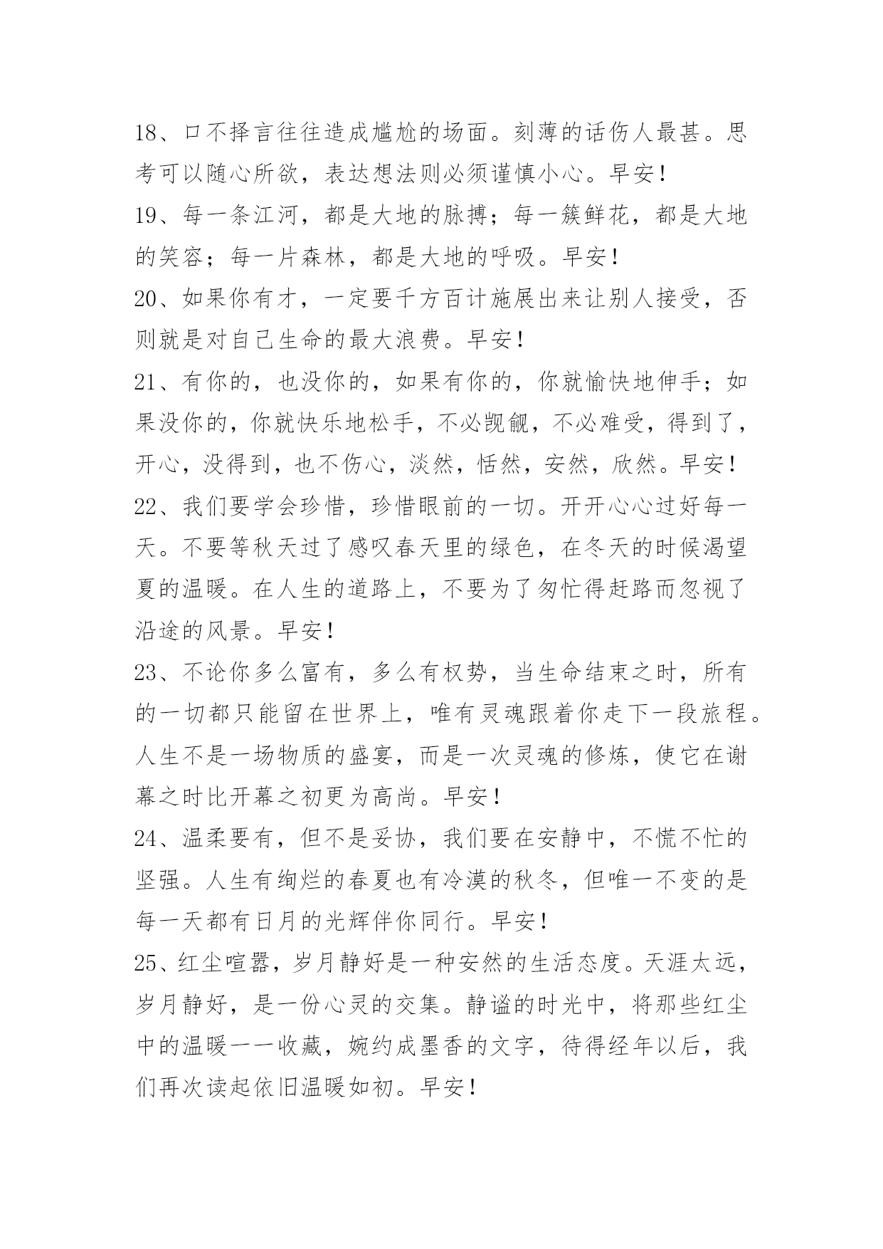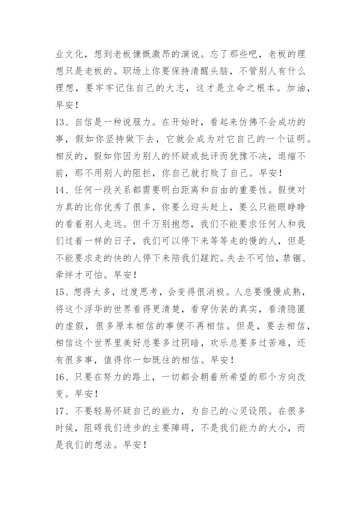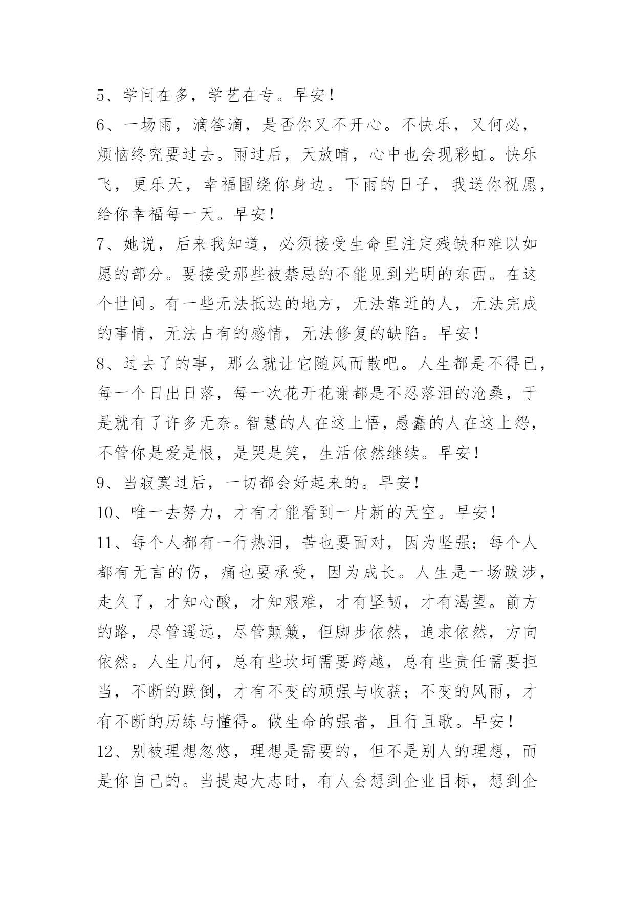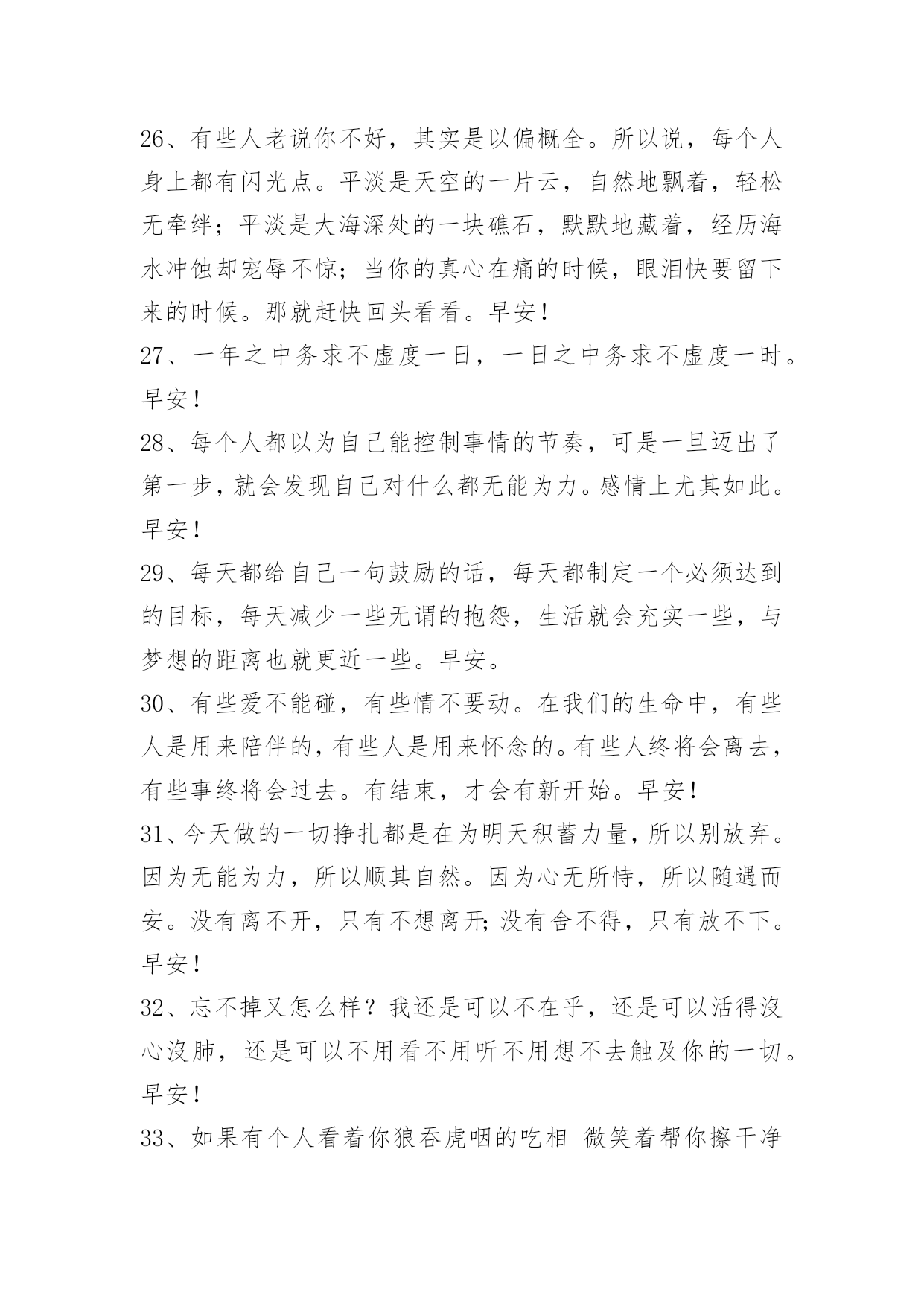 新版早安问候语语录61条 新版早安问候语语录集锦61条我没有勇气折断我的翅膀,却也飞不到任何地方。早安!下面是小编整理的新版早安问候语61条,欢迎阅读与收藏。1、日月更迭,春秋辗转,我已长发及腰,又如何?三千青丝,亦不过是岁月写照,情愁堆积,在这样暖阳斜照的下午,依旧是百无聊赖的不知所措,请允许此刻的我,悲叹一声,人生,到底何趣之有?人情世故,总是那么的纷繁复杂:相交情感,亦是那么缥缈虚无:尘世万物,皆是那么的变化莫测。你是谁的谁?谁是你的谁?谁也不是谁的谁……虽然,此生已然是多情,但如果可以,我愿意跳出红尘万丈,摒弃世间所有情感杂念,做一个无欲无求无情无念的冷漠之人,不随花开悦,不伴日落忧,如此,甚好……早安!2、任何事情,终有答案,无须匆忙寻找,拥有的,错失的,都是岁月的静好。早安!3、自信但不轻视别人,善良却能不迂腐,有骨气说话做事还能圆融,霸气也从不欺压他人,坚强但却不刚愎自用。是一个人最应该学会追逐和拥有的财富。早安!4、你需要的伴侣,最好是那能够和你并肩立在船头,浅斟低唱两岸风光,同时更能在惊涛骇浪中紧紧握住你的手不放的人。换句话说,最好她本身不是你必须应付的惊涛骇浪。早安!5、学问在多,学艺在专。早安!6、一场雨,滴答滴,是否你又不开心。不快乐,又何必,烦恼终究要过去。雨过后,天放晴,心中也会现彩虹。快乐飞,更乐天,幸福围绕你身边。下雨的日子,我送你祝愿,给你幸福每一天。早安!7、她说,后来我知道,必须接受生命里注定残缺和难以如愿的部分。要接受那些被禁忌的不能见到光明的东西。在这个世间。有一些无法抵达的地方,无法靠近的人,无法完成的事情,无法占有的感情,无法修复的缺陷。早安!8、过去了的事,那么就让它随风而散吧。人生都是不得已,每一个日出日落,每一次花开花谢都是不忍落泪的沧桑,于是就有了许多无奈。智慧的人在这上悟,愚蠢的人在这上怨,不管你是爱是恨,是哭是笑,生活依然继续。早安!9、当寂寞过后,一切都会好起来的。早安!10、唯一去努力,才有才能看到一片新的天空。早安!11、每个人都有一行热泪,苦也要面对,因为坚强;每个人都有无言的伤,痛也要承受,因为成长。人生是一场跋涉,走久了,才知心酸,才知艰难,才有坚韧,才有渴望。前方的路,尽管遥远,尽管颠簸,但脚步依然,追求依然,方向依然。人生几何,总有些坎坷需要跨越,总有些责任需要担当,不断的跌倒,才有不变的顽强与收获;不变的风雨,才有不断的历练与懂得。做生命的强者,且行且歌。早安!12、别被理想忽悠,理想是需要的,但不是别人的理想,而是你自己的。当提起大志时,有人会想到企业目标,想到企业文化,想到老板慷慨激昂的演说。忘了那些吧,老板的理想只是老板的。职场上你要保持清醒头脑,不管别人有什么理想,要牢牢记住自己的大志,这才是立命之根本。加油,早安!13、自信是一种说服力。在开始时,看起来仿佛不会成功的事,假如你坚持做下去,它就会成为对它自己的一个证明。相反的,假如你因为别人的怀疑或批评而犹豫不决,退缩不前,那不用别人的阻拦,你自己就打败了自己。早安!14、任何一段关系都需要明白距离和自由的重要性。假使对方真的比你优秀了很多,你要么迎头赶上,要么只能眼睁睁的看着别人走远。但千万别抱怨,我们不能要求任何人和我们过着一样的日子,我们可以停下来等等走的慢的人,但是不能要求走的快的人停下来陪我们蹉跎。失去不可怕,禁锢、牵绊才可怕。早安!15、想得太多,过度思考,会变得很消极。人总要慢慢成熟,将这个浮华的世界看得更清楚,看穿伪装的真实,看清隐匿的虚假,很多原本相信的事便不再相信。但是,要去相信,相信这个世界里美好总要多过阴暗,欢乐总要多过苦难,还有很多事,值得你一如既往的相信。早安!16、只要在努力的路上,一切都会朝着所希望的那个方向改变。早安!17、不要轻易怀疑自己的能力,为自己的心灵设限。在很多时候,阻碍我们进步的主要障碍,不是我们能力的大小,而是我们的想法。早安!18、口不择言往往造成尴尬的场面。刻薄的话伤人最甚。思考可以随心所欲,表达想法则必须谨慎小心。早安!19、每一条江河,都是大地的脉搏;每一簇鲜花,都是大地的笑容;每一片森林,都是大地的呼吸。早安!20、如果你有才,一定要千方百计施展出来让别人接受,否则就是对自己生命的最大浪费。早安!21、有你的,也没你的,如果有你的,你就愉快地伸手;如果没你的,你就快乐地松手,不必觊觎,不必难受,得到了,开心,没得到,也不伤心,淡然,恬然,安然,欣然。早安!22、我们要学会珍惜,珍惜眼前的一切。开开心心过好每一天。不要等秋天过了感叹春天里的绿色,在冬天的时候渴望夏的温暖。在人生的道路上,不要为了匆忙得赶路而忽视了沿途的风景。早安!23、不论你多么富有,多么有权势,当生命结束之时,所有的一切都只能留在世界上,唯有灵魂跟着你走下一段旅程。人