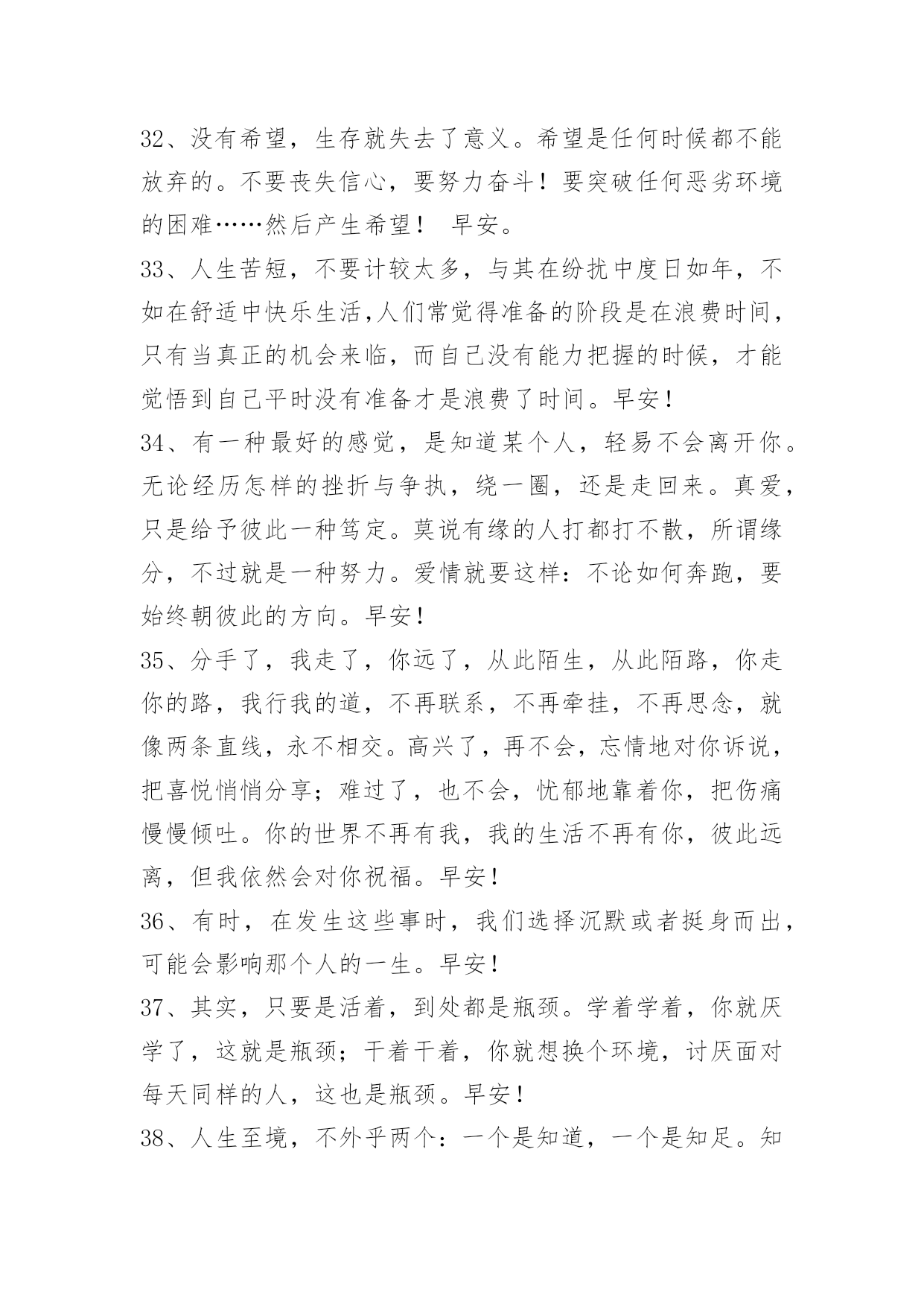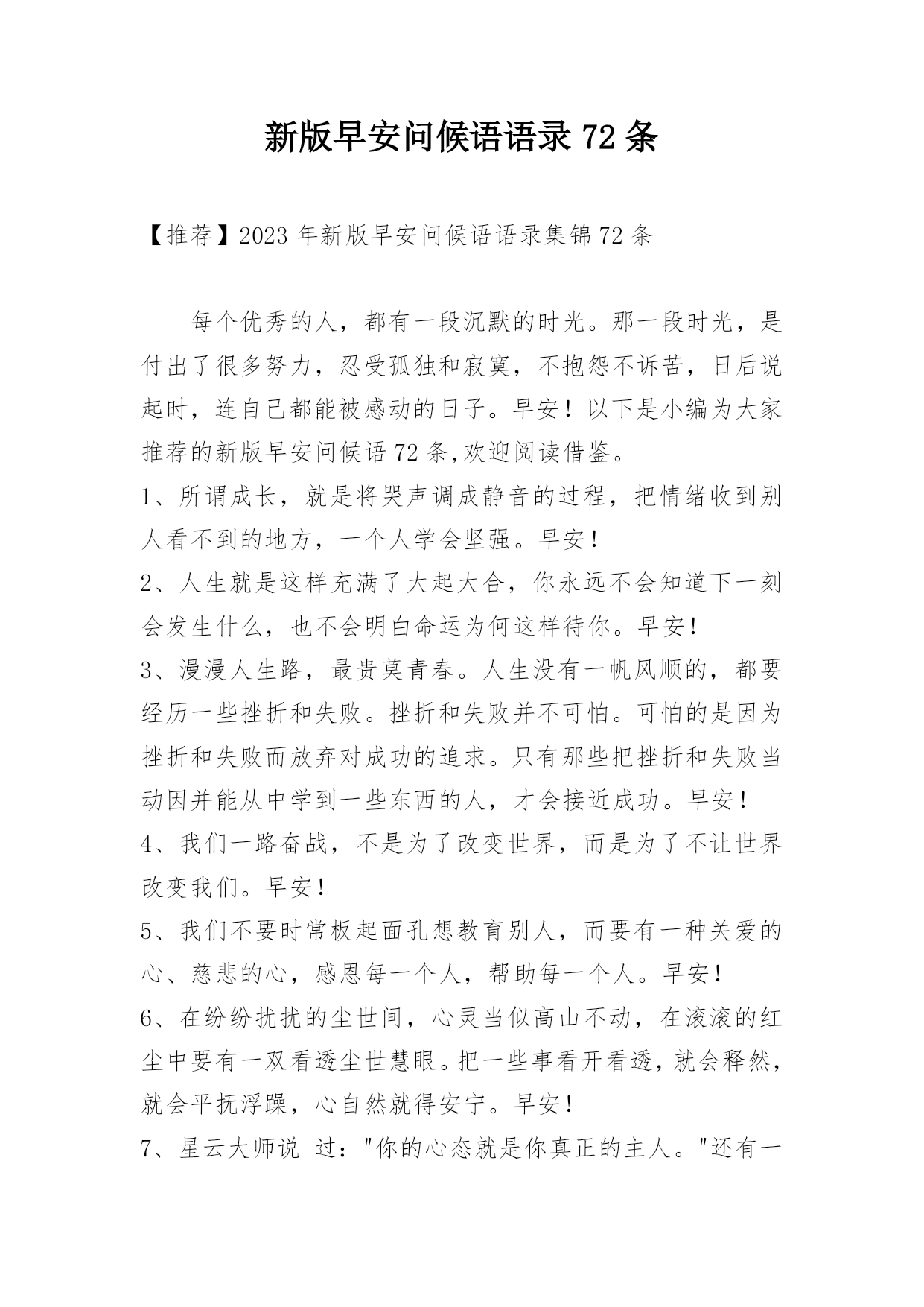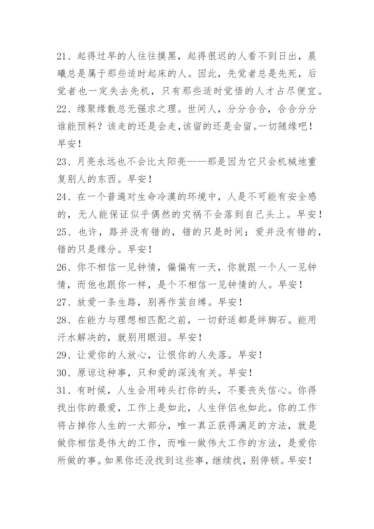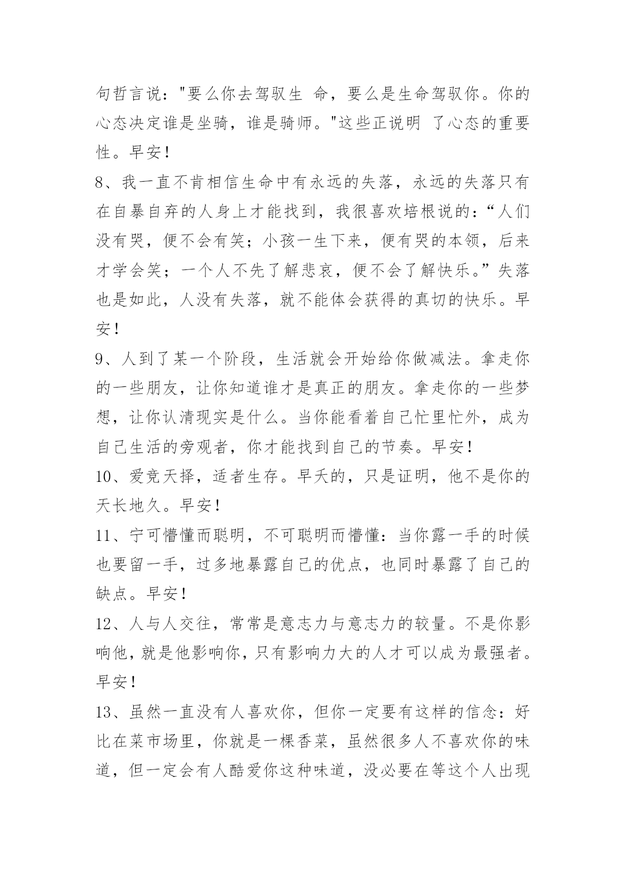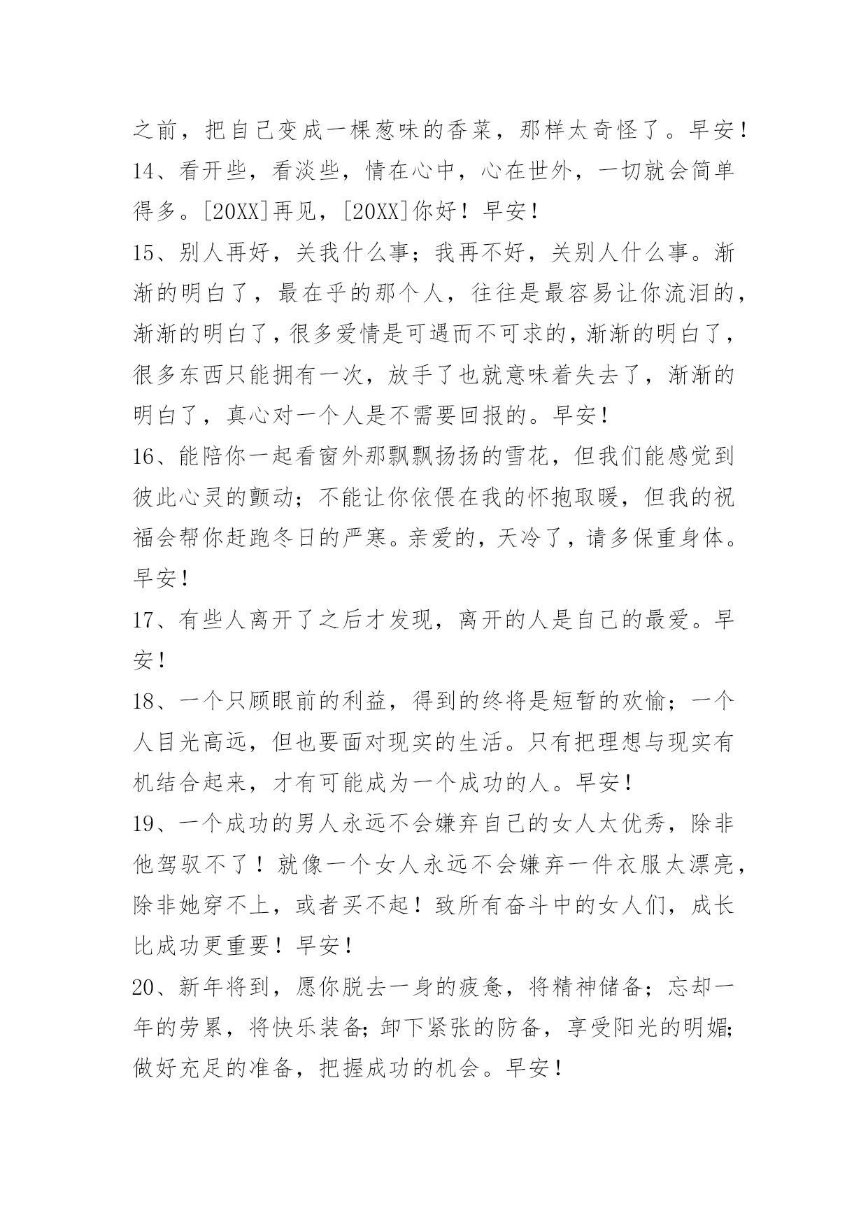 新版早安问候语语录72条 【推荐】2023年新版早安问候语语录集锦72条每个优秀的人,都有一段沉默的时光。那一段时光,是付出了很多努力,忍受孤独和寂寞,不抱怨不诉苦,日后说起时,连自己都能被感动的日子。早安!以下是小编为大家推荐的新版早安问候语72条,欢迎阅读借鉴。1、所谓成长,就是将哭声调成静音的过程,把情绪收到别人看不到的地方,一个人学会坚强。早安!2、人生就是这样充满了大起大合,你永远不会知道下一刻会发生什么,也不会明白命运为何这样待你。早安!3、漫漫人生路,最贵莫青春。人生没有一帆风顺的,都要经历一些挫折和失败。挫折和失败并不可怕。可怕的是因为挫折和失败而放弃对成功的追求。只有那些把挫折和失败当动因并能从中学到一些东西的人,才会接近成功。早安!4、我们一路奋战,不是为了改变世界,而是为了不让世界改变我们。早安!5、我们不要时常板起面孔想教育别人,而要有一种关爱的心、慈悲的心,感恩每一个人,帮助每一个人。早安!6、在纷纷扰扰的尘世间,心灵当似高山不动,在滚滚的红尘中要有一双看透尘世慧眼。把一些事看开看透,就会释然,就会平抚浮躁,心自然就得安宁。早安!7、星云大师说过:"你的心态就是你真正的主人。"还有一句哲言说:"要么你去驾驭生命,要么是生命驾驭你。你的心态决定谁是坐骑,谁是骑师。"这些正说明了心态的重要性。早安!8、我一直不肯相信生命中有永远的失落,永远的失落只有在自暴自弃的人身上才能找到,我很喜欢培根说的:“人们没有哭,便不会有笑;小孩一生下来,便有哭的本领,后来才学会笑;一个人不先了解悲哀,便不会了解快乐。”失落也是如此,人没有失落,就不能体会获得的真切的快乐。早安!9、人到了某一个阶段,生活就会开始给你做减法。拿走你的一些朋友,让你知道谁才是真正的朋友。拿走你的一些梦想,让你认清现实是什么。当你能看着自己忙里忙外,成为自己生活的旁观者,你才能找到自己的节奏。早安!10、爱竞天择,适者生存。早夭的,只是证明,他不是你的天长地久。早安!11、宁可懵懂而聪明,不可聪明而懵懂:当你露一手的时候也要留一手,过多地暴露自己的优点,也同时暴露了自己的缺点。早安!12、人与人交往,常常是意志力与意志力的较量。不是你影响他,就是他影响你,只有影响力大的人才可以成为最强者。早安!13、虽然一直没有人喜欢你,但你一定要有这样的信念:好比在菜市场里,你就是一棵香菜,虽然很多人不喜欢你的味道,但一定会有人酷爱你这种味道,没必要在等这个人出现之前,把自己变成一棵葱味的香菜,那样太奇怪了。早安!14、看开些,看淡些,情在心中,心在世外,一切就会简单得多。[20XX]再见,[20XX]你好!早安!15、别人再好,关我什么事;我再不好,关别人什么事。渐渐的明白了,最在乎的那个人,往往是最容易让你流泪的,渐渐的明白了,很多爱情是可遇而不可求的,渐渐的明白了,很多东西只能拥有一次,放手了也就意味着失去了,渐渐的明白了,真心对一个人是不需要回报的。早安!16、能陪你一起看窗外那飘飘扬扬的雪花,但我们能感觉到彼此心灵的颤动;不能让你依偎在我的怀抱取暖,但我的祝福会帮你赶跑冬日的严寒。亲爱的,天冷了,请多保重身体。早安!17、有些人离开了之后才发现,离开的人是自己的最爱。早安!18、一个只顾眼前的利益,得到的终将是短暂的欢愉;一个人目光高远,但也要面对现实的生活。只有把理想与现实有机结合起来,才有可能成为一个成功的人。早安!19、一个成功的男人永远不会嫌弃自己的女人太优秀,除非他驾驭不了!就像一个女人永远不会嫌弃一件衣服太漂亮,除非她穿不上,或者买不起!致所有奋斗中的女人们,成长比成功更重要!早安!20、新年将到,愿你脱去一身的疲惫,将精神储备;忘却一年的劳累,将快乐装备;卸下紧张的防备,享受阳光的明媚;做好充足的准备,把握成功的机会。早安!21、起得过早的人往往摸黑,起得很迟的人看不到日出,晨曦总是属于那些适时起床的人。因此,先觉者总是先死,后觉者也一定失去先机,只有那些适时觉悟的人才占尽便宜。22、缘聚缘散总无强求之理。世间人,分分合合,合合分分谁能预料?该走的还是会走,该留的还是会留。一切随缘吧!早安!23、月亮永远也不会比太阳亮——那是因为它只会机械地重复别人的东西。早安!24、在一个普遍对生命冷漠的环境中,人是不可能有安全感的,无人能保证似乎偶然的灾祸不会落到自己头上。早安!25、也许,路并没有错的,错的只是时间;爱并没有错的,错的只是缘分。早安!26、你不相信一见钟情,偏偏有一天,你就跟一个人一见钟情,而他也跟你一样,是个不相信一见钟情的人。早安!27、放爱一条生路,别再作茧自缚。早安!28、在能力与理想相匹配之前,一切舒适都是绊脚石。能用汗水解决的,就别用眼泪。早安!29、让爱你的人放心,让恨你的人失落。早安!30、原谅这种事,只和爱的深浅