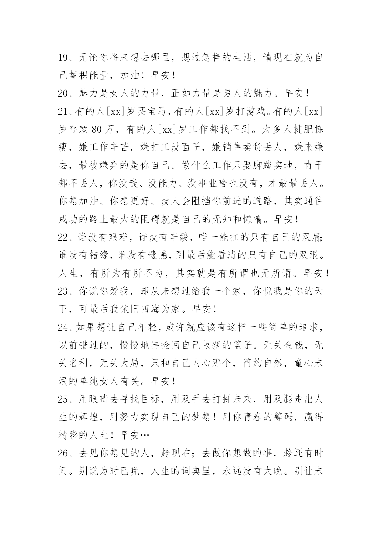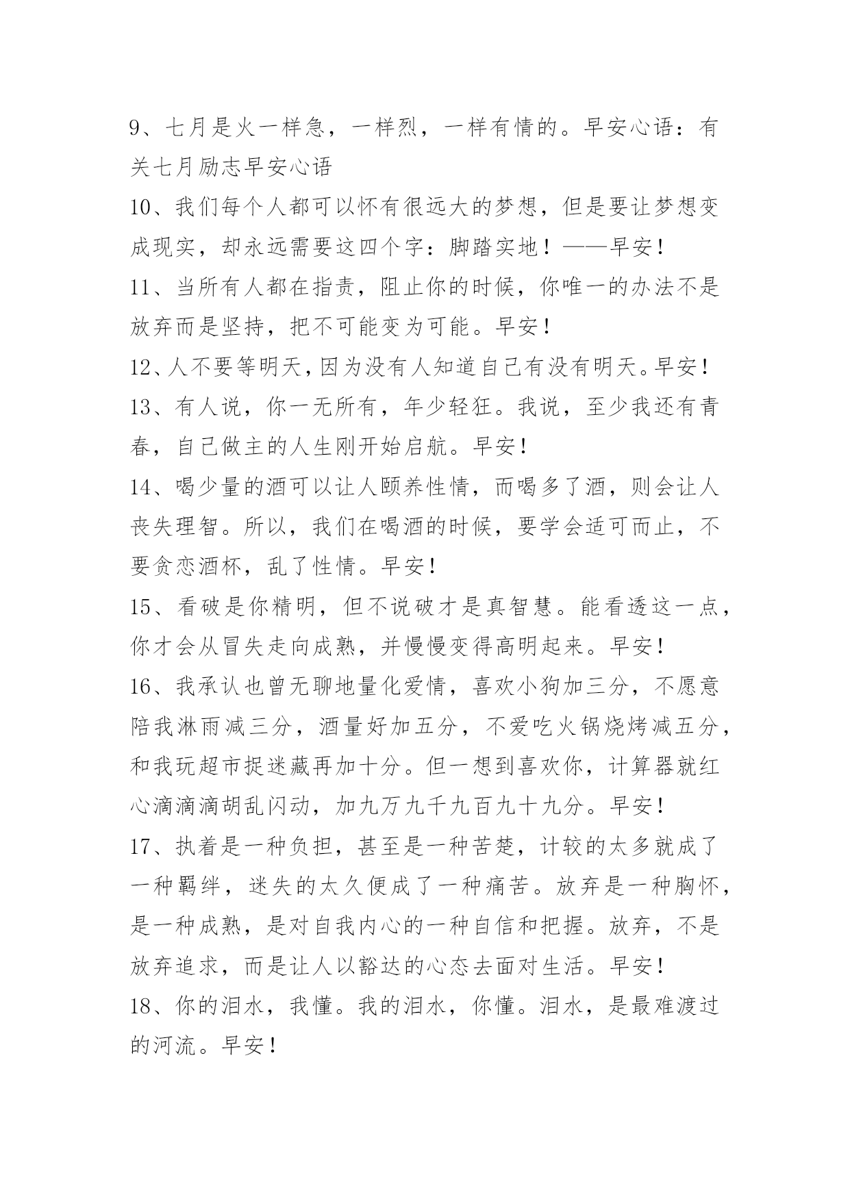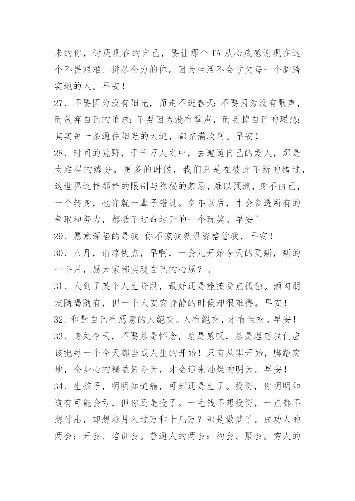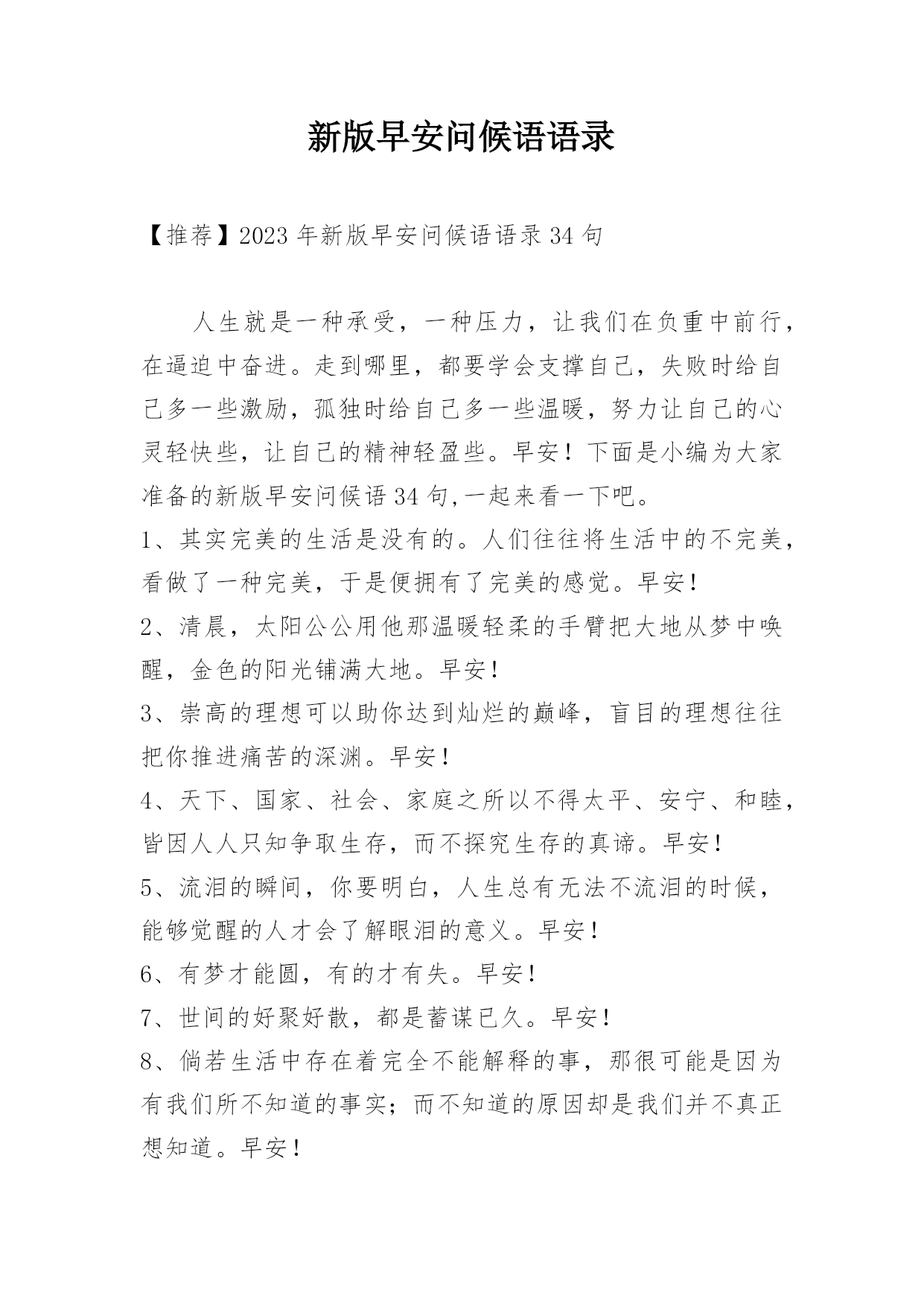 新版早安问候语语录 【推荐】2023年新版早安问候语语录34句人生就是一种承受,一种压力,让我们在负重中前行,在逼迫中奋进。走到哪里,都要学会支撑自己,失败时给自己多一些激励,孤独时给自己多一些温暖,努力让自己的心灵轻快些,让自己的精神轻盈些。早安!下面是小编为大家准备的新版早安问候语34句,一起来看一下吧。1、其实完美的生活是没有的。人们往往将生活中的不完美,看做了一种完美,于是便拥有了完美的感觉。早安!2、清晨,太阳公公用他那温暖轻柔的手臂把大地从梦中唤醒,金色的阳光铺满大地。早安!3、崇高的理想可以助你达到灿烂的巅峰,盲目的理想往往把你推进痛苦的深渊。早安!4、天下、国家、社会、家庭之所以不得太平、安宁、和睦,皆因人人只知争取生存,而不探究生存的真谛。早安!5、流泪的瞬间,你要明白,人生总有无法不流泪的时候,能够觉醒的人才会了解眼泪的意义。早安!6、有梦才能圆,有的才有失。早安!7、世间的好聚好散,都是蓄谋已久。早安!8、倘若生活中存在着完全不能解释的事,那很可能是因为有我们所不知道的事实;而不知道的原因却是我们并不真正想知道。早安!9、七月是火一样急,一样烈,一样有情的。早安心语:有关七月励志早安心语10、我们每个人都可以怀有很远大的梦想,但是要让梦想变成现实,却永远需要这四个字:脚踏实地!——早安!11、当所有人都在指责,阻止你的时候,你唯一的办法不是放弃而是坚持,把不可能变为可能。早安!12、人不要等明天,因为没有人知道自己有没有明天。早安!13、有人说,你一无所有,年少轻狂。我说,至少我还有青春,自己做主的人生刚开始启航。早安!14、喝少量的酒可以让人颐养性情,而喝多了酒,则会让人丧失理智。所以,我们在喝酒的时候,要学会适可而止,不要贪恋酒杯,乱了性情。早安!15、看破是你精明,但不说破才是真智慧。能看透这一点,你才会从冒失走向成熟,并慢慢变得高明起来。早安!16、我承认也曾无聊地量化爱情,喜欢小狗加三分,不愿意陪我淋雨减三分,酒量好加五分,不爱吃火锅烧烤减五分,和我玩超市捉迷藏再加十分。但一想到喜欢你,计算器就红心滴滴滴胡乱闪动,加九万九千九百九十九分。早安!17、执着是一种负担,甚至是一种苦楚,计较的太多就成了一种羁绊,迷失的太久便成了一种痛苦。放弃是一种胸怀,是一种成熟,是对自我内心的一种自信和把握。放弃,不是放弃追求,而是让人以豁达的心态去面对生活。早安!18、你的泪水,我懂。我的泪水,你懂。泪水,是最难渡过的河流。早安!19、无论你将来想去哪里,想过怎样的生活,请现在就为自己蓄积能量,加油!早安!20、魅力是女人的力量,正如力量是男人的魅力。早安!21、有的人[xx]岁买宝马,有的人[xx]岁打游戏。有的人[xx]岁存款80万,有的人[xx]岁工作都找不到。太多人挑肥拣瘦,嫌工作辛苦,嫌打工没面子,嫌销售卖货丢人,嫌来嫌去,最被嫌弃的是你自己。做什么工作只要脚踏实地,肯干都不丢人,你没钱、没能力、没事业啥也没有,才最最丢人。你想加油、你想更好、没人会阻挡你前进的道路,其实通往成功的路上最大的阻碍就是自己的无知和懒惰。早安!22、谁没有艰难,谁没有辛酸,唯一能扛的只有自己的双肩;谁没有错缘,谁没有遗憾,到最后能看清的只有自己的双眼。人生,有所为有所不为,其实就是有所谓也无所谓。早安!23、你说你爱我,却从未想过给我一个家,你说我是你的天下,可最后我依旧四海为家。早安!24、如果想让自己年轻,或许就应该有这样一些简单的追求,以前错过的,慢慢地再捡回自己收获的篮子。无关金钱,无关名利,无关大局,只和自己内心那个,简约自然,童心未泯的单纯女人有关。早安!25、用眼睛去寻找目标,用双手去打拼未来,用双腿走出人生的辉煌,用努力实现自己的梦想!用你青春的筹码,赢得精彩的人生!早安…26、去见你想见的人,趁现在;去做你想做的事,趁还有时间。别说为时已晚,人生的词典里,永远没有太晚。别让未来的你,讨厌现在的自己,要让那个TA从心底感谢现在这个不畏艰难、拼尽全力的你。因为生活不会亏欠每一个脚踏实地的人。早安!27、不要因为没有阳光,而走不进春天;不要因为没有歌声,而放弃自己的追求;不要因为没有掌声,而丢掉自己的理想;其实每一条通往阳光的大道,都充满坎坷。早安!28、时间的荒野,于千万人之中,去邂逅自己的爱人,那是太难得的缘分,更多的时候,我们只是在彼此不断的错过,这世界这样那样的限制与隐秘的禁忌,难以预测,身不由己,一个转身,也许就一辈子错过。多年以后,才会参透所有的争取和努力,都抵不过命运开的一个玩笑。早安~29、愿意深陷的是我你不宠我就没资格管我,早安!30、八月,请凉快点,早啊,一会儿开始今天的更新,新的一个月,愿大家都实现自己的心愿?。31、人到了某个人生阶段,最好还是能接受点孤独。酒肉朋友随喝随有,但一个人安安