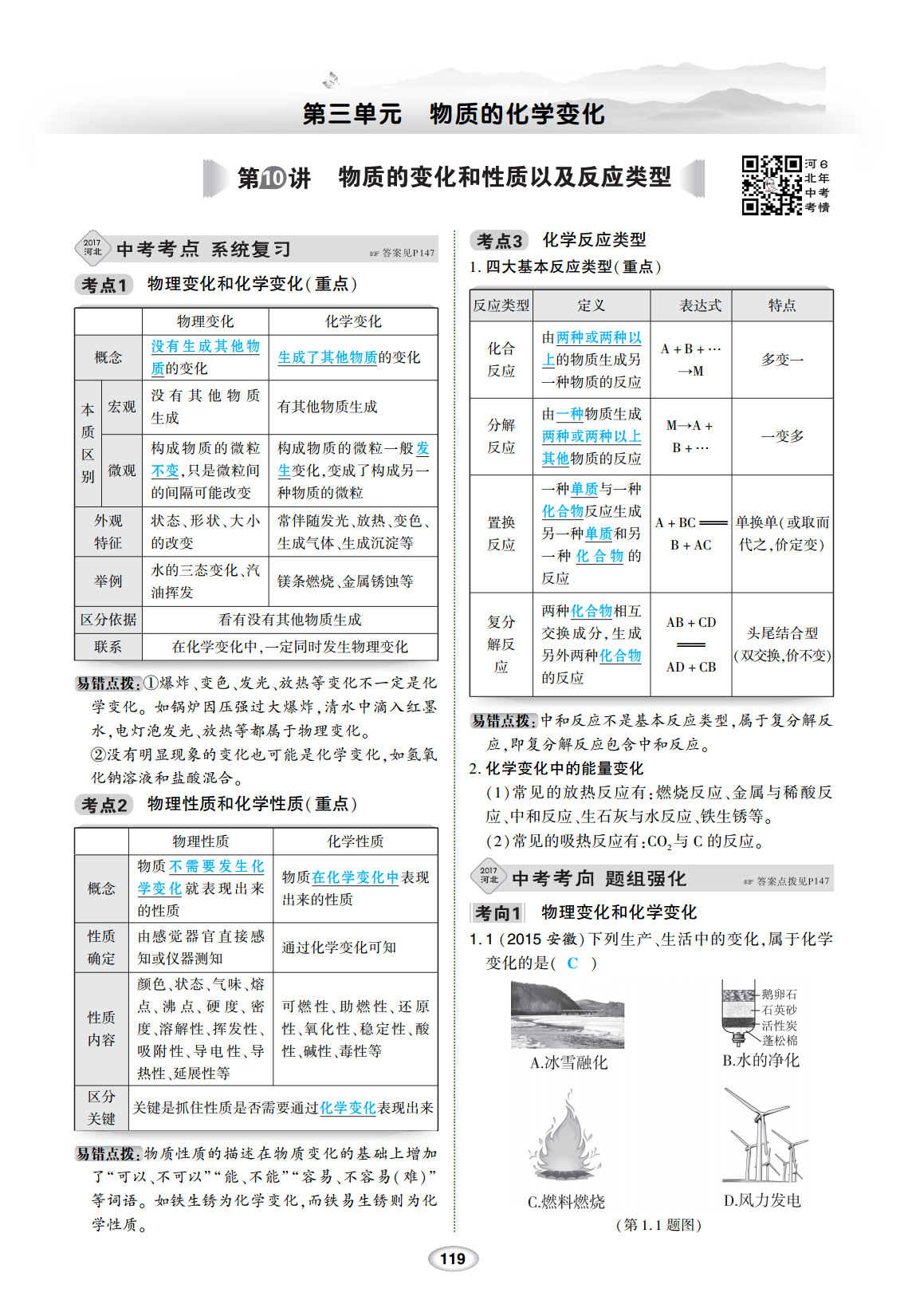 第三单元物质的化学变化化学反应类型四大基本反应类型重点1.()物理变化和化学变化重点()反应类型定义表达式特点物理变化化学变化由两种或两种以没有生成其他物化合概念生成了其他物质的变化上的物质生成另A+B+多变一质的变化反应M一种物质的反应→没有其他物质本宏观有其他物质生成生成由一种物质生成分解质两种或两种以上M→A+一变多区构成物质的微粒构成物质的微粒一般发反应其他物质的反应B+别微观不变只是微粒间生变化变成了构成另一ꎬꎬ的间隔可能改变种物质的微粒一种单质与一种化合物反应生成外观状态形状大小常伴随发光放热变色置换单换单或取而、、、、、另一种单质和另A+BC(特征的改变生成气体生成沉淀等反应代之价定变、一种化合物的B+ACꎬ)水的三态变化汽反应举例、镁条燃烧金属锈蚀等、油挥发两种化合物相互区分依据看有没有其他物质生成复分交换成分生成AB+CD头尾结合型联系在化学变化中一定同时发生物理变化解反ꎬꎬ另外两种化合物双交换价不变(ꎬ)应的反应AD+CB易错点拨爆炸变色发光放热等变化不一定是化:①、、、学变化如锅炉因压强过大爆炸清水中滴入红墨ꎮꎬ易错点拨中和反应不是基本反应类型属于复分解反水电灯泡发光放热等都属于物理变化:ꎬꎬ、ꎮ应即复分解反应包含中和反应没有明显现象的变化也可能是化学变化如氢氧ꎬꎮ②ꎬ化学变化中的能量变化化钠溶液和盐酸混合2.ꎮ常见的放热反应有燃烧反应金属与稀酸反物理性质和化学性质重点(1):、()应中和反应生石灰与水反应铁生锈等、、、ꎮ物理性质化学性质常见的吸热反应有与的反应2(2):COCꎮ物质不需要发生化物质在化学变化中表现概念学变化就表现出来出来的性质的性质物理变化和化学变化性质由感觉器官直接感112015安徽下列生产生活中的变化属于化学通过化学变化可知.()、ꎬ确定知或仪器测知变化的是C()颜色状态气味熔、、、点沸点硬度密可燃性助燃性还原性质、、、、、度溶解性挥发性性氧化性稳定性酸内容、、、、、、吸附性导电性导性碱性毒性等、、、、热性延展性等、区分关键是抓住性质是否需要通过化学变化表现出来关键易错点拨物质性质的描述在物质变化的基础上增加:了可以不可以能不能容易不容易难“、”“、”“、()”等词语如铁生锈为化学变化而铁易生锈则为化ꎮꎬ学性质第题图ꎮ(1.1)119化学12(2016河北,2分)下列过程中发生了化学化学反应类型.变化的是D31溶洞中存在化学反应3+2+2().:CaCOCOHO用高分子分离膜淡化海水32此反应属于AA.Ca(HCO)ꎬ()氖管发光化合反应分解反应B.A.B.电炉丝通电后发红置换反应复分解反应C.C.D.将喷洒石蕊溶液的纸花放入中(株洲)下列反应中属于置换反应的2322016D.CO河北,分.1320152下列过程中只发生物理变化.()是A()的是B()44A.Fe+CuSOFeSO+Cu水通电分解物体热胀冷缩A.B.22B.2NO+O2NO手机电池充电植物的光合作用高温C.D.142014河北,2分下列过程中发生了化学变化C.3CO+Fe2O32Fe+3CO2.()通电的是B()D.2NaCl2Na+Cl2↑给轮胎打气粮食酿成酒332010河北,2分医疗上可以用含有氢氧化镁A.B..()铁水铸造成锅过滤粗盐水的药物治疗胃酸过多其反应的化学方程式为C.D.ꎬ:15(2016郴州)下列成语中涉及化学变化的.ꎬMg(OH)2+2HClMgCl2+2H2O是B该反应属于D()()滴水成冰火烧连营化合反应分解反应A.B.A.B.大海捞针刻舟求剑置换反应复分解反应C.D.C.D.34(2016舟山)某同学利用初中科学物质间相互.判断一个变化是物理变化还是化学变化关转化的知识设计了如图所示的条铜的旅行路ꎬꎬ3“键是看是否有新物质生成若有新物质生成则为线每条路线中的每次转化都是通过一步化学反ꎬꎬ”ꎬ