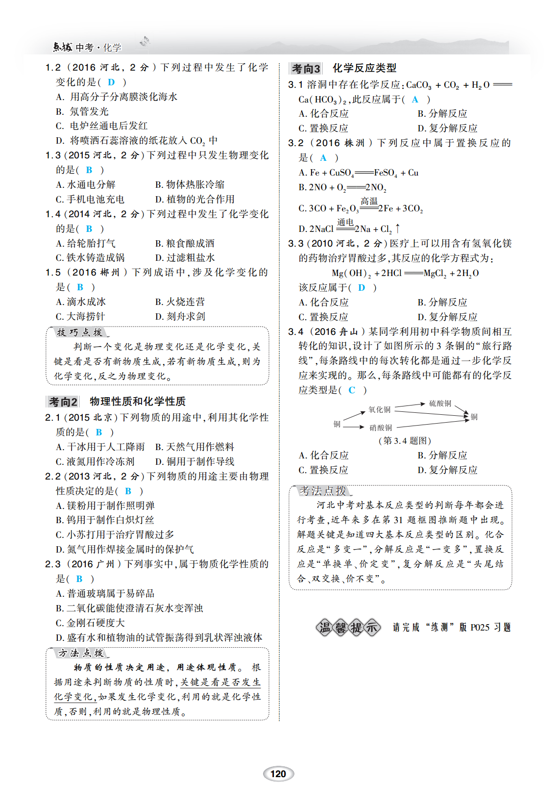 试题-全国-2017_(河北专版)2017年中考化学总复习 第3单元 物质的化学变化 第10讲 物质的变化和性质以及反应类型试题(pdf).pdf