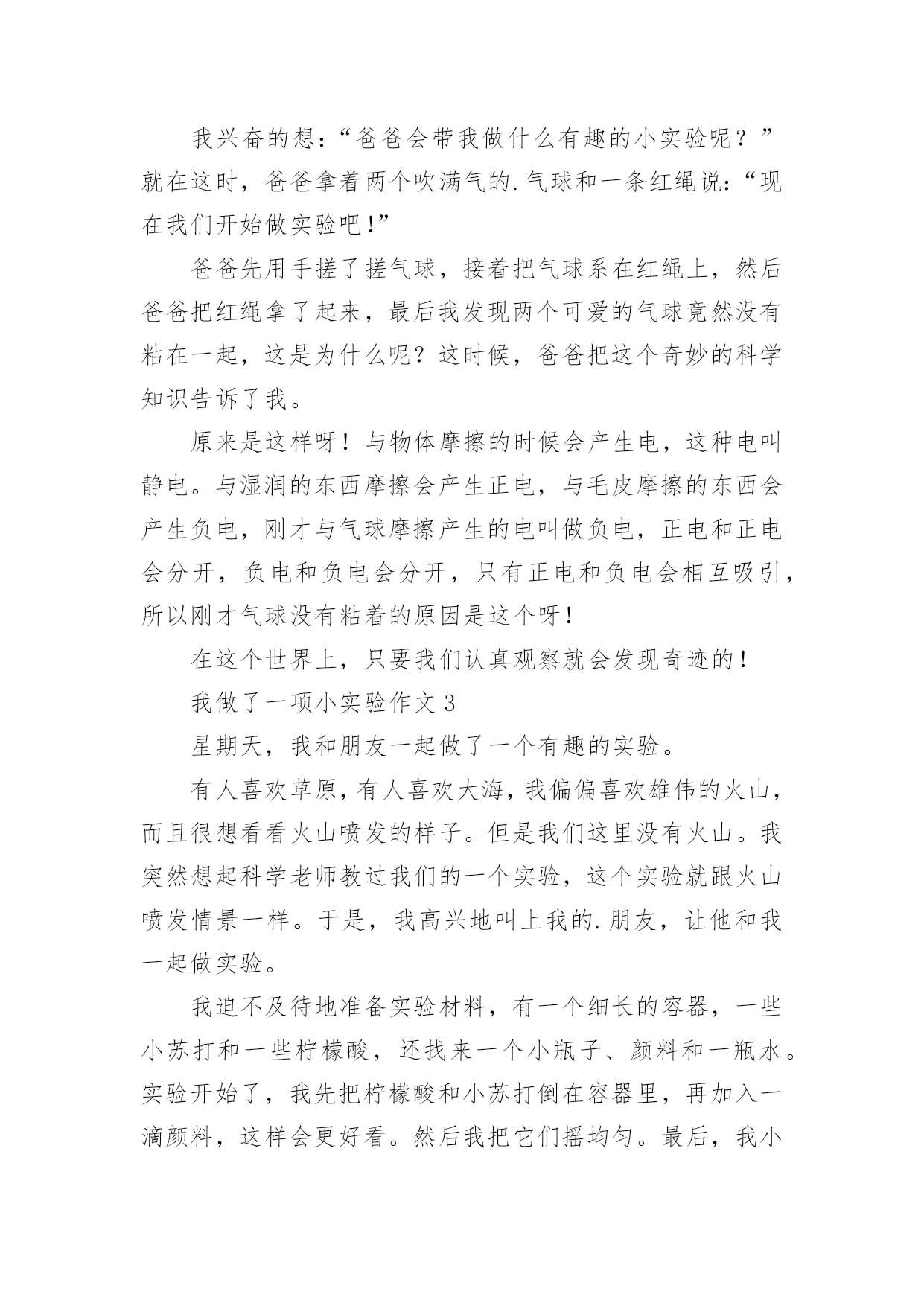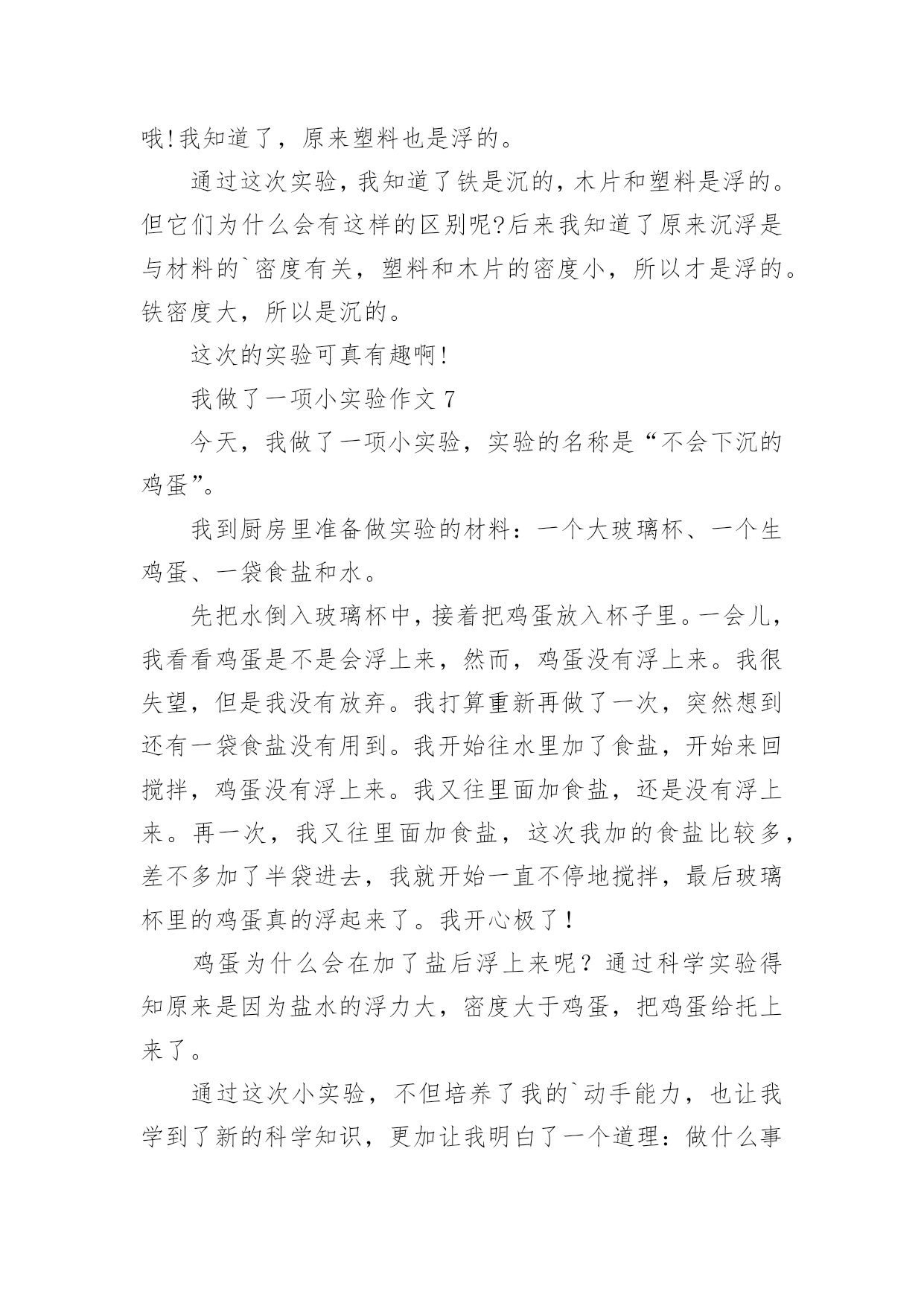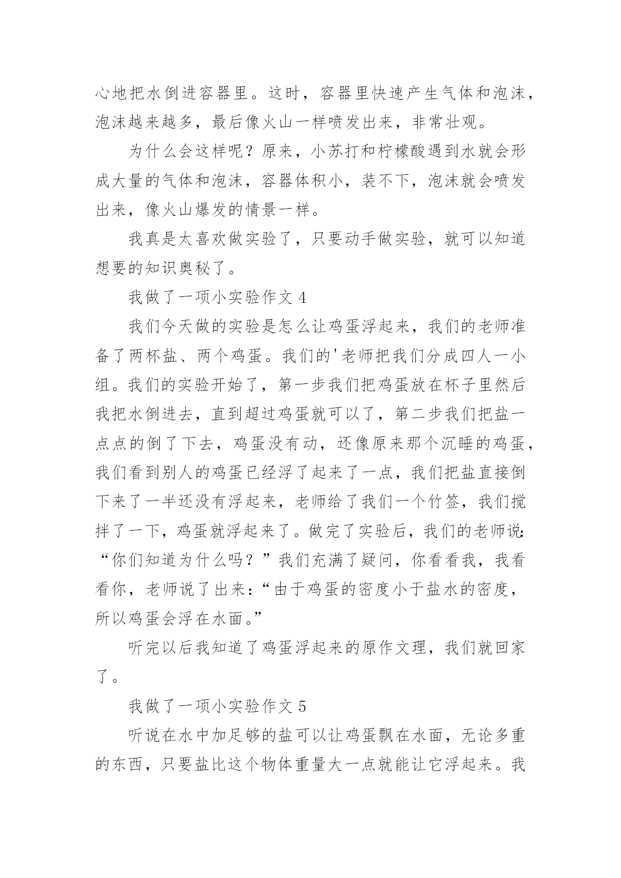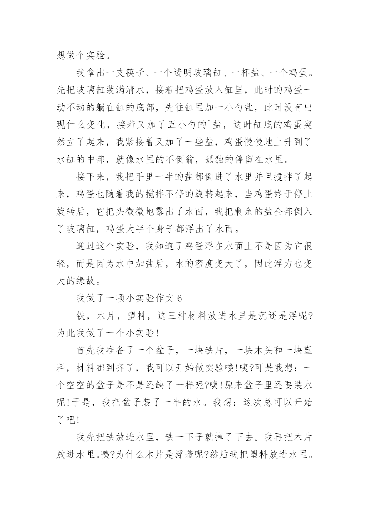 我做了一项小实验作文 我做了一项小实验作文1有一次,老师给我们布置了一项特别的作业。作业是让我们做一个小小的实验,在前几天,我就听说纸屑会跳舞,可是我却不相信,这一次,我就要自己动手试一试,到底纸屑会不会跳舞。首先,我先准备材料。第一步,我先拿出一支笔和一张纸,接着在纸上画出一个小人,然后第二步,再拿出笔往桌子上面摩擦几下,最后再拿出一块玻璃,拿把剪刀,再用剪刀把画在纸上的小人剪下来,“啊!小人被我剪坏了!”我开始泄气了,可是,实验家是怎么做成的呢!没关系,我要为自己加油,继续努力。于是,我就自己又做了一次,从哪里摔倒,就要从哪里爬起来,我认真的'做,终于做到了最后一步,小纸屑成功跳起舞来。这次实验,不但培养了我的动手能力,增长了知识,更让我明白了一个道理:做任何事只要坚持不懈,就会成功。完成了这项小实验,我又明白了一个科学原理——摩擦起电。哇!我真是开心极了!我做了一项小实验作文2其实大自然就是一本百科全书,有许多的知识在等待着我们呢!那么,我们就来做一个小实验吧!实验道具有两个气球和一条红绳。我兴奋的想:“爸爸会带我做什么有趣的小实验呢?”就在这时,爸爸拿着两个吹满气的.气球和一条红绳说:“现在我们开始做实验吧!”爸爸先用手搓了搓气球,接着把气球系在红绳上,然后爸爸把红绳拿了起来,最后我发现两个可爱的气球竟然没有粘在一起,这是为什么呢?这时候,爸爸把这个奇妙的科学知识告诉了我。原来是这样呀!与物体摩擦的时候会产生电,这种电叫静电。与湿润的东西摩擦会产生正电,与毛皮摩擦的东西会产生负电,刚才与气球摩擦产生的电叫做负电,正电和正电会分开,负电和负电会分开,只有正电和负电会相互吸引,所以刚才气球没有粘着的原因是这个呀!在这个世界上,只要我们认真观察就会发现奇迹的!我做了一项小实验作文3星期天,我和朋友一起做了一个有趣的实验。有人喜欢草原,有人喜欢大海,我偏偏喜欢雄伟的火山,而且很想看看火山喷发的样子。但是我们这里没有火山。我突然想起科学老师教过我们的一个实验,这个实验就跟火山喷发情景一样。于是,我高兴地叫上我的.朋友,让他和我一起做实验。我迫不及待地准备实验材料,有一个细长的容器,一些小苏打和一些柠檬酸,还找来一个小瓶子、颜料和一瓶水。实验开始了,我先把柠檬酸和小苏打倒在容器里,再加入一滴颜料,这样会更好看。然后我把它们摇均匀。最后,我小心地把水倒进容器里。这时,容器里快速产生气体和泡沫,泡沫越来越多,最后像火山一样喷发出来,非常壮观。为什么会这样呢?原来,小苏打和柠檬酸遇到水就会形成大量的气体和泡沫,容器体积小,装不下,泡沫就会喷发出来,像火山爆发的情景一样。我真是太喜欢做实验了,只要动手做实验,就可以知道想要的知识奥秘了。我做了一项小实验作文4我们今天做的实验是怎么让鸡蛋浮起来,我们的老师准备了两杯盐、两个鸡蛋。我们的'老师把我们分成四人一小组。我们的实验开始了,第一步我们把鸡蛋放在杯子里然后我把水倒进去,直到超过鸡蛋就可以了,第二步我们把盐一点点的倒了下去,鸡蛋没有动,还像原来那个沉睡的鸡蛋,我们看到别人的鸡蛋已经浮了起来了一点,我们把盐直接倒下来了一半还没有浮起来,老师给了我们一个竹签,我们搅拌了一下,鸡蛋就浮起来了。做完了实验后,我们的老师说:“你们知道为什么吗?”我们充满了疑问,你看看我,我看看你,老师说了出来:“由于鸡蛋的密度小于盐水的密度,所以鸡蛋会浮在水面。”听完以后我知道了鸡蛋浮起来的原作文理,我们就回家了。我做了一项小实验作文5听说在水中加足够的盐可以让鸡蛋飘在水面,无论多重的东西,只要盐比这个物体重量大一点就能让它浮起来。我想做个实验。我拿出一支筷子、一个透明玻璃缸、一杯盐、一个鸡蛋。先把玻璃缸装满清水,接着把鸡蛋放入缸里,此时的鸡蛋一动不动的躺在缸的底部,先往缸里加一小勺盐,此时没有出现什么变化,接着又加了五小勺的`盐,这时缸底的鸡蛋突然立了起来,我紧接着又加了一些盐,鸡蛋慢慢地上升到了水缸的中部,就像水里的不倒翁,孤独的停留在水里。接下来,我把手里一半的盐都倒进了水里并且搅拌了起来,鸡蛋也随着我的搅拌不停的旋转起来,当鸡蛋终于停止旋转后,它把头微微地露出了水面,我把剩余的盐全部倒入了玻璃缸,鸡蛋大半个身子都浮出了水面。通过这个实验,我知道了鸡蛋浮在水面上不是因为它很轻,而是因为水中加盐后,水的密度变大了,因此浮力也变大的缘故。我做了一项小实验作文6铁,木片,塑料,这三种材料放进水里是沉还是浮呢?为此我做了一个小实验!首先我准备了一个盆子,一块铁片,一块木头和一块塑料,材料都到齐了,我可以开始做实验喽!咦?可是我想:一个空空的盆子是不是还缺了一样呢?噢!原来盆子里还要装水呢!于是,我把盆子装了一半的水。我想:这次总可以开始了吧!我先把铁放进水里,铁一下子就掉了下去。我再把木片放进水里。咦?为什么木片是