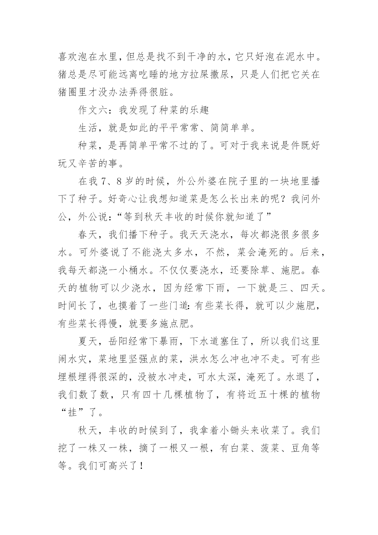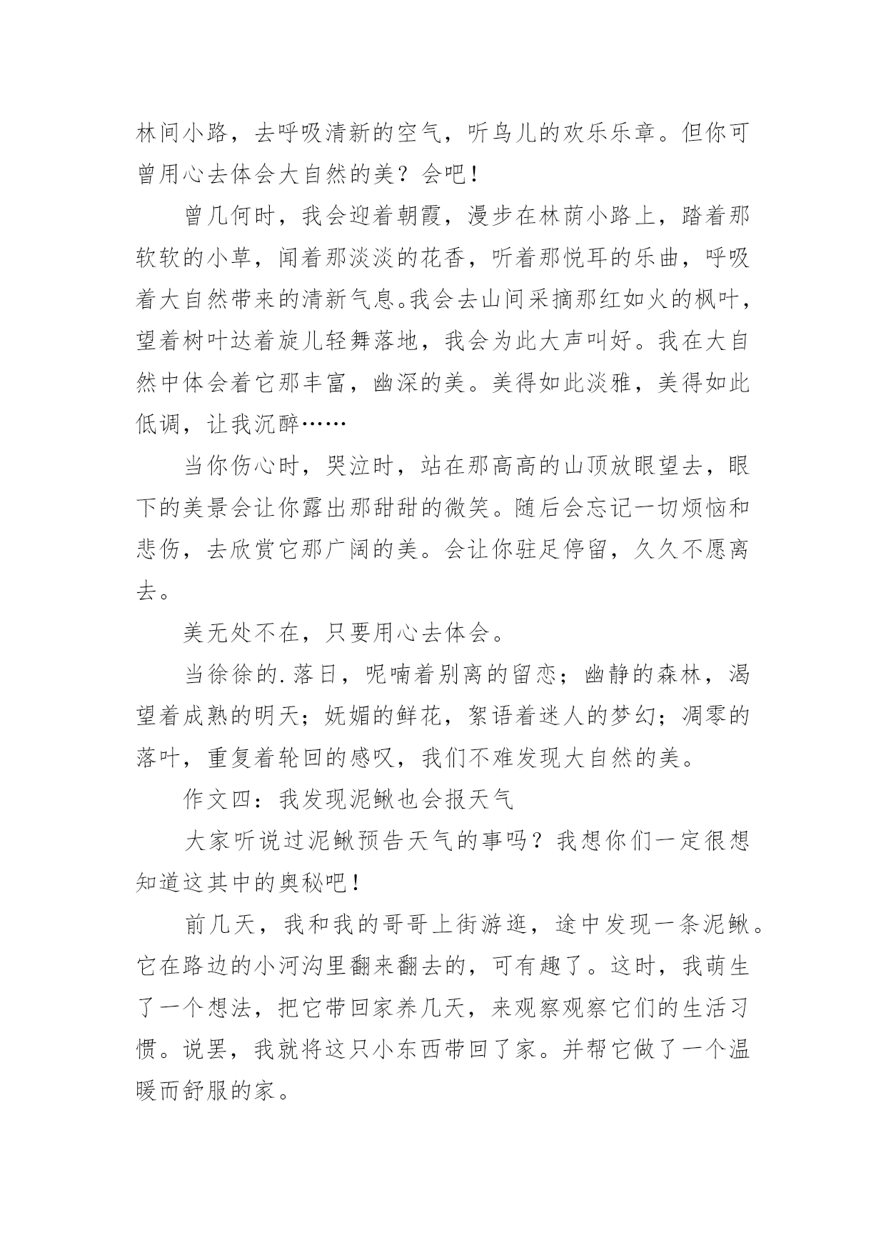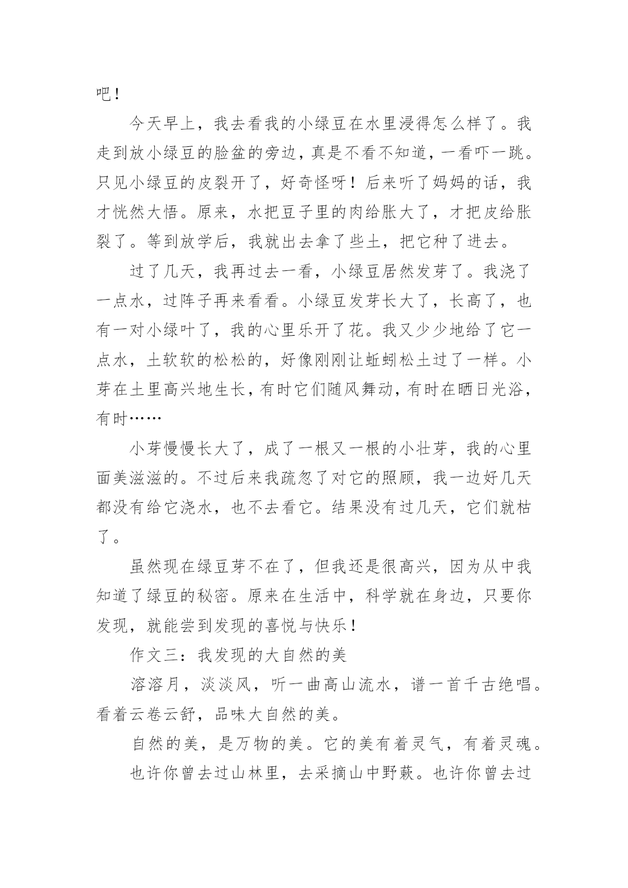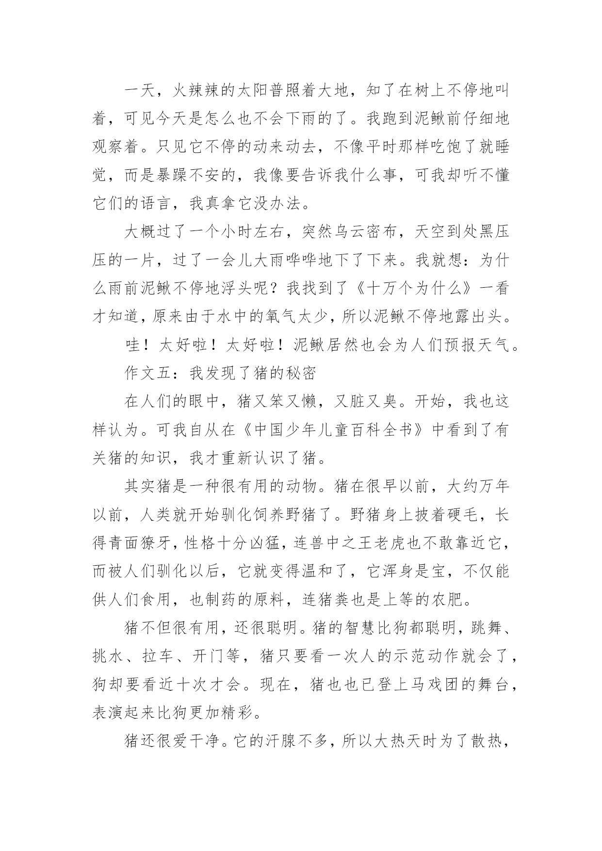 我发现作文 星期天早上,我没吃早餐,就向妈妈问了两块钱去买早餐吃。我走在大街上,看见了卖饺子的,于是,准备卖饺子吃。那个卖饺子的阿姨是边做边煮,这样的饺子就新鲜一些。她把馅准备好,然后准备和面。和好了,就准备包饺子了。饺子包好后,看上去塞牙缝都不够。可是煮出来后,比原来的饺子大得多,而且也浮了上来。我买好早餐,带着疑问,连忙去翻[[十万个为什么]],终于找到了答案。原来,热的物体是会膨胀的,饺子和水也不例外。饺馅和饺子皮的膨胀速度比水快,它们的体积很容易增大许多。但是饺子的重量并没有增加而体积增大,单位体积的重量就减少了。根据阿基米德原理,沉浸在水中的饺子就要失去同体积水的重量,这个失去的重量就是水对饺子的浮力。既然饺子体积大了,所以在水中失去的重量也大,用比原来的大的浮力去浮起一个单位体积重量比原来小的饺子,当然不成问题了。饺子为什么膨胀,为什么会浮起来的秘密,我终于知道啦!处处观察思考,会有更多的学问!作文二:我观察,我发现“啊,我发现了一个秘密!”听我这么一说,你一定想知道我发现了一个什么秘密吧?别急,让我慢慢地来告诉你吧!今天早上,我去看我的小绿豆在水里浸得怎么样了。我走到放小绿豆的脸盆的旁边,真是不看不知道,一看吓一跳。只见小绿豆的皮裂开了,好奇怪呀!后来听了妈妈的话,我才恍然大悟。原来,水把豆子里的肉给胀大了,才把皮给胀裂了。等到放学后,我就出去拿了些土,把它种了进去。过了几天,我再过去一看,小绿豆居然发芽了。我浇了一点水,过阵子再来看看。小绿豆发芽长大了,长高了,也有一对小绿叶了,我的心里乐开了花。我又少少地给了它一点水,土软软的松松的,好像刚刚让蚯蚓松土过了一样。小芽在土里高兴地生长,有时它们随风舞动,有时在晒日光浴,有时……小芽慢慢长大了,成了一根又一根的小壮芽,我的心里面美滋滋的。不过后来我疏忽了对它的照顾,我一边好几天都没有给它浇水,也不去看它。结果没有过几天,它们就枯了。虽然现在绿豆芽不在了,但我还是很高兴,因为从中我知道了绿豆的秘密。原来在生活中,科学就在身边,只要你发现,就能尝到发现的喜悦与快乐!作文三:我发现的大自然的美溶溶月,淡淡风,听一曲高山流水,谱一首千古绝唱。看着云卷云舒,品味大自然的美。自然的美,是万物的美。它的美有着灵气,有着灵魂。也许你曾去过山林里,去采摘山中野蔌。也许你曾去过林间小路,去呼吸清新的空气,听鸟儿的欢乐乐章。但你可曾用心去体会大自然的美?会吧!曾几何时,我会迎着朝霞,漫步在林荫小路上,踏着那软软的小草,闻着那淡淡的花香,听着那悦耳的乐曲,呼吸着大自然带来的清新气息。我会去山间采摘那红如火的枫叶,望着树叶达着旋儿轻舞落地,我会为此大声叫好。我在大自然中体会着它那丰富,幽深的美。美得如此淡雅,美得如此低调,让我沉醉……当你伤心时,哭泣时,站在那高高的山顶放眼望去,眼下的美景会让你露出那甜甜的微笑。随后会忘记一切烦恼和悲伤,去欣赏它那广阔的美。会让你驻足停留,久久不愿离去。美无处不在,只要用心去体会。当徐徐的.落日,呢喃着别离的留恋;幽静的森林,渴望着成熟的明天;妩媚的鲜花,絮语着迷人的梦幻;凋零的落叶,重复着轮回的感叹,我们不难发现大自然的美。作文四:我发现泥鳅也会报天气大家听说过泥鳅预告天气的事吗?我想你们一定很想知道这其中的奥秘吧!前几天,我和我的哥哥上街游逛,途中发现一条泥鳅。它在路边的小河沟里翻来翻去的,可有趣了。这时,我萌生了一个想法,把它带回家养几天,来观察观察它们的生活习惯。说罢,我就将这只小东西带回了家。并帮它做了一个温暖而舒服的家。一天,火辣辣的太阳普照着大地,知了在树上不停地叫着,可见今天是怎么也不会下雨的了。我跑到泥鳅前仔细地观察着。只见它不停的动来动去,不像平时那样吃饱了就睡觉,而是暴躁不安的,我像要告诉我什么事,可我却听不懂它们的语言,我真拿它没办法。大概过了一个小时左右,突然乌云密布,天空到处黑压压的一片,过了一会儿大雨哗哗地下了下来。我就想:为什么雨前泥鳅不停地浮头呢?我找到了《十万个为什么》一看才知道,原来由于水中的氧气太少,所以泥鳅不停地露出头。哇!太好啦!太好啦!泥鳅居然也会为人们预报天气。作文五:我发现了猪的秘密在人们的眼中,猪又笨又懒,又脏又臭。开始,我也这样认为。可我自从在《中国少年儿童百科全书》中看到了有关猪的知识,我才重新认识了猪。其实猪是一种很有用的动物。猪在很早以前,大约万年以前,人类就开始驯化饲养野猪了。野猪身上披着硬毛,长得青面獠牙,性格十分凶猛,连兽中之王老虎也不敢靠近它,而被人们驯化以后,它就变得温和了,它浑身是宝,不仅能供人们食用,也制药的原料,连猪粪也是上等的农肥。猪不但很有用,还很聪明。猪的智慧比狗都聪明,跳舞、挑水、拉车、开门等,猪只要看一次人的示范动作就会了,狗却要看近十次才会。现在,猪也也已登上马戏团的