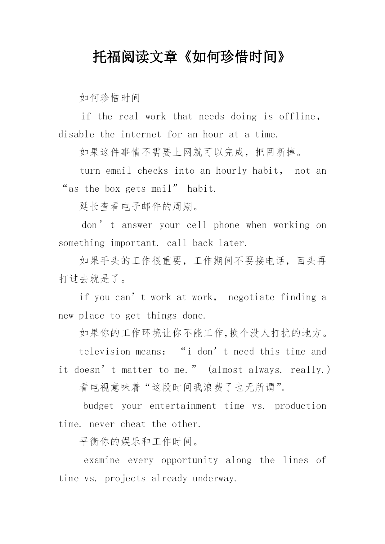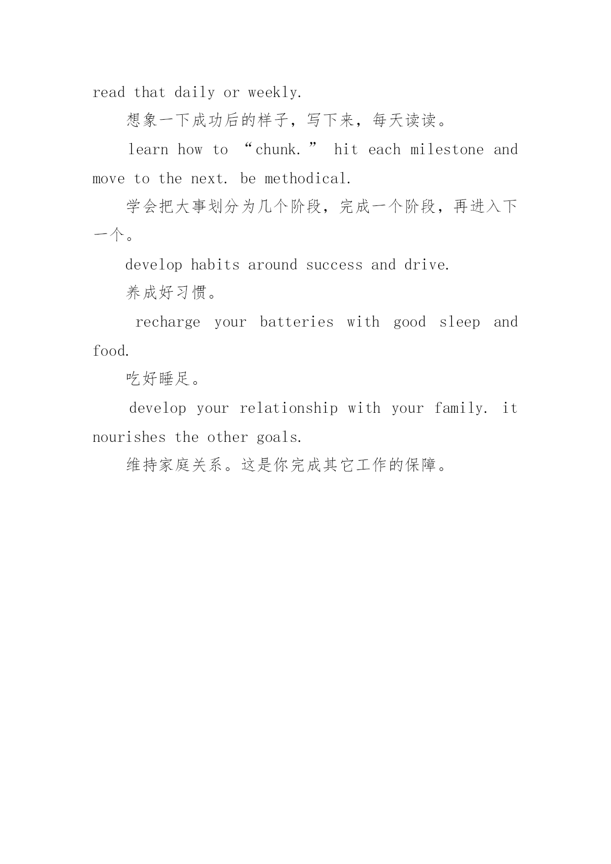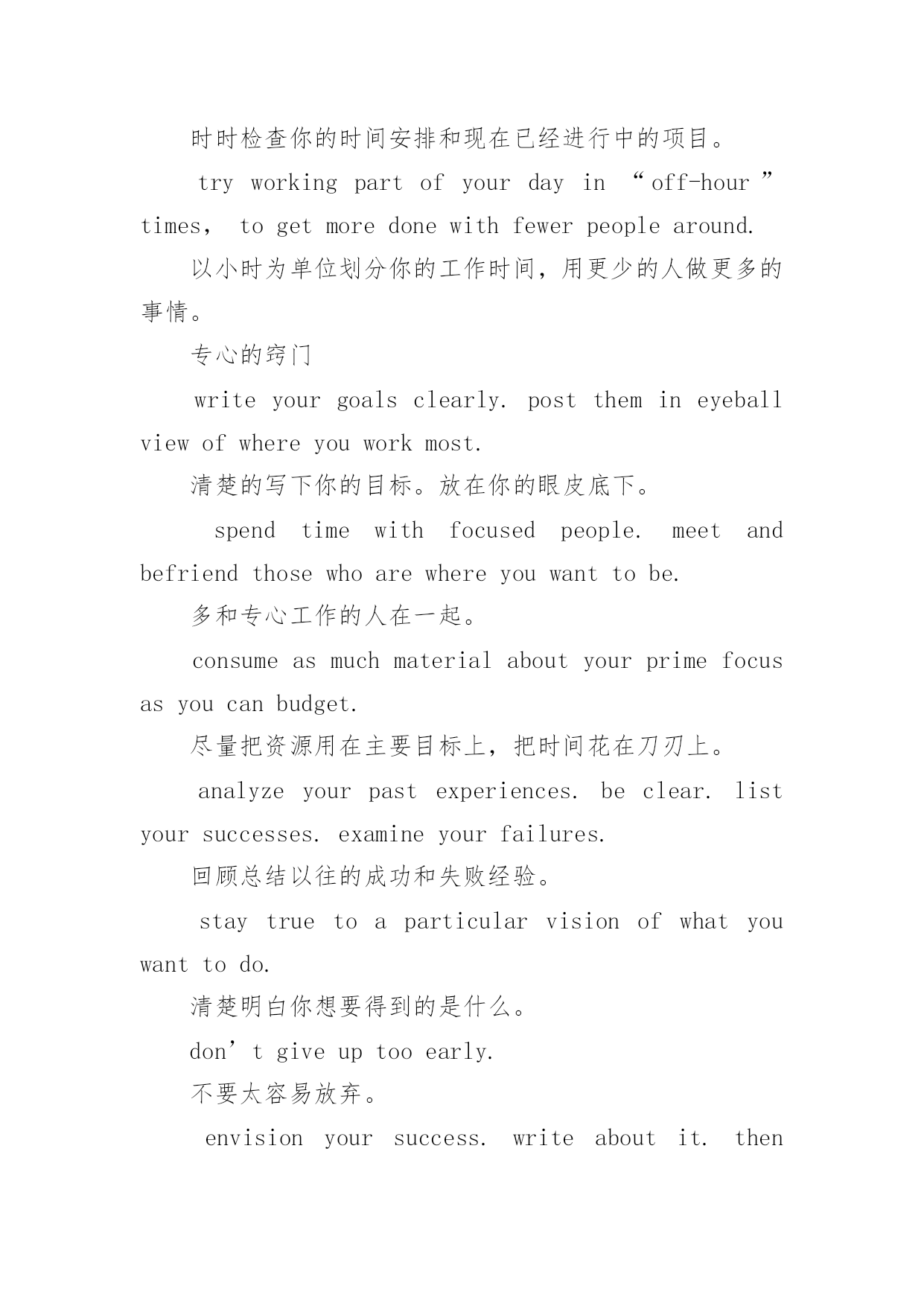托福阅读文章《如何珍惜时间》 如何珍惜时间iftherealworkthatneedsdoingisoffline,disabletheinternetforanhouratatime.如果这件事情不需要上网就可以完成,把网断掉。turnemailchecksintoanhourlyhabit,notan“astheboxgetsmail”habit.延长查看电子邮件的周期。don’tansweryourcellphonewhenworkingonsomethingimportant.callbacklater.如果手头的工作很重要,工作期间不要接电话,回头再打过去就是了。ifyoucan’tworkatwork,negotiatefindinganewplacetogetthingsdone.如果你的工作环境让你不能工作,换个没人打扰的地方。televisionmeans:“idon’tneedthistimeanditdoesn’tmattertome.”(almostalways.really.)看电视意味着“这段时间我浪费了也无所谓”。budgetyourentertainmenttimevs.productiontime.nevercheattheother.平衡你的娱乐和工作时间。examineeveryopportunityalongthelinesoftimevs.projectsalreadyunderway.时时检查你的时间安排和现在已经进行中的项目。tryworkingpartofyourdayin“off-hour”times,togetmoredonewithfewerpeoplearound.以小时为单位划分你的工作时间,用更少的人做更多的事情。专心的窍门writeyourgoalsclearly.postthemineyeballviewofwhereyouworkmost.清楚的写下你的目标。放在你的眼皮底下。spendtimewithfocusedpeople.meetandbefriendthosewhoarewhereyouwanttobe.多和专心工作的人在一起。consumeasmuchmaterialaboutyourprimefocusasyoucanbudget.尽量把资源用在主要目标上,把时间花在刀刃上。analyzeyourpastexperiences.beclear.listyoursuccesses.examineyourfailures.回顾总结以往的成功和失败经验。staytruetoaparticularvisionofwhatyouwanttodo.清楚明白你想要得到的是什么。don’tgiveuptooearly.不要太容易放弃。envisionyoursuccess.writeaboutit.thenreadthatdailyorweekly.想象一下成功后的样子,写下来,每天读读。learnhowto“chunk.”hiteachmilestoneandmovetothenext.bemethodical.学会把大事划分为几个阶段,完成一个阶段,再进入下一个。develophabitsaroundsuccessanddrive.养成好习惯。rechargeyourbatterieswithgoodsleepandfood.吃好睡足。developyourrelationshipwithyourfamily.itnourishestheothergoals.维持家庭关系。这是你完成其它工作的保障。